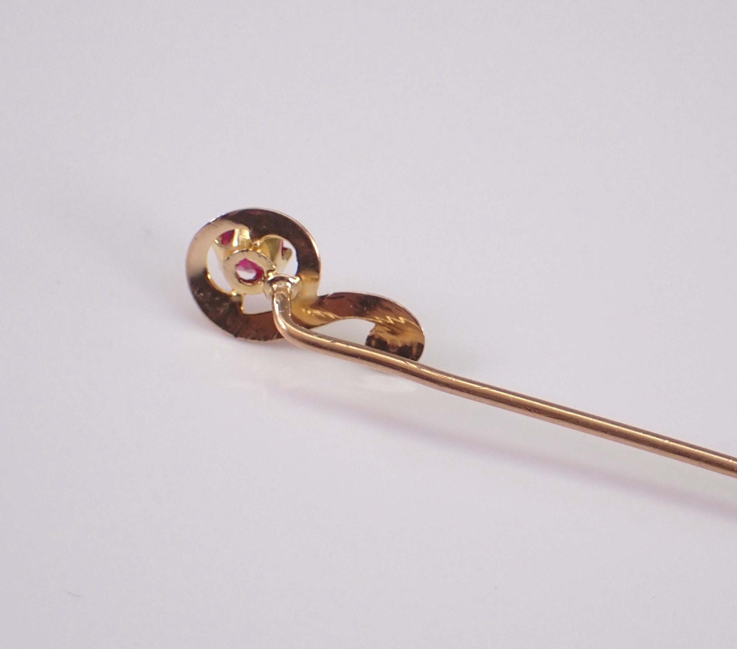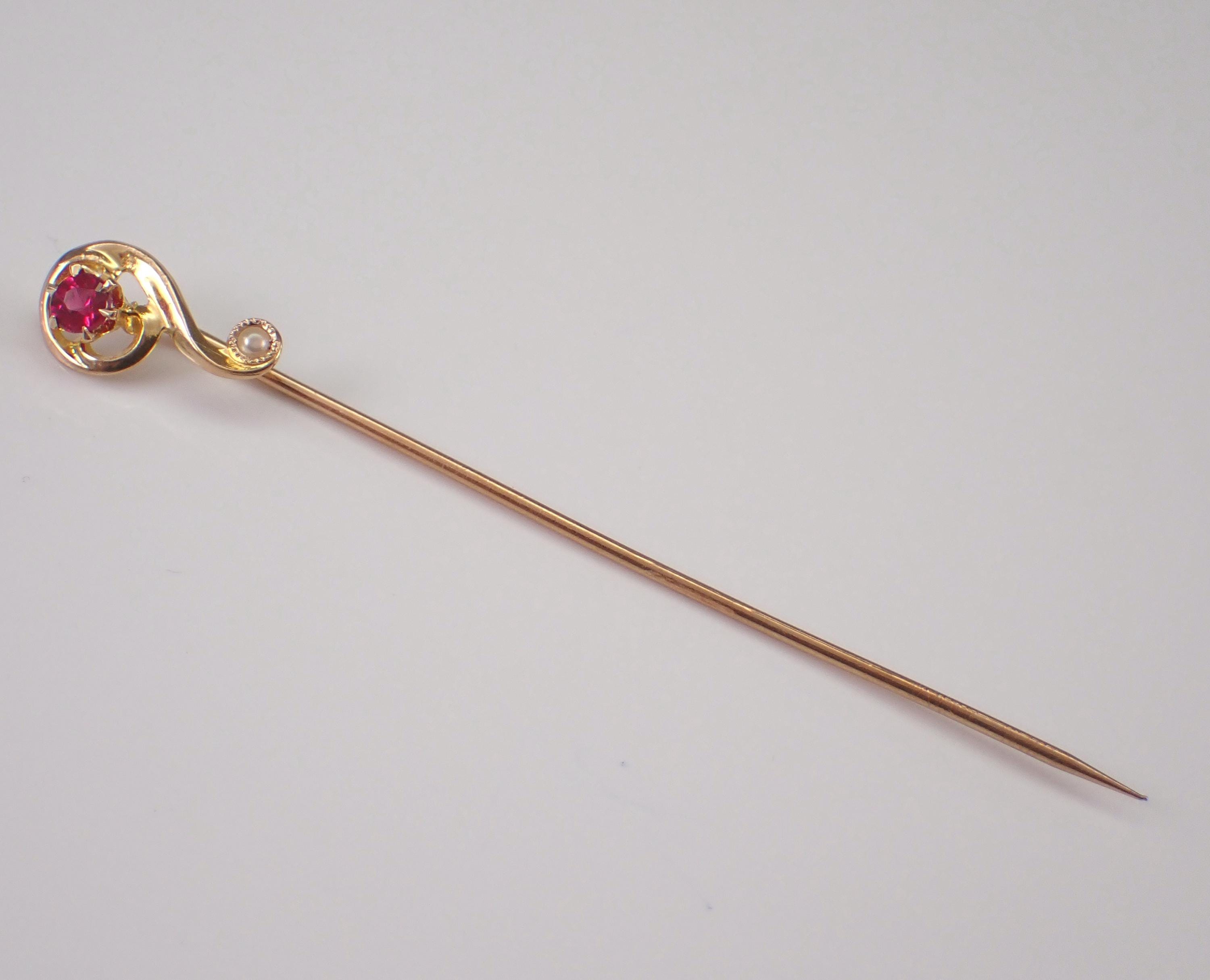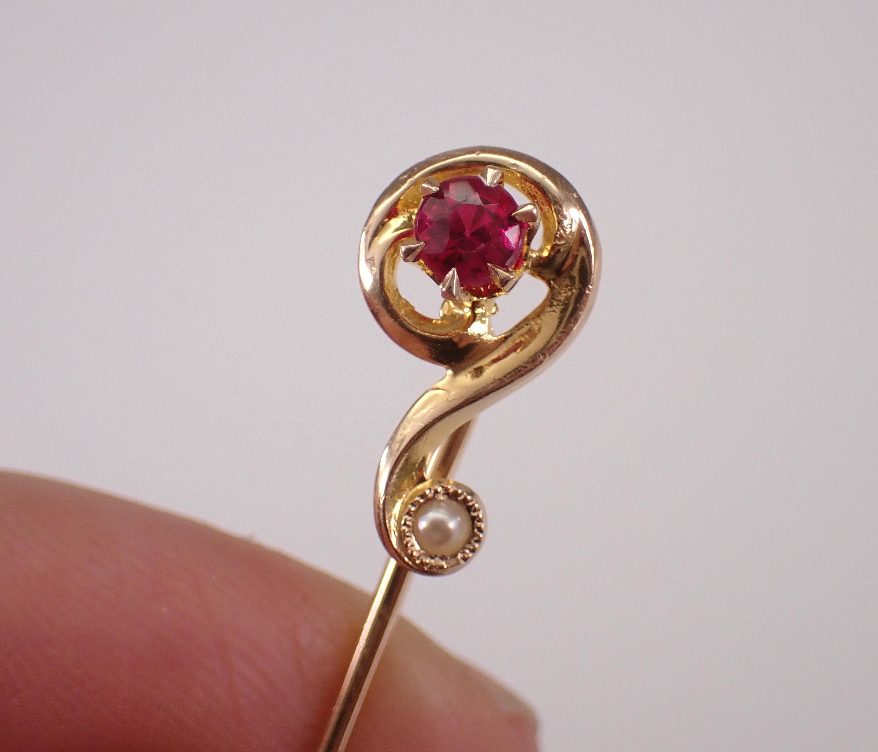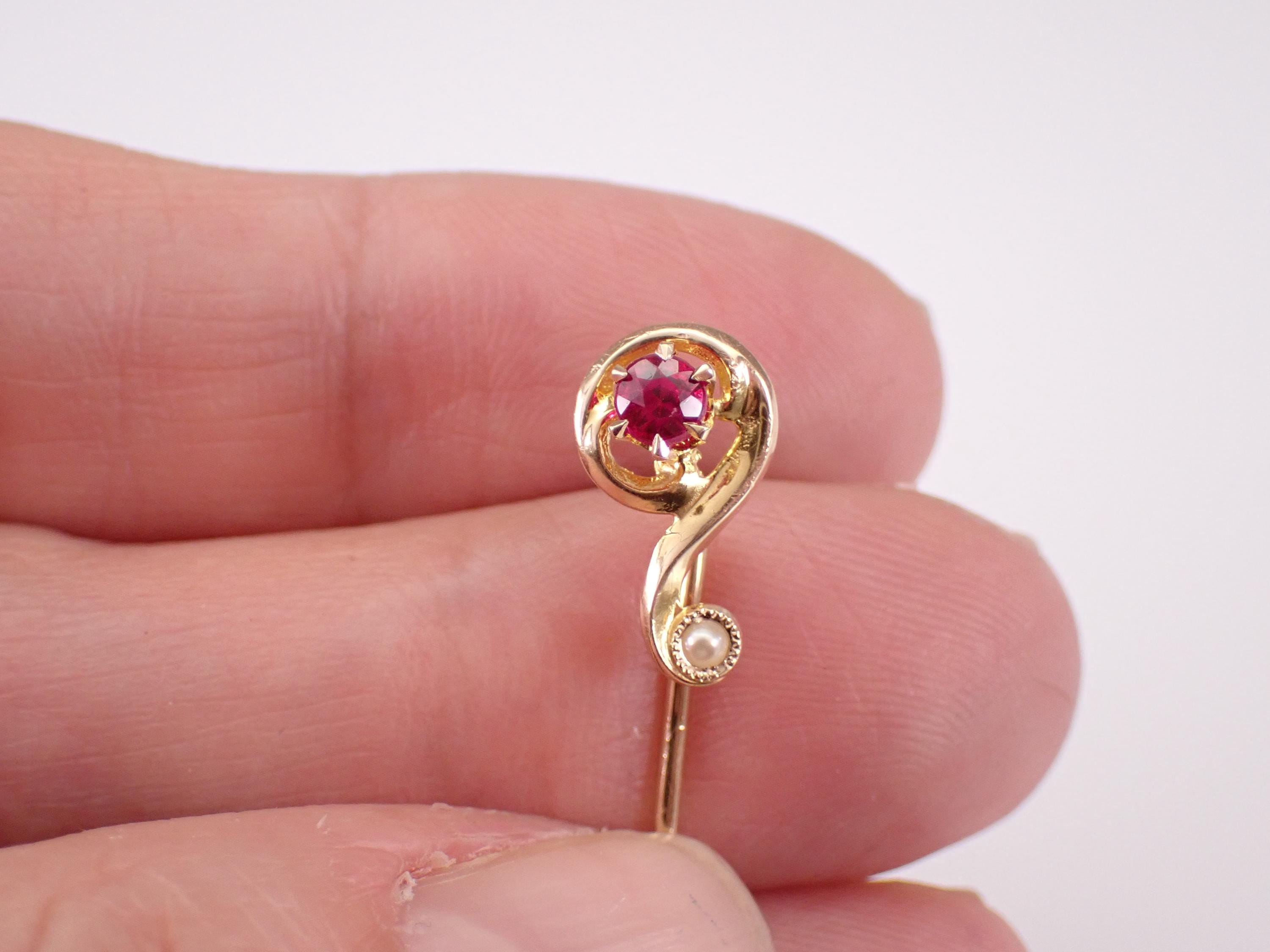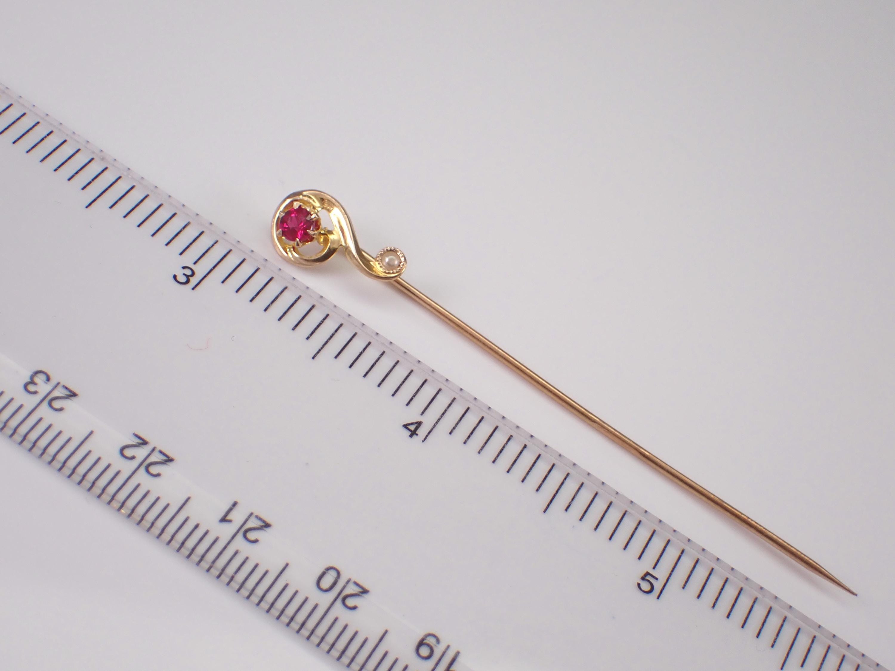 14K Yellow Gold Antique Ruby and Pearl Stick Pin. This pin is set with one Round Ruby in the center and one Seed Pearl. The Ruby in this pin measures 3mm in diameter and is Lab Grown. This pin weighs 1.1 grams and I will ship this pin promptly in a beautiful gift box.