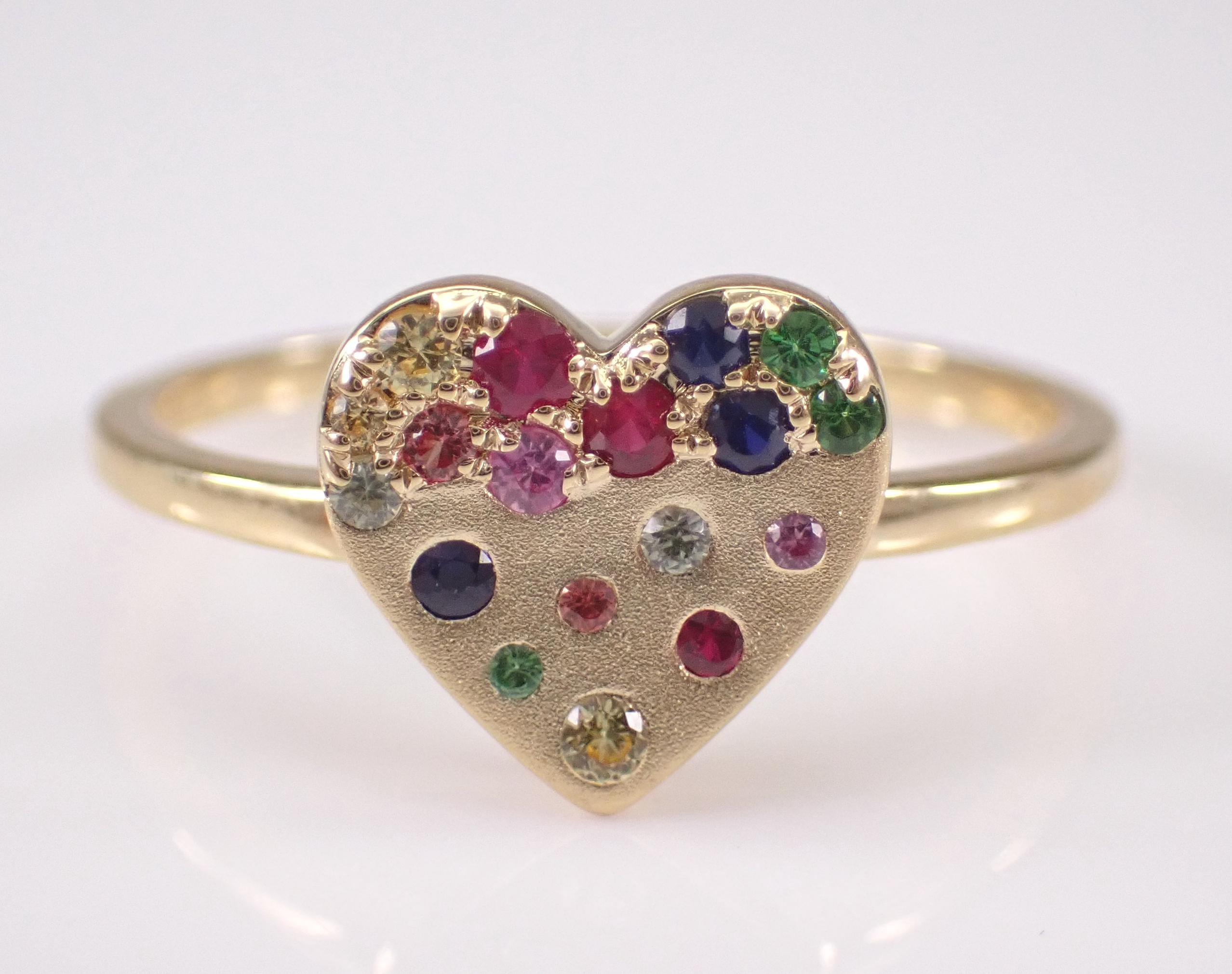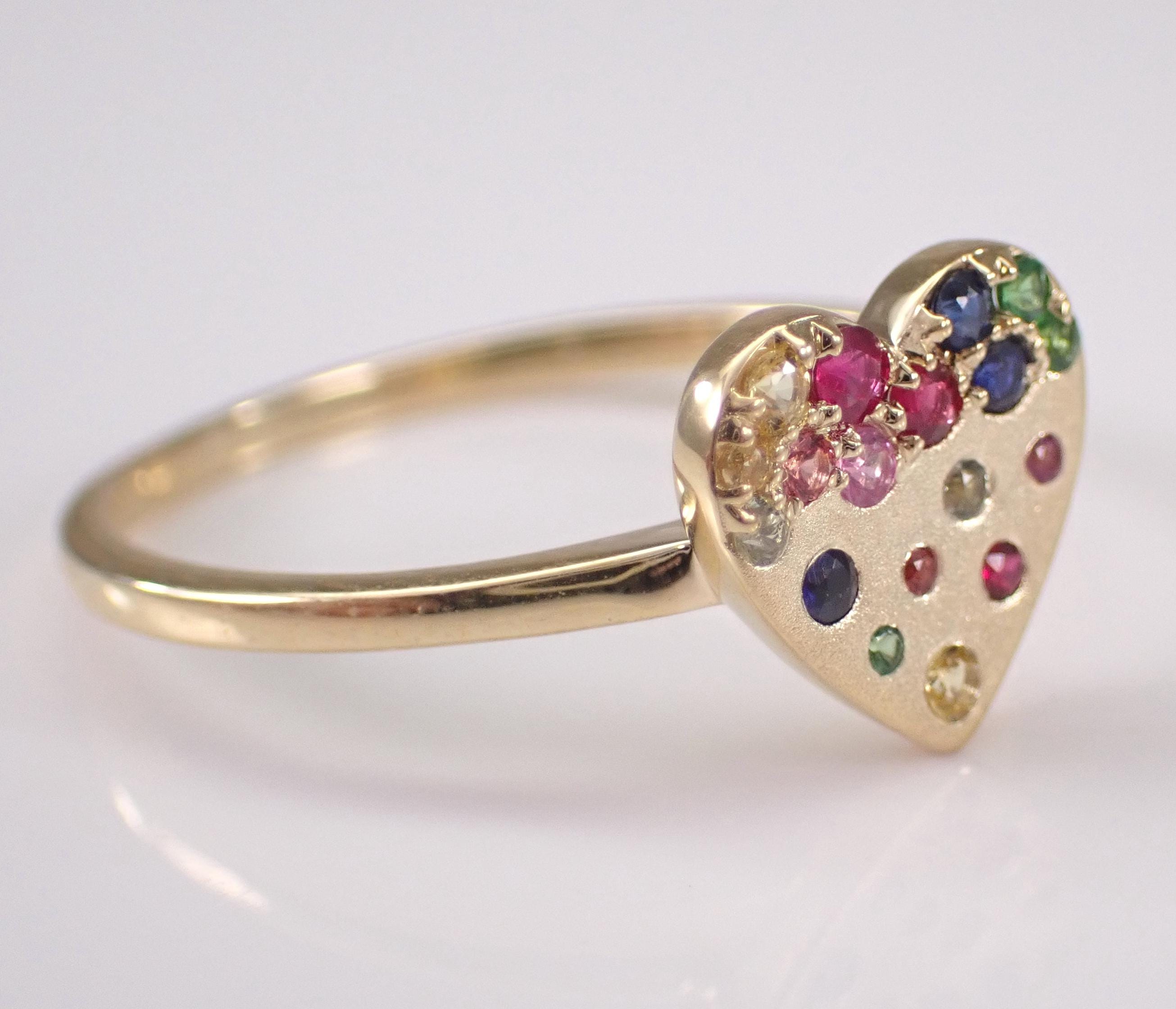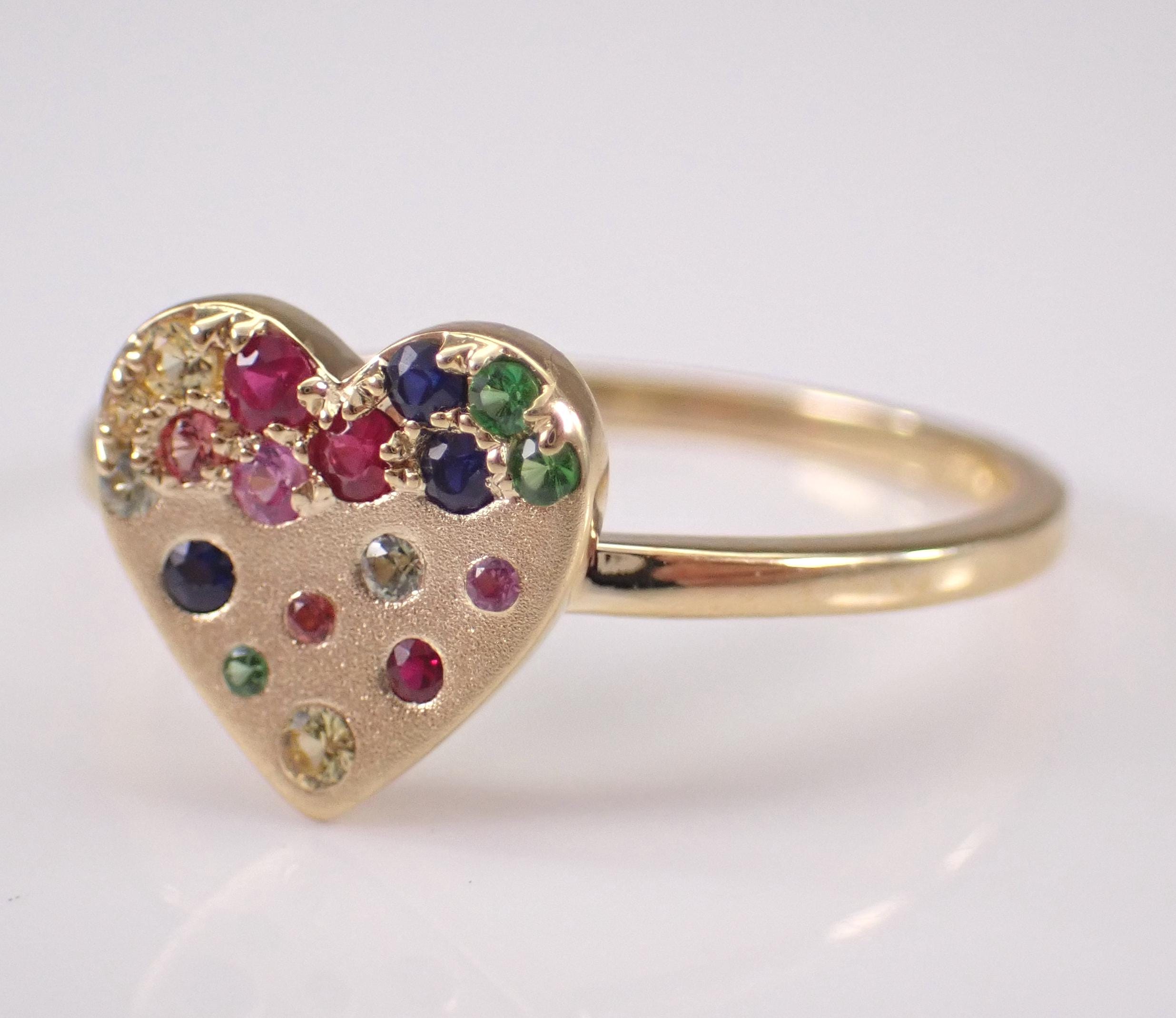 Yellow Gold Multi Color Sapphire Heart Ring. This unique ring is set with eighteen Round Multi Color Sapphires. These Sapphires are 100% genuine and amount to a total weight of .20 carat. This ring is 10KT Yellow Gold, weighs 1.8 grams and is a finger size 7 1/4, which can be resized (please inquire about sizing with the finger size you need). This ring will be accompanied by an appraisal by a GIA Certified Diamond Grader with the retail replacement value of $1,479.00. I will ship this ring promptly in a gift box.