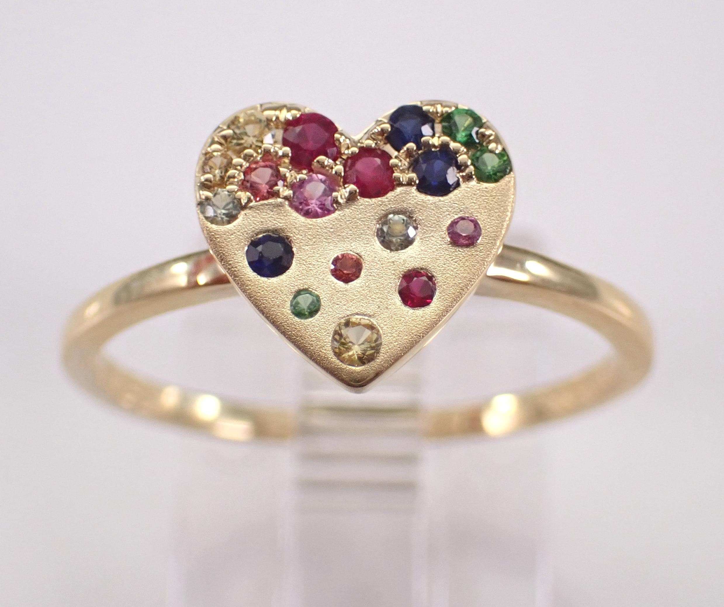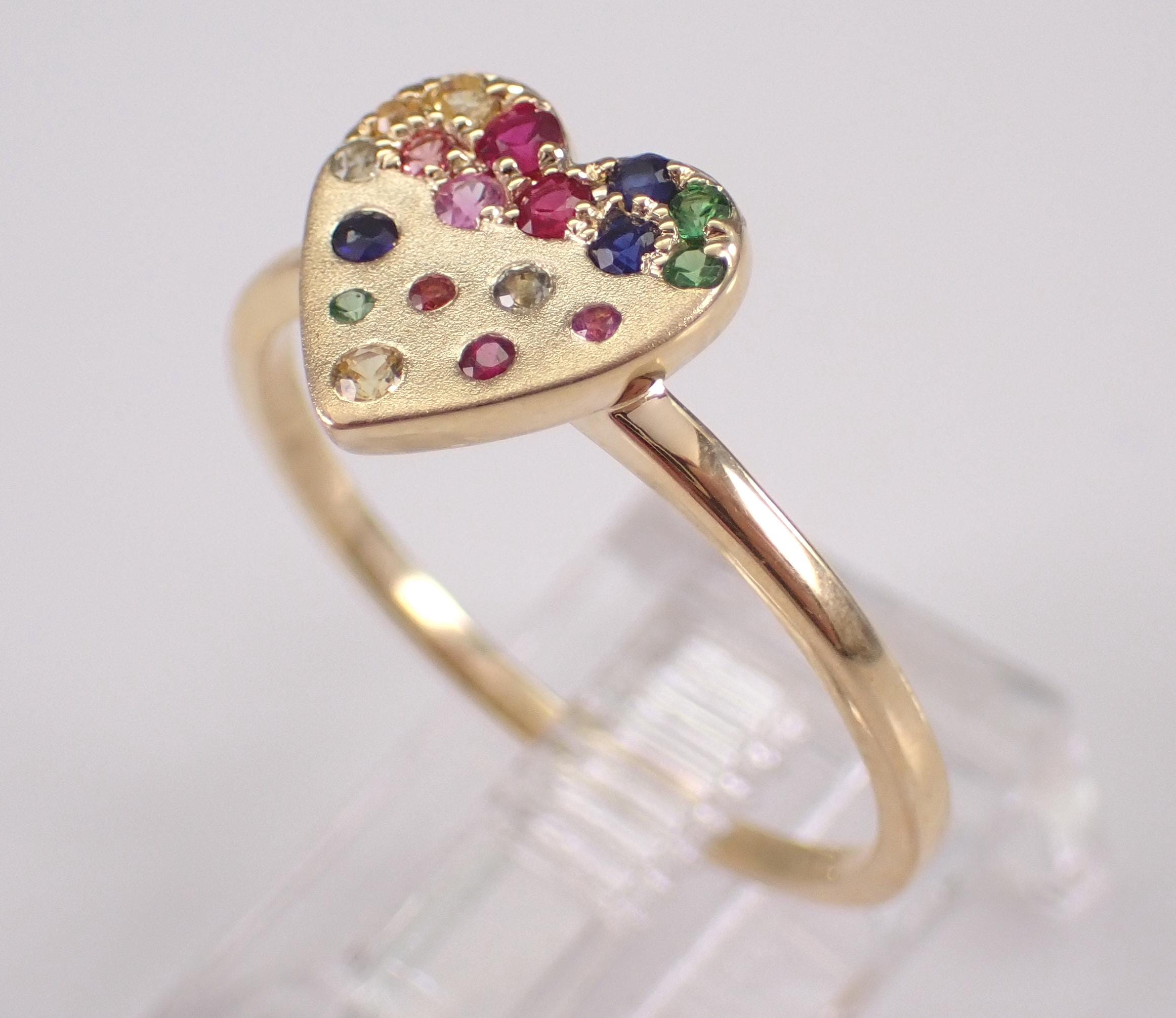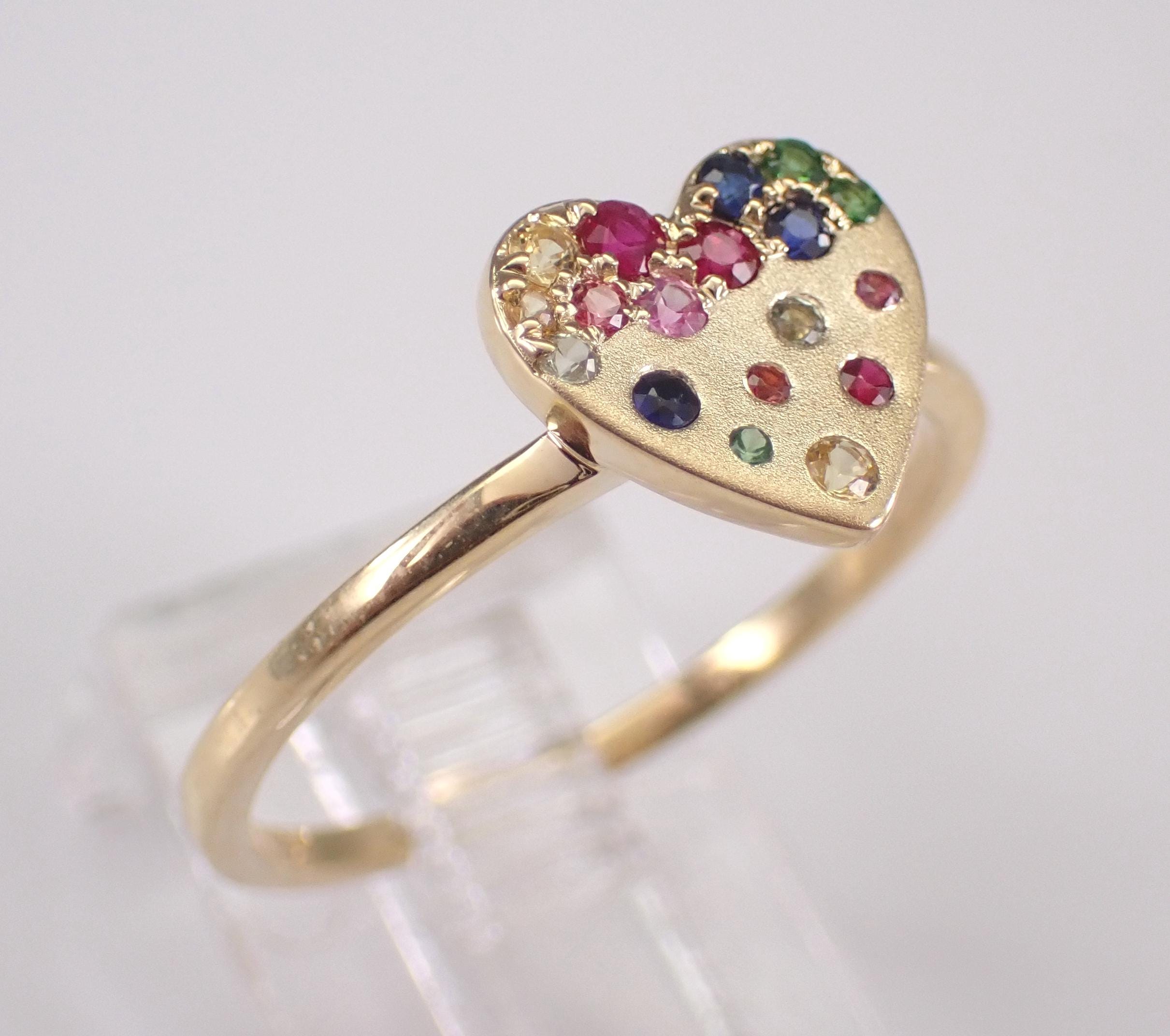 Yellow Gold Multi Color Sapphire Heart Ring. This unique ring is set with eighteen Round Multi Color Sapphires. These Sapphires are 100% genuine and amount to a total weight of .20 carat. This ring is 10KT Yellow Gold, weighs 1.8 grams and is a finger size 7 1/4, which can be resized (please inquire about sizing with the finger size you need). This ring will be accompanied by an appraisal by a GIA Certified Diamond Grader with the retail replacement value of $1,479.00. I will ship this ring promptly in a gift box.