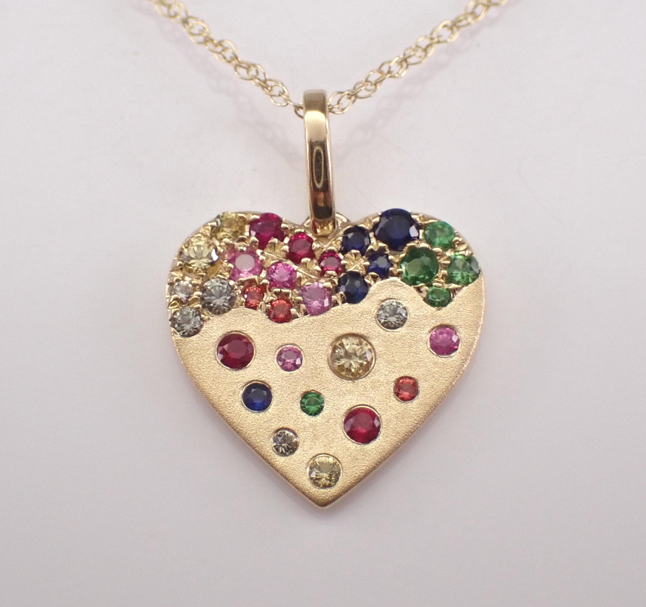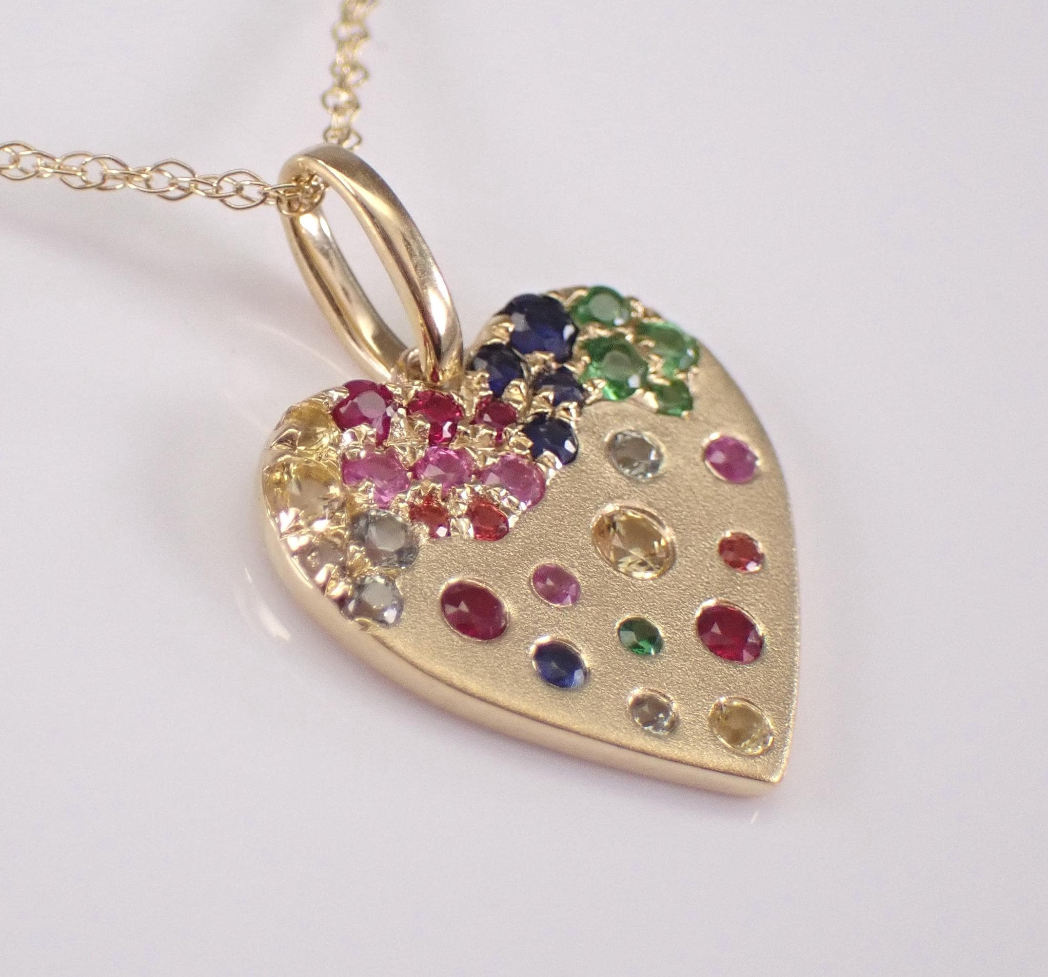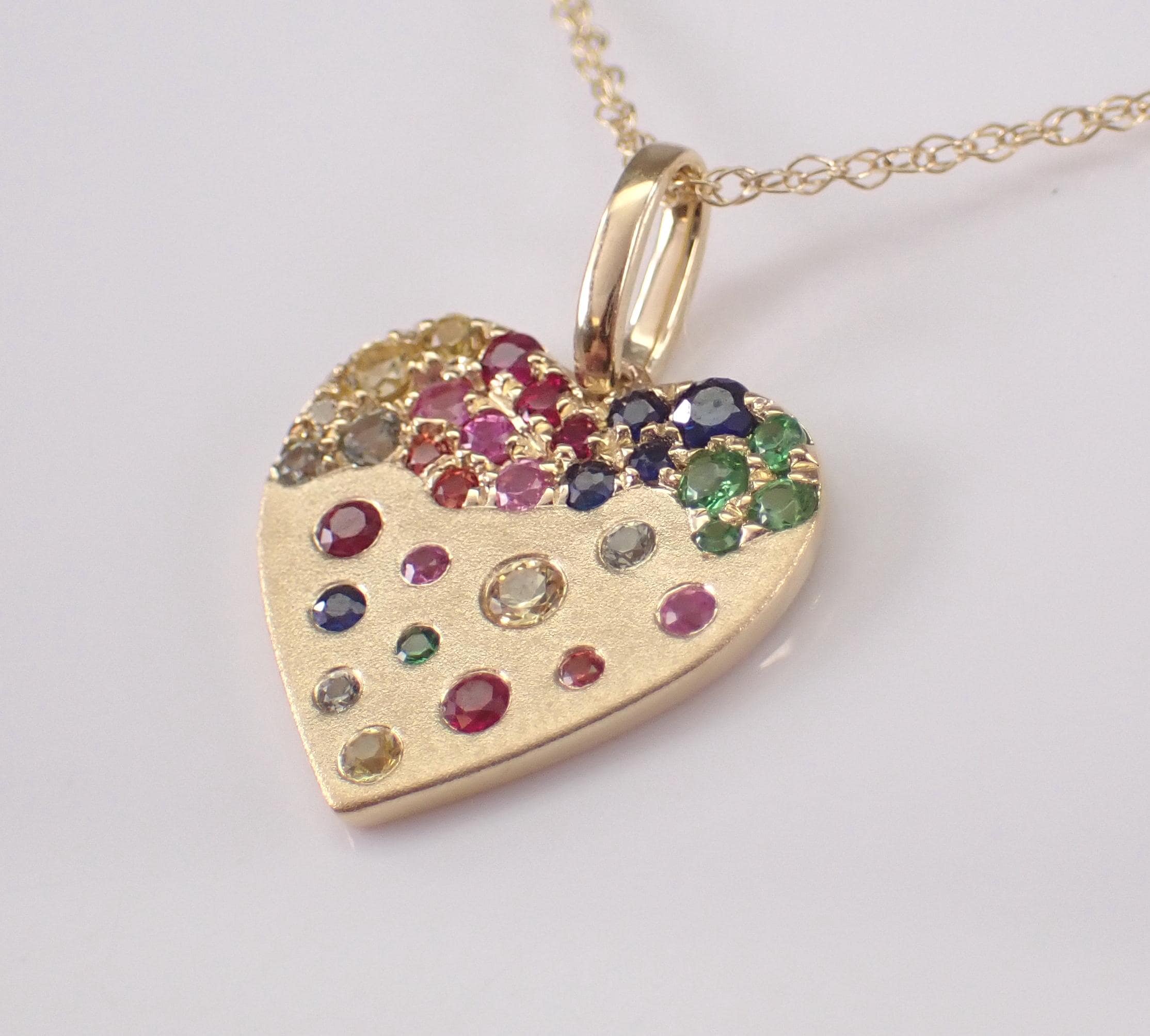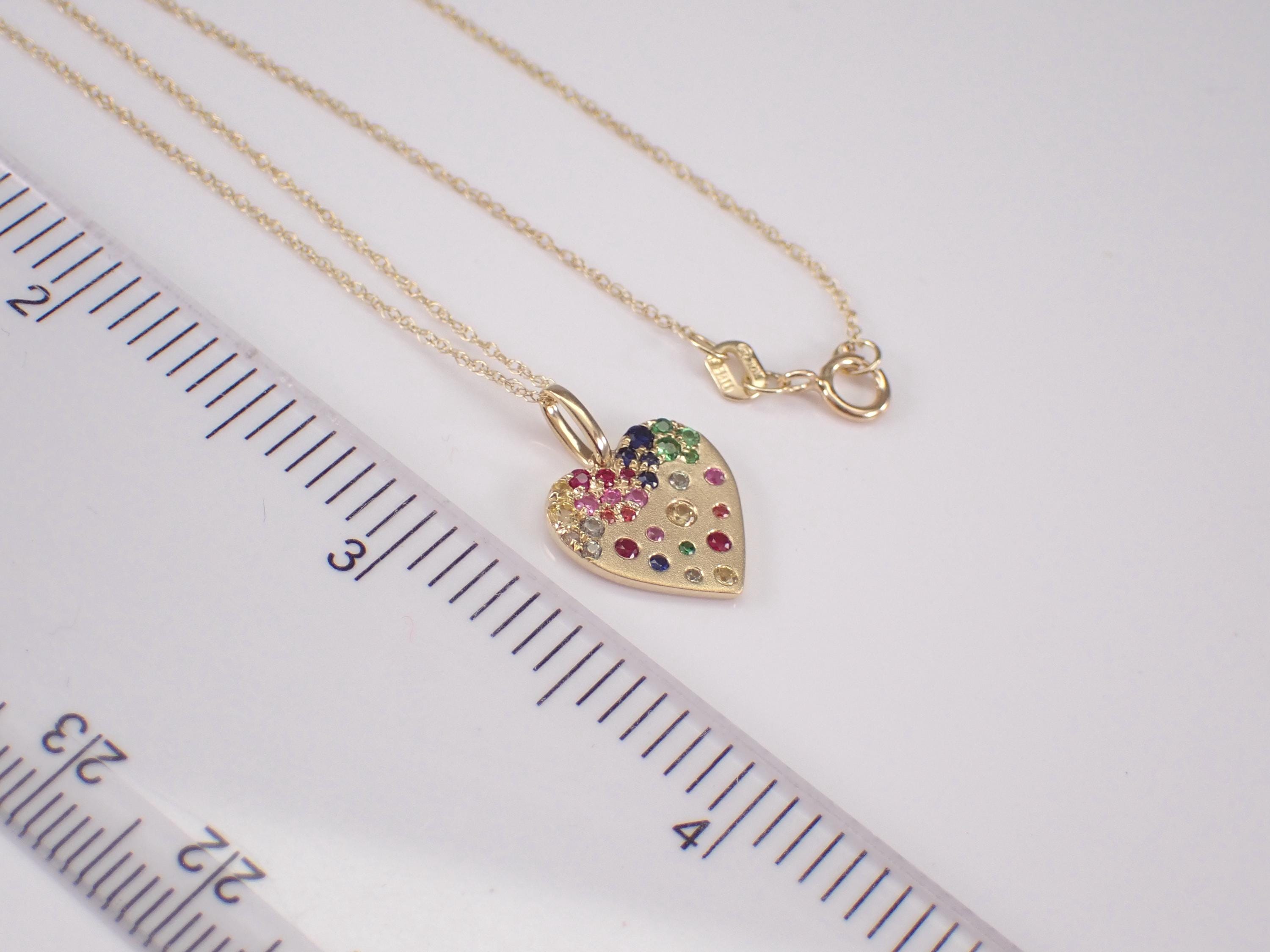 Yellow Gold Multi Color Sapphire Heart Charm Pendant with Chain. This pendant is set with thirty-two genuine natural round Multi Color Sapphires. These Sapphires weigh a total of .40 carat. This pendant is 10KT Yellow Gold and comes with an 18" 10KT Yellow Gold chain. Both the pendant and chain weigh a total of 1.5 grams and the pendant measures 12.5 X 12.5 mm. This necklace will be accompanied by an appraisal written by a GIA Certified Diamond Grader with the retail replacement value of $1,395.00. I will ship this necklace promptly in a beautiful gift box.