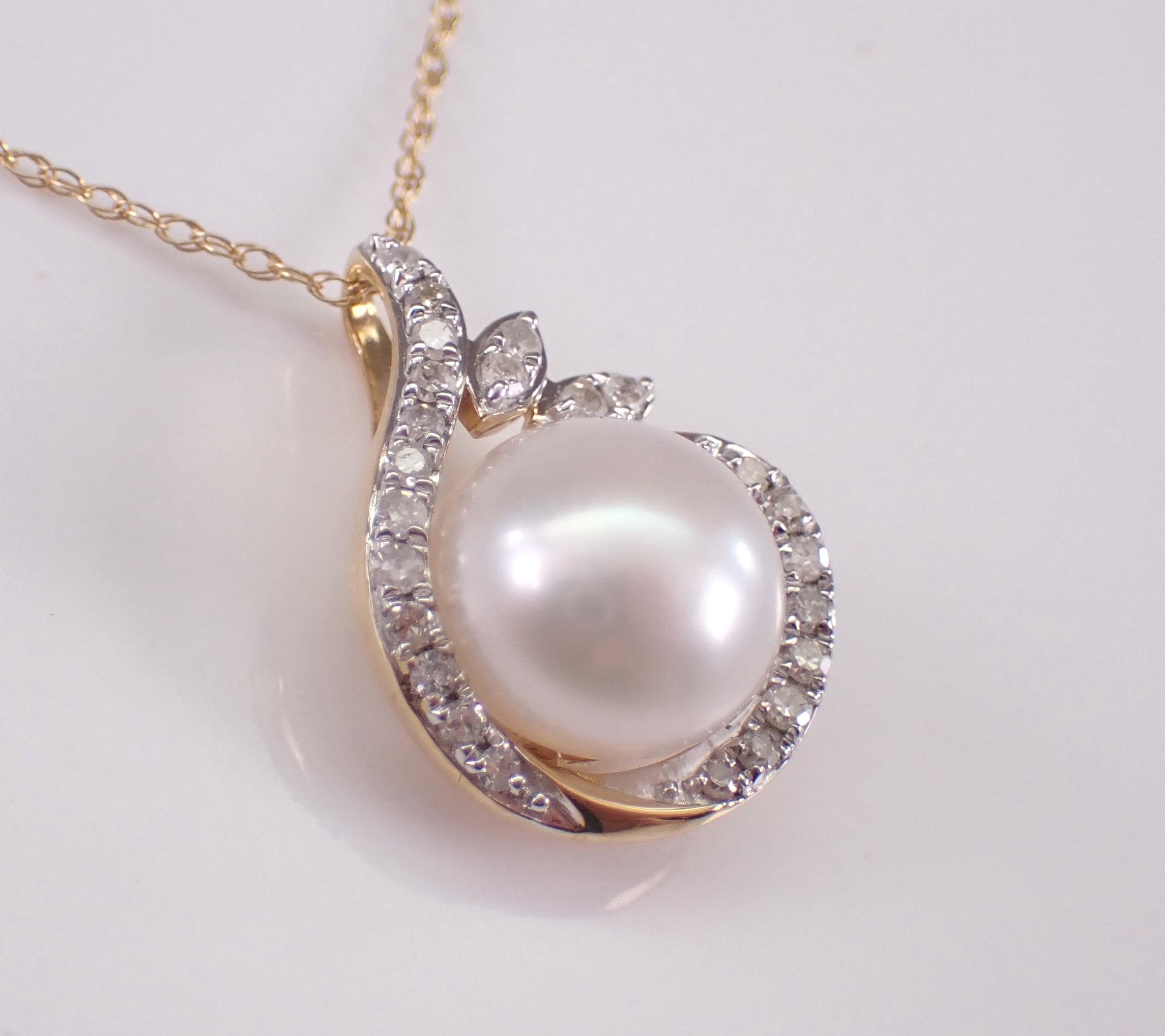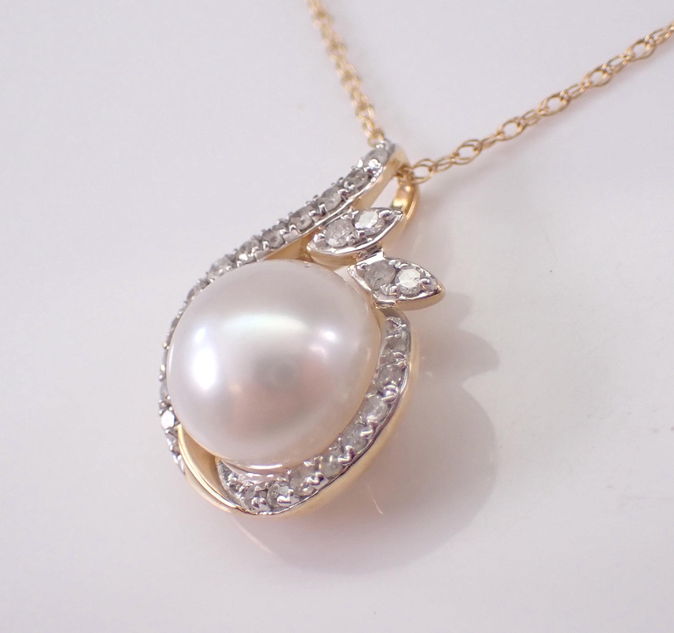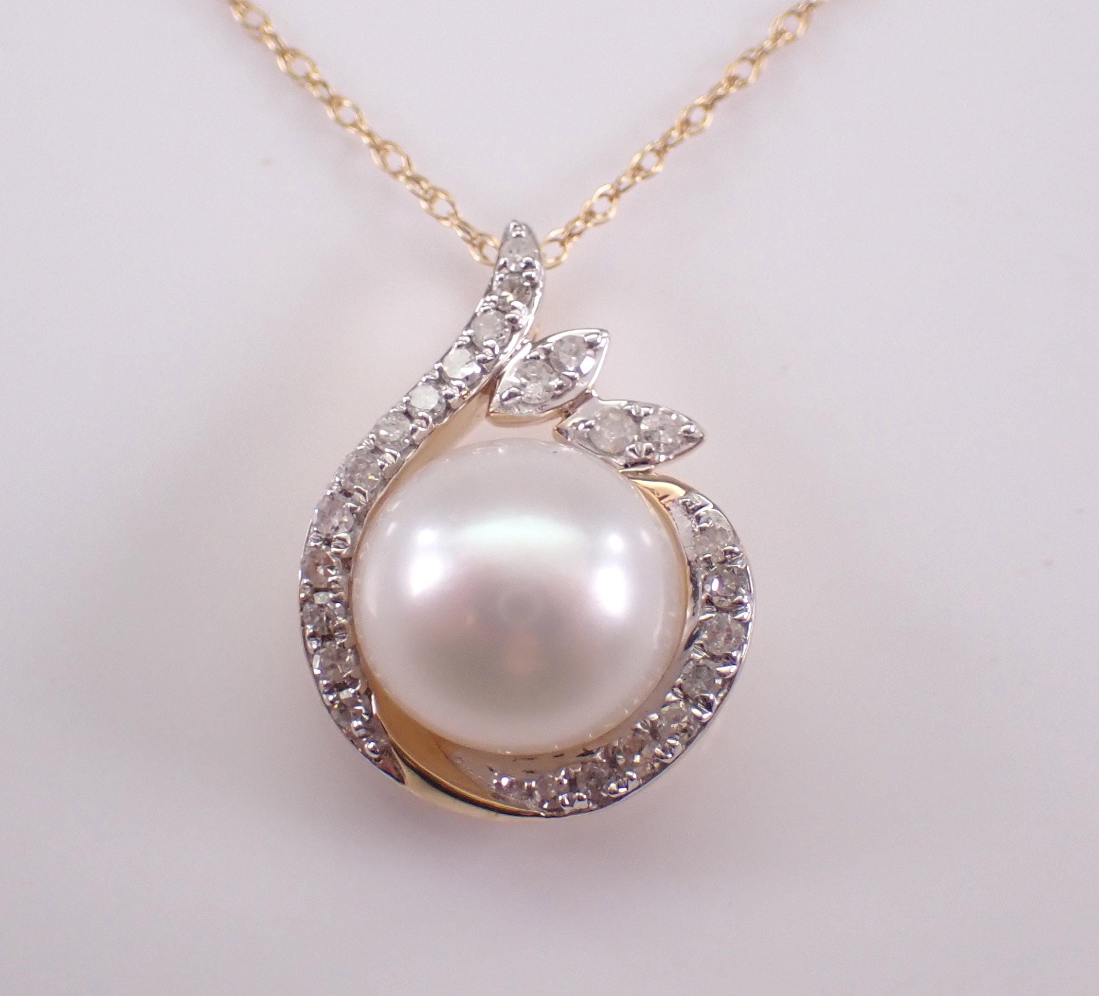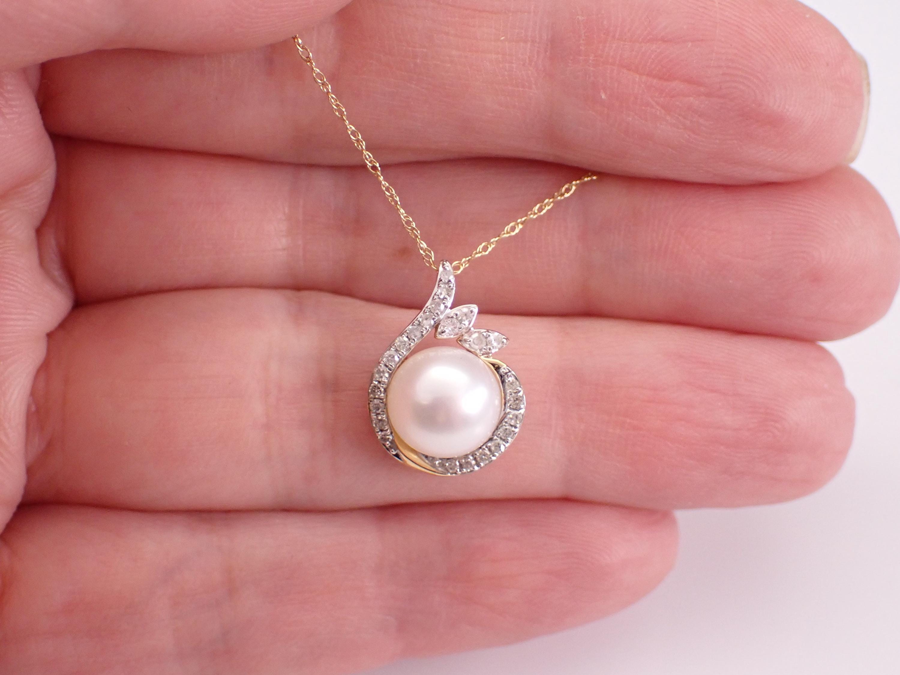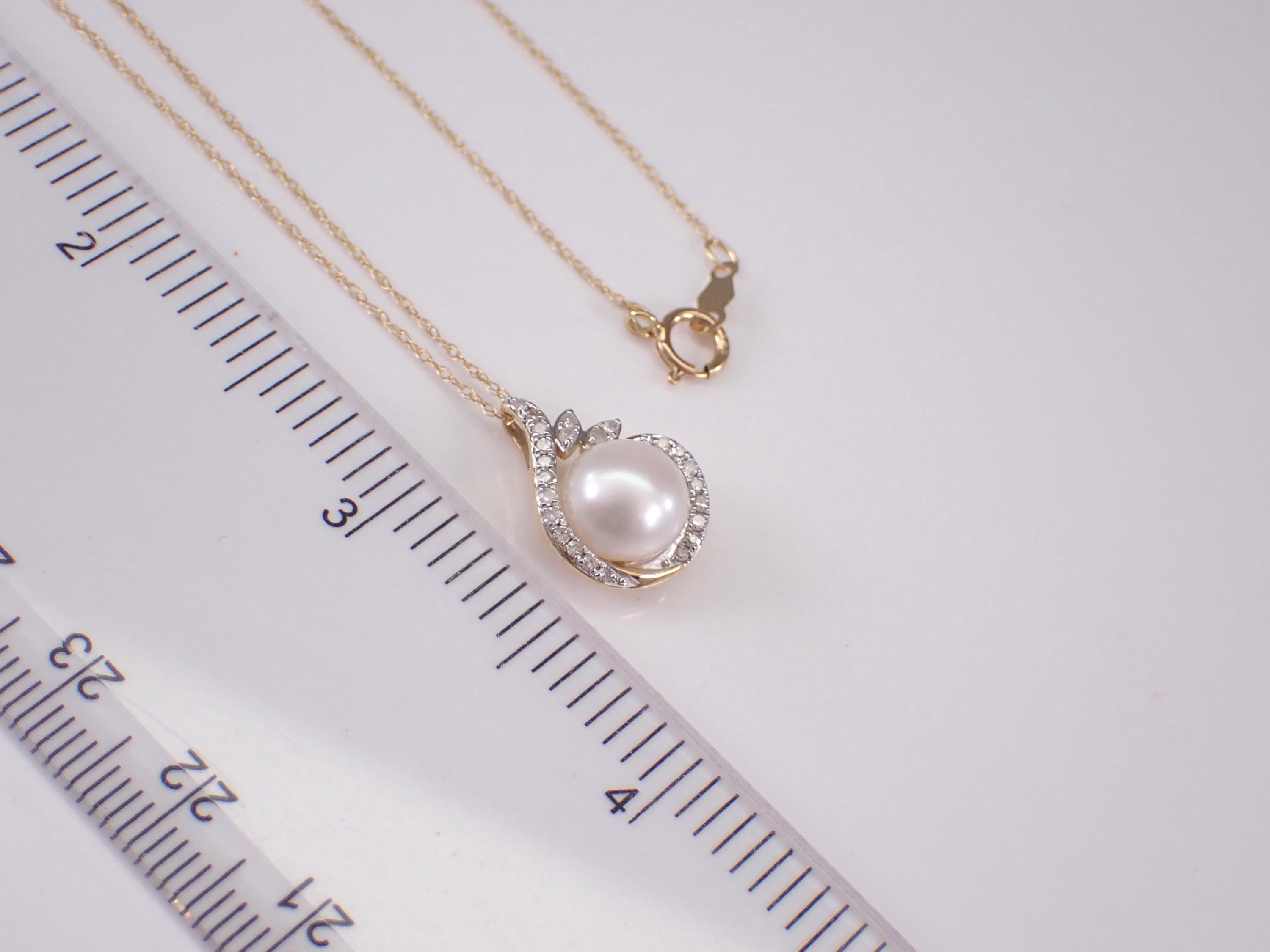 14K Yellow Gold Diamond and Pearl Pendant with Chain. This pendant is set with one Round White Pearl and twenty-four genuine Round Brilliant Diamonds. The diamonds in this pendant are H color, SI/I clarity and weigh a total of .16 carat. The pearl in this pendant measures 8 mm in diameter. This pendant comes accompanied with an 18" 14KT Yellow Gold chain. The pendant and chain weigh a total of 2.5 grams and the pendant measures 16 X 12 mm. This necklace will be accompanied by an appraisal written by a GIA Certified Diamond Grader with the retail replacement value of $1,589.00. I will ship this necklace promptly in a beautiful gift box.