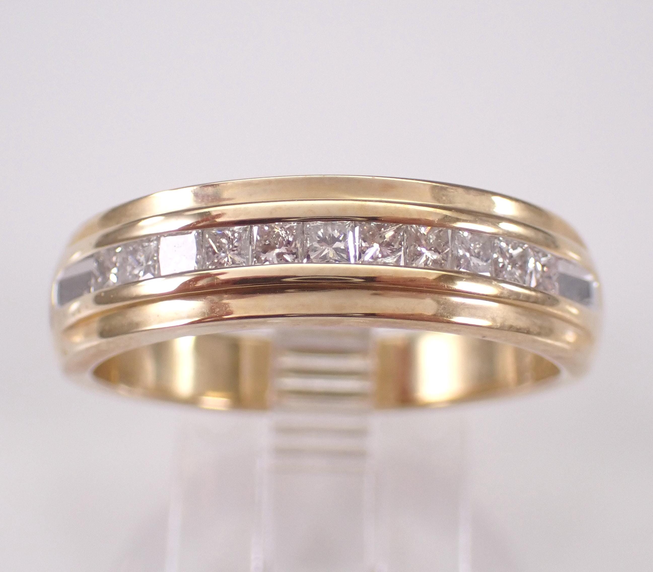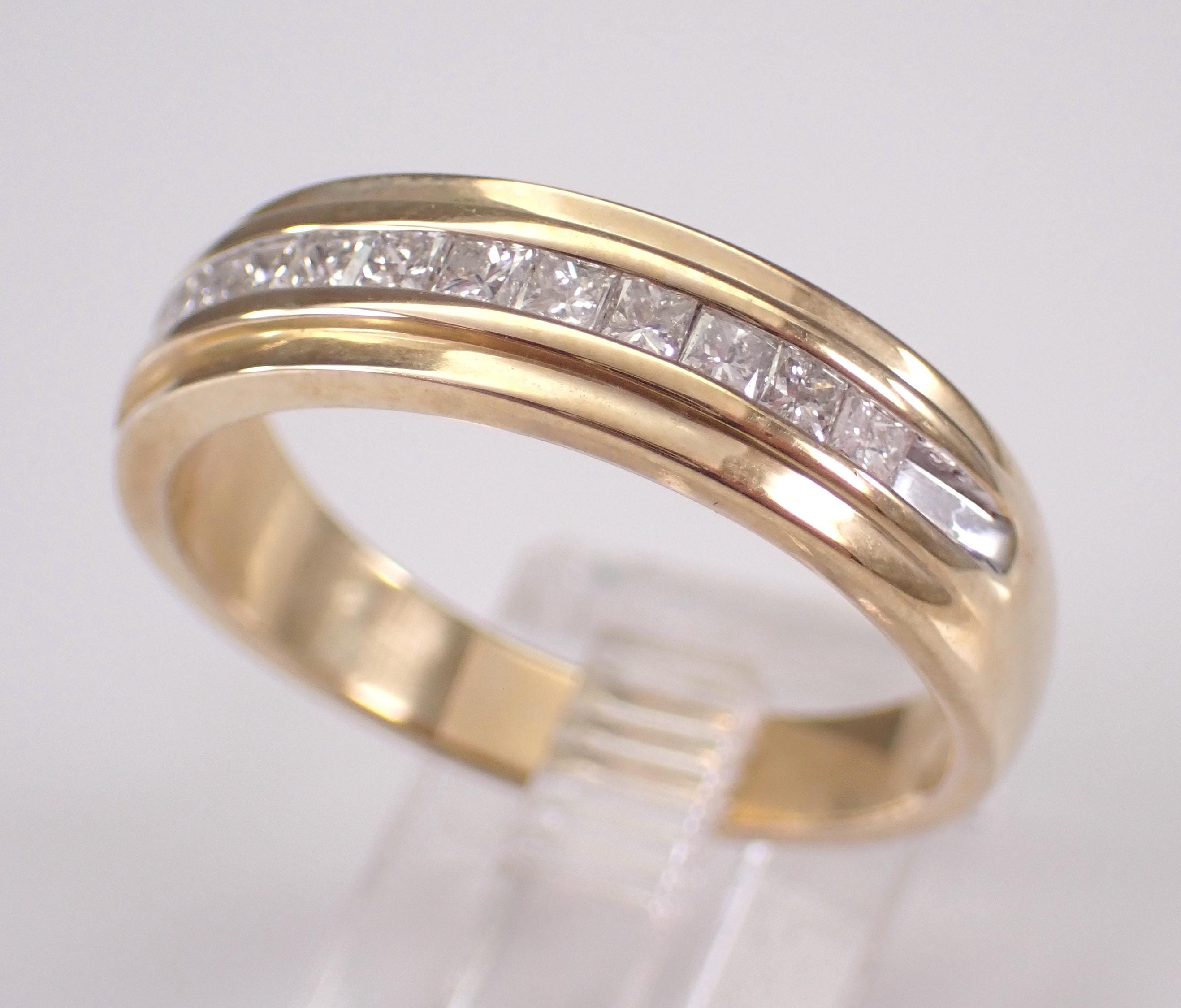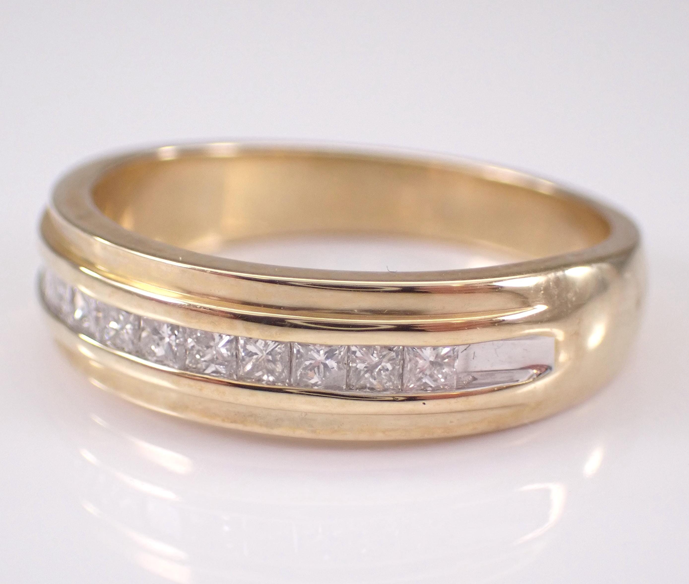 Yellow Gold Men's Diamond Wedding Ring Anniversary Band. This is a beautiful ring set with eleven genuine princess-cut brilliant diamonds. These diamonds are H color, SI/I1 clarity and weigh a total of 1/2 carat. The ring is 10KT Yellow Gold, weighs 5.5 grams, measures 5.5 mm in width and is a finger size 9 3/4, which can be sized (please inquire about sizing with the finger size you need). This ring will be accompanied by an appraisal by a GIA Certified Diamond Grader with the retail replacement value of $2,295.00. I will ship this ring promptly in a gift box.