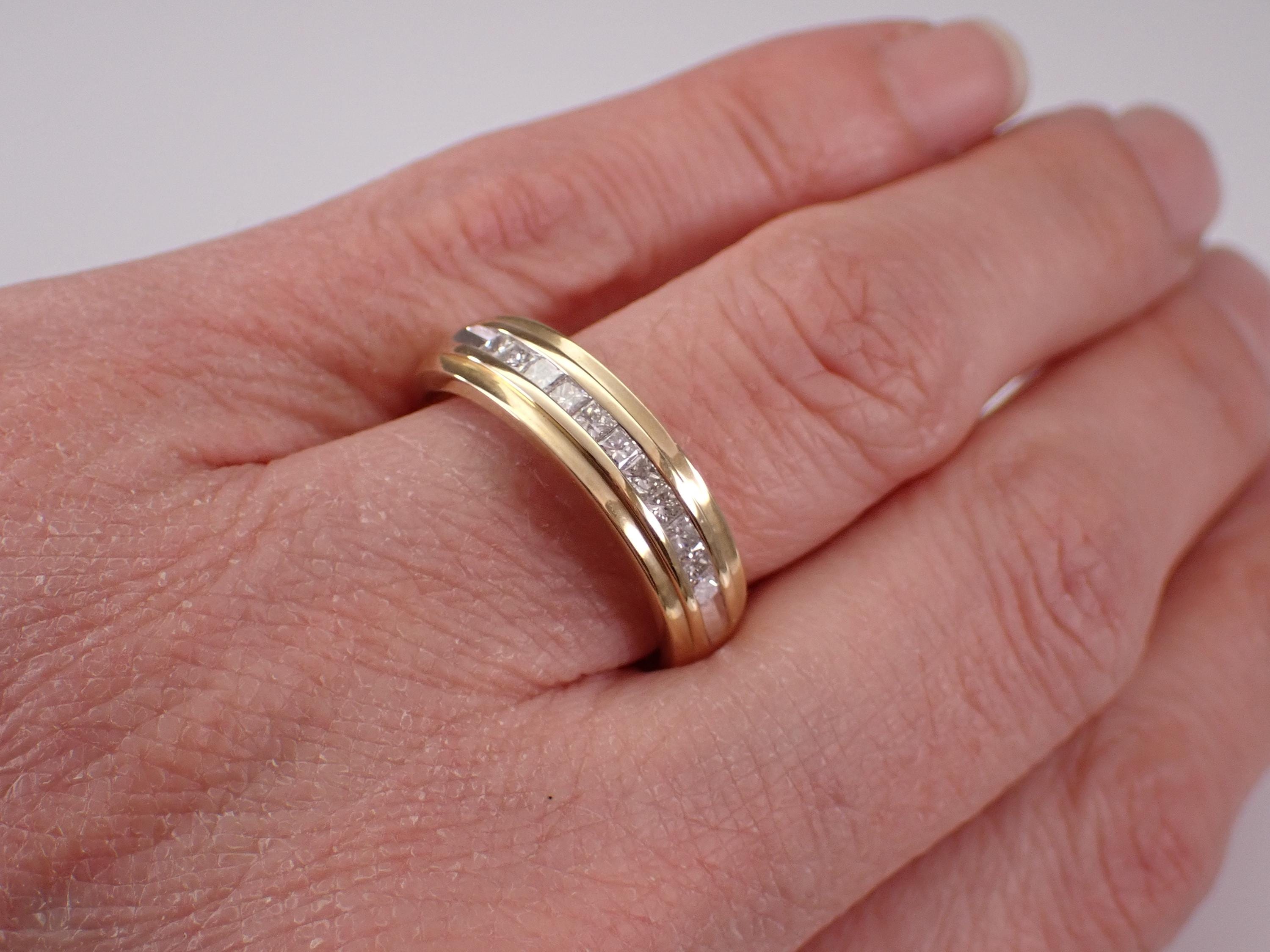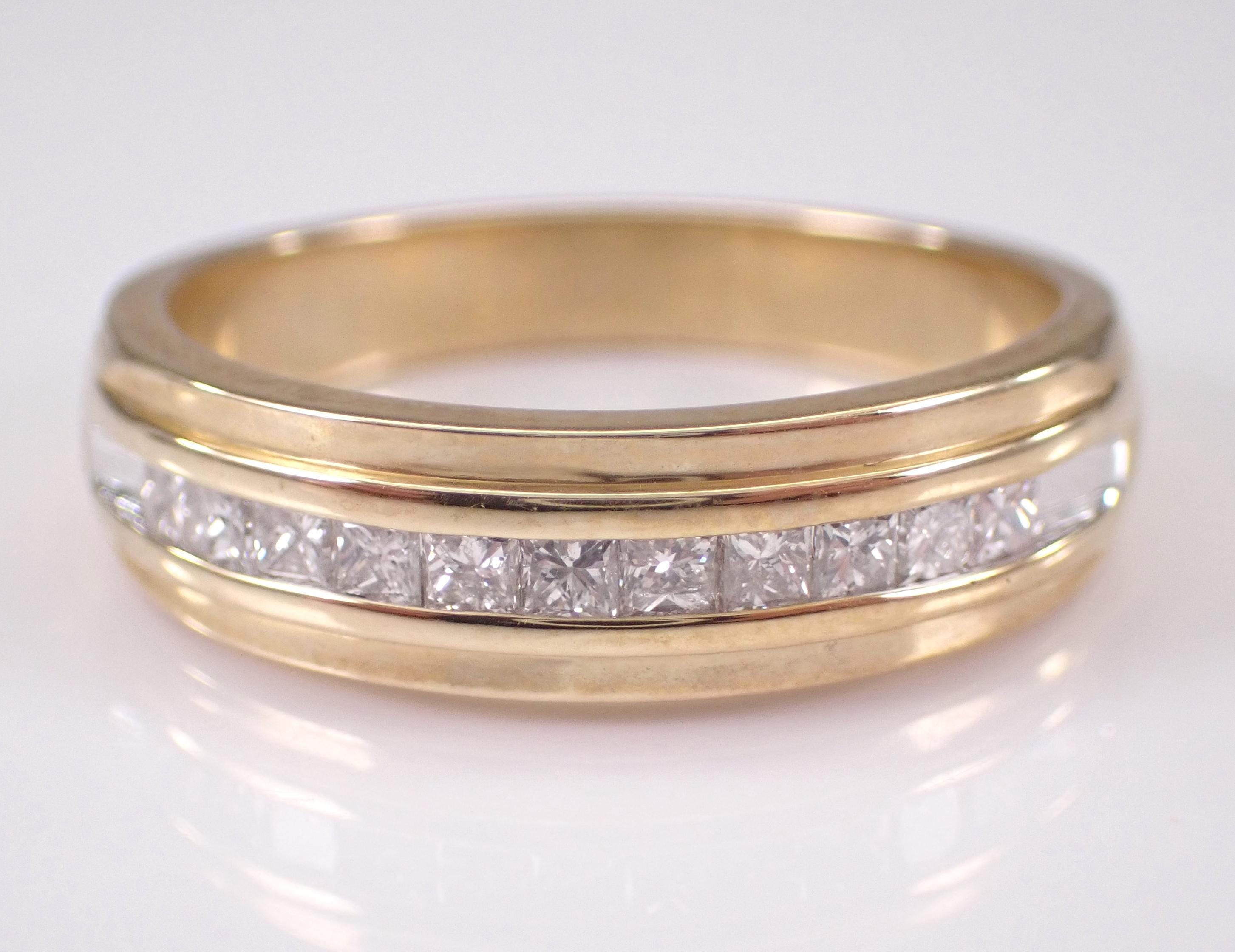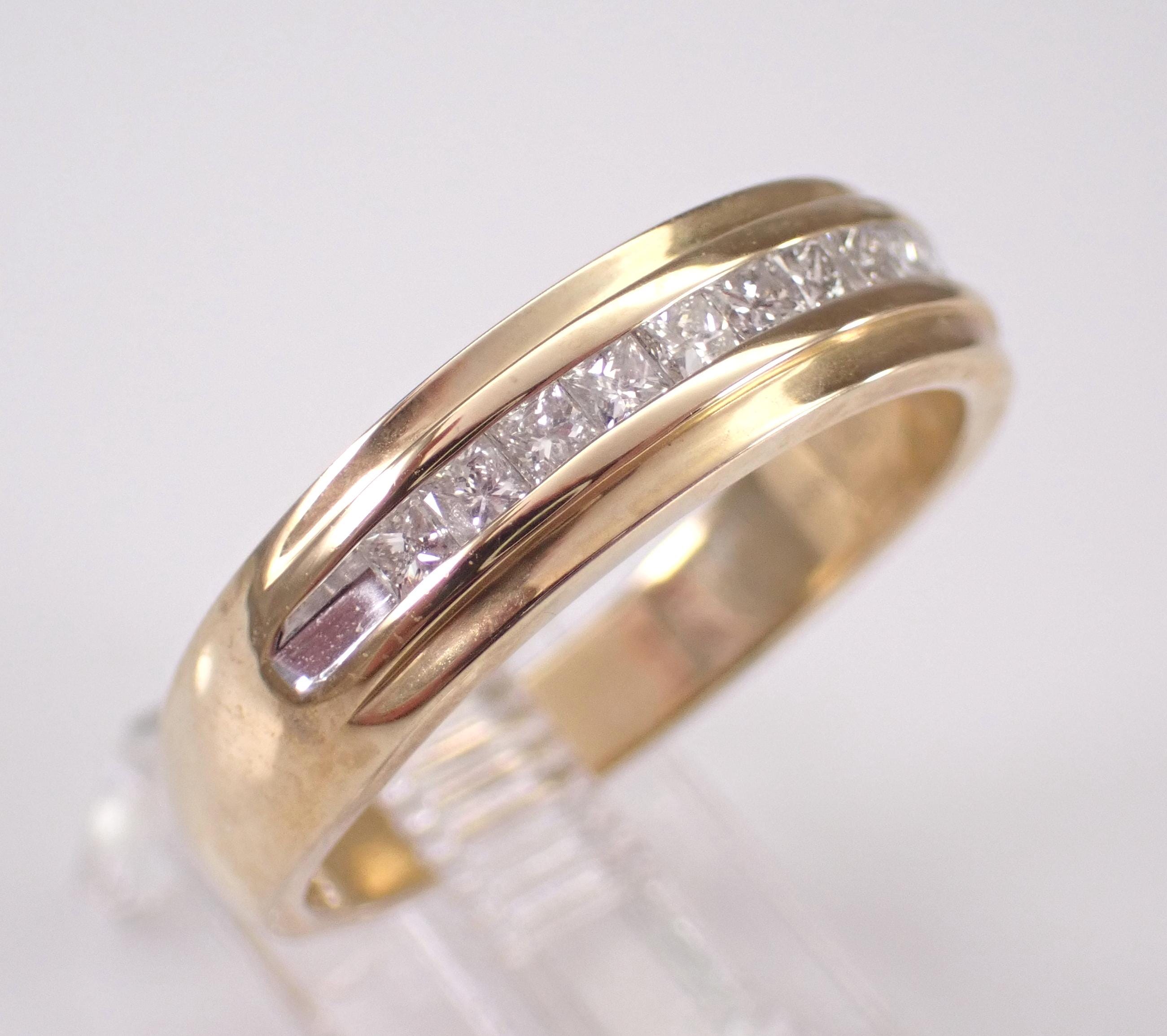 Yellow Gold Men's Diamond Wedding Ring Anniversary Band. This is a beautiful ring set with eleven genuine princess-cut brilliant diamonds. These diamonds are H color, SI/I1 clarity and weigh a total of 1/2 carat. The ring is 10KT Yellow Gold, weighs 5.5 grams, measures 5.5 mm in width and is a finger size 9 3/4, which can be sized (please inquire about sizing with the finger size you need). This ring will be accompanied by an appraisal by a GIA Certified Diamond Grader with the retail replacement value of $2,295.00. I will ship this ring promptly in a gift box.