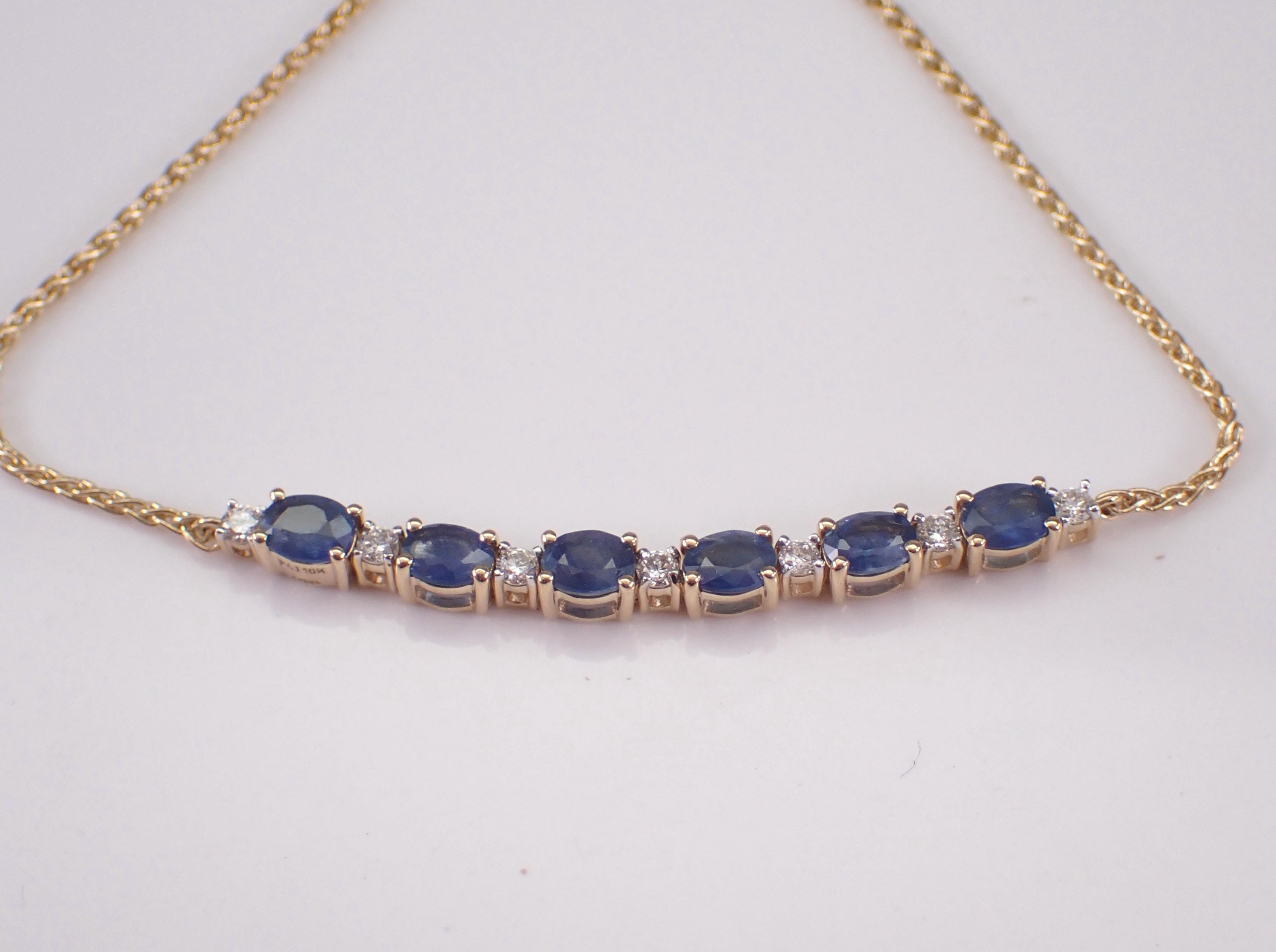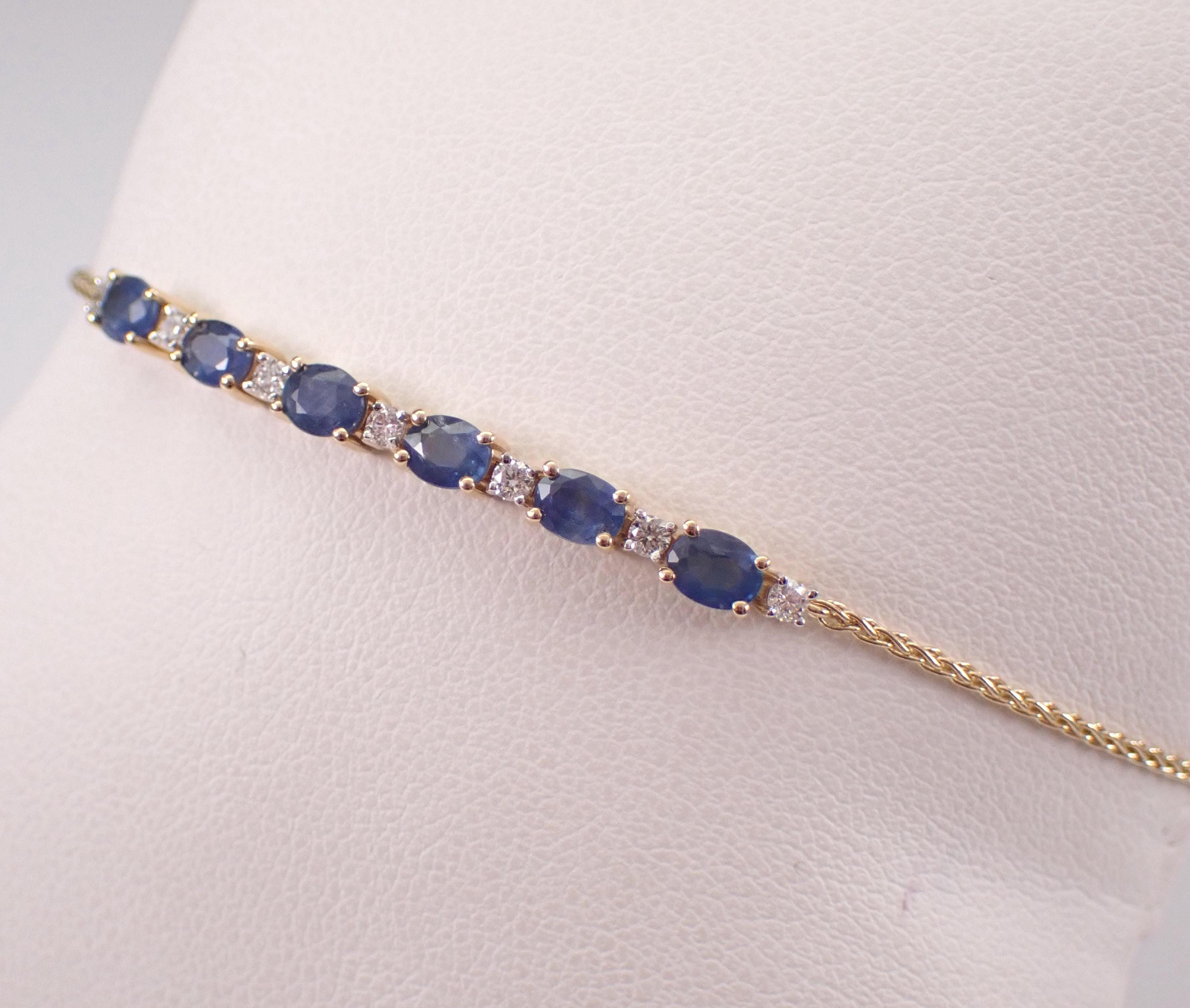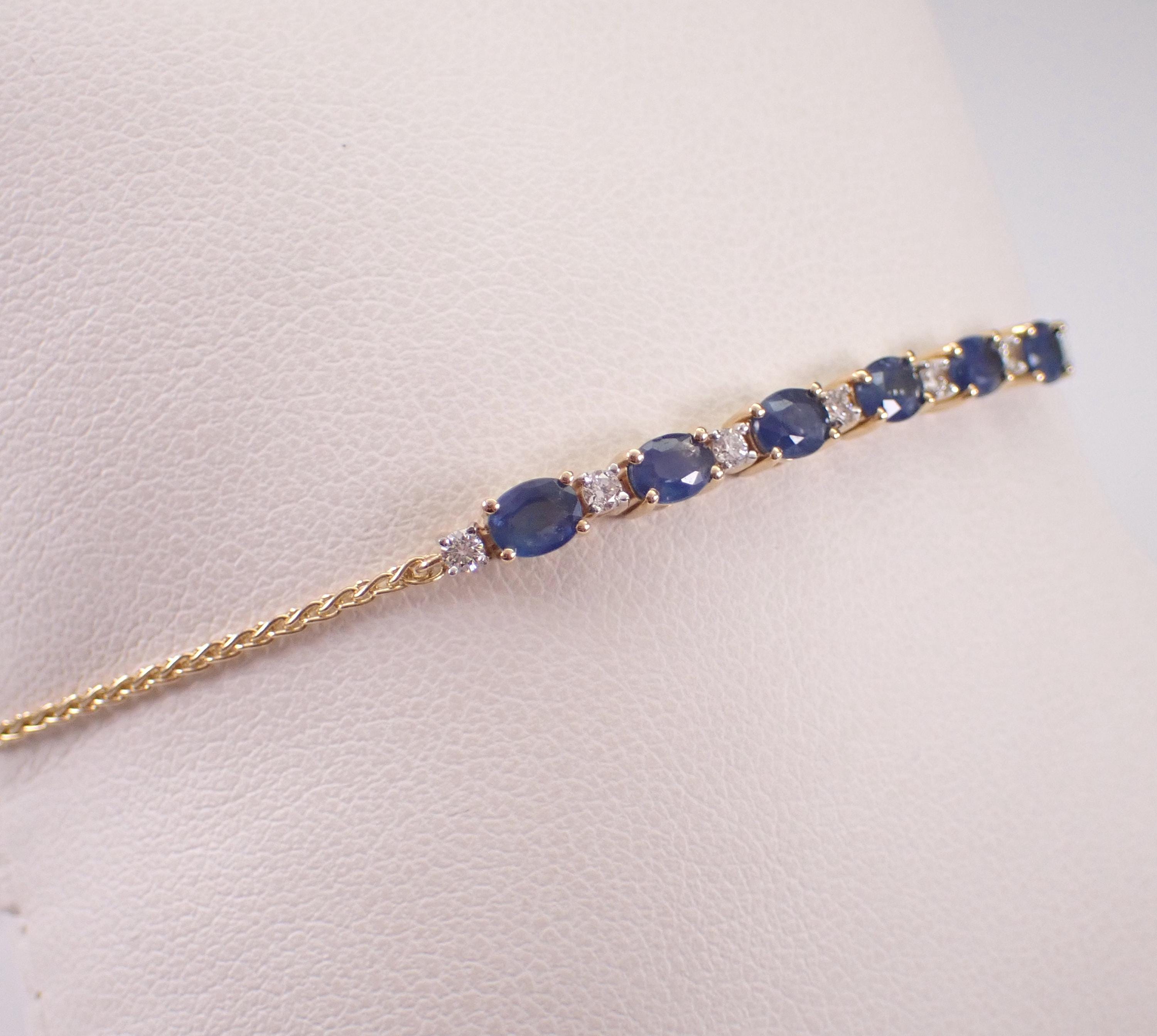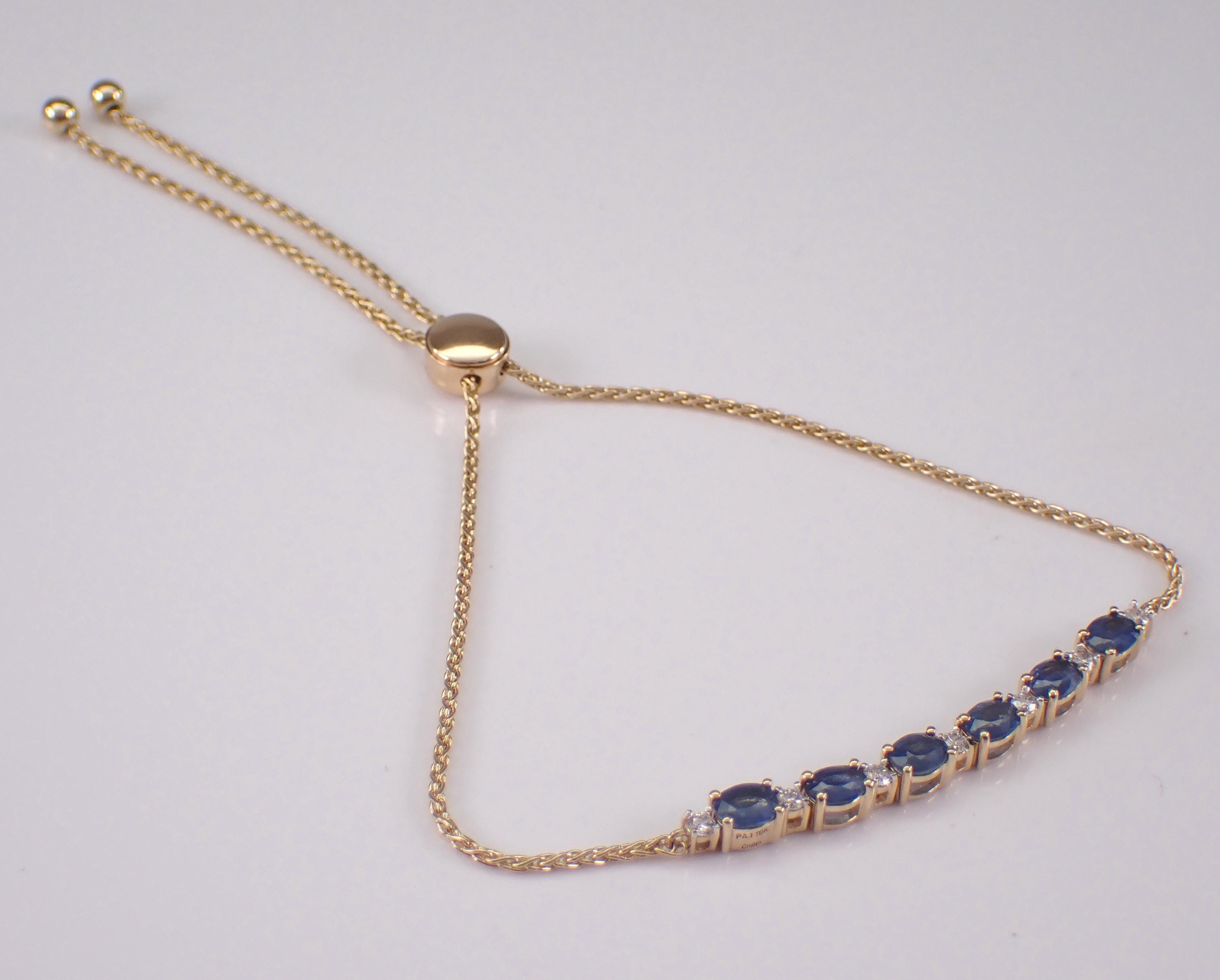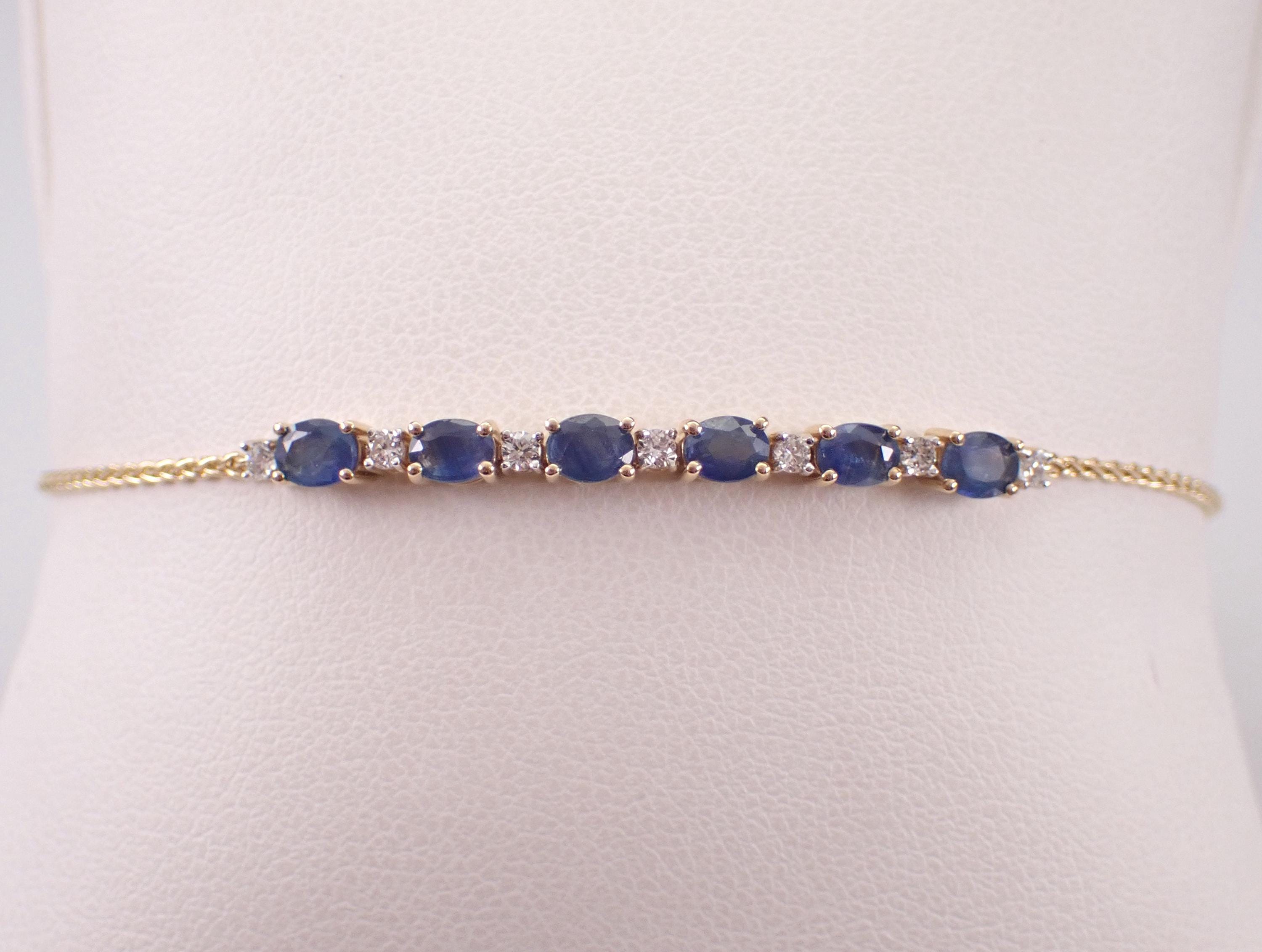 Yellow Gold Diamond and Sapphire Adjustable Bolo Bracelet. This bracelet is set with six genuine oval Sapphires and seven Round Brilliant Diamonds. These sapphires measure 4 X 3 mm each and amount to a total weight of 1 carat. The diamonds in this bracelet are G color, SI1 clarity and weigh a total of .25 carat. This bracelet is 10KT Yellow Gold and has an adjustable bolo closure. This bracelet weighs 2.7 grams. This bracelet will be accompanied by an appraisal written by a GIA Certified Diamond Grader with the retail replacement value of $1,695.00. I will ship this bracelet promptly in a beautiful gift box.