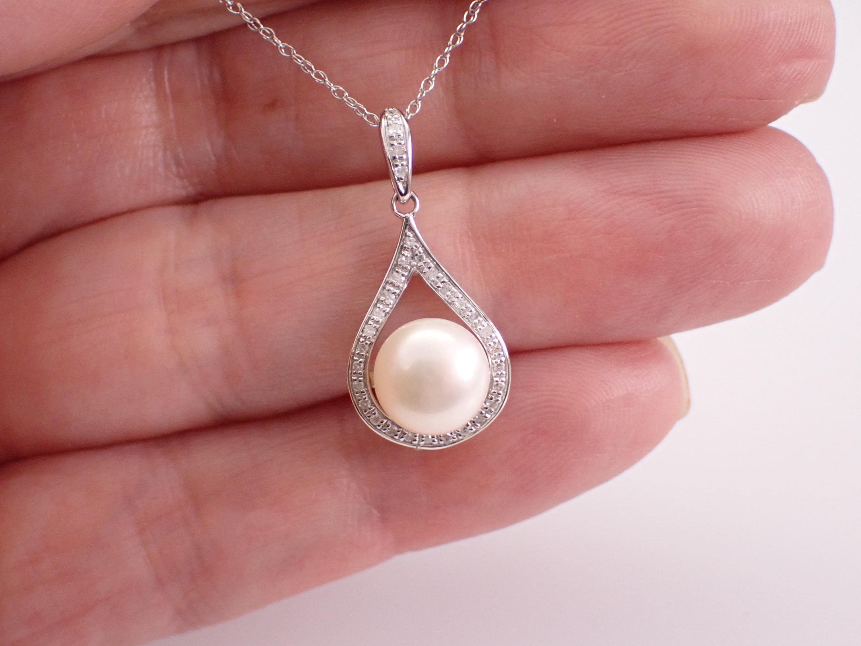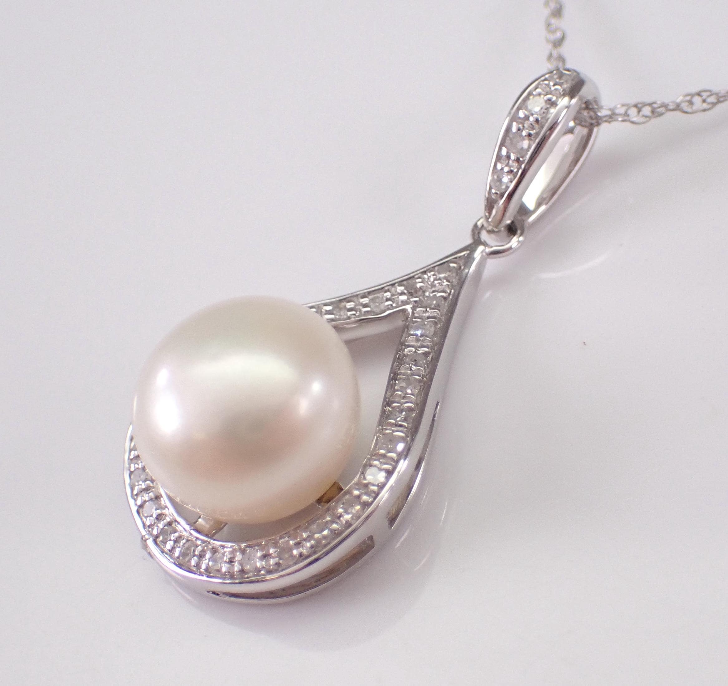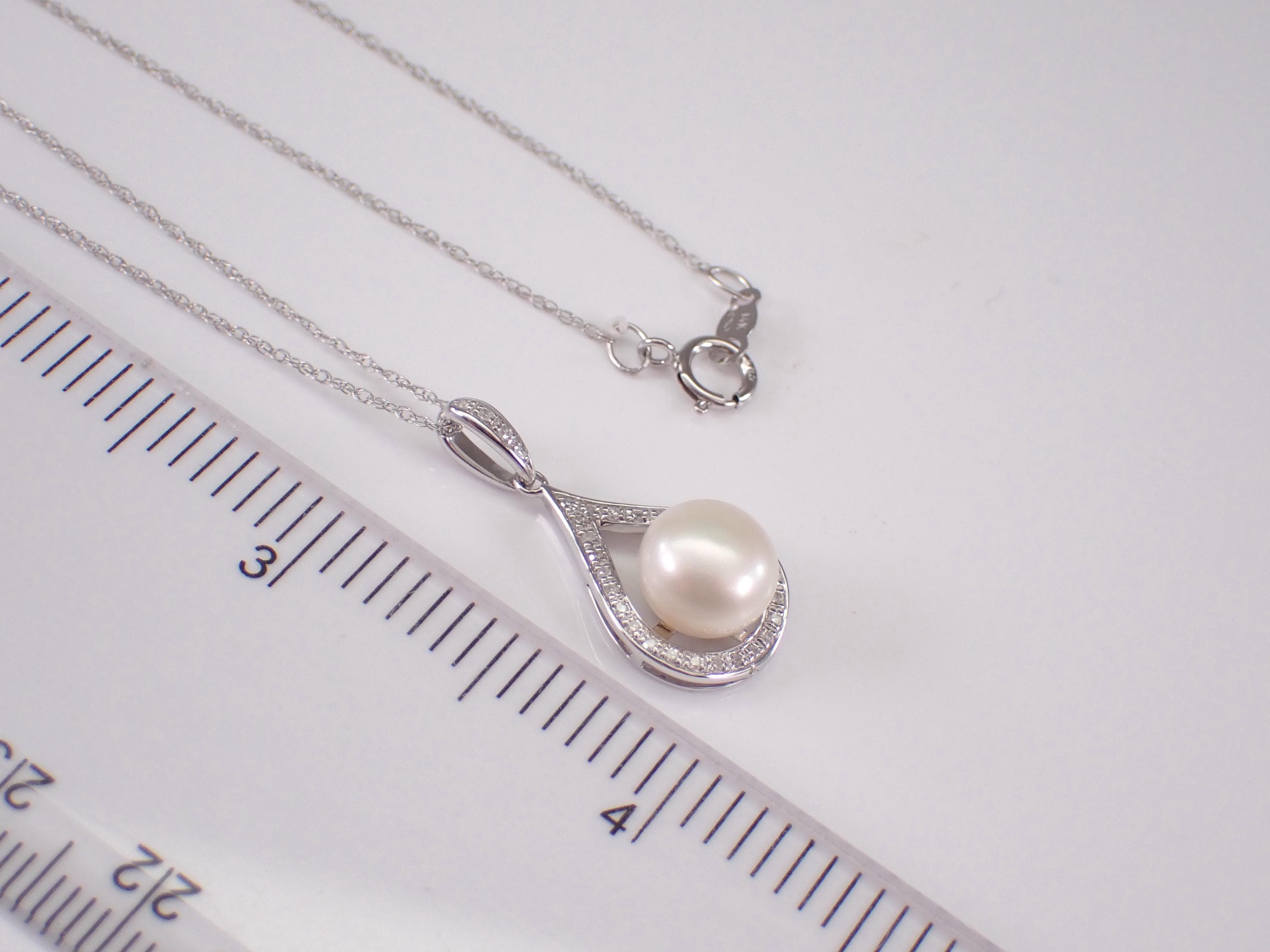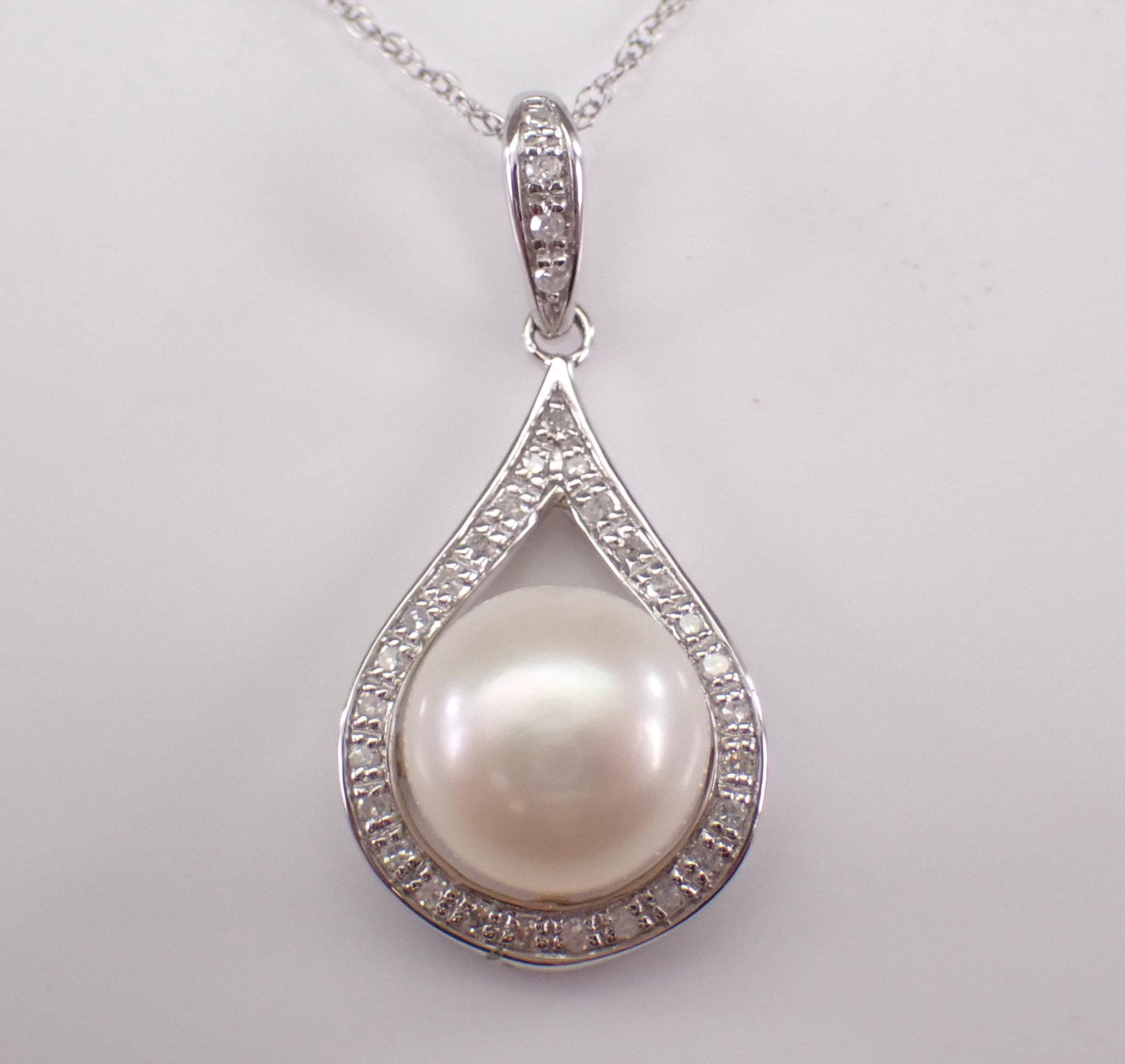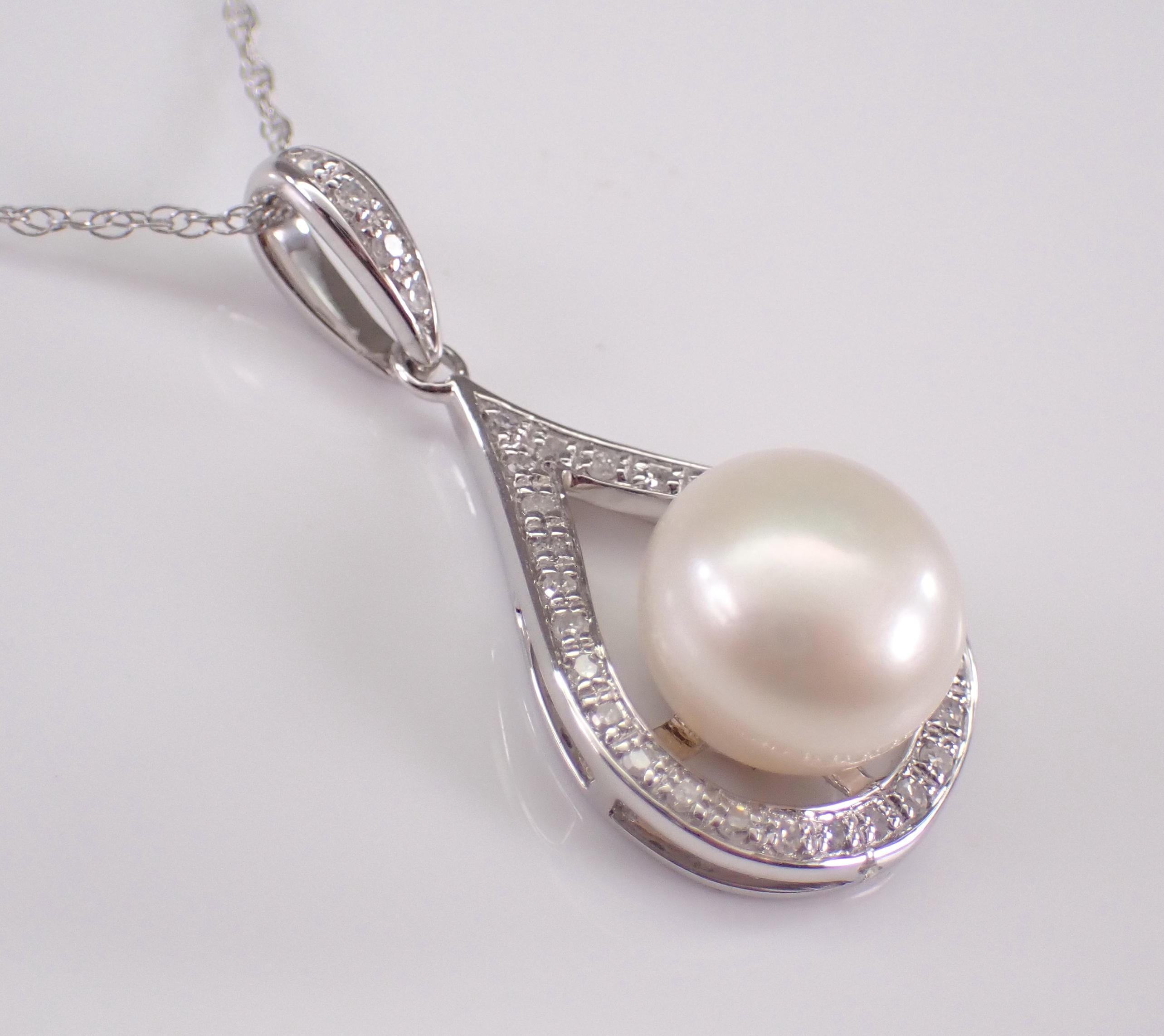14K White Gold Diamond and Pearl Pendant with Chain. This pendant is set with one Round White Pearl and thirty-one genuine Round Brilliant Diamonds. The diamonds in this pendant are H color, SI/I clarity and weigh a total of .10 carat. The pearl in this pendant measures 8 mm in diameter. This pendant comes accompanied with an 18" 14KT White Gold chain. The pendant and chain weigh a total of 2.6 grams and the pendant measures 25 mm in length. This necklace will be accompanied by an appraisal written by a GIA Certified Diamond Grader with the retail replacement value of $1,589.00. I will ship this necklace promptly in a beautiful gift box.