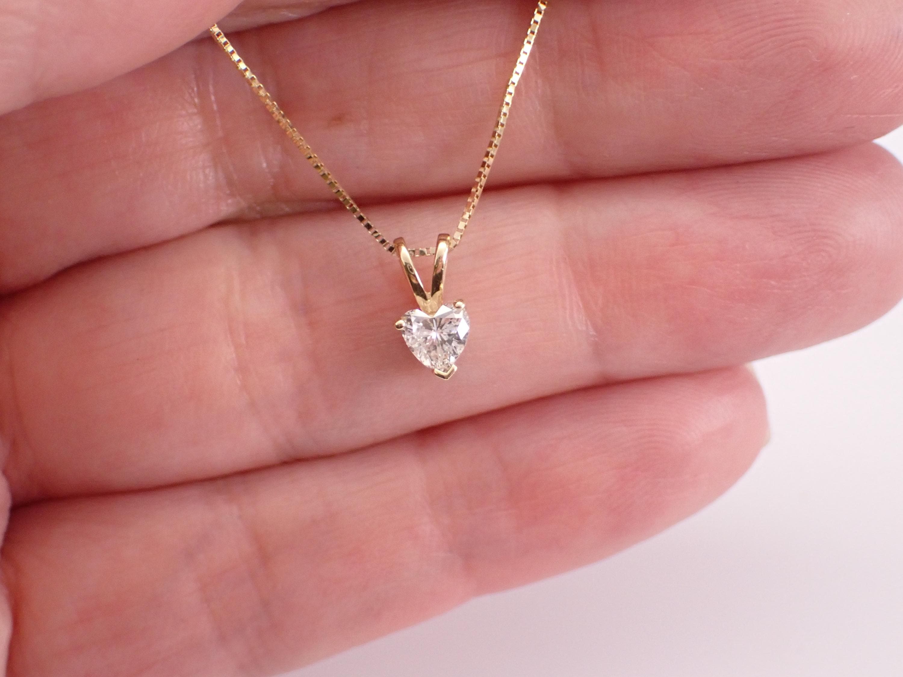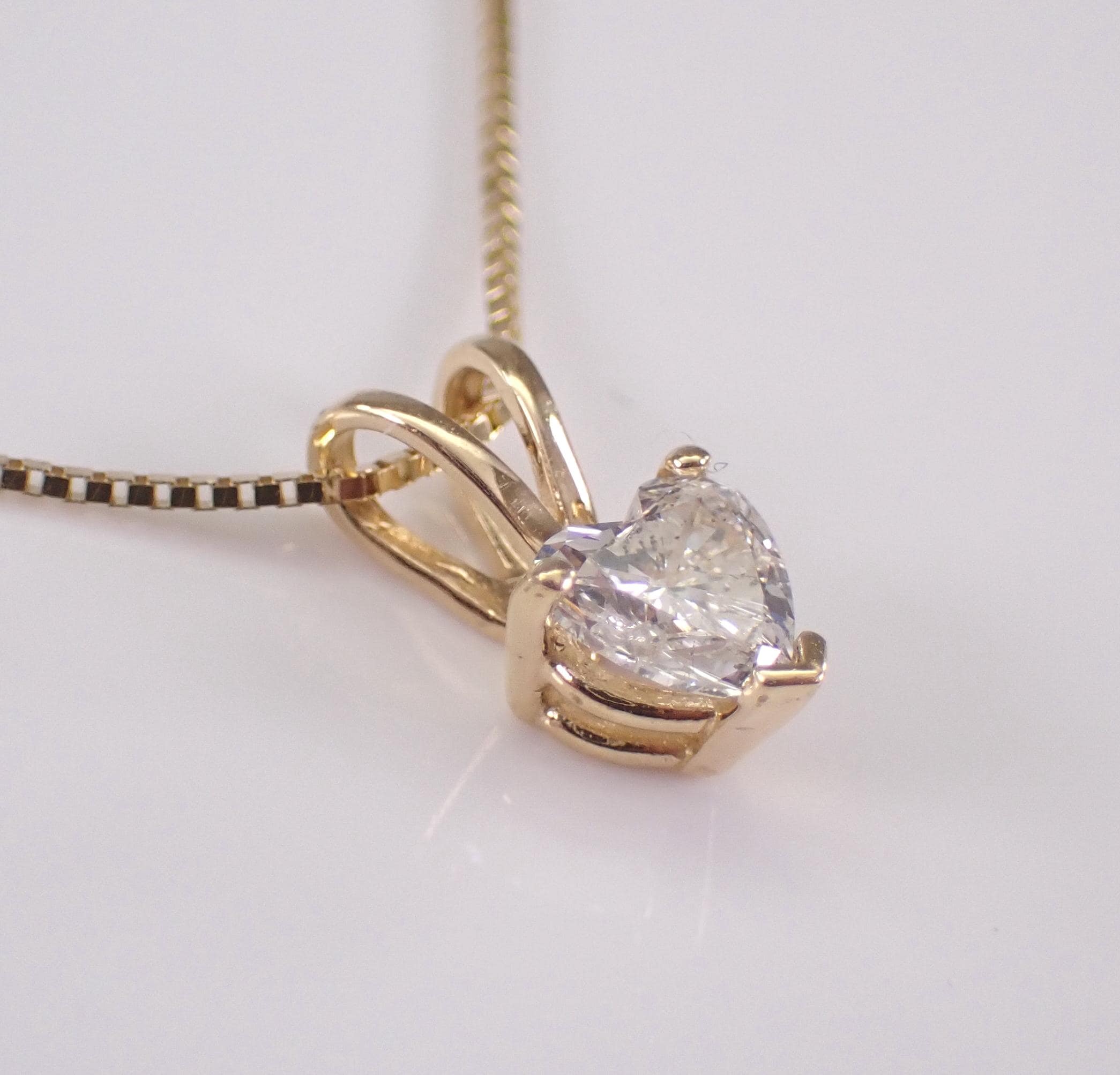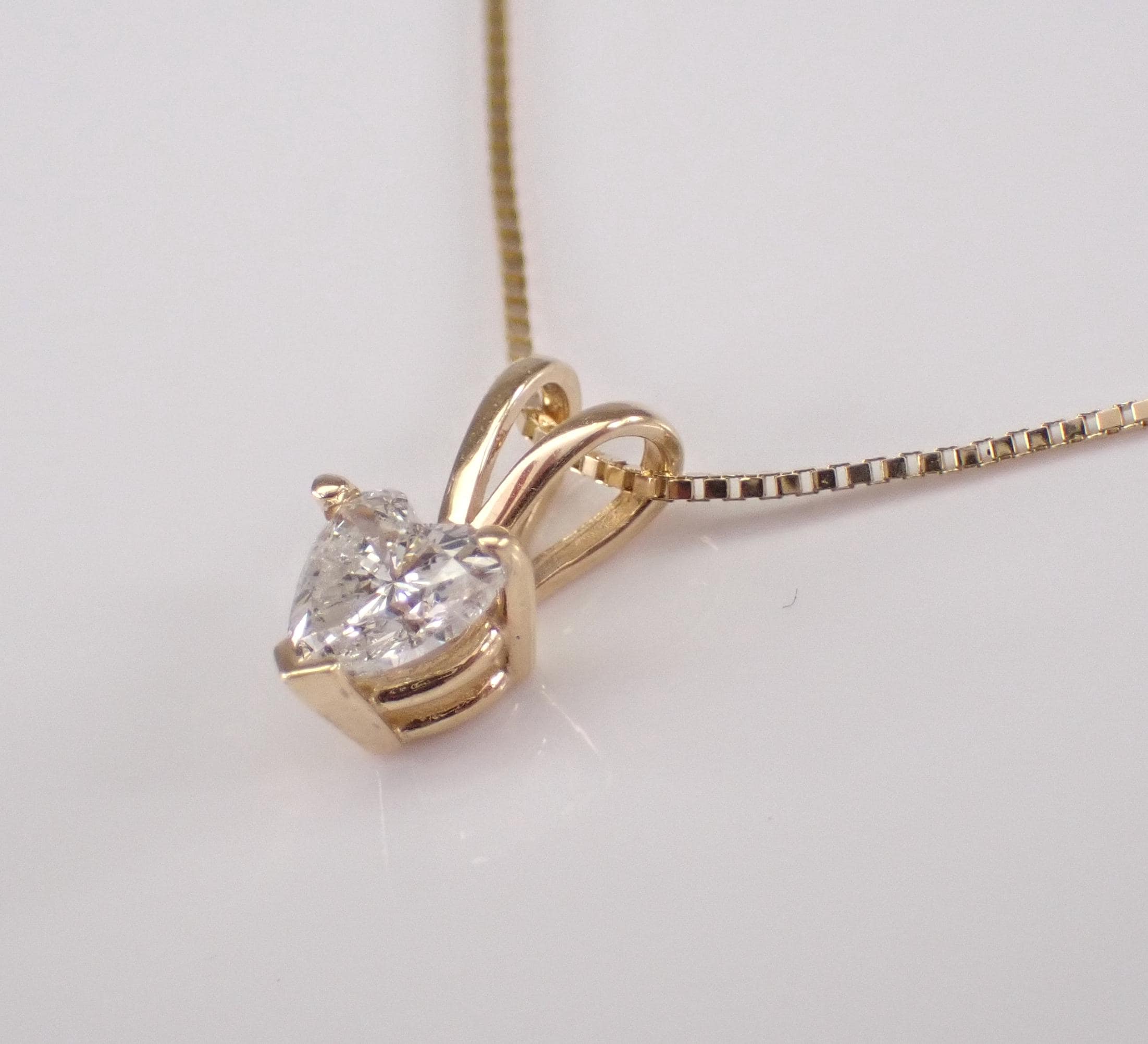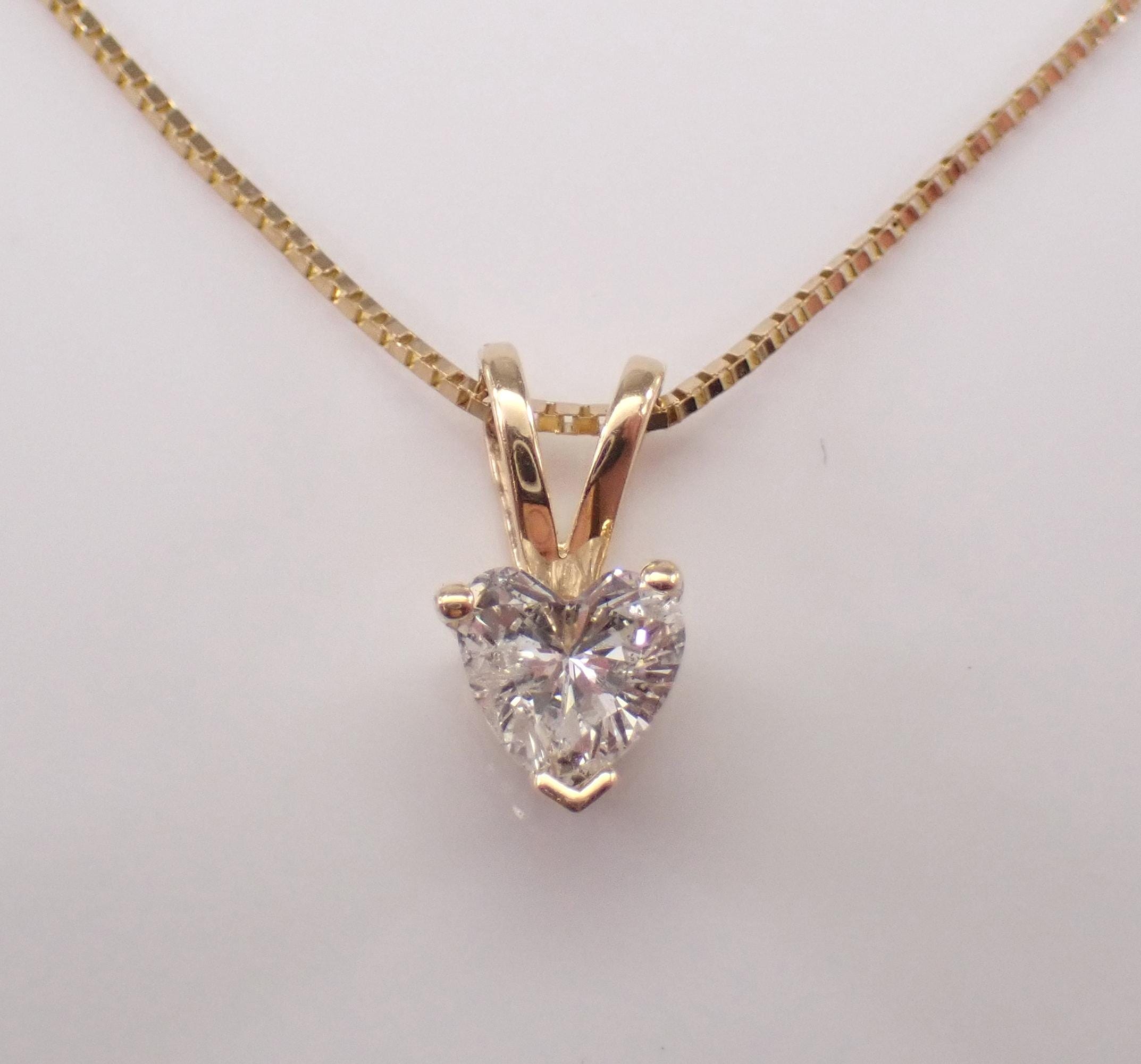 Vintage 14K Yellow Gold Diamond Heart Pendant Necklace. This pendant is set with one Heart shaped Diamond. This diamond is I color, I1 clarity and weighs .35 carat. This pendant is 14KT Yellow Gold and comes with a 19" 10KT Yellow Gold box chain. Both the pendant and chain weigh a total of 1.4 grams. I will ship this necklace promptly in a beautiful gift box accompanied by an appraisal for insurance and authentication purposes.