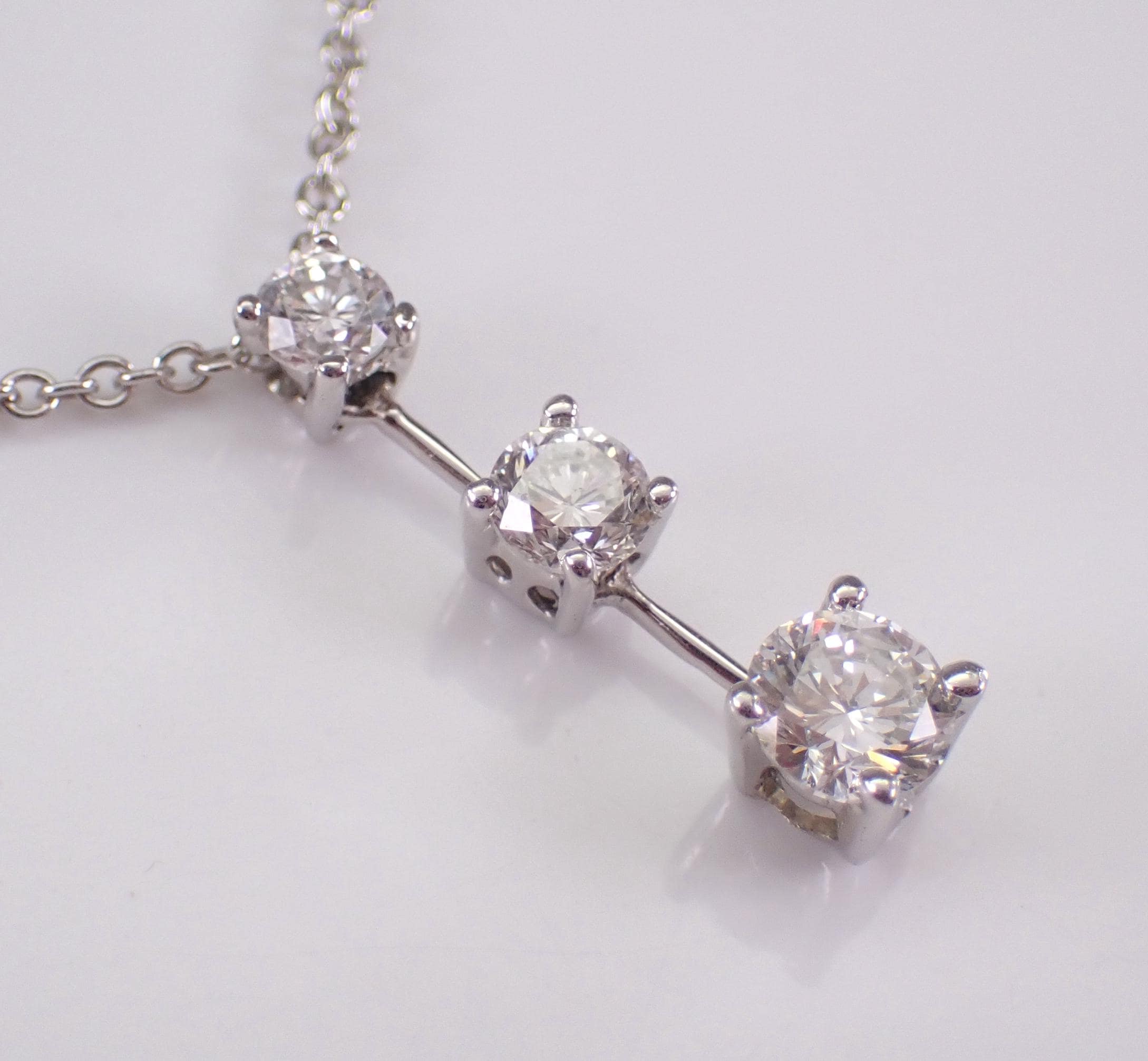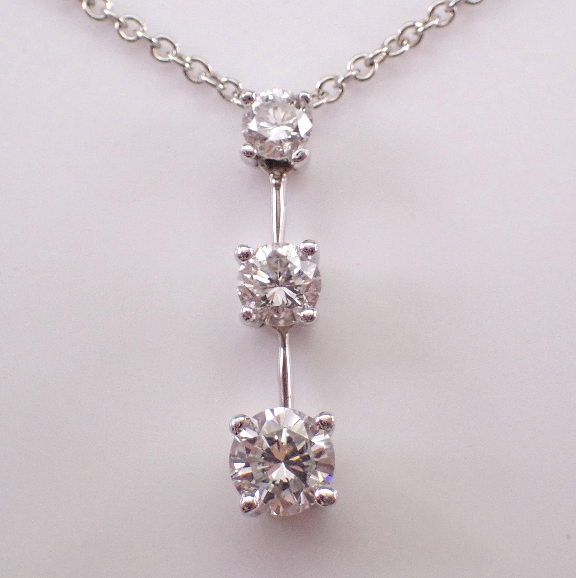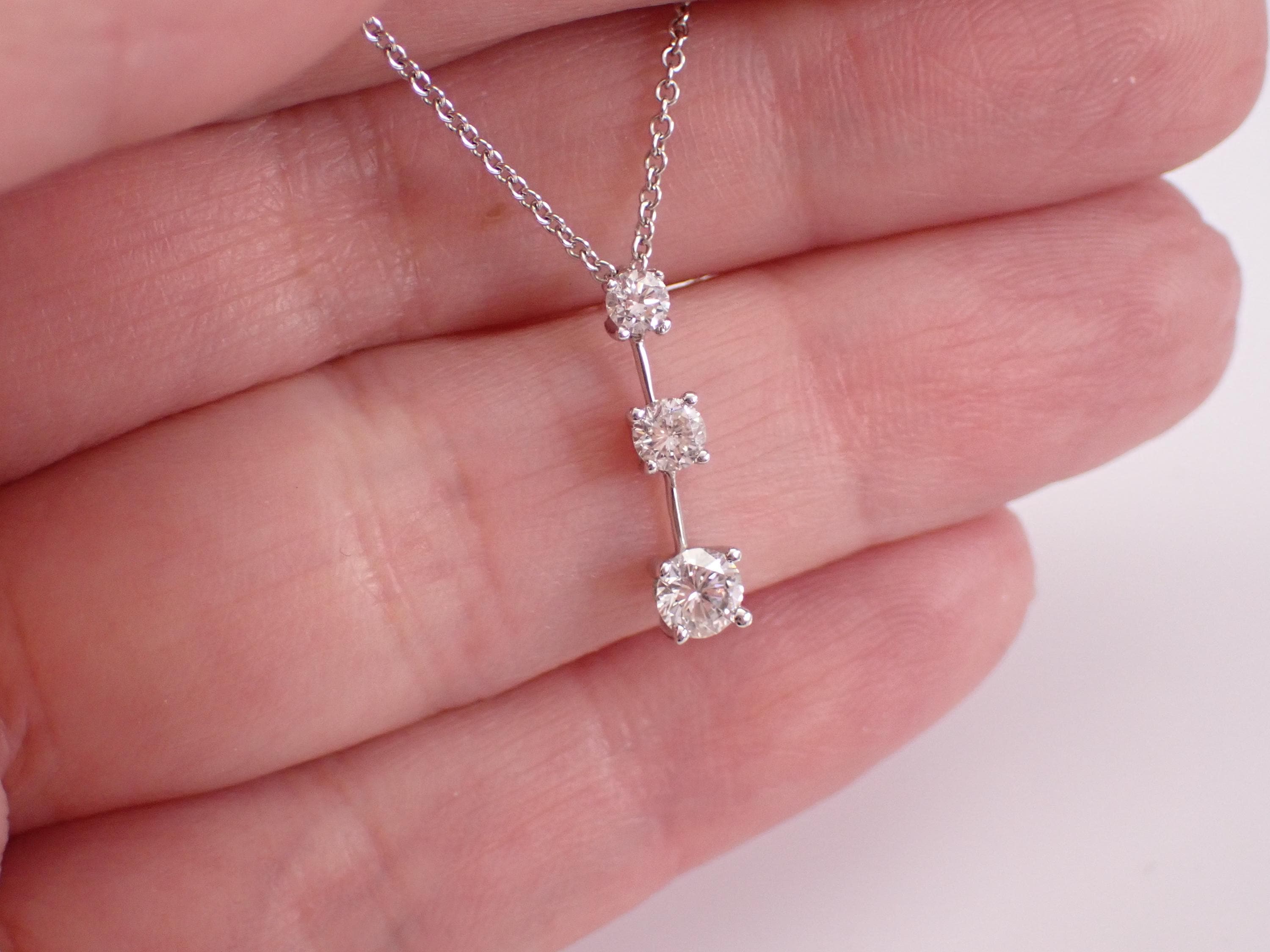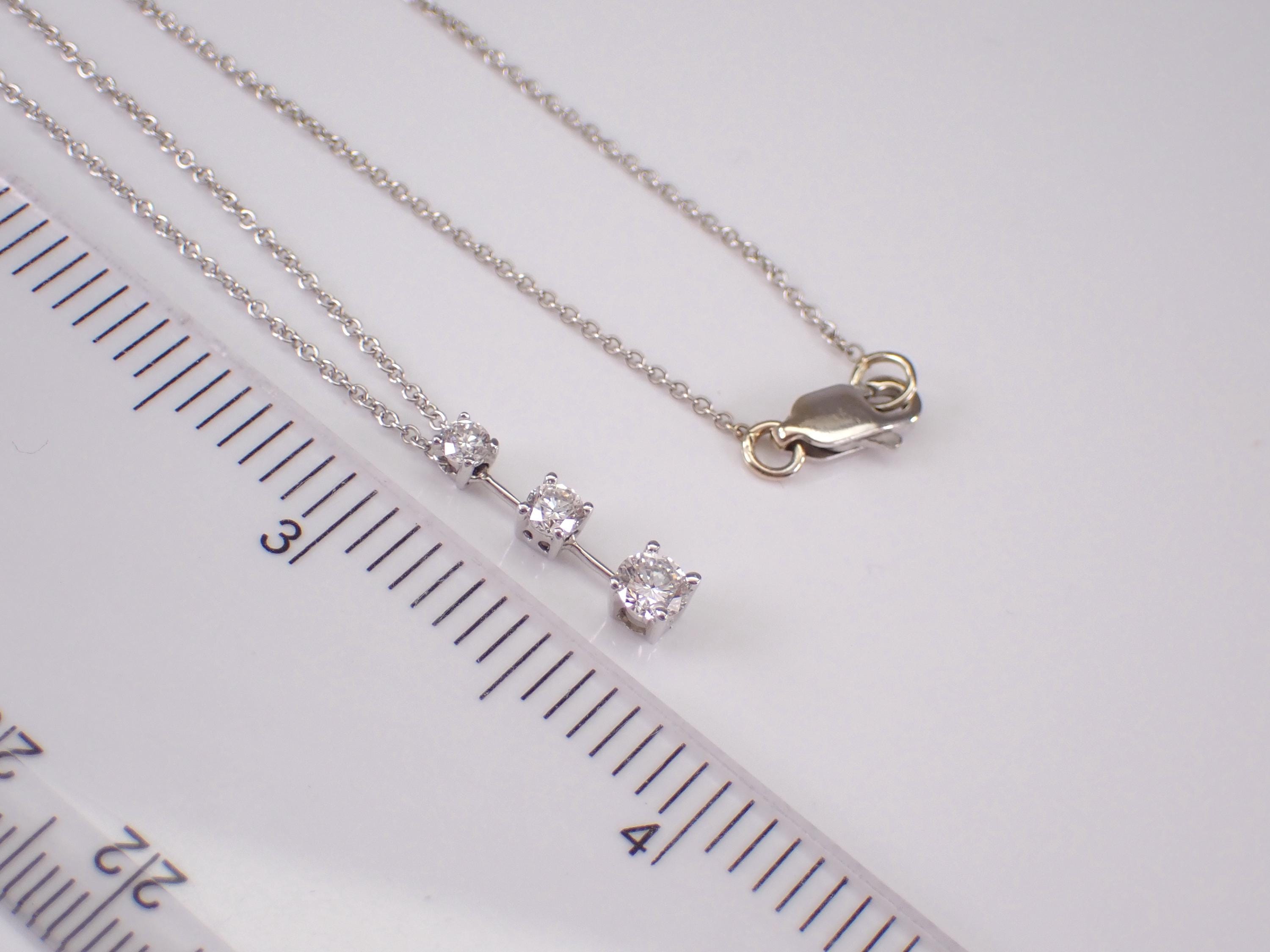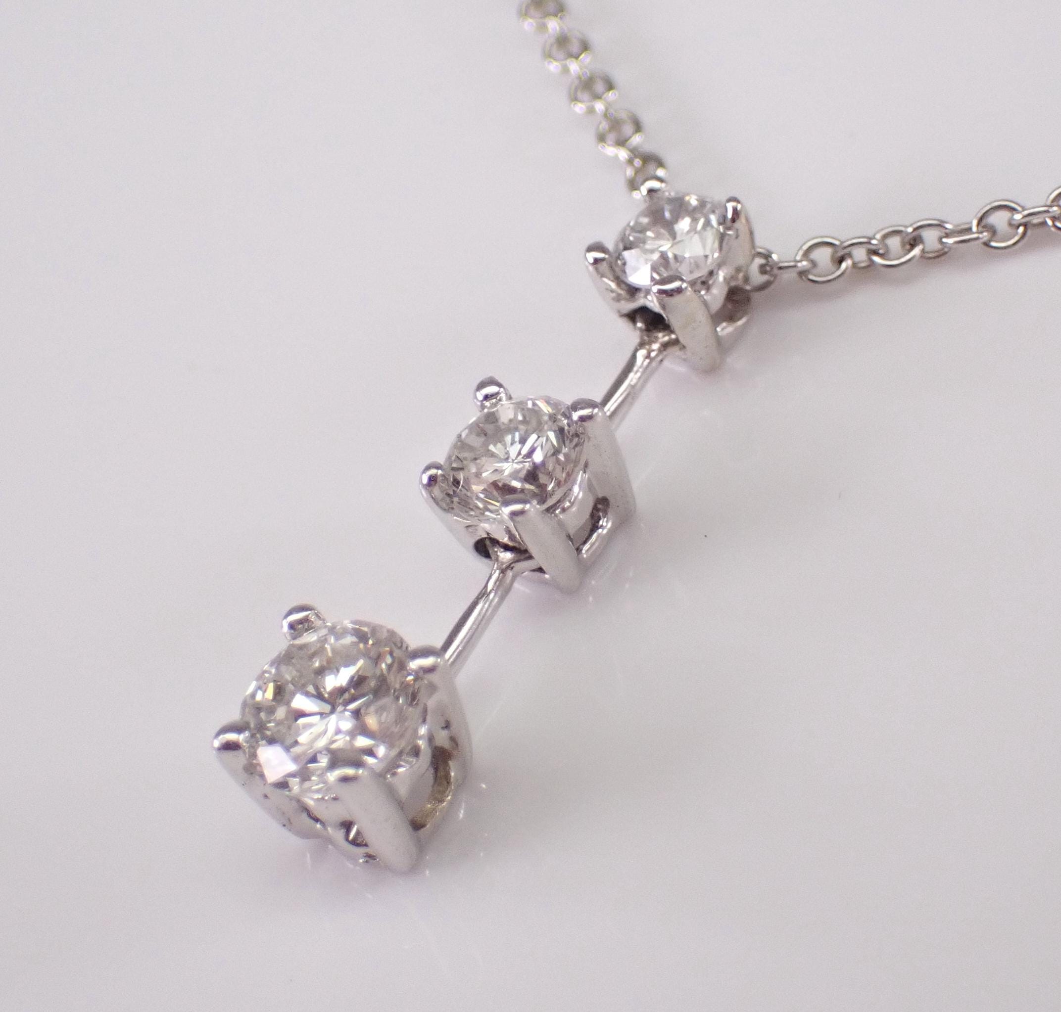 14K White Gold Diamond Pendant with Chain. This pendant is set with three genuine Round Brilliant Diamonds. These diamonds are G color, SI1 clarity and weigh a total of 1/2 carat. This pendant is 14KT White Gold and comes with a 20" 14KT White Gold chain. This necklace weighs 2.7 grams and the pendant measures 17 mm in length. This necklace will be accompanied by an appraisal written by a GIA Certified Diamond Grader with the retail replacement value of $1,975.00. I will ship this necklace promptly in a beautiful gift box.