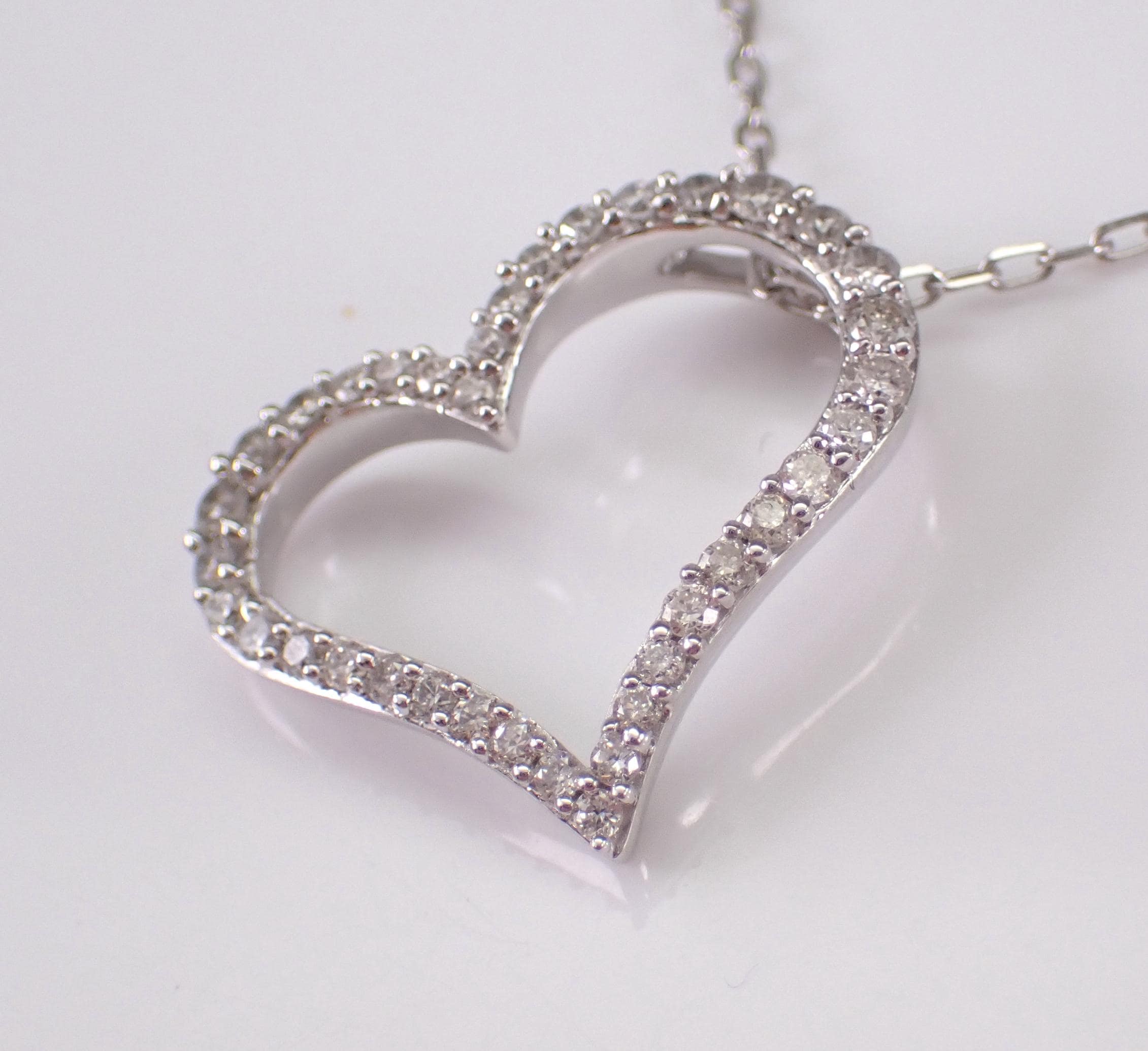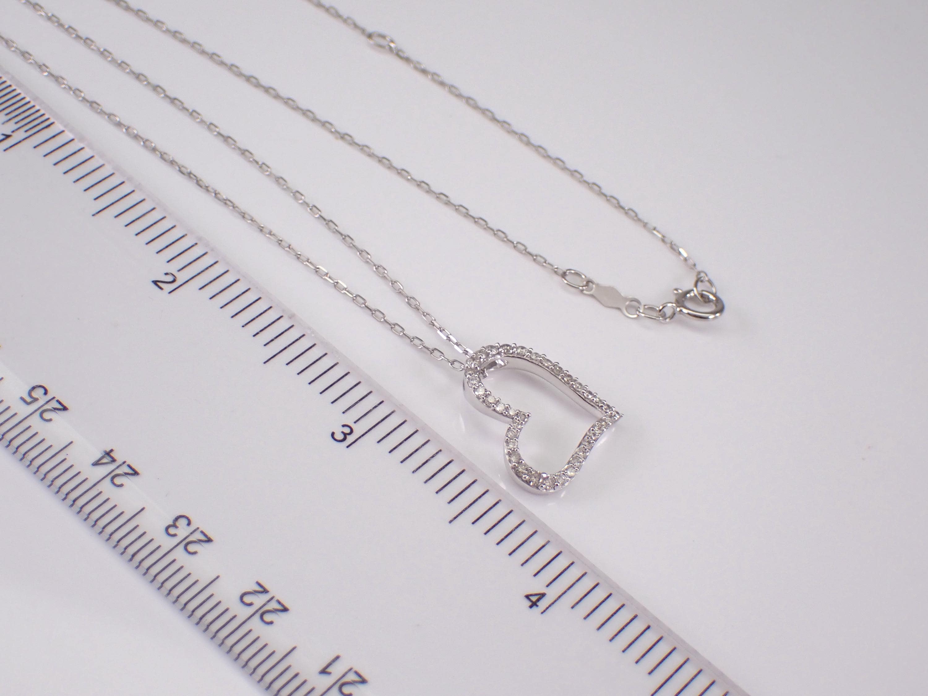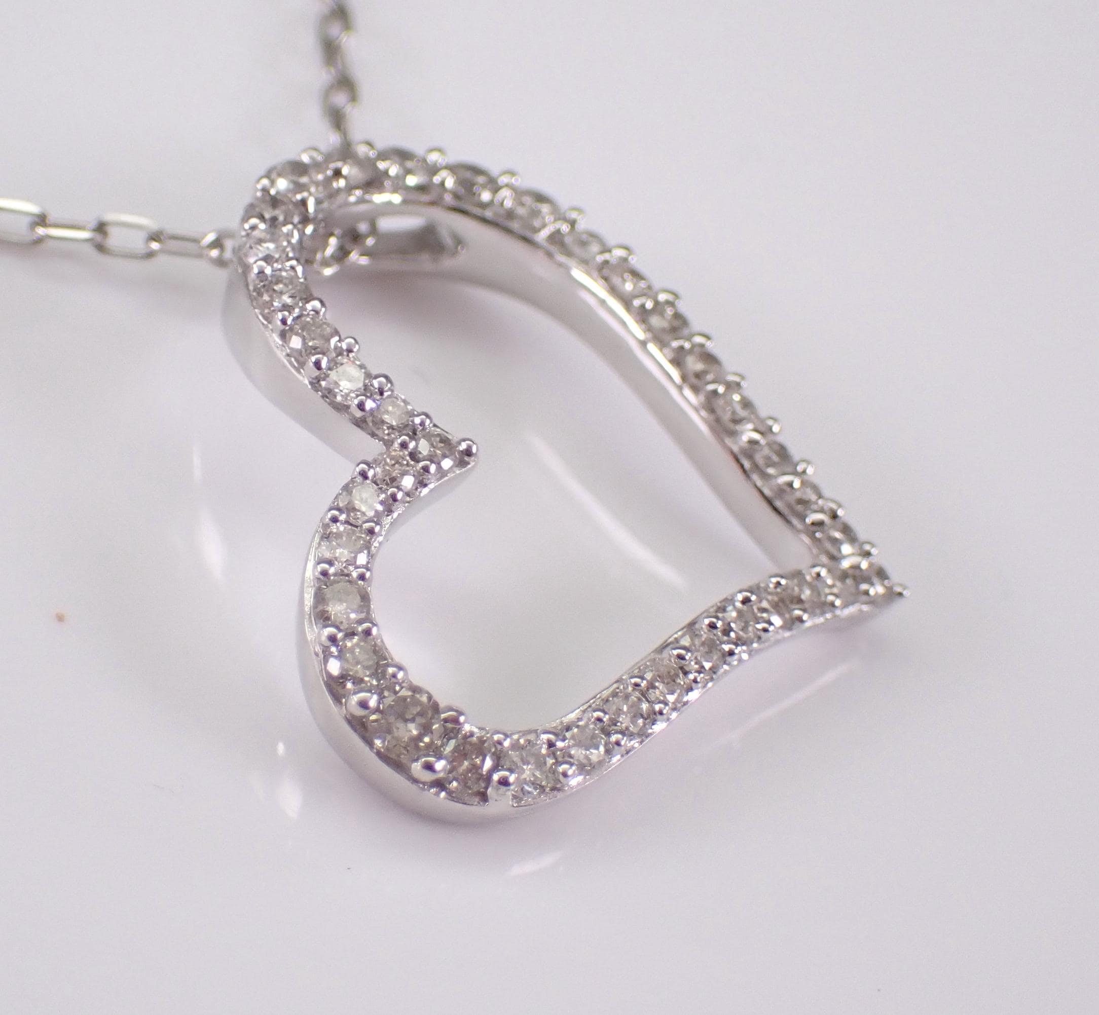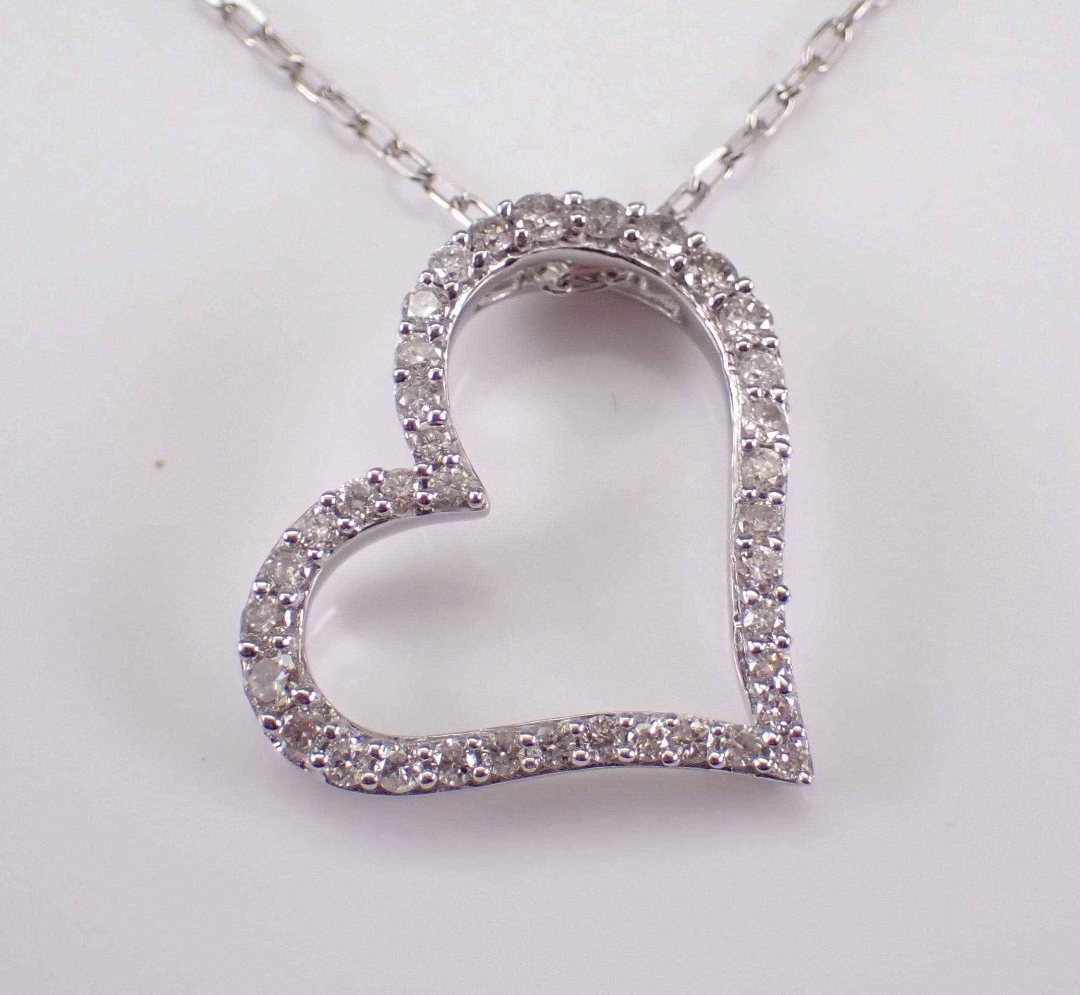 White Gold Diamond Heart Pendant with Chain. This heart is set with thirty-five natural genuine Round Brilliant Diamonds. These diamonds are H color, I1 clarity and combine to a total weight of .35 carat. This heart is 10K White gold and comes with an 18" 10K White Gold Chain. The heart measures 17 X 15 mm and together with the chain weighs 2.3 grams. The pendant and the chain are accompanied by an appraisal, valued at $1,489.00. The necklace will be shipped promptly in a gift box.