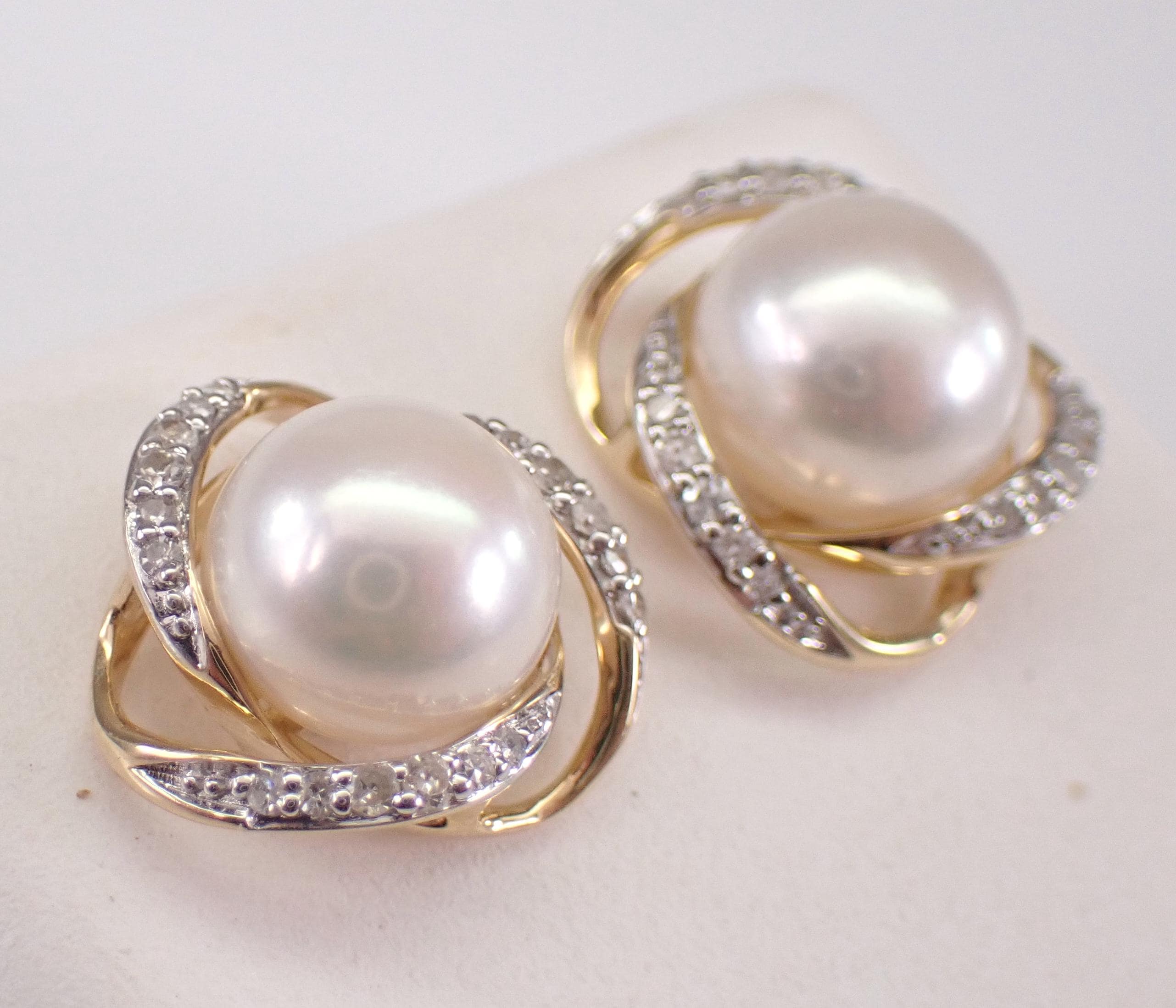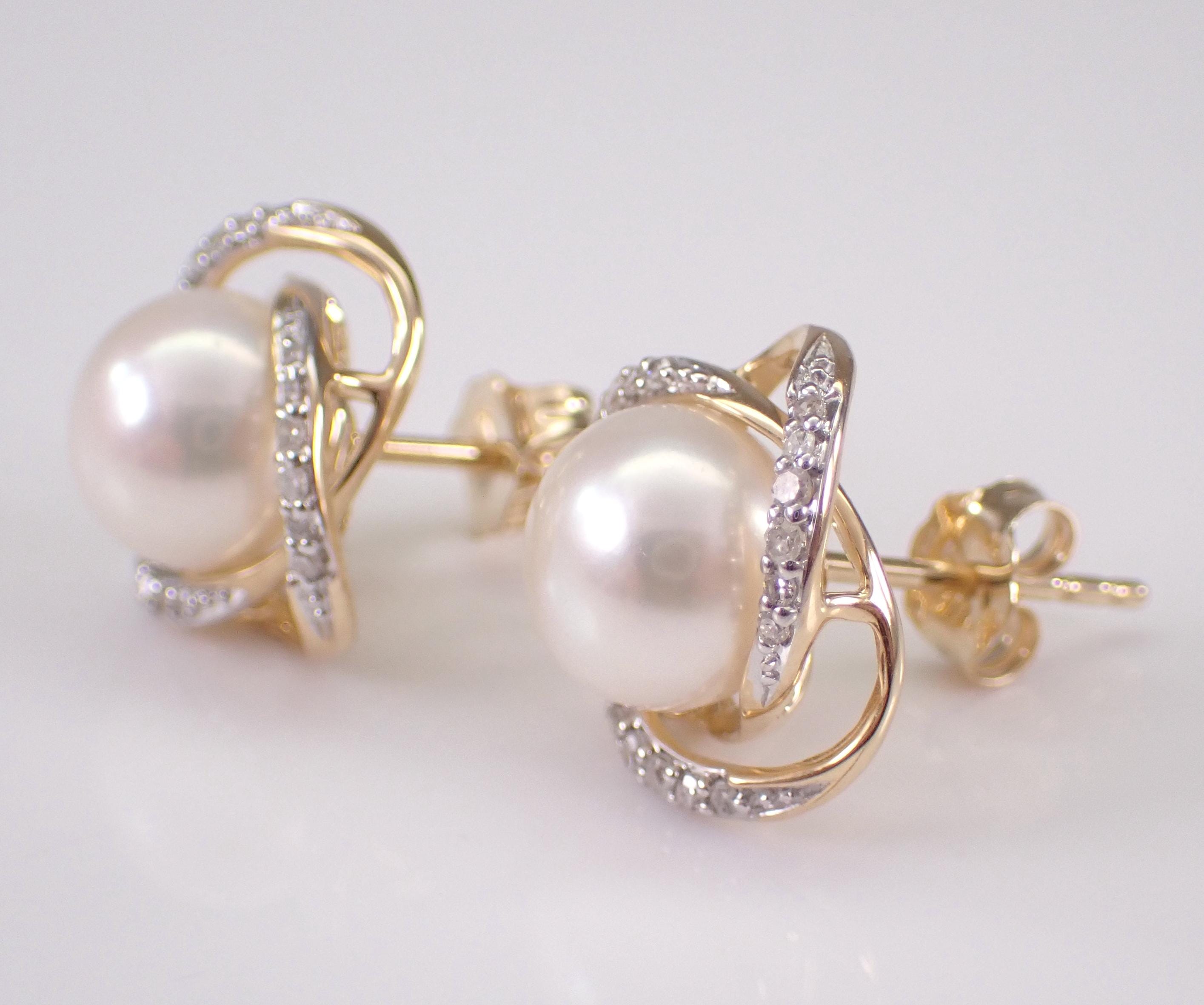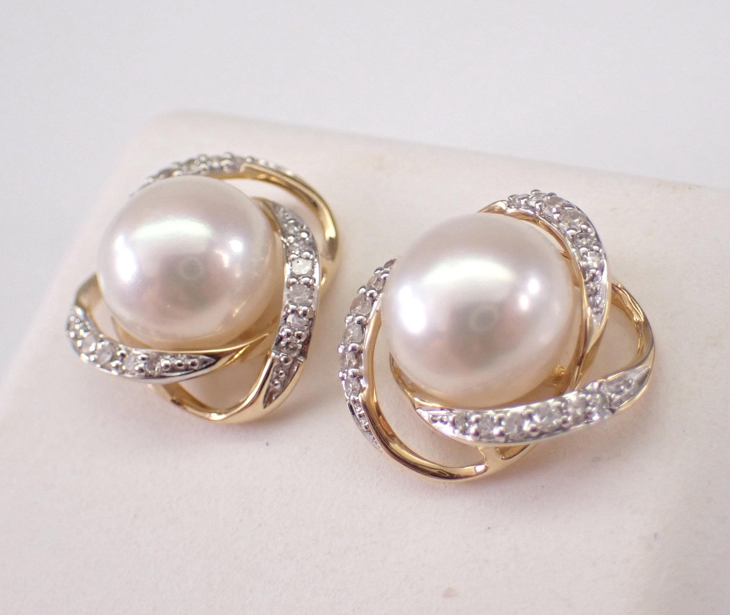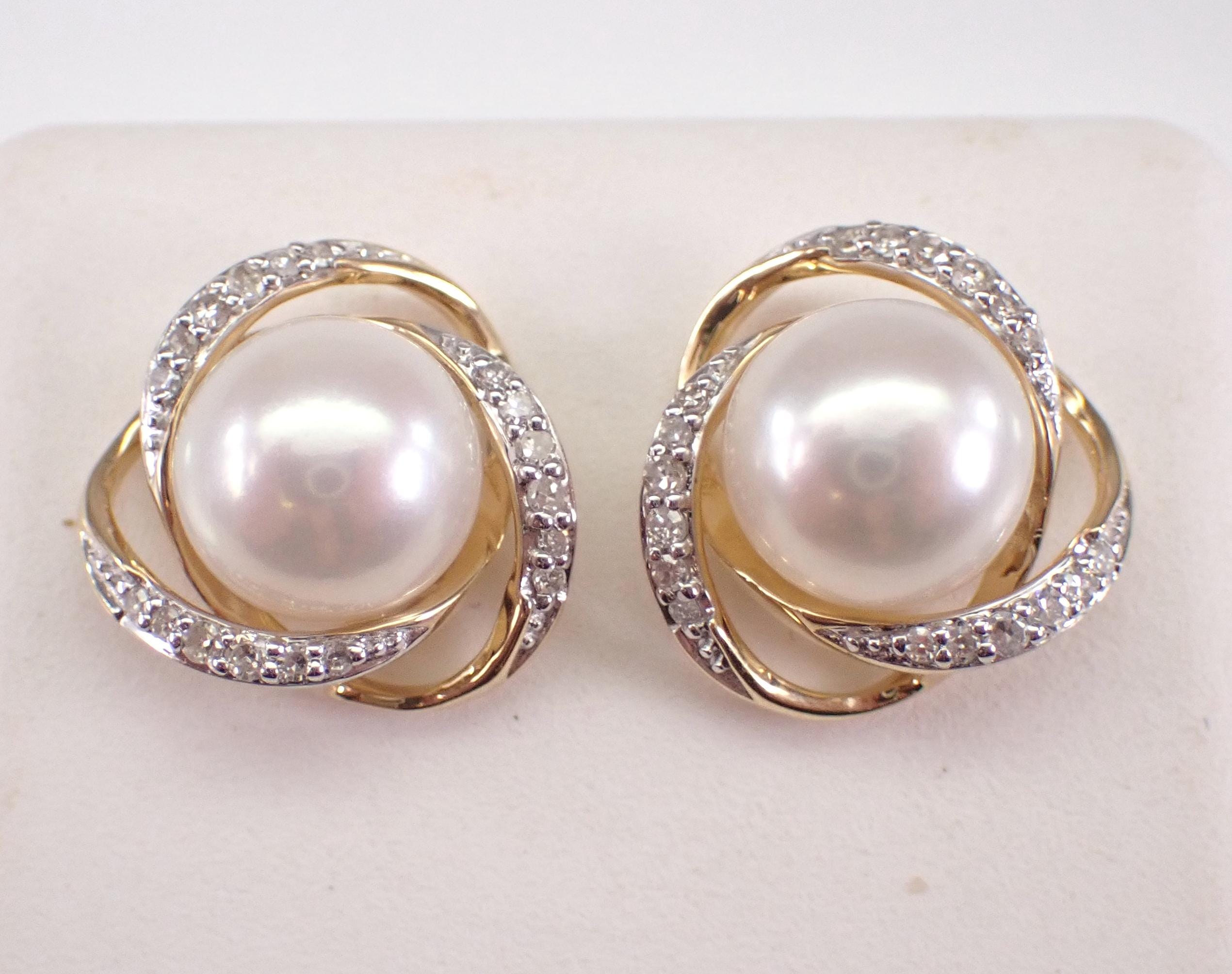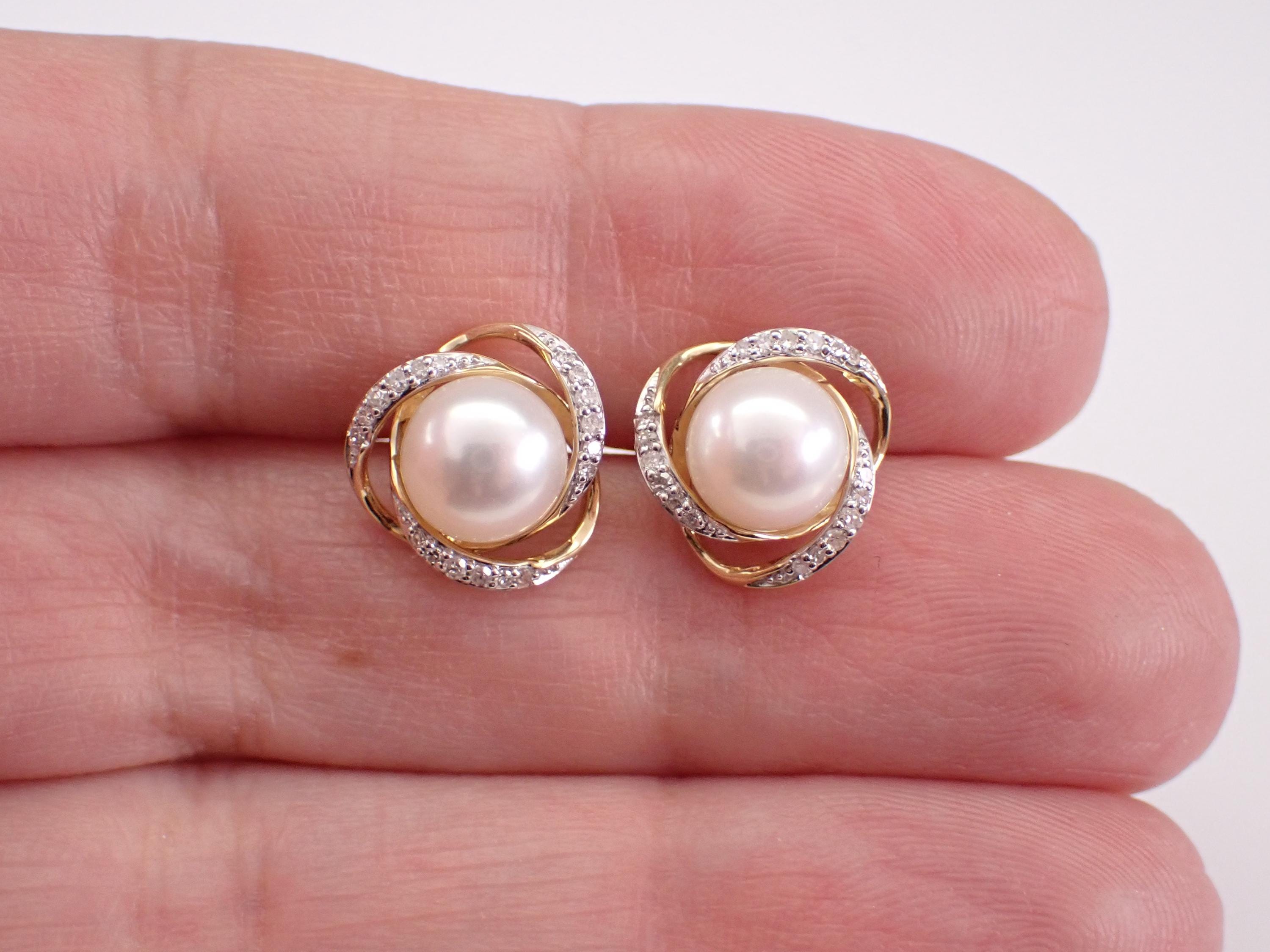 14K Yellow Gold Pearl and Diamond Halo Stud Earrings. These earrings are set with two Round White Pearls and thirty-six genuine Round Brilliant Diamonds. These Pearls measure 7 mm in diameter each. The Diamonds in these earrings are H color, SI1 clarity and weigh a total of .15 carat. These earrings are 14KT Yellow Gold and weigh a total of 2.8 grams. These earrings are for pierced ears, measure 11 mm in diameter and the earrings have friction post backings. These earrings will be accompanied by an appraisal written by a GIA Certified Diamond Grader with the retail replacement value of $1,495.00. I will ship these earrings promptly in a gift box.