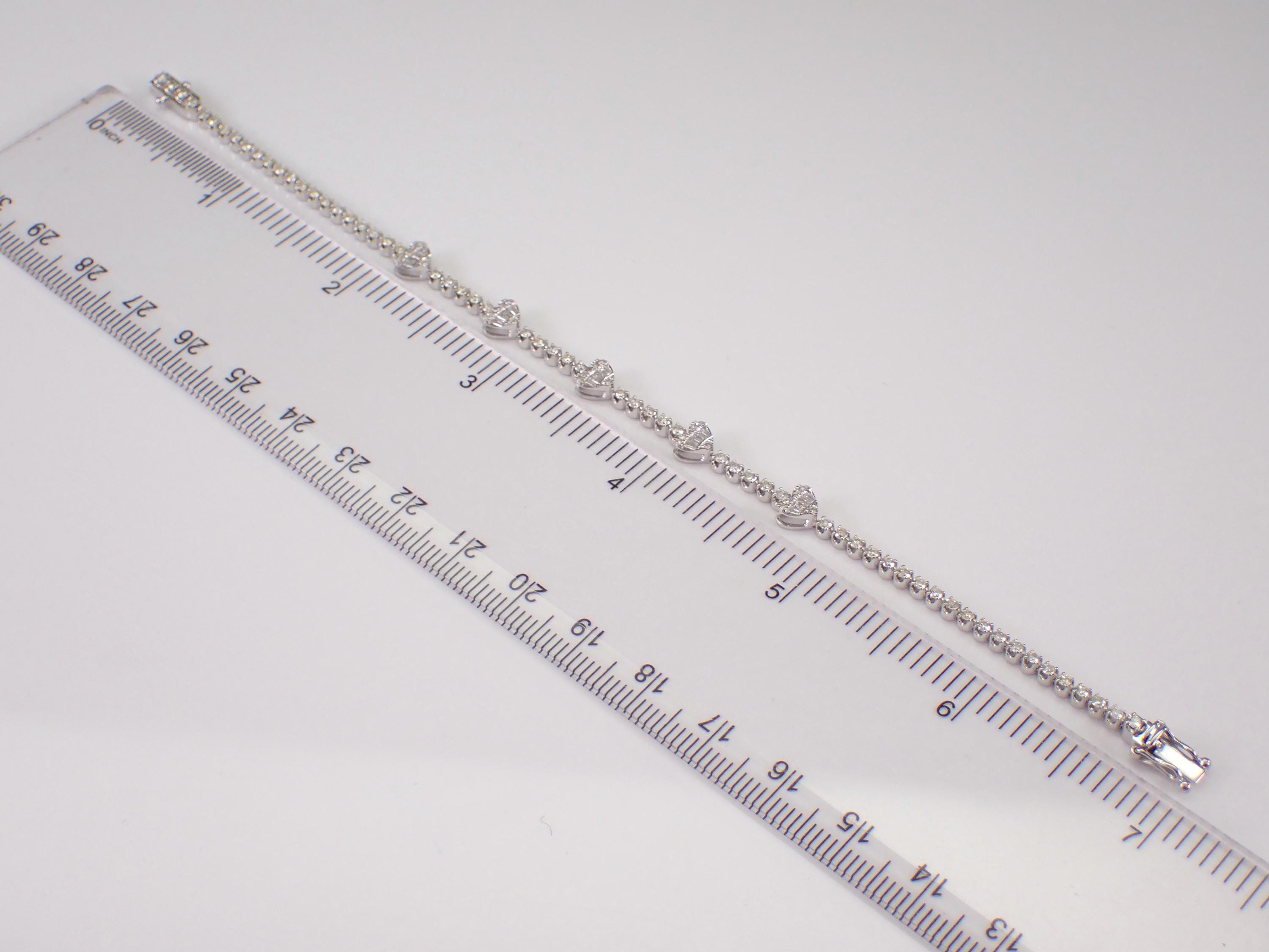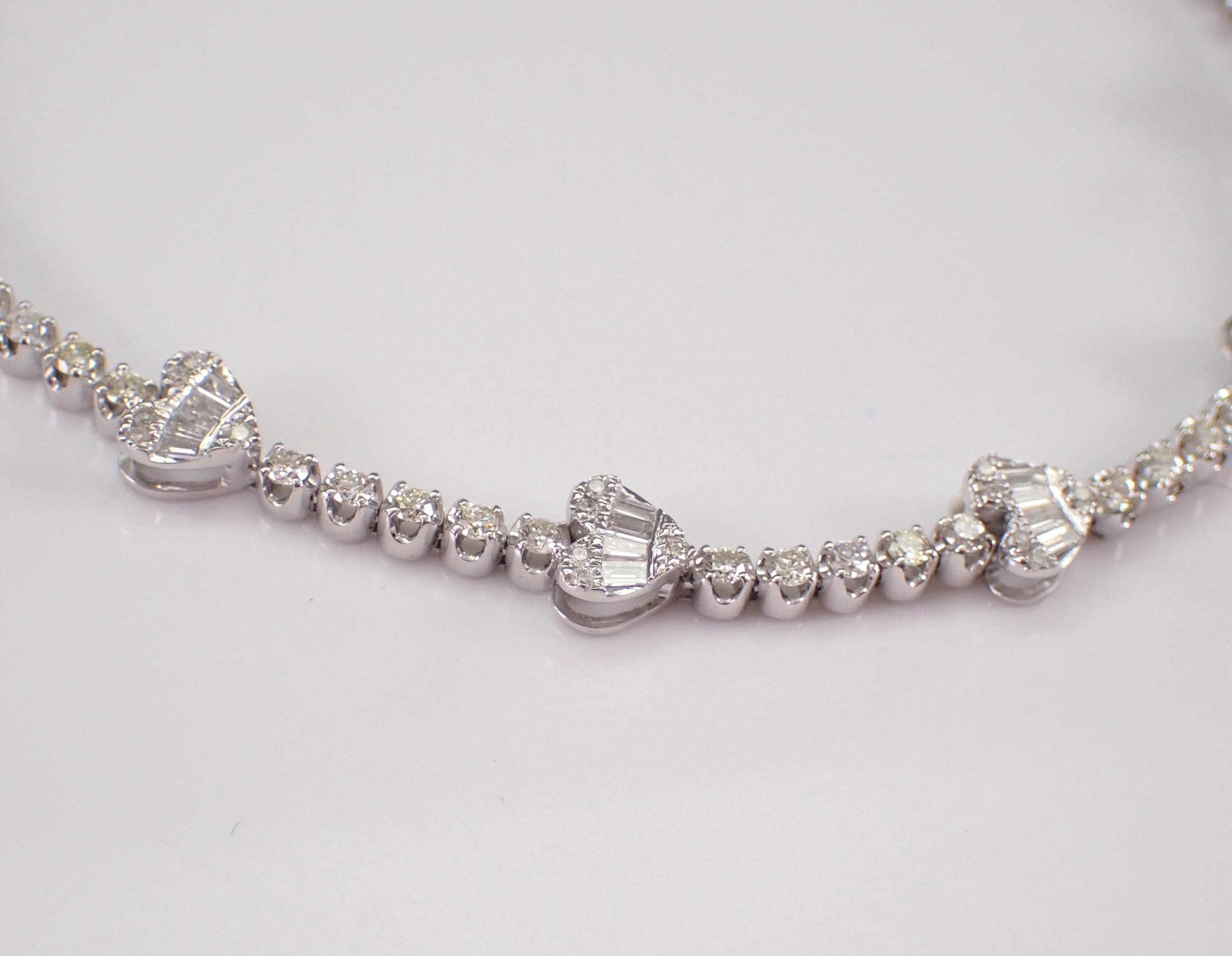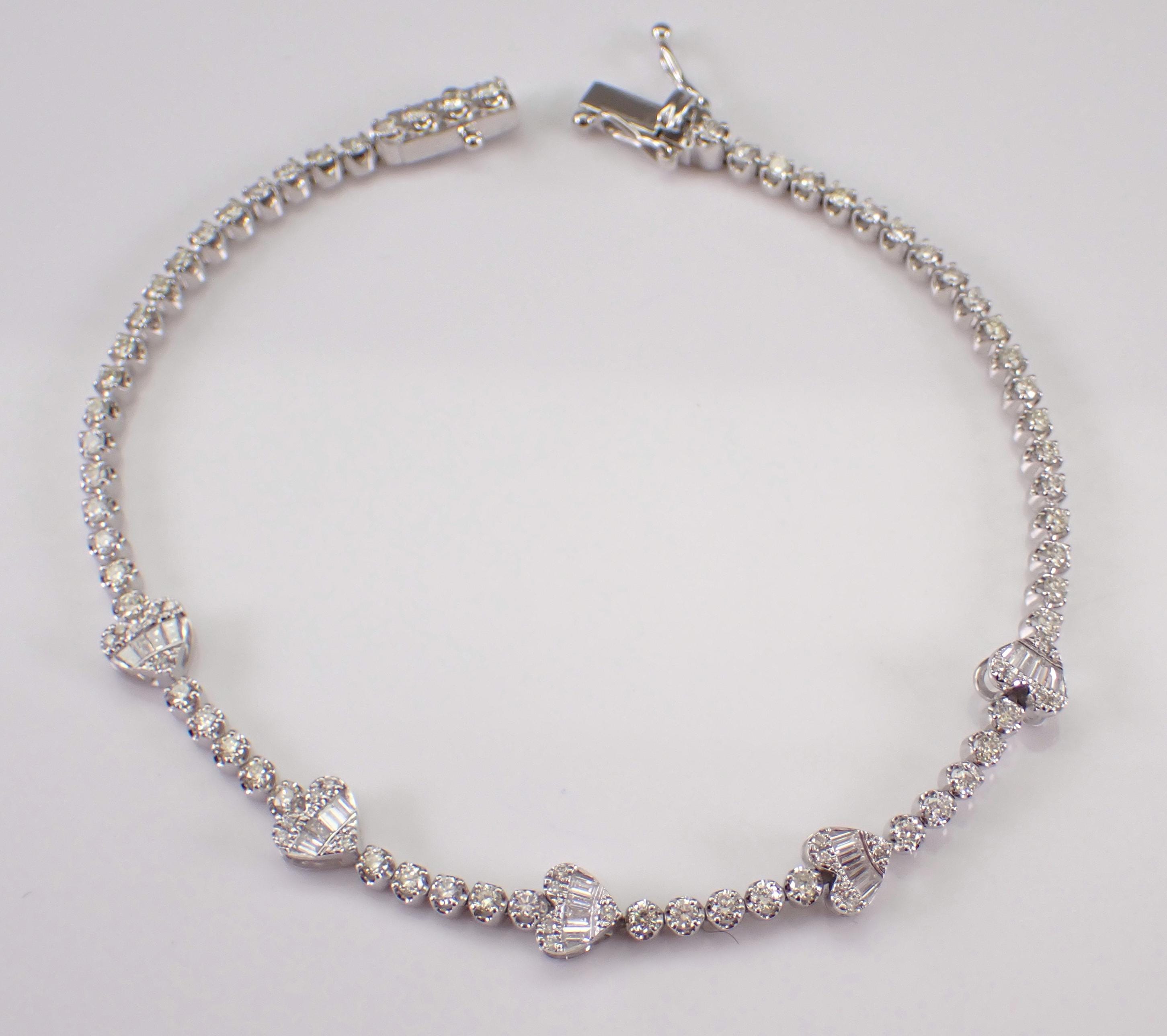 14K White Gold Diamond Heart Tennis Bracelet. This gorgeous bracelet is set with eighty-seven genuine Round Brilliant Diamonds and twenty natural Baguette Diamonds. These diamonds are H color, SI/I1 clarity and weigh a total of 1 3/4 carats. The bracelet is 14K White Gold, weighs 5.6 grams and measures 6 3/4" in length. This bracelet will be accompanied by an appraisal by a GIA Certified Diamond Grader with the retail replacement value of $5,495.00. I will ship this bracelet promptly in a gift box.