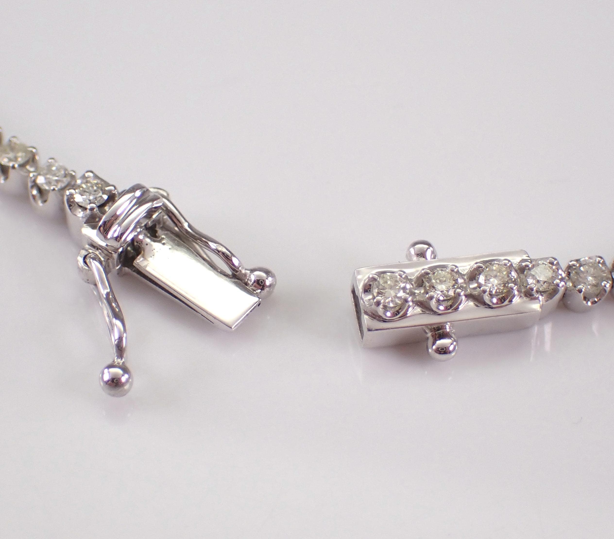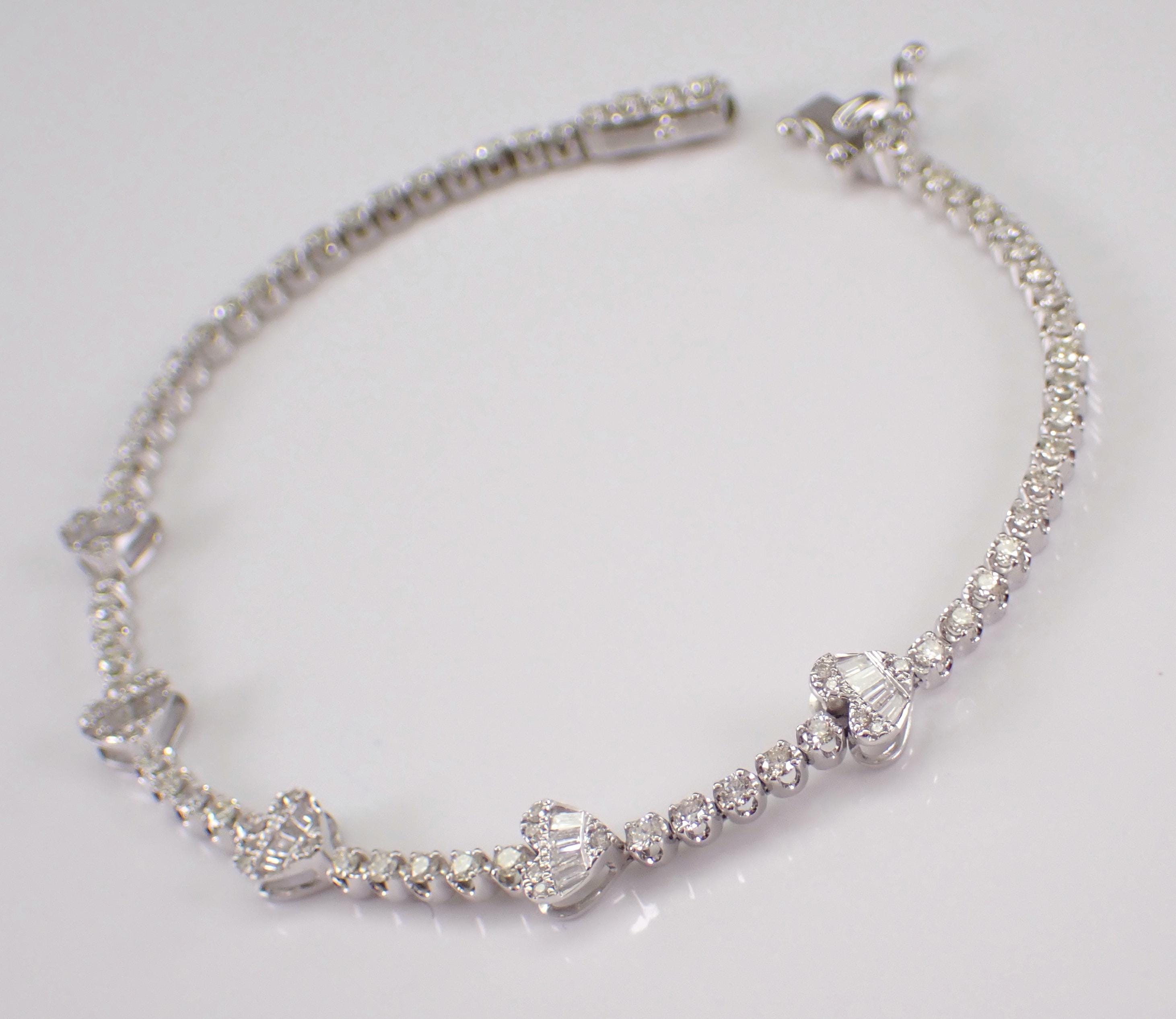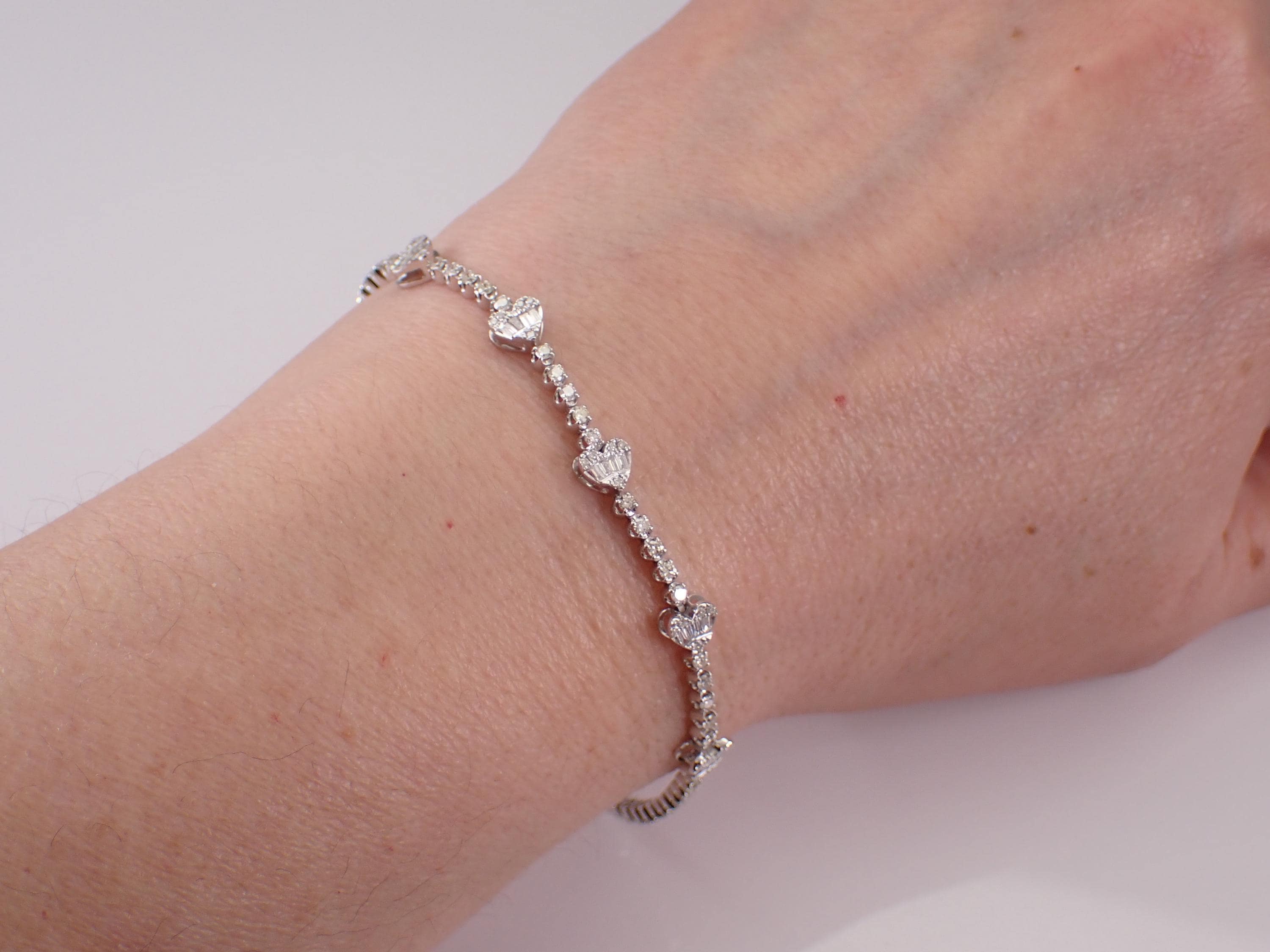14K White Gold Diamond Heart Tennis Bracelet. This gorgeous bracelet is set with eighty-seven genuine Round Brilliant Diamonds and twenty natural Baguette Diamonds. These diamonds are H color, SI/I1 clarity and weigh a total of 1 3/4 carats. The bracelet is 14K White Gold, weighs 5.6 grams and measures 6 3/4" in length. This bracelet will be accompanied by an appraisal by a GIA Certified Diamond Grader with the retail replacement value of $5,495.00. I will ship this bracelet promptly in a gift box.
