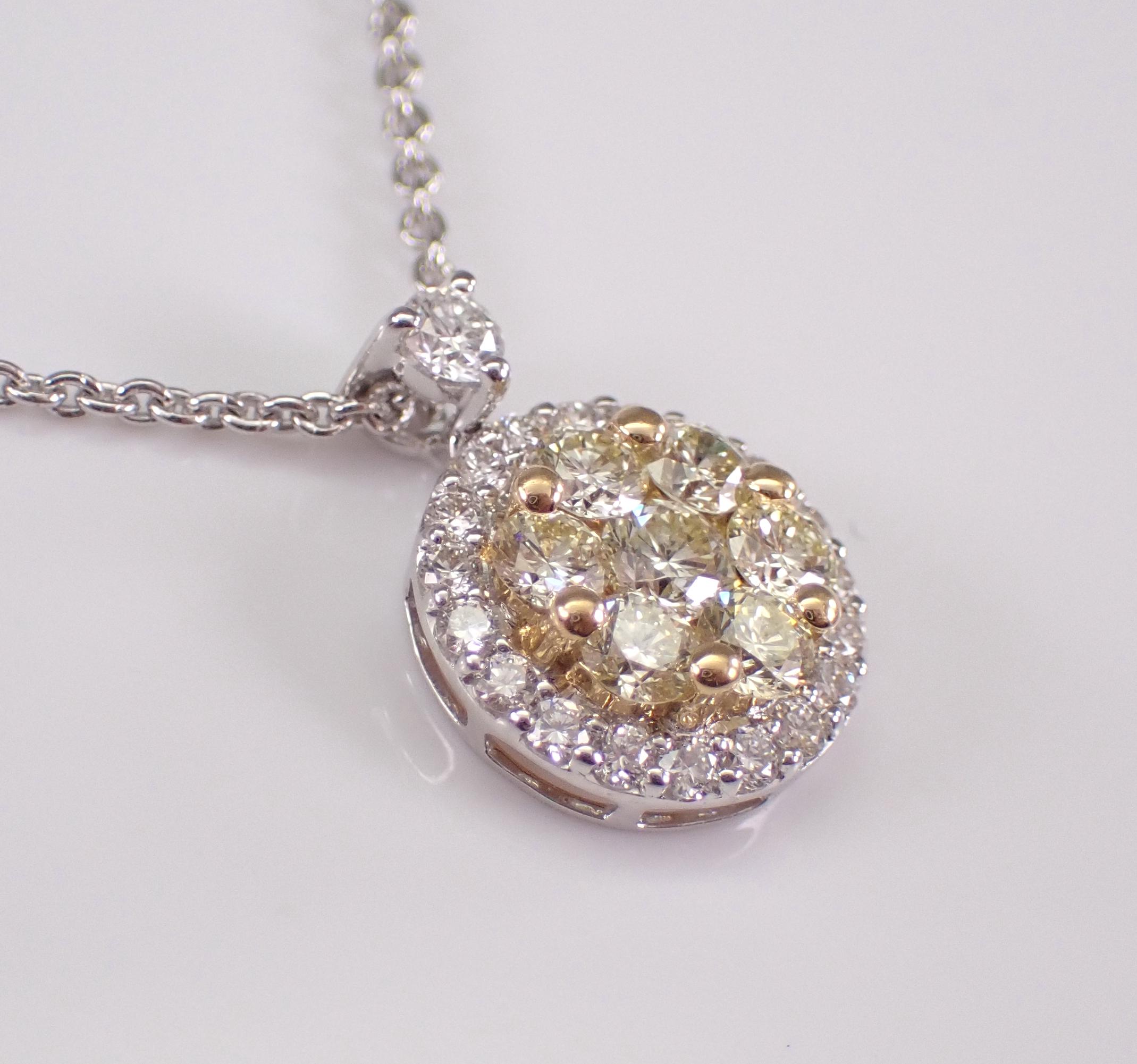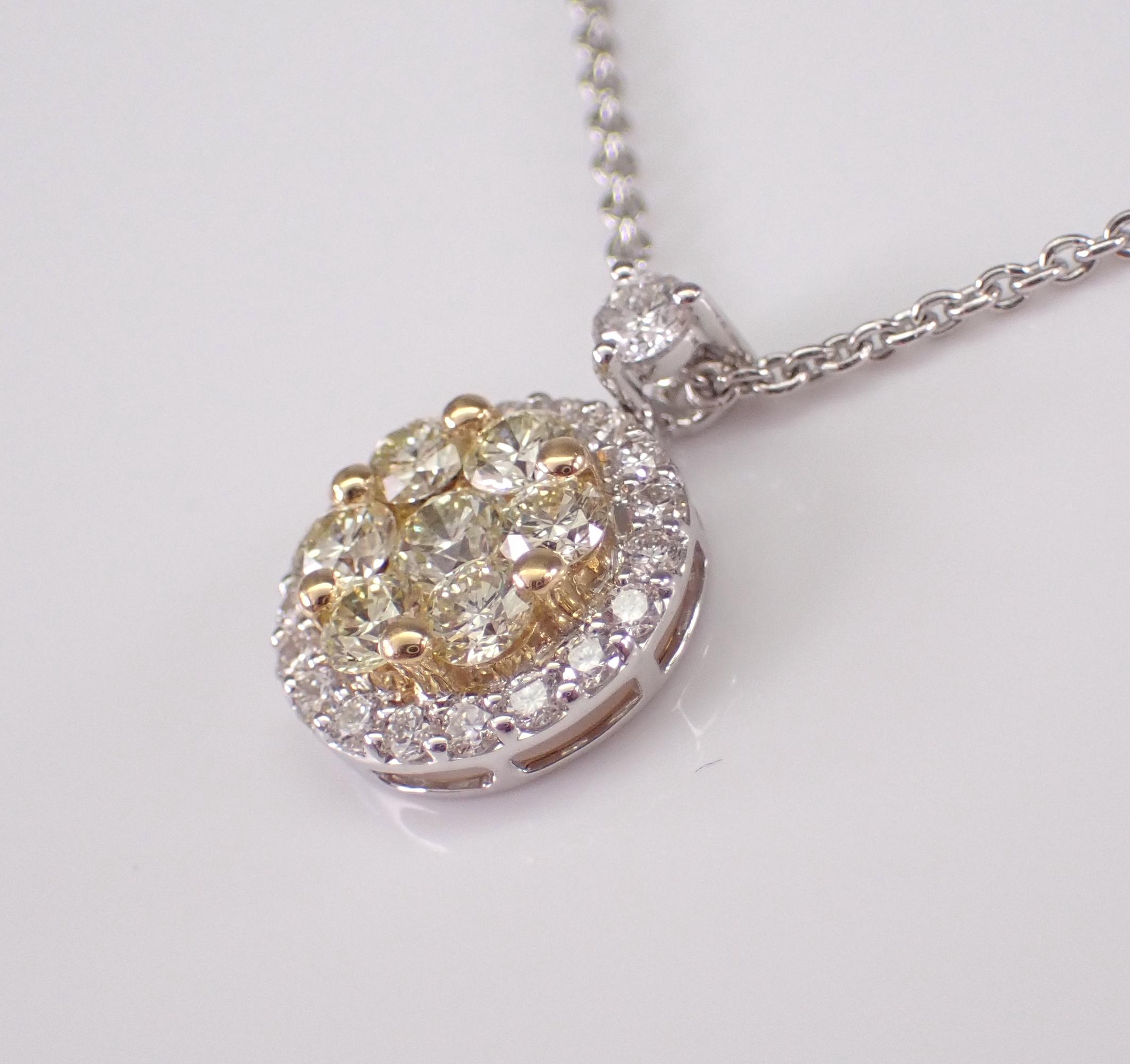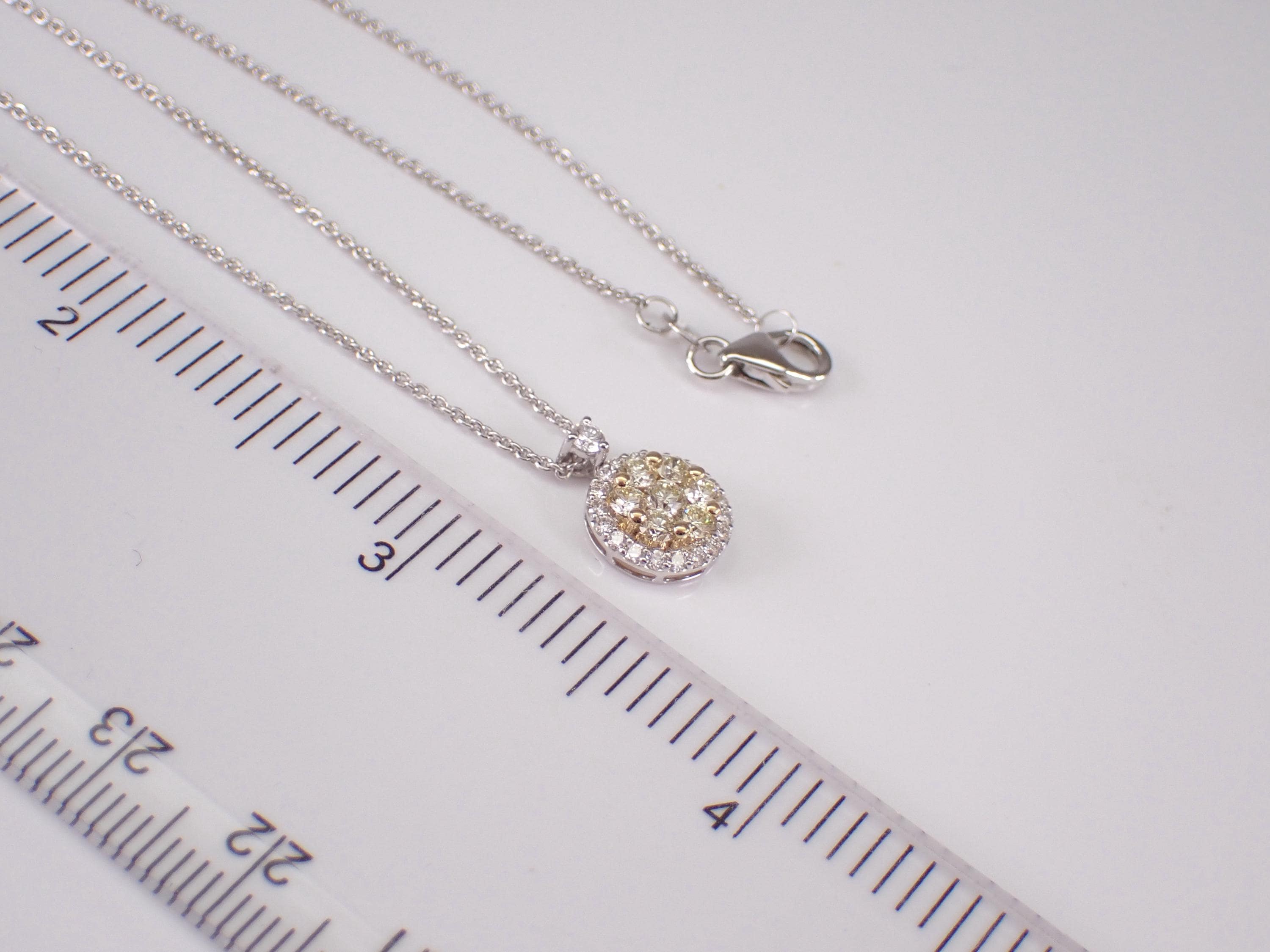 18K White Gold Canary Yellow Diamond Pendant with Chain. This pendant is set with seven Round Brilliant Yellow Diamonds and twenty-one Round Brilliant White/Colorless Diamonds. The Yellow Canary Diamonds are SI in clarity, the Colorless Brilliant diamonds are G color, SI clarity. All the diamonds weigh a total of 1/2 carat. The pendant alone measures 12 X 9 mm. This pendant is 18KT White Gold (the yellow diamonds are set in 18K Yellow Gold), and comes with a 16" 18KT White Gold chain. This necklace weighs 3.1 grams. This necklace will be accompanied by an appraisal with the retail replacement value of $2,695.00. I will ship this necklace promptly in a beautiful gift box.