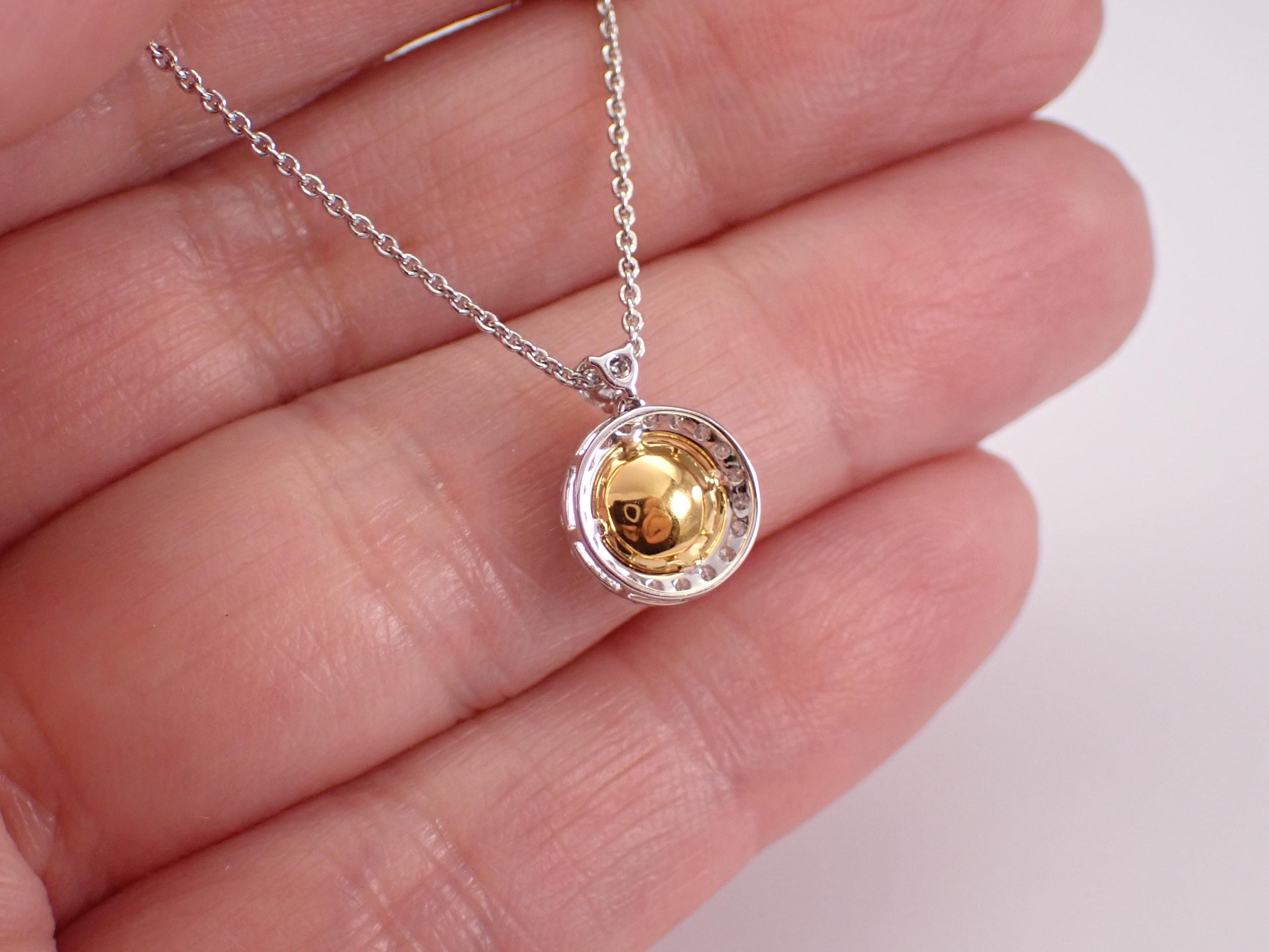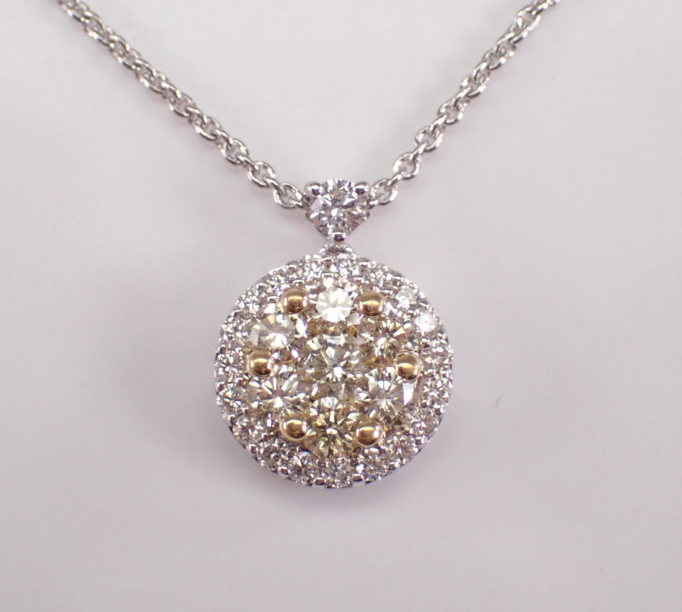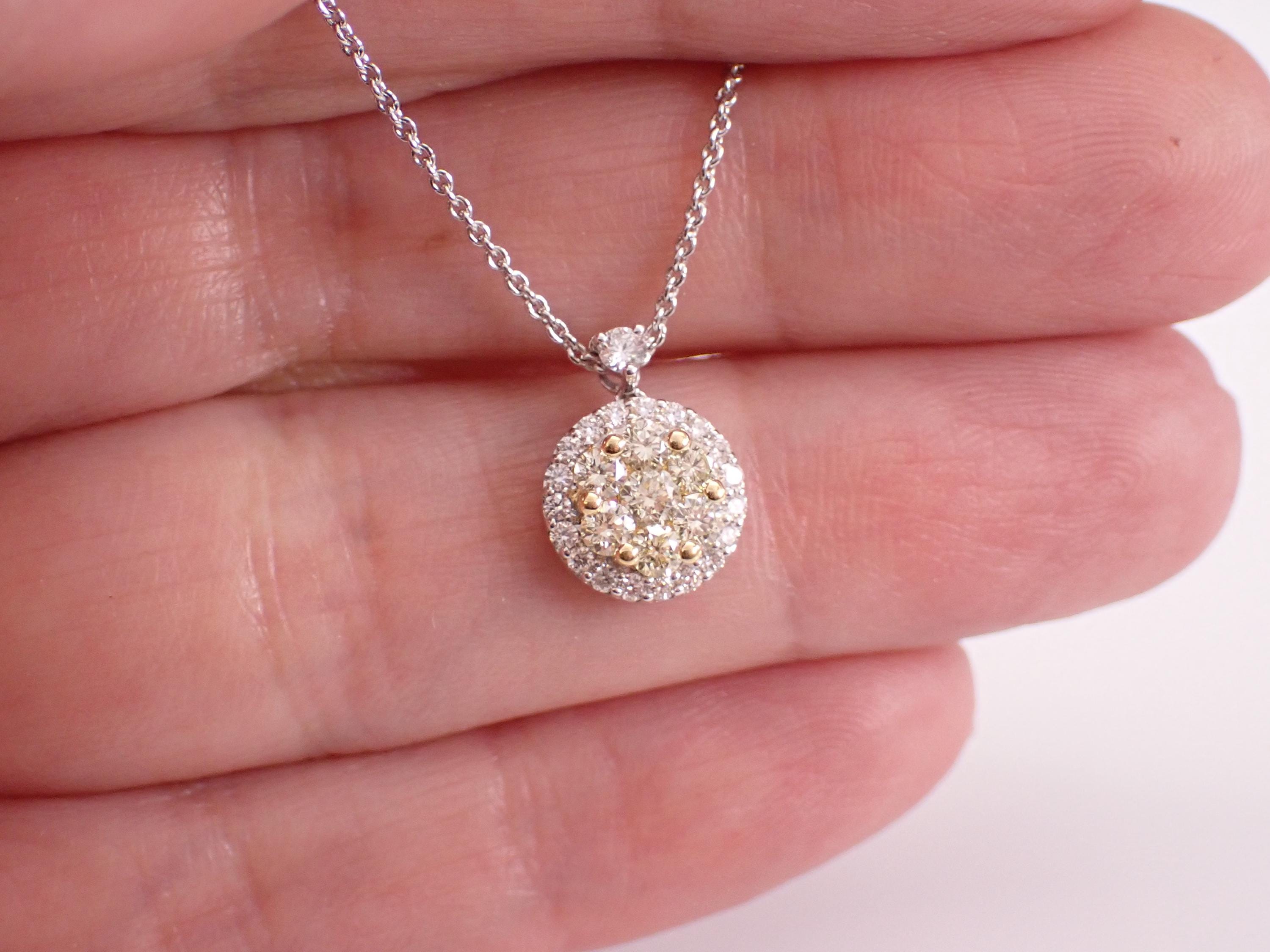 18K White Gold Canary Yellow Diamond Pendant with Chain. This pendant is set with seven Round Brilliant Yellow Diamonds and twenty-one Round Brilliant White/Colorless Diamonds. The Yellow Canary Diamonds are SI in clarity, the Colorless Brilliant diamonds are G color, SI clarity. All the diamonds weigh a total of 1/2 carat. The pendant alone measures 12 X 9 mm. This pendant is 18KT White Gold (the yellow diamonds are set in 18K Yellow Gold), and comes with a 16" 18KT White Gold chain. This necklace weighs 3.1 grams. This necklace will be accompanied by an appraisal with the retail replacement value of $2,695.00. I will ship this necklace promptly in a beautiful gift box.