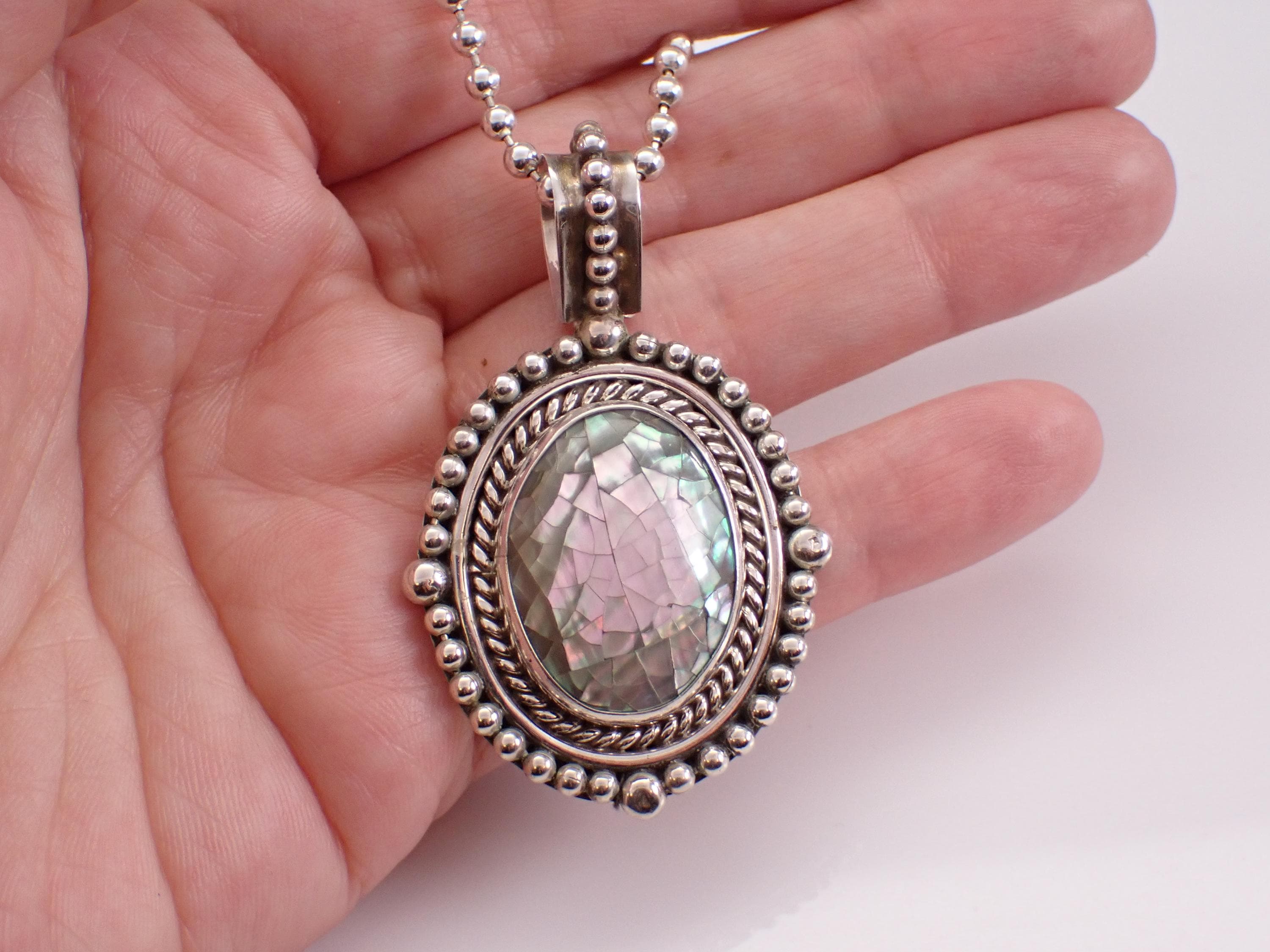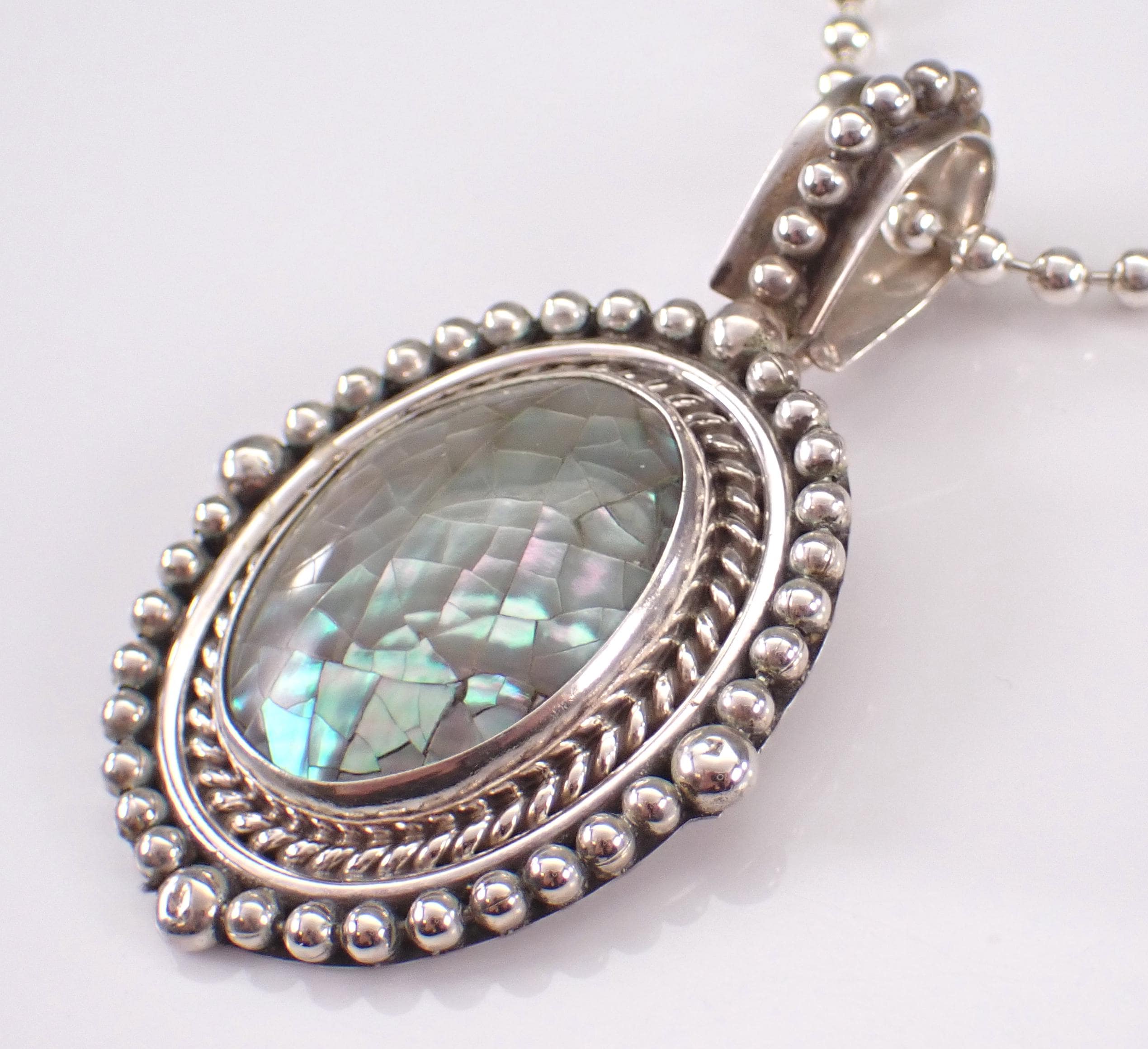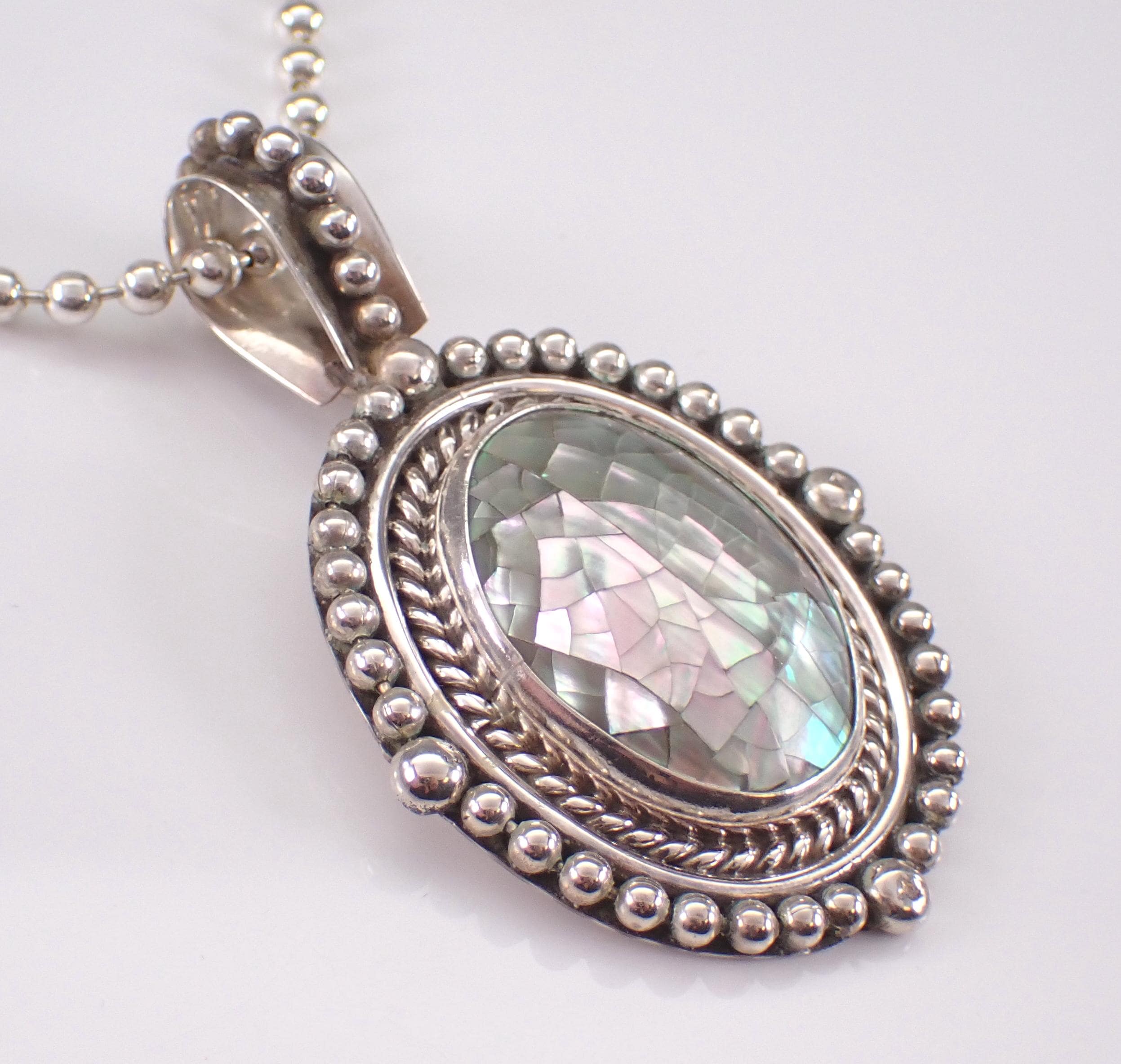 This pendant and chain are both Sterling Silver and the chain measures 22" in length. The pendant is set with Mother of Pearl Mosaic which is very unique. This pendant measures 56 X 35 mm and has a very unique beaded halo and bail. This necklace weighs 31.2 grams and the chain measures 3mm in diameter. This necklace is perfect for everyday wear, great gift for any occasion! Will be shipped promptly in a gift pouch.