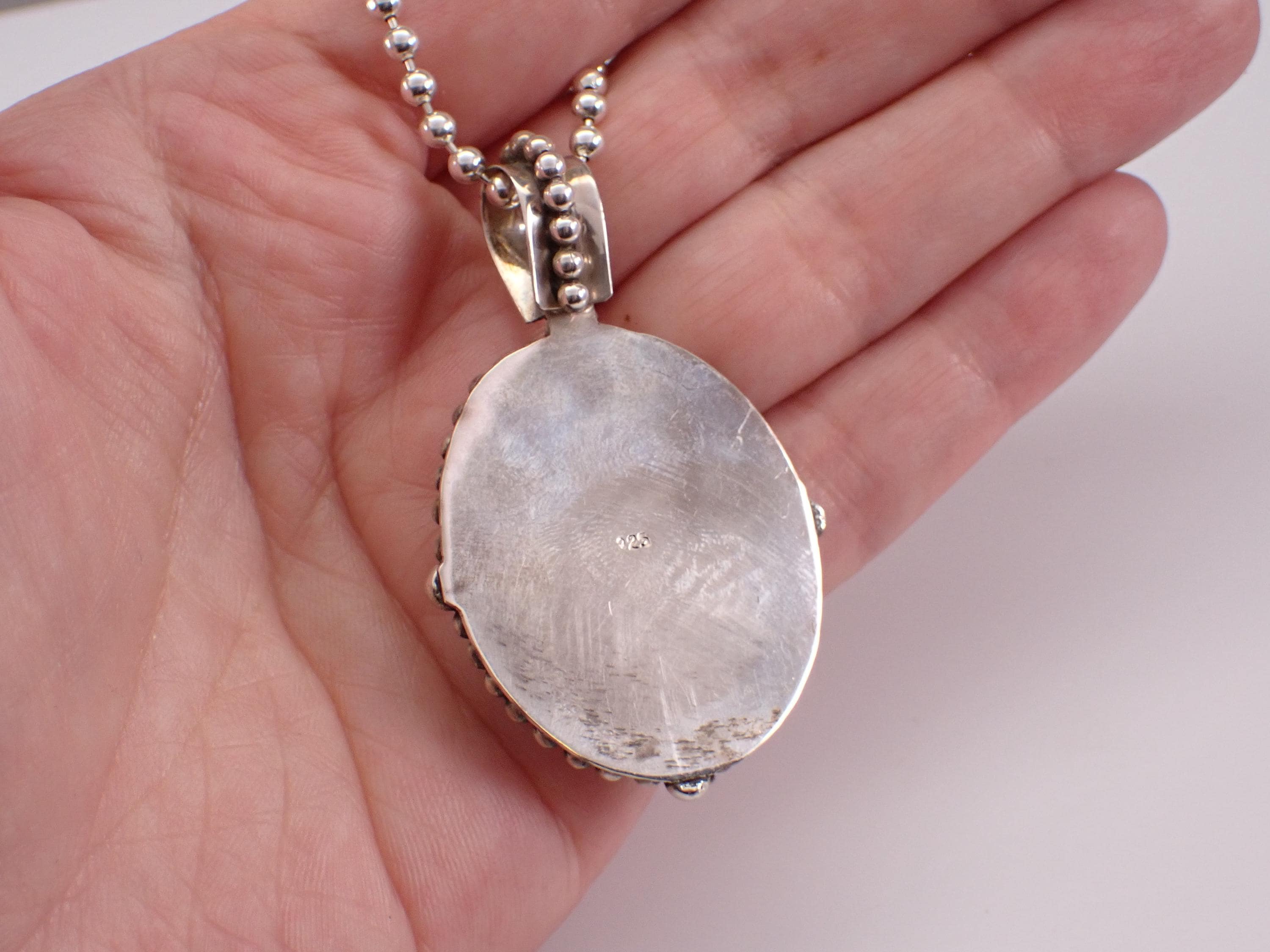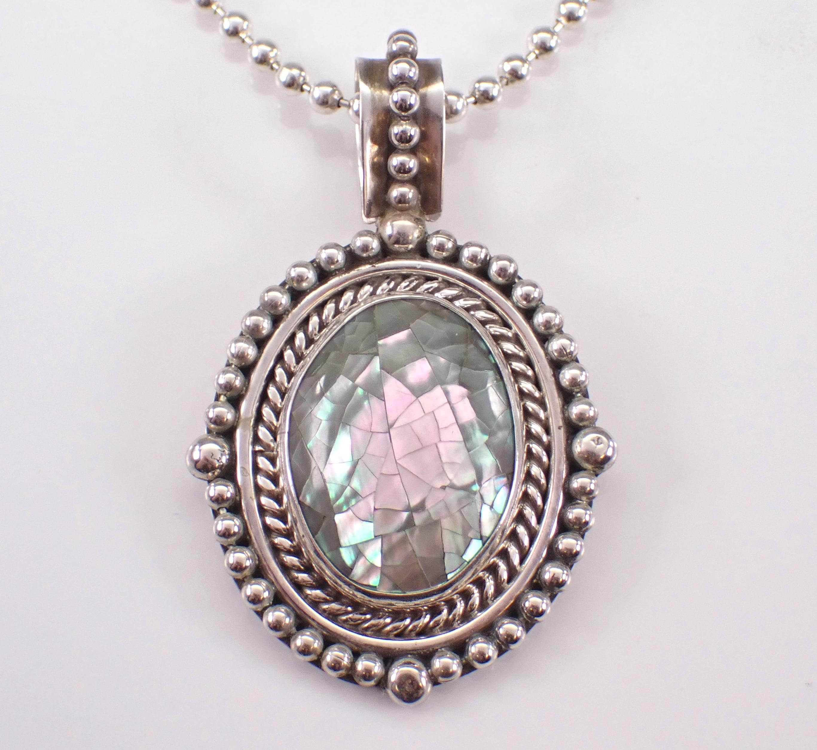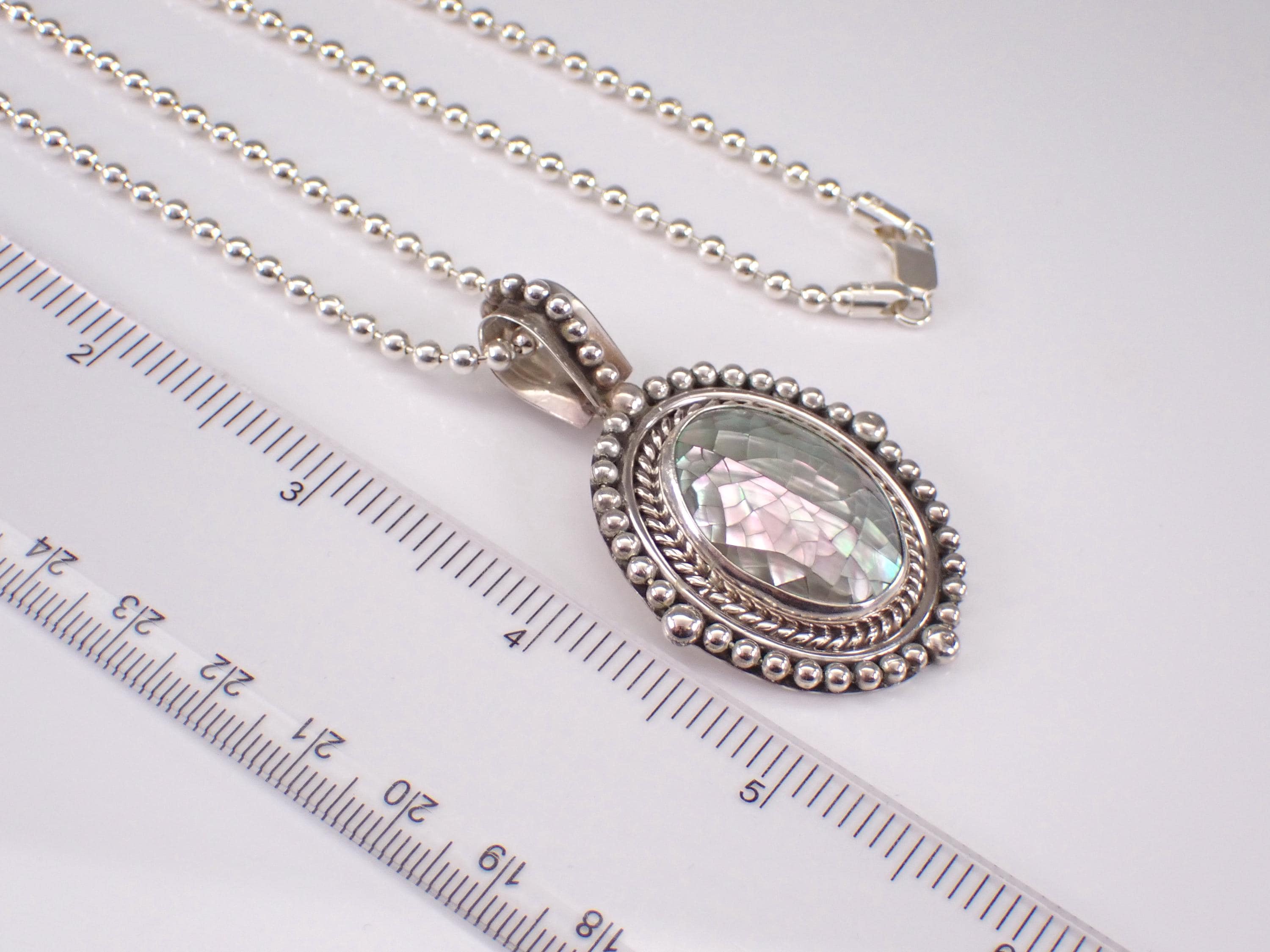 This pendant and chain are both Sterling Silver and the chain measures 22" in length. The pendant is set with Mother of Pearl Mosaic which is very unique. This pendant measures 56 X 35 mm and has a very unique beaded halo and bail. This necklace weighs 31.2 grams and the chain measures 3mm in diameter. This necklace is perfect for everyday wear, great gift for any occasion! Will be shipped promptly in a gift pouch.