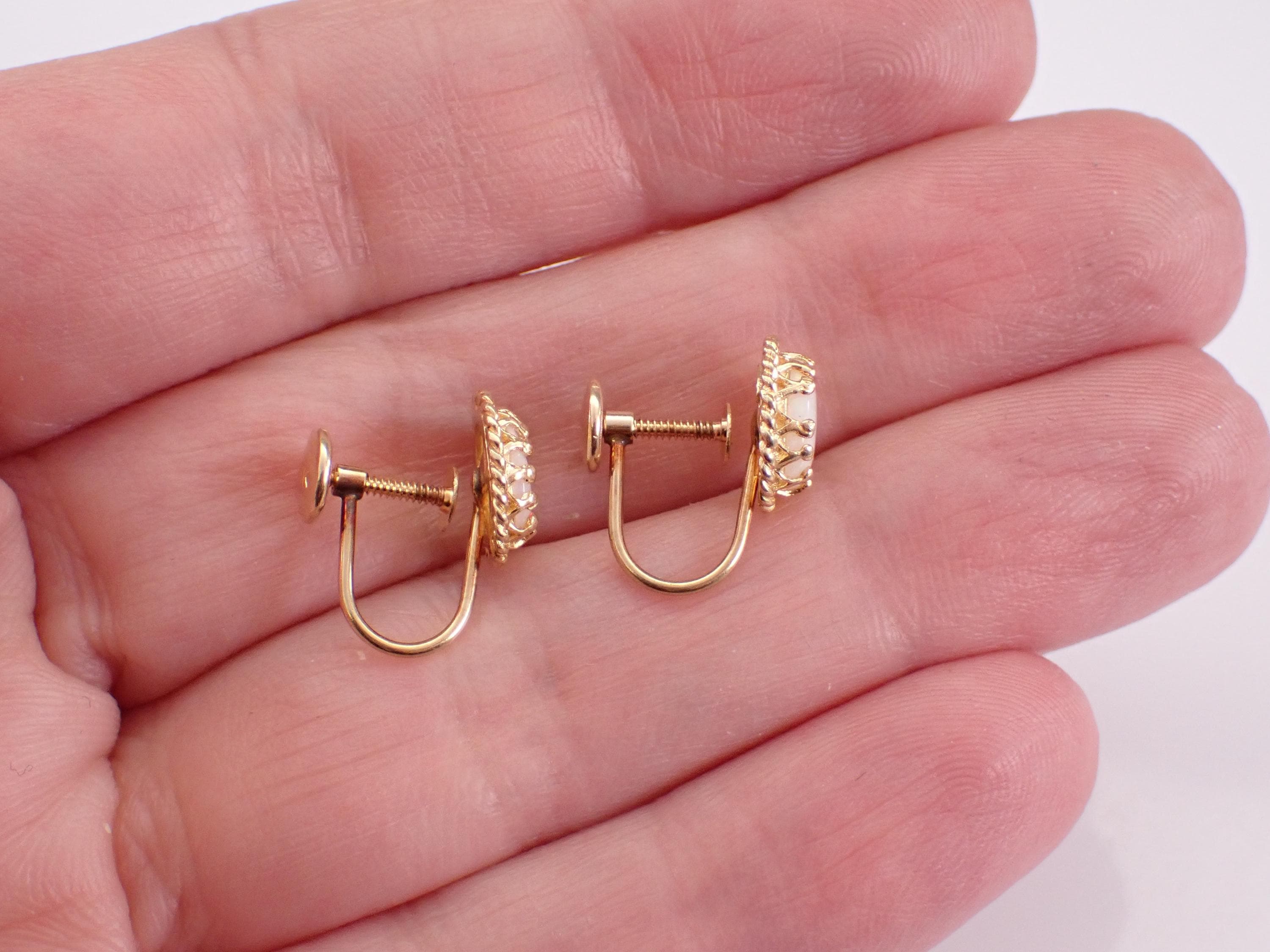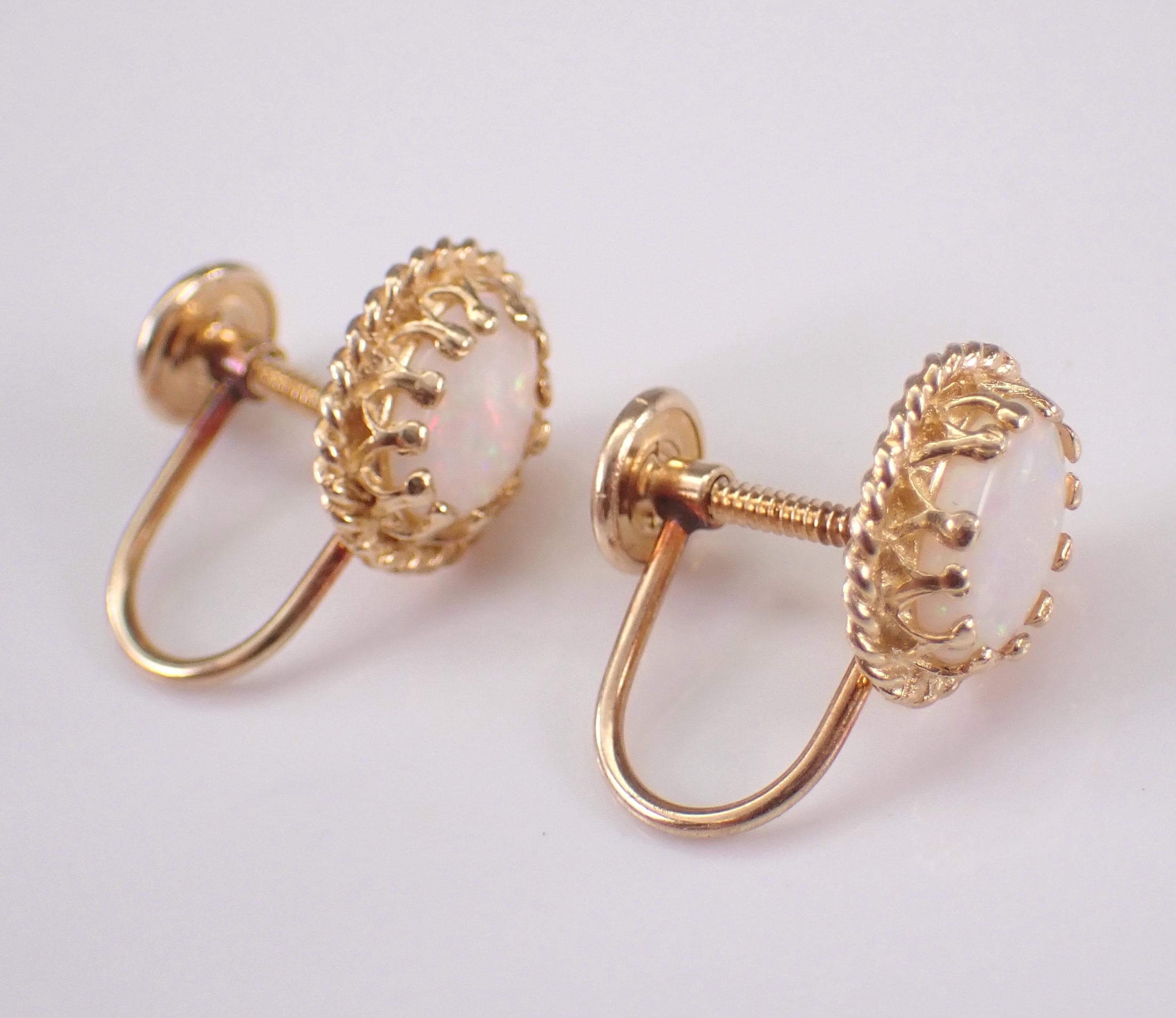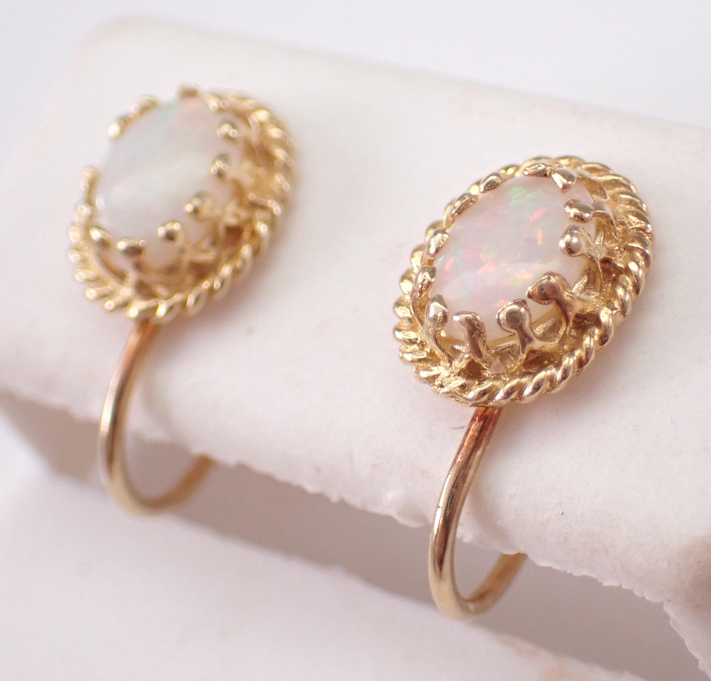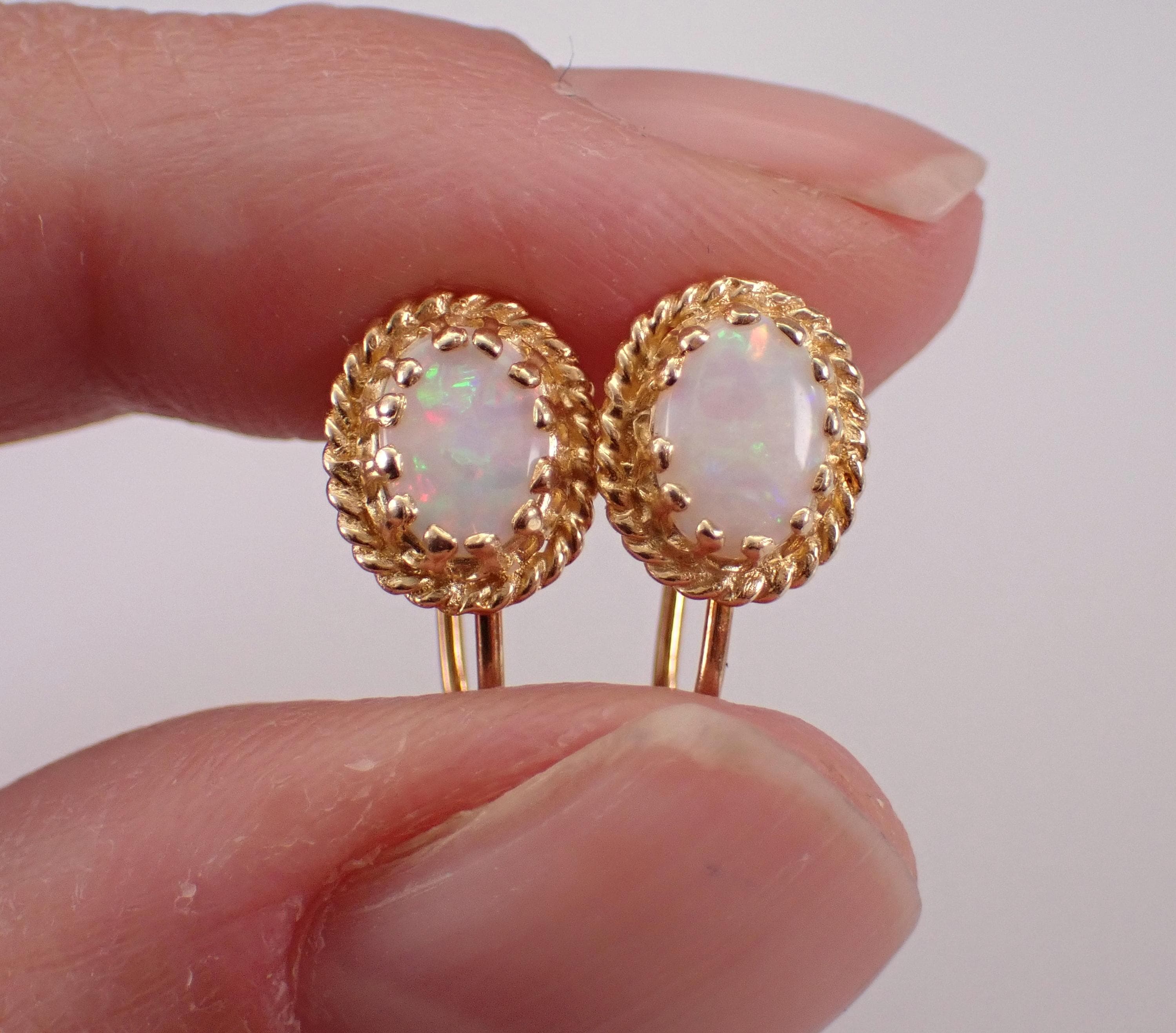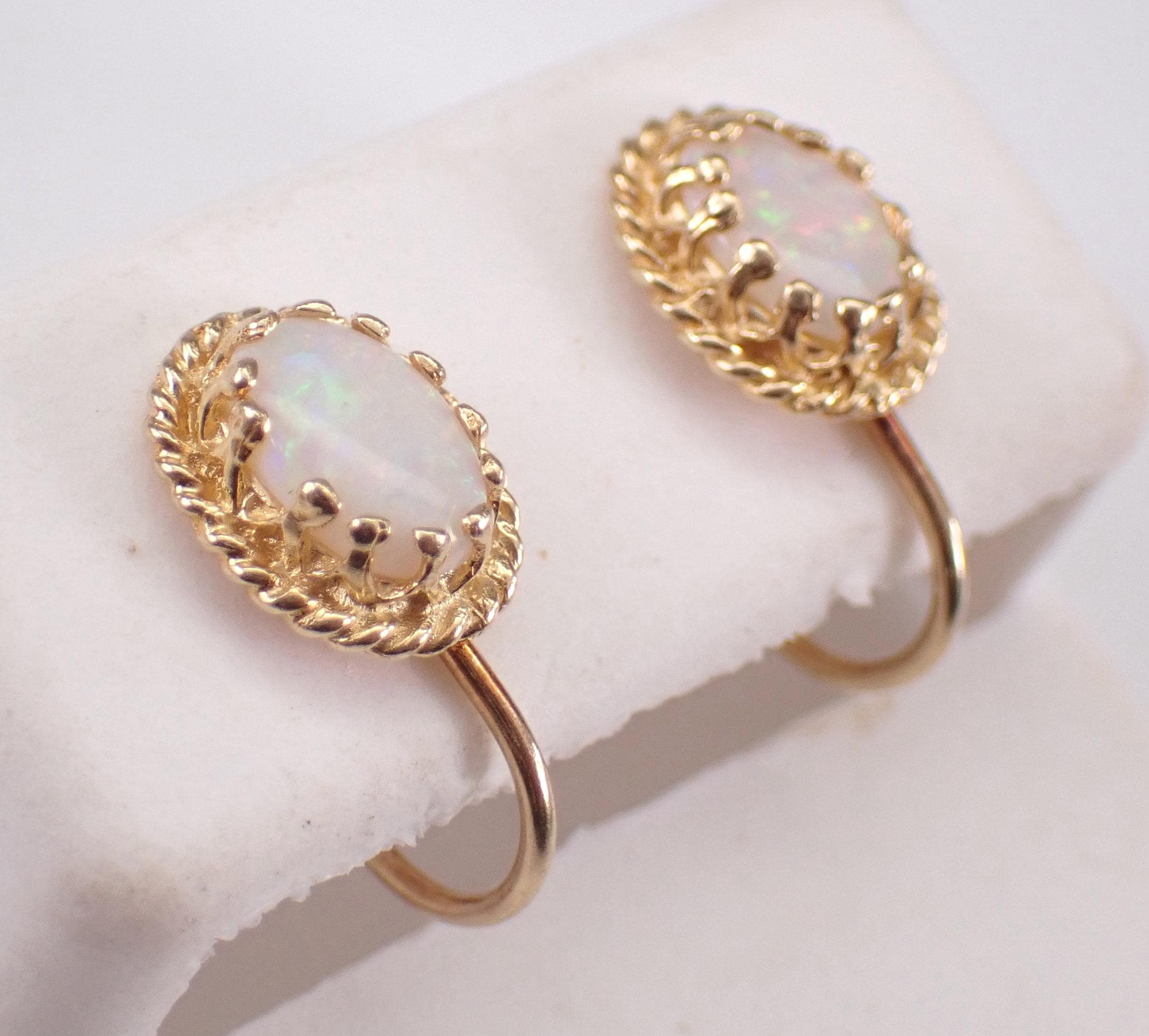 Vintage 14K Yellow Gold Opal Screwback Non Pierced Earrings. These earrings are set with two Oval Opals. These Opal measure 7 X 5 mm each. These earrings are 14KT Yellow Gold and weigh a total of 2.2 grams. These earrings are for non-pierced ears and have screwback closures. The front of these earrings measure 9.5 X 7 mm each. I will ship these earrings promptly in a gift box.