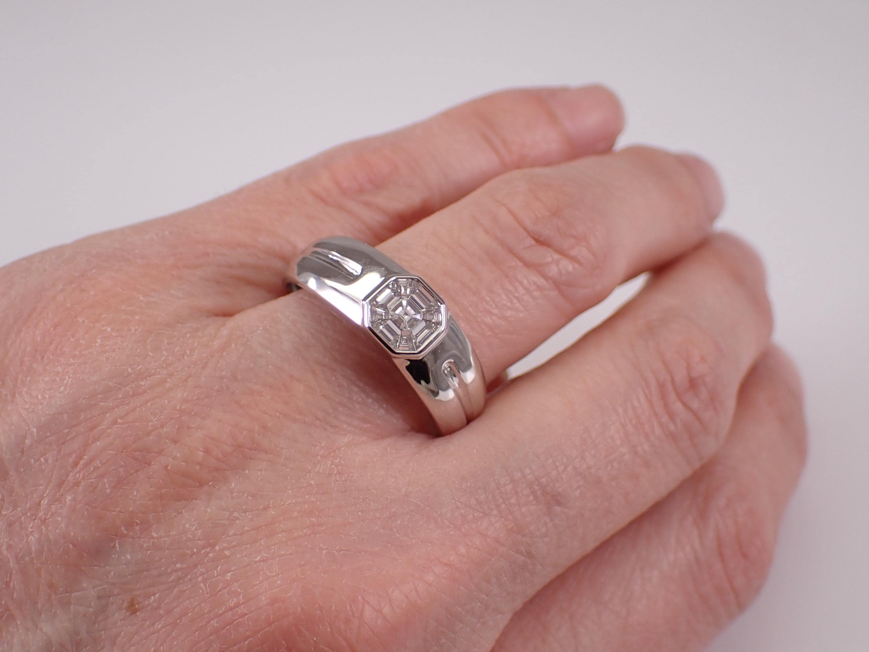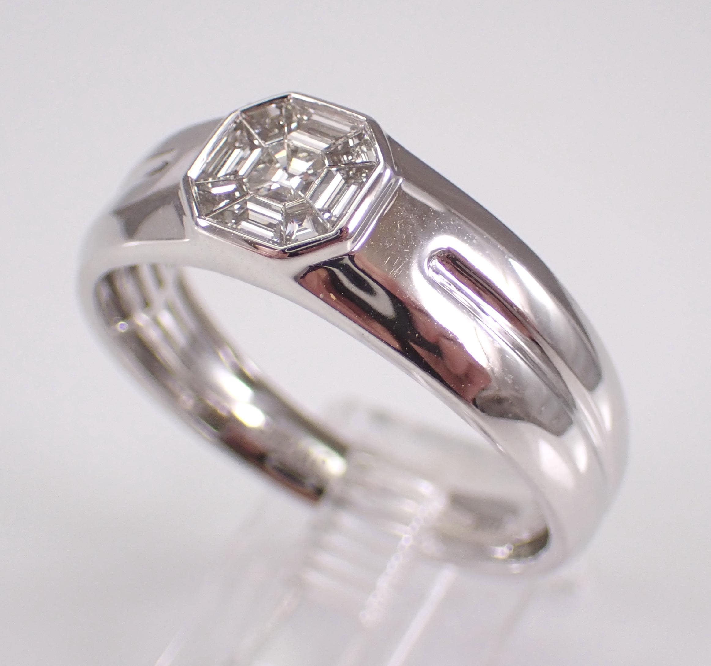 White Gold Diamond Cluster Engagement Ring for Him. This ring is set with one genuine Asscher Cut Diamond and nine natural Baguette Diamonds. These diamonds are G color, VS clarity and weigh a total of 1/2 carat. These Diamonds are set together to give the illusion of one large Asscher Cut Diamond. This ring is 10KT White Gold, weighs 4.6 grams and is a finger size 10 1/2, which can be resized free of charge (please inquire about sizing with the finger size that you need). The top of the ring measures 7 mm along the finger. This ring will be accompanied by an appraisal with the retail replacement value of $4,295.00. I will ship this ring promptly in a gift box.