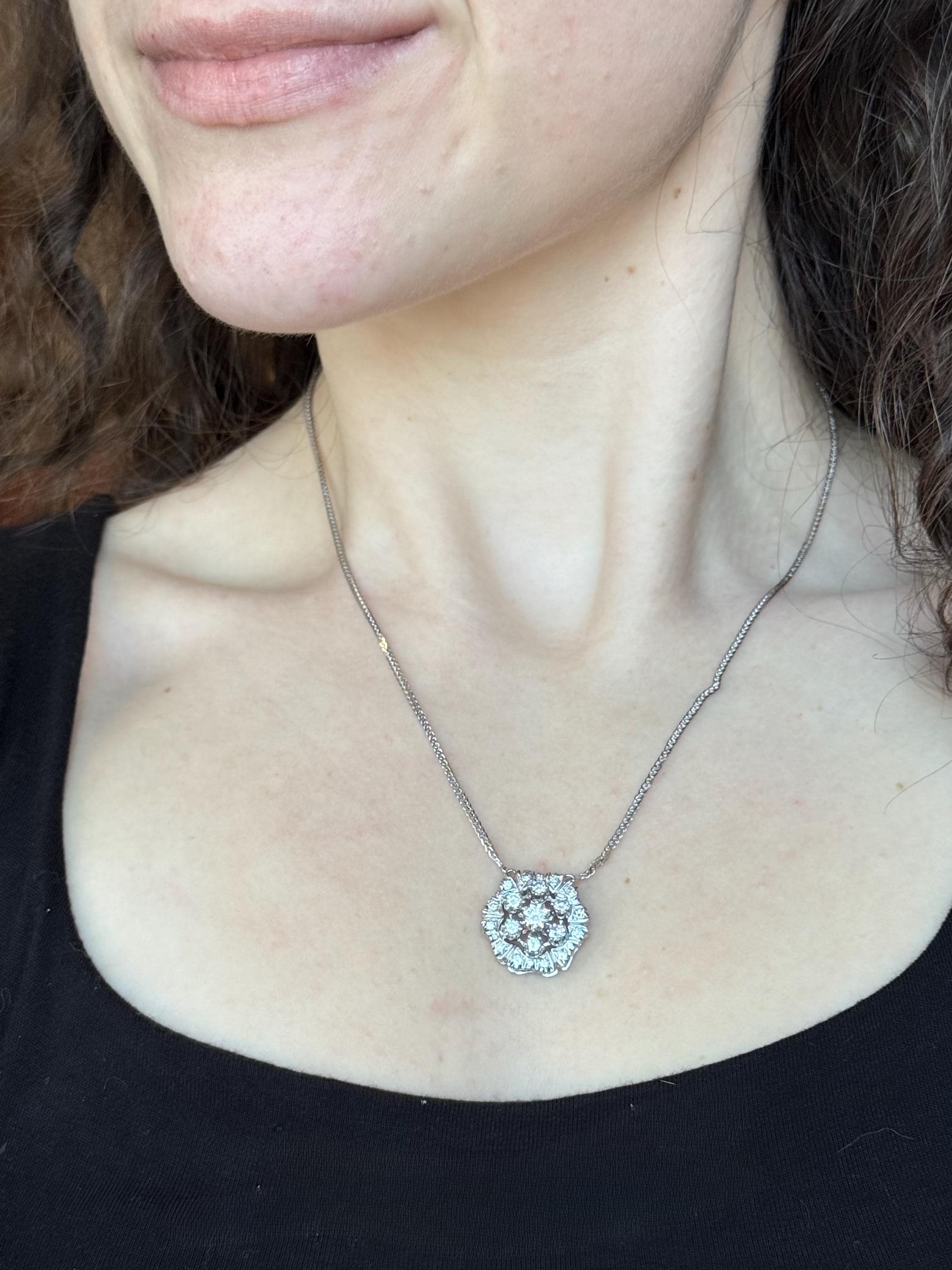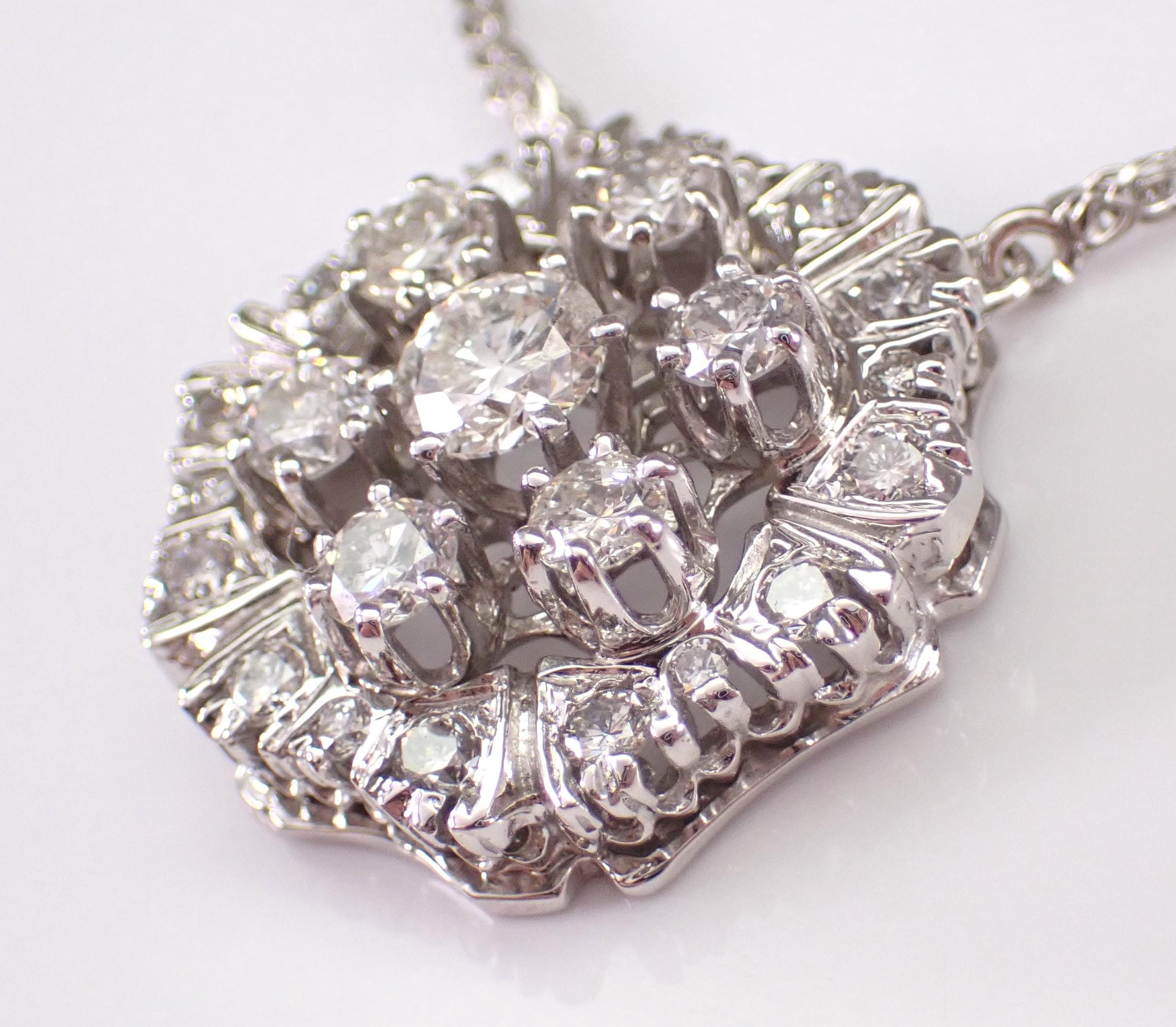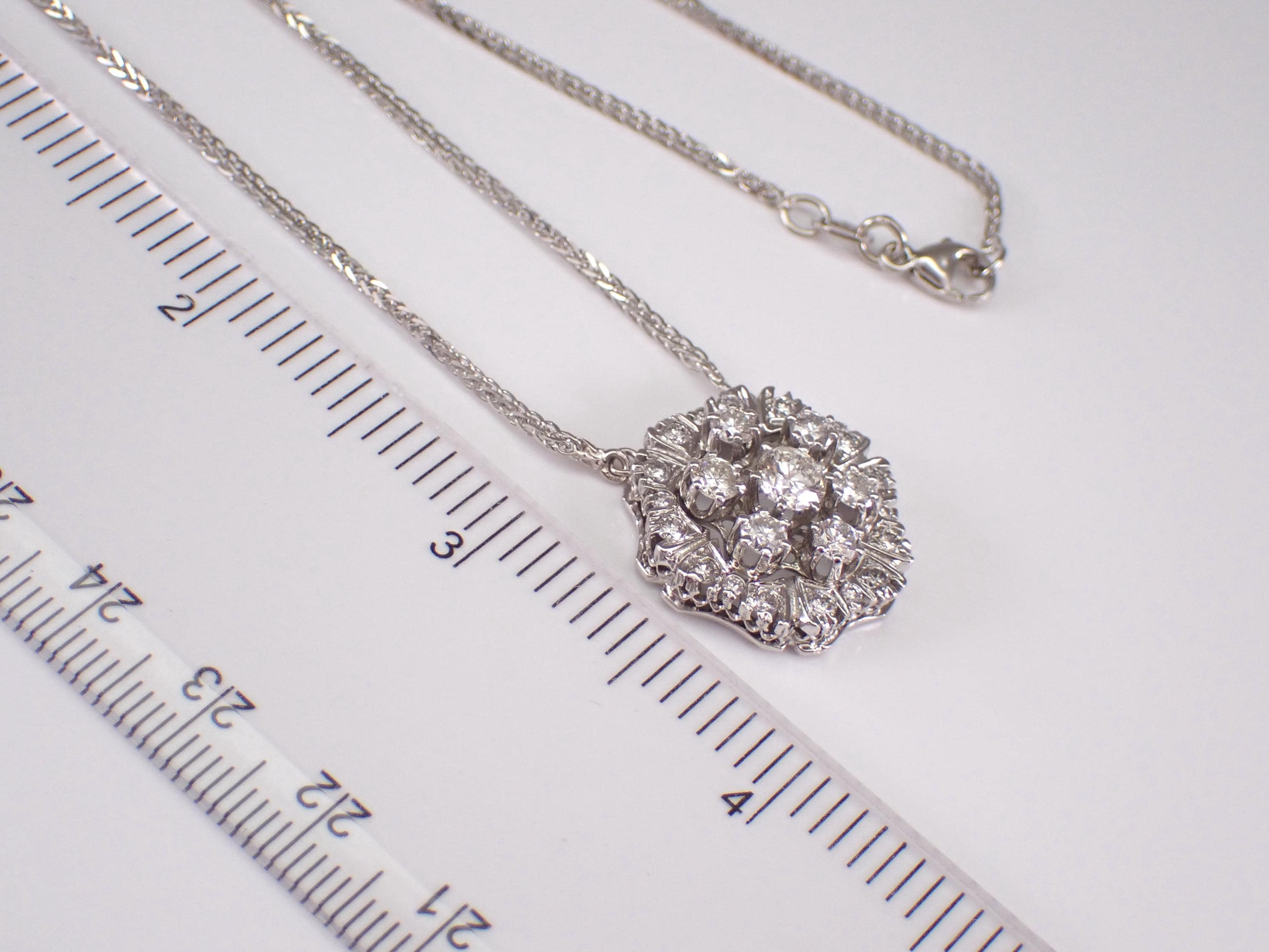Antique 14K White Gold Diamond Pendant Necklace. This pendant is set with twenty-five genuine Round Diamonds. These diamonds are G color, SI clarity and weigh a total of 1.25 carats. This pendant comes attached to a 14K White Gold chain that measures 18.5" in overall length. This necklace weighs 8.2 grams and the pendant measures 20 mm in diameter. This Necklace dates back to Circa 1950's and will be accompanied by an appraisal for insurance and authentication purposes. I will ship this pendant promptly in a beautiful gift box.