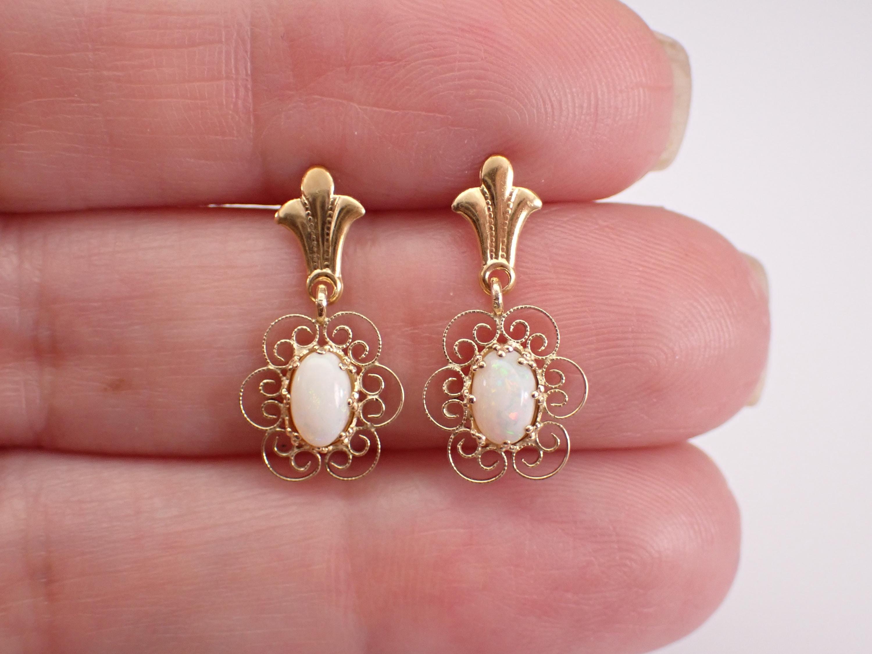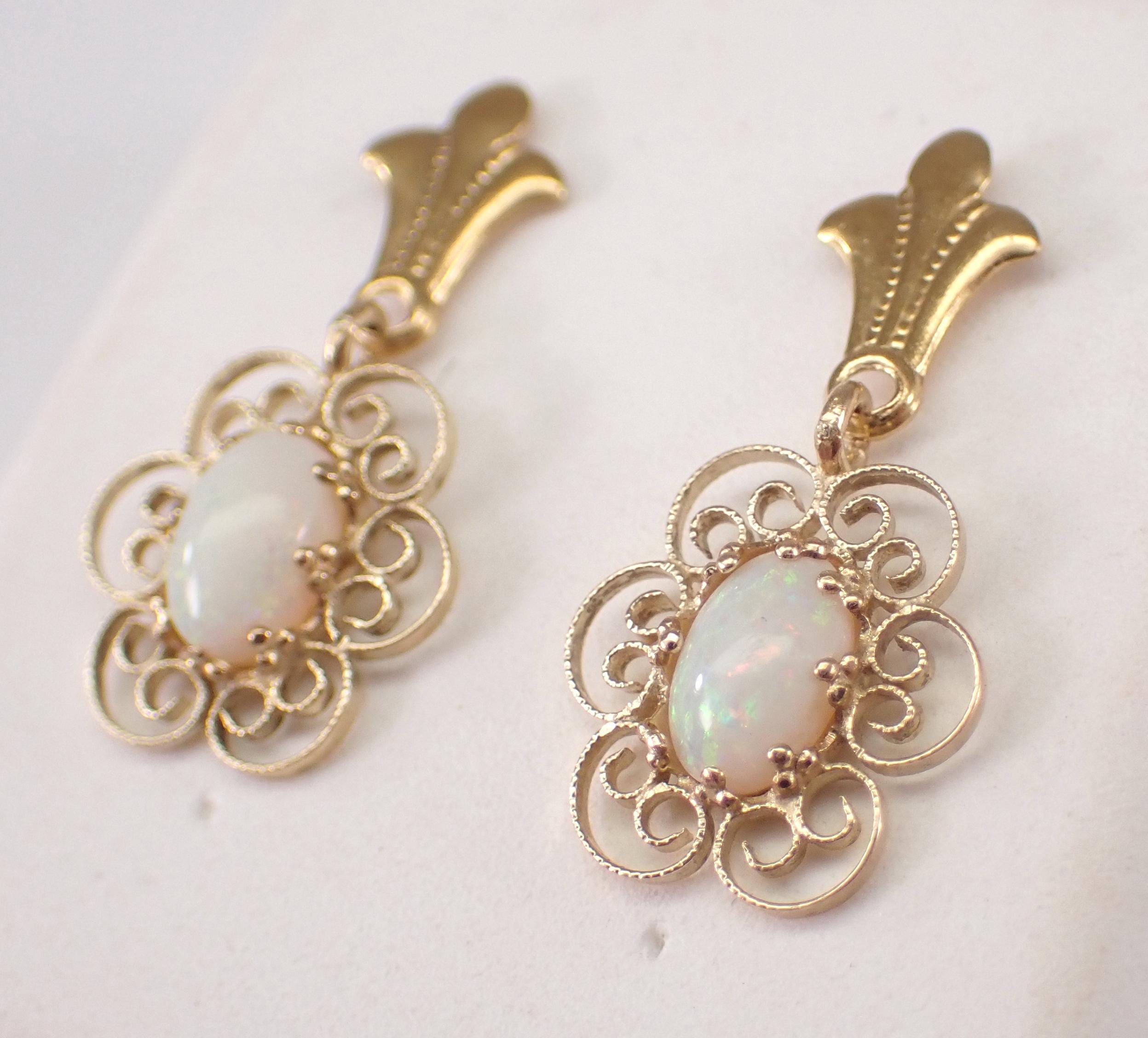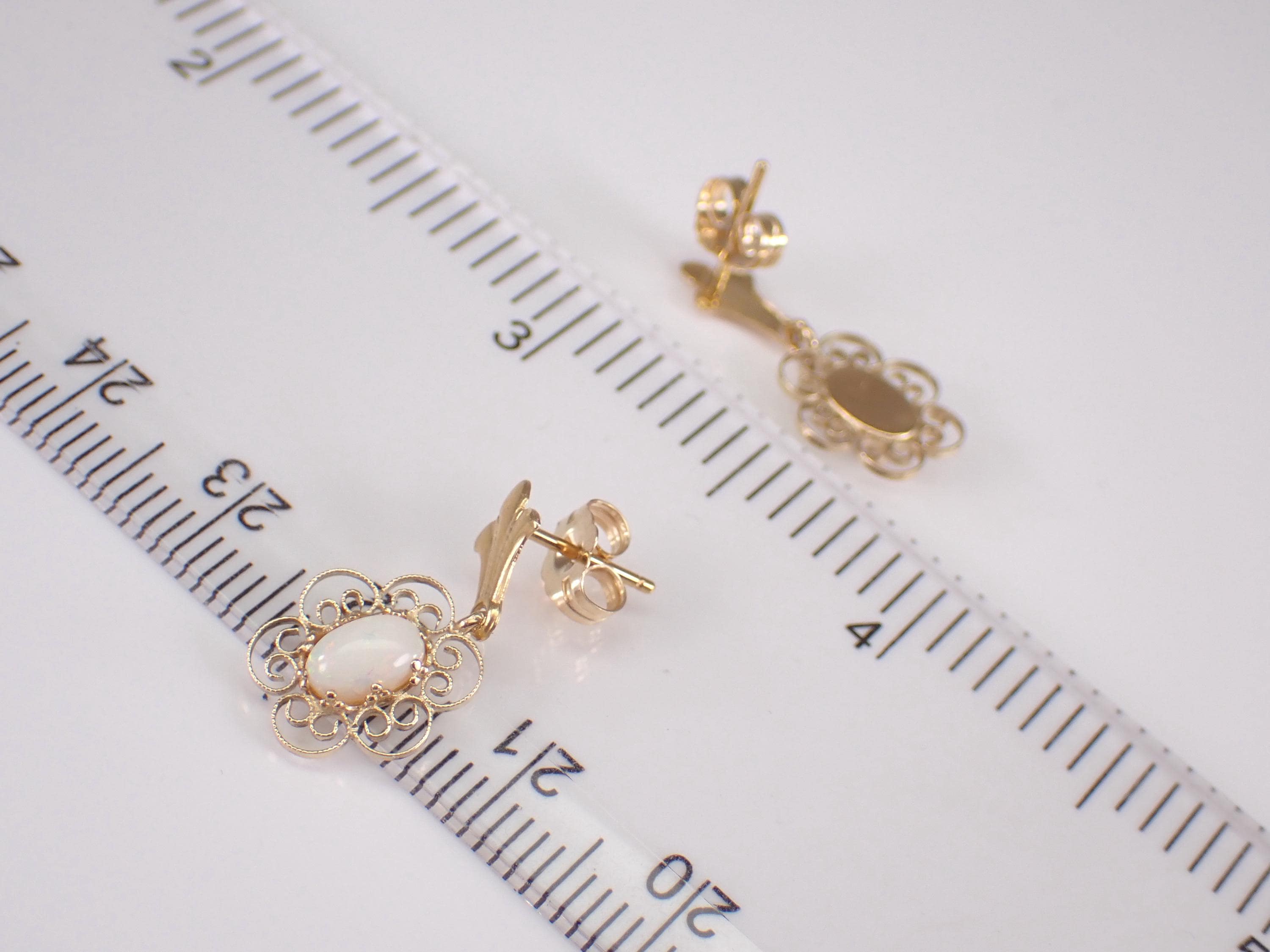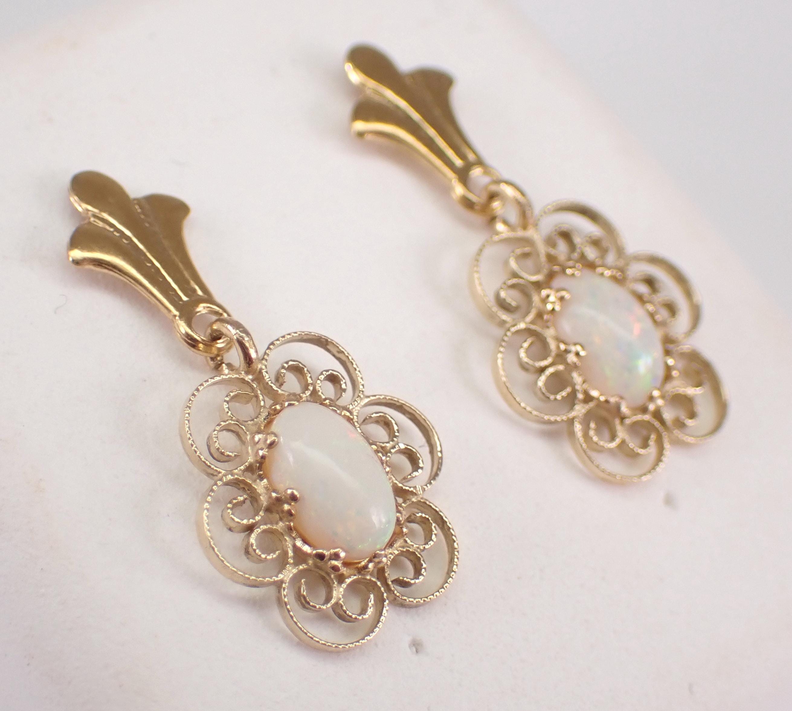 14K Yellow Gold Antique Opal Dangle Earrings. These earrings are set with two genuine Oval Opal. These Opal measure 5 X 3 mm each. These earrings are 14KT Yellow Gold and weigh a total of 1.2 grams. These earrings are for pierced ears, measure 20 mm in length and the earrings have friction post backings. I will ship these earrings promptly in a gift box.