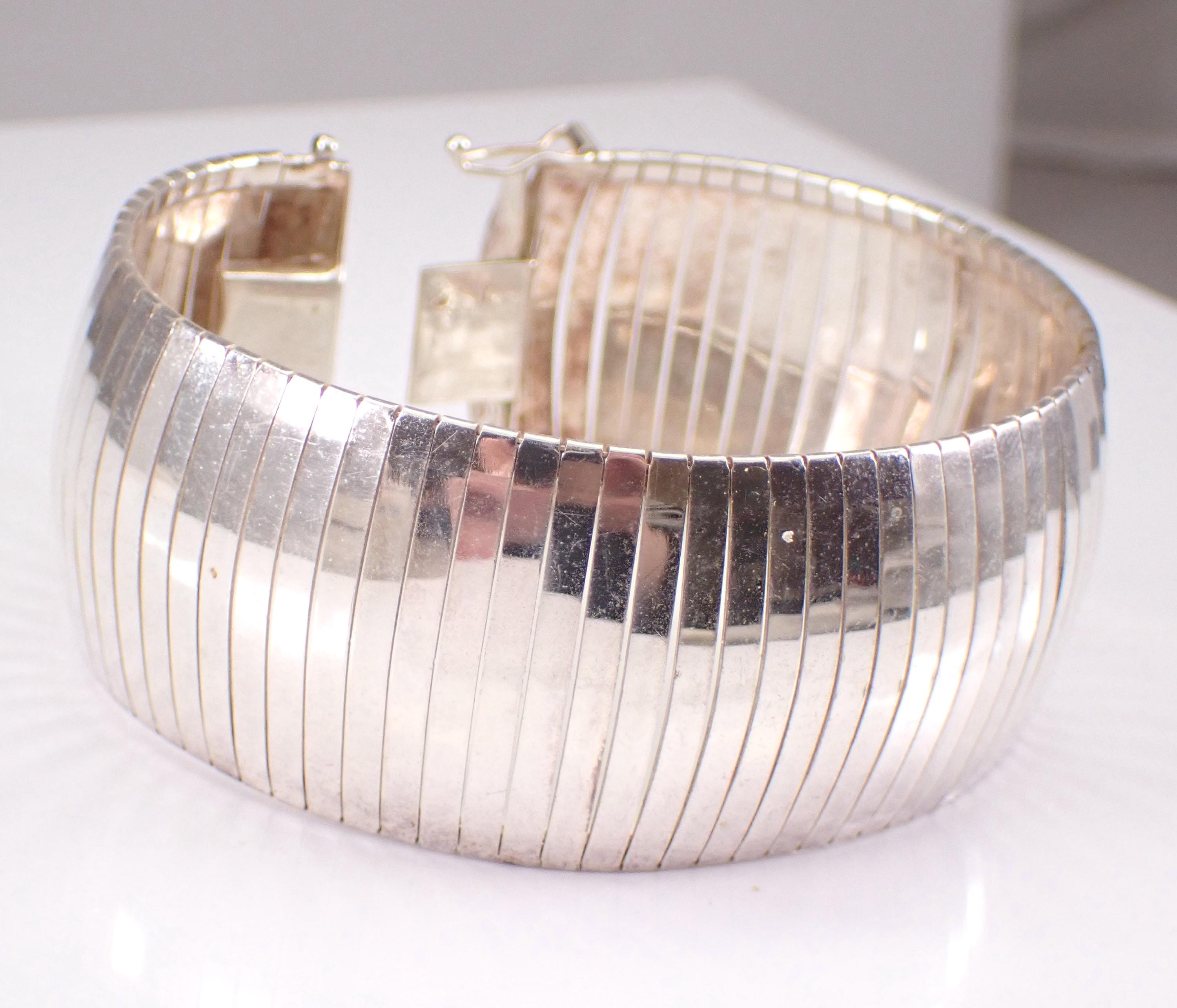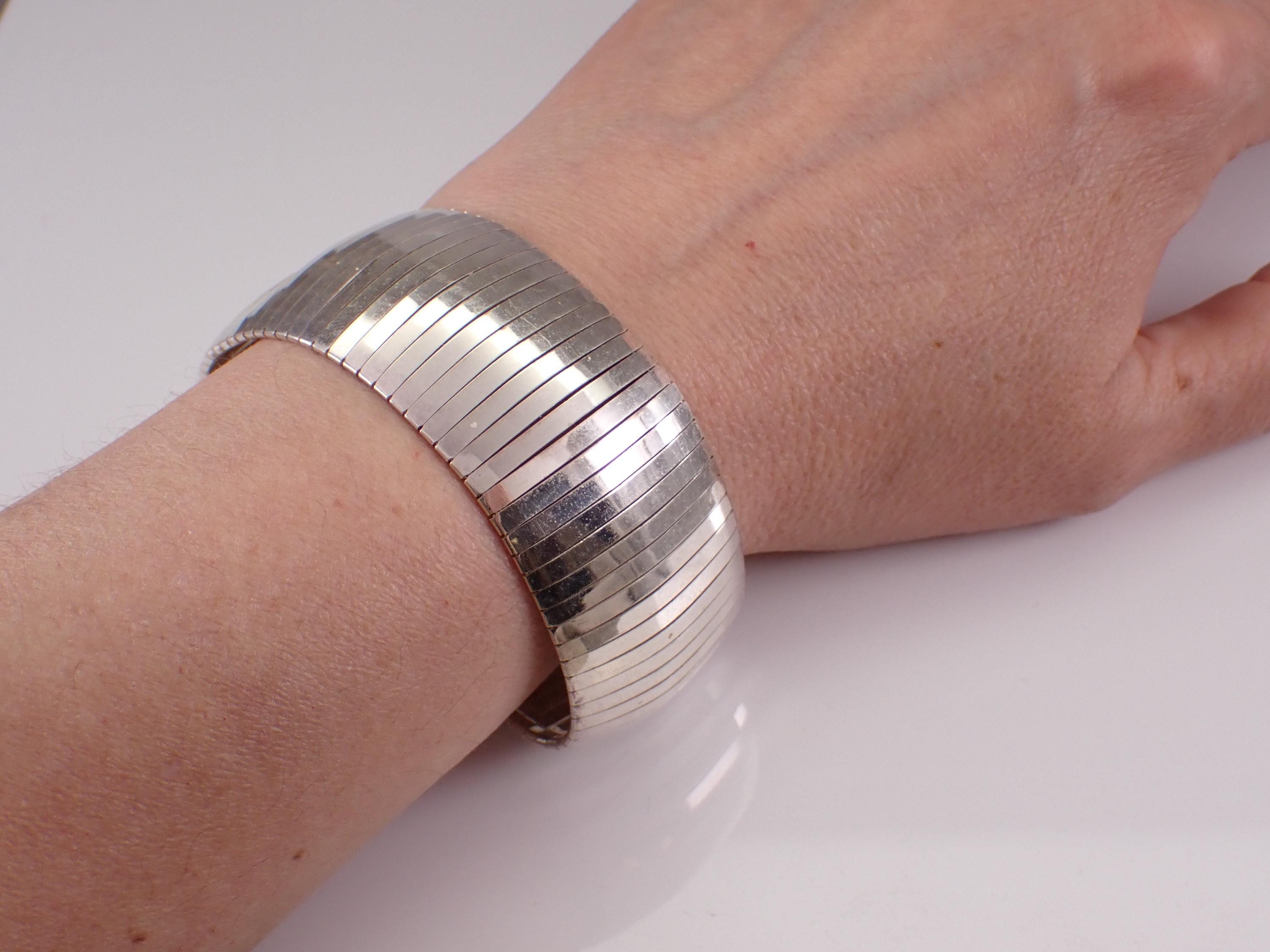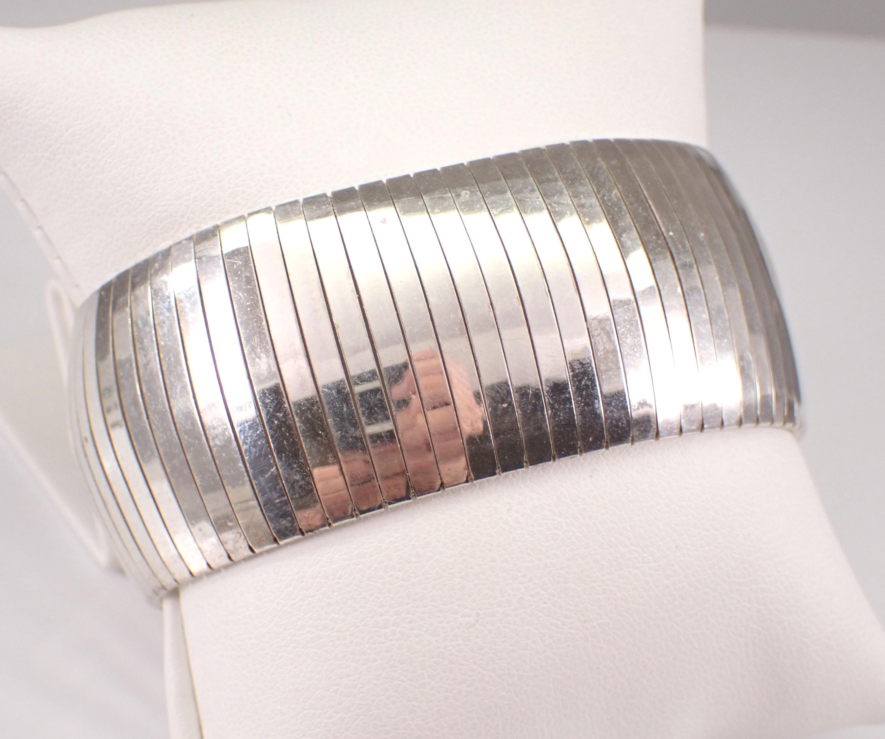 Vintage Sterling Silver Flexible Wide Bracelet. This bracelet measures 29 mm in width and weighs 34.8 grams. This bracelet measures 7 1/4" in length and has the appearance of a flexible bangle when worn. This bracelet will be shipped promptly in a gift pouch. Makes an awesome gift for any age, graduation, birthday or any special event.