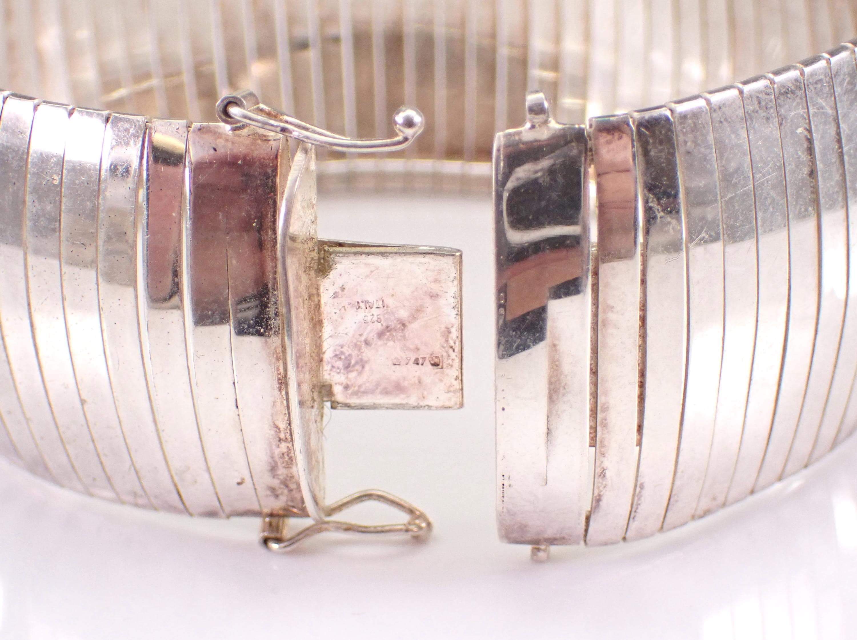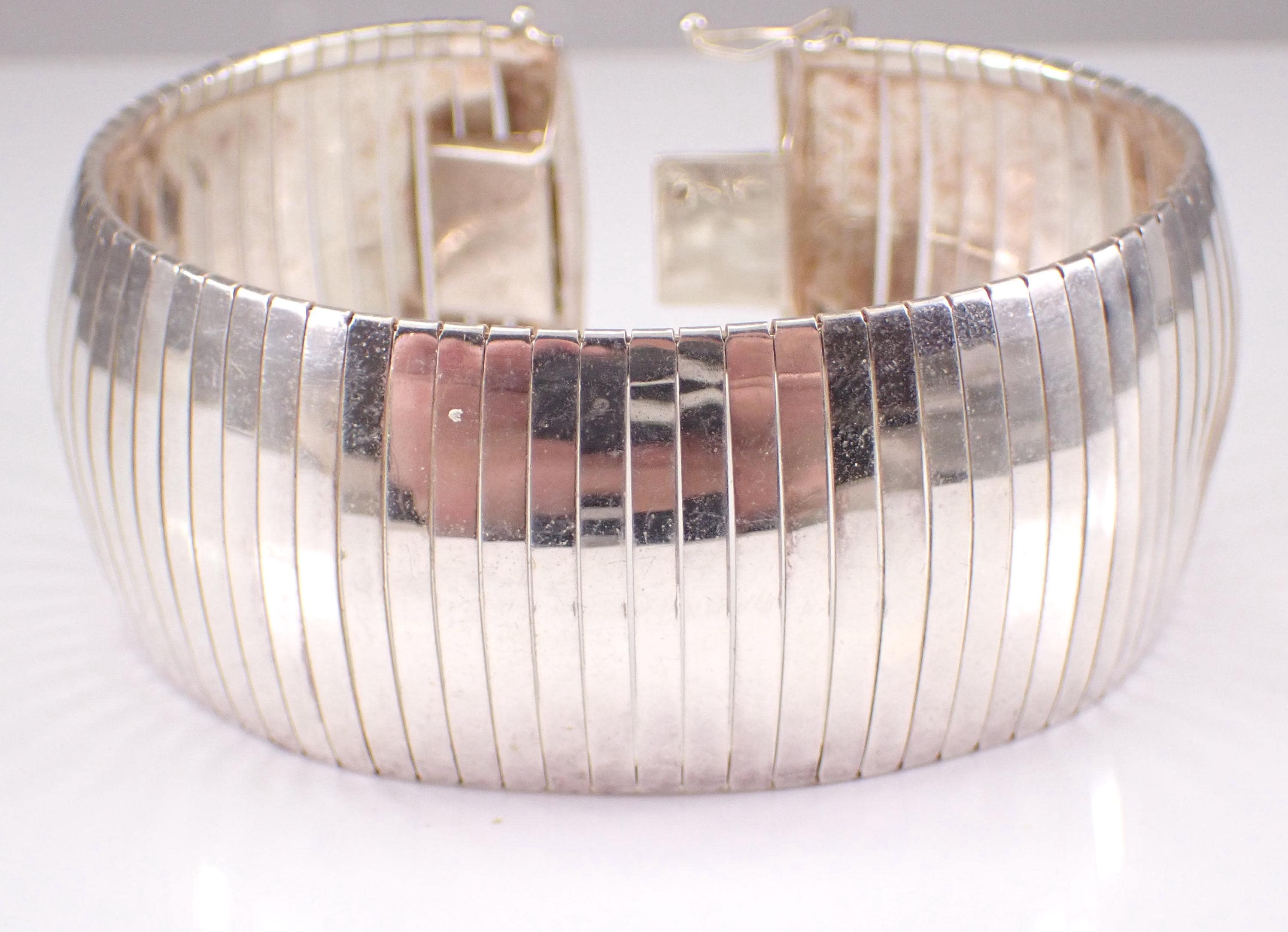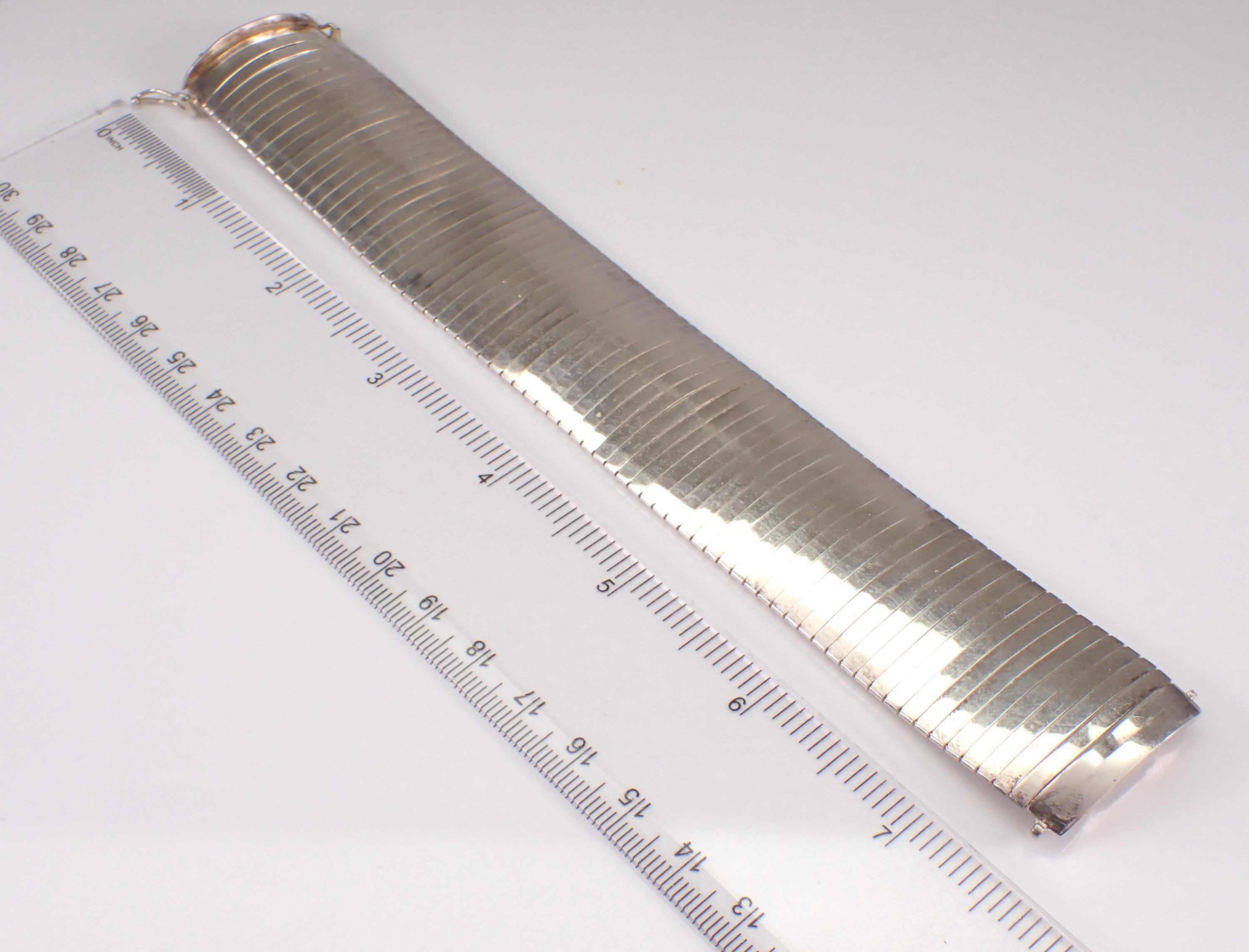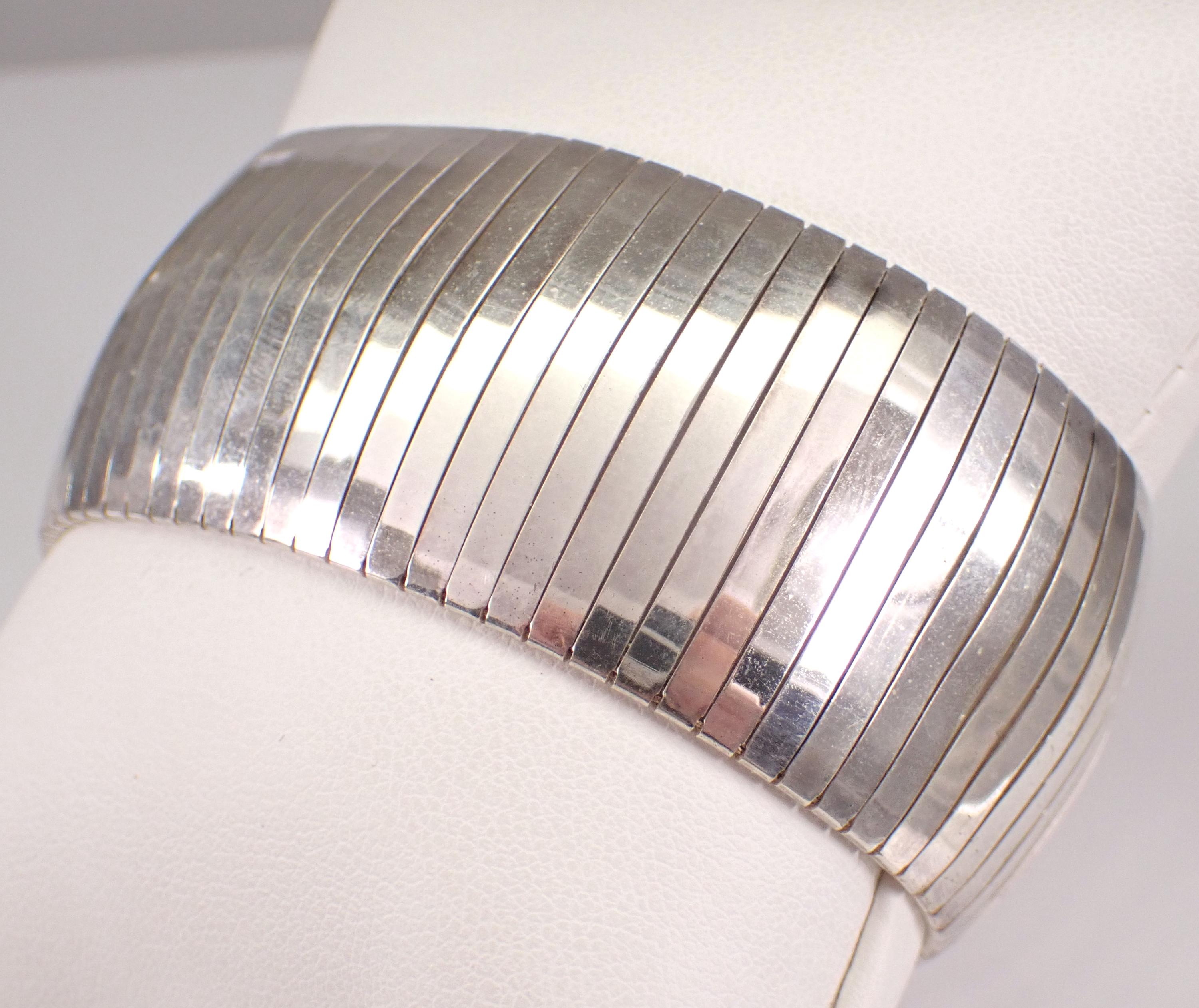Vintage Sterling Silver Flexible Wide Bracelet. This bracelet measures 29 mm in width and weighs 34.8 grams. This bracelet measures 7 1/4" in length and has the appearance of a flexible bangle when worn. This bracelet will be shipped promptly in a gift pouch. Makes an awesome gift for any age, graduation, birthday or any special event.