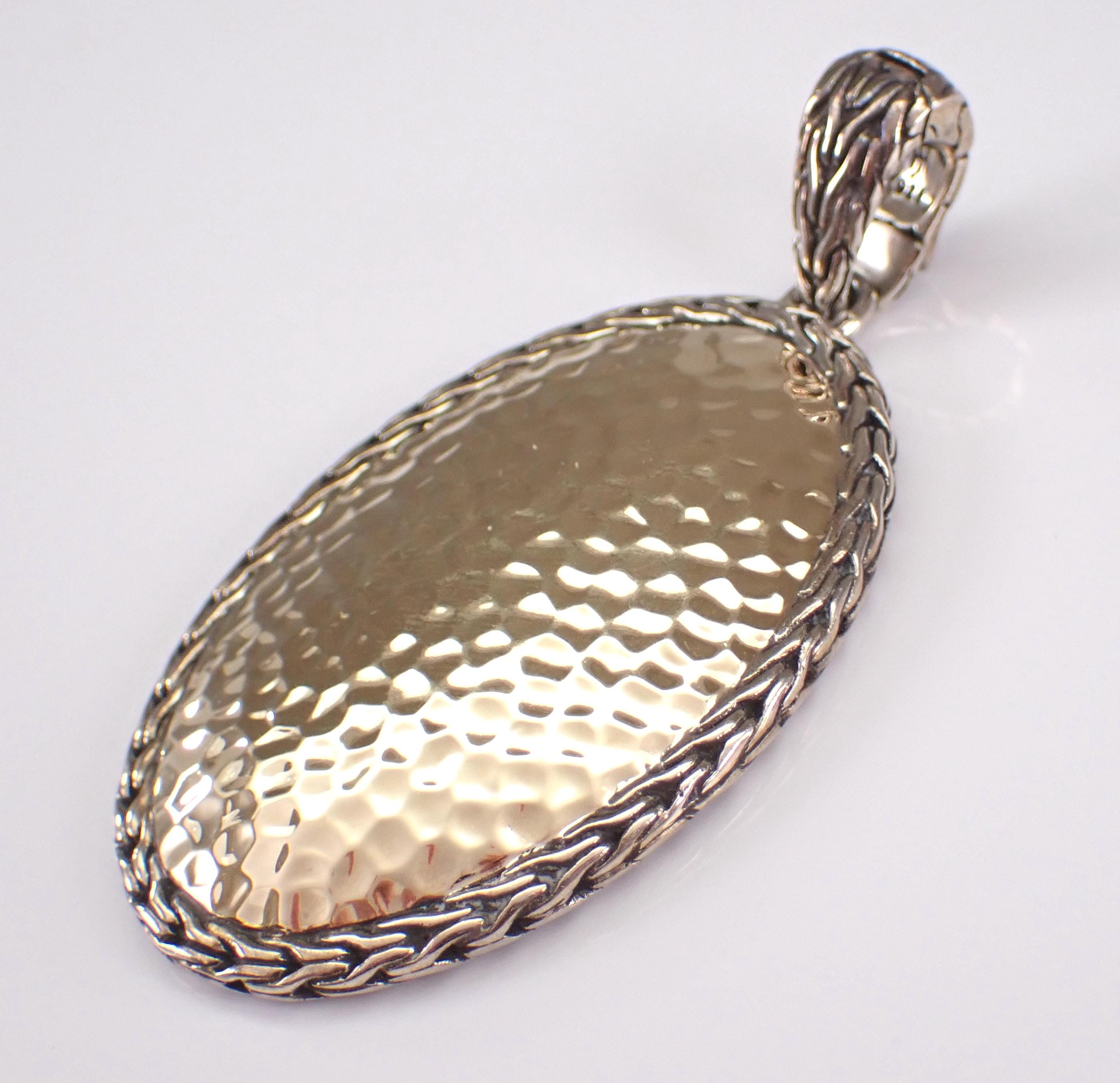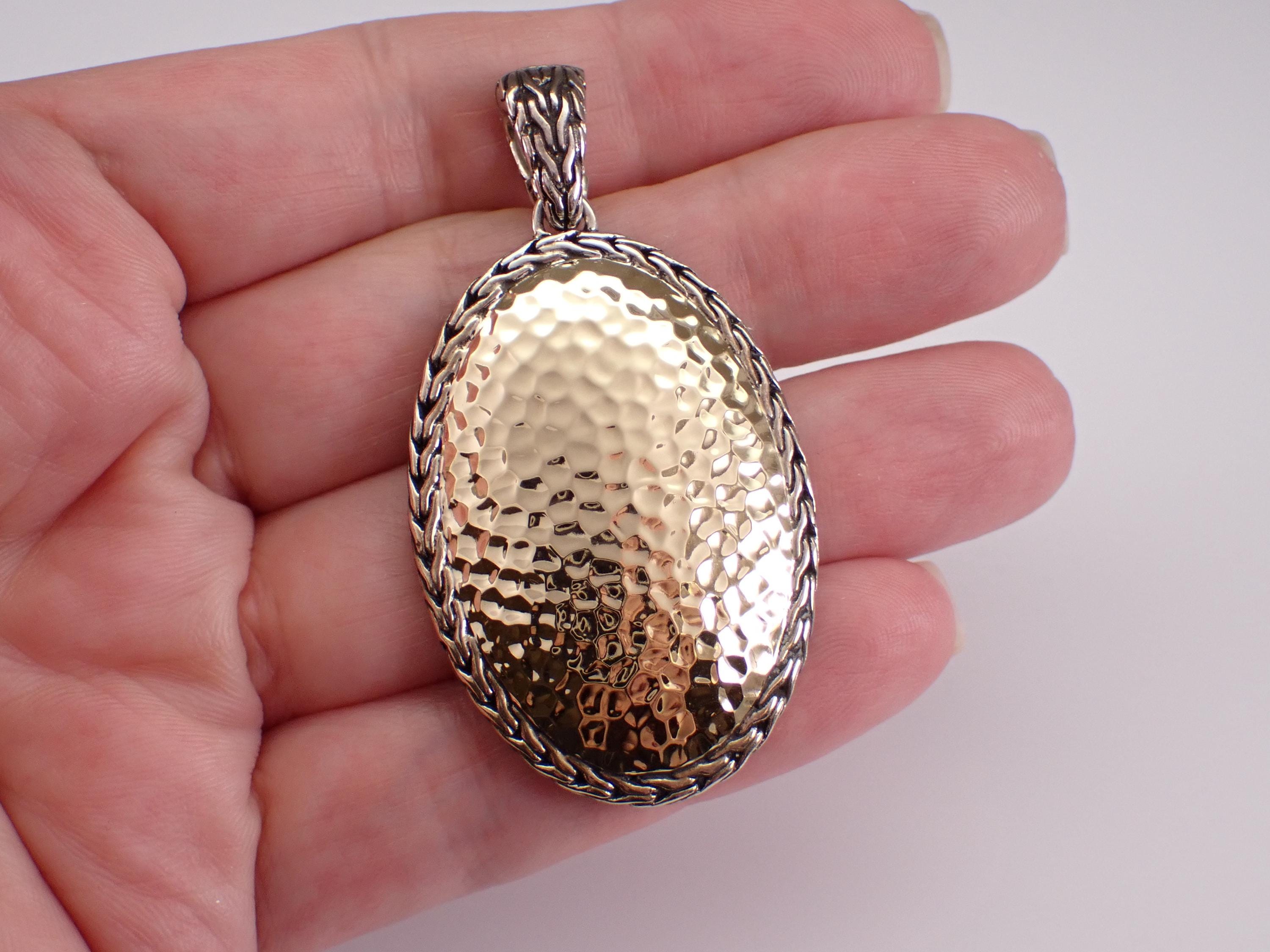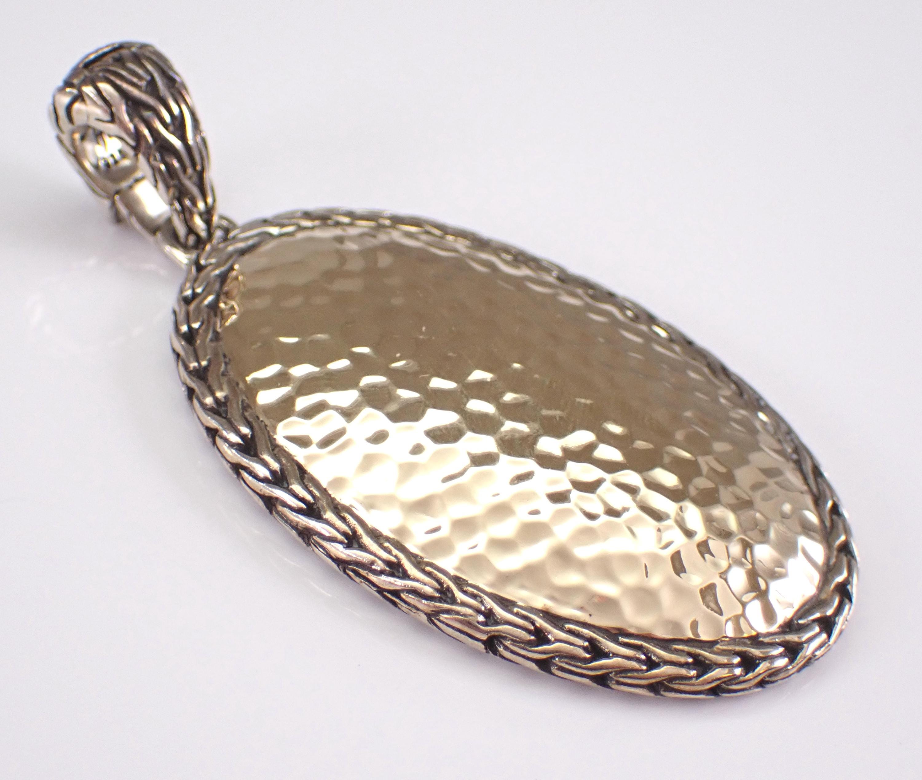 100% Authentic John Hardy 18K yellow gold and sterling silver Palu Dot Hammered Pendant. This pendant is in excellent condition, weighs 19.9 grams and measures 43 X 30 mm. This pendant will be shipped promptly in a gift box (not the original John Hardy box).