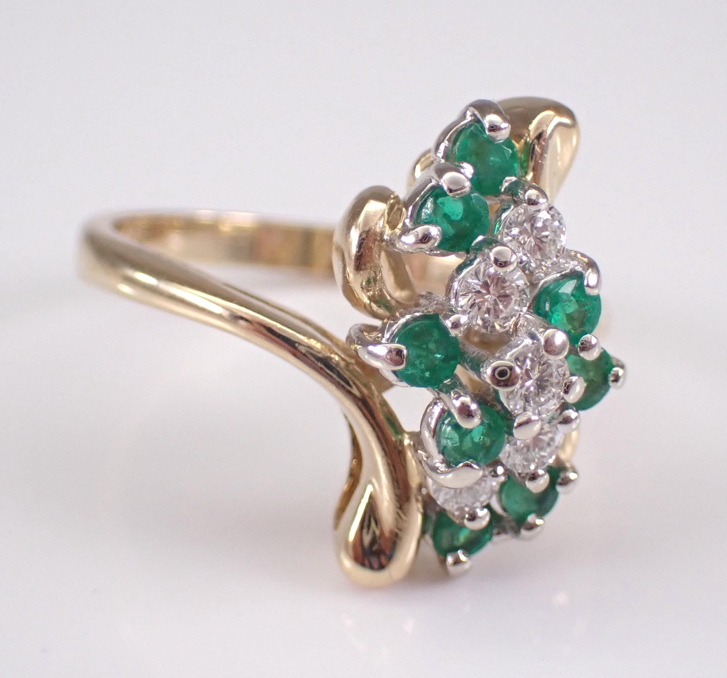 14K Yellow Gold Vintage Diamond and Emerald Ring. This ring is set with eight Round Emeralds and five natural Round Brilliant Diamonds. The emeralds amount to a total weight of .25 carat and the diamonds are F color, VS clarity and weigh a total of .20 carat. This ring is 14KT Yellow Gold, weighs 4.2 grams, measures 16.5 mm along the finger and is a finger size 5 1/4, which can be resized (please inquire about sizing with the finger size you need). This ring will be accompanied by an appraisal by a GIA Certified Diamond Grader with the retail replacement value of $1,495.00. I will ship this ring promptly in a beautiful gift box.
