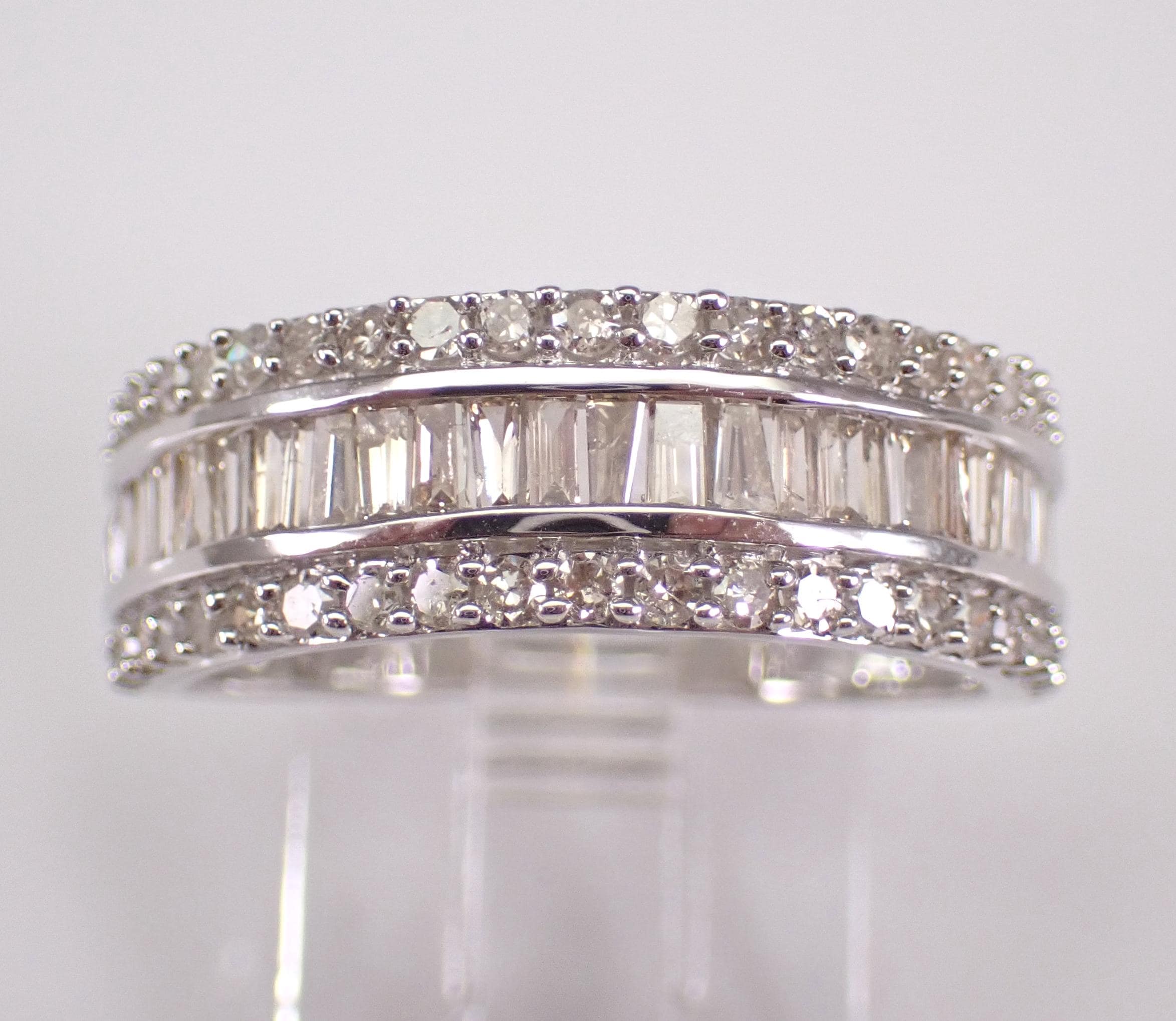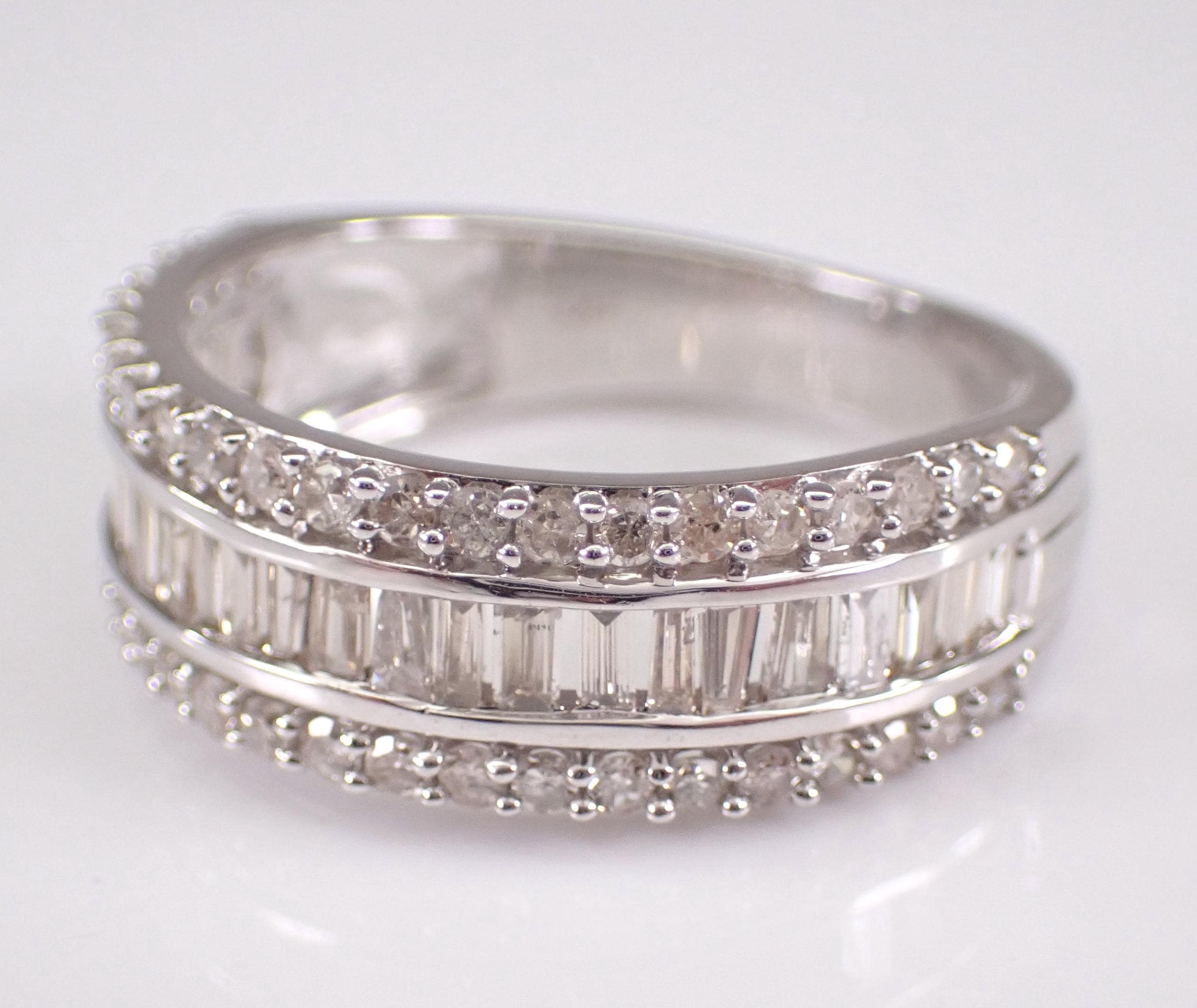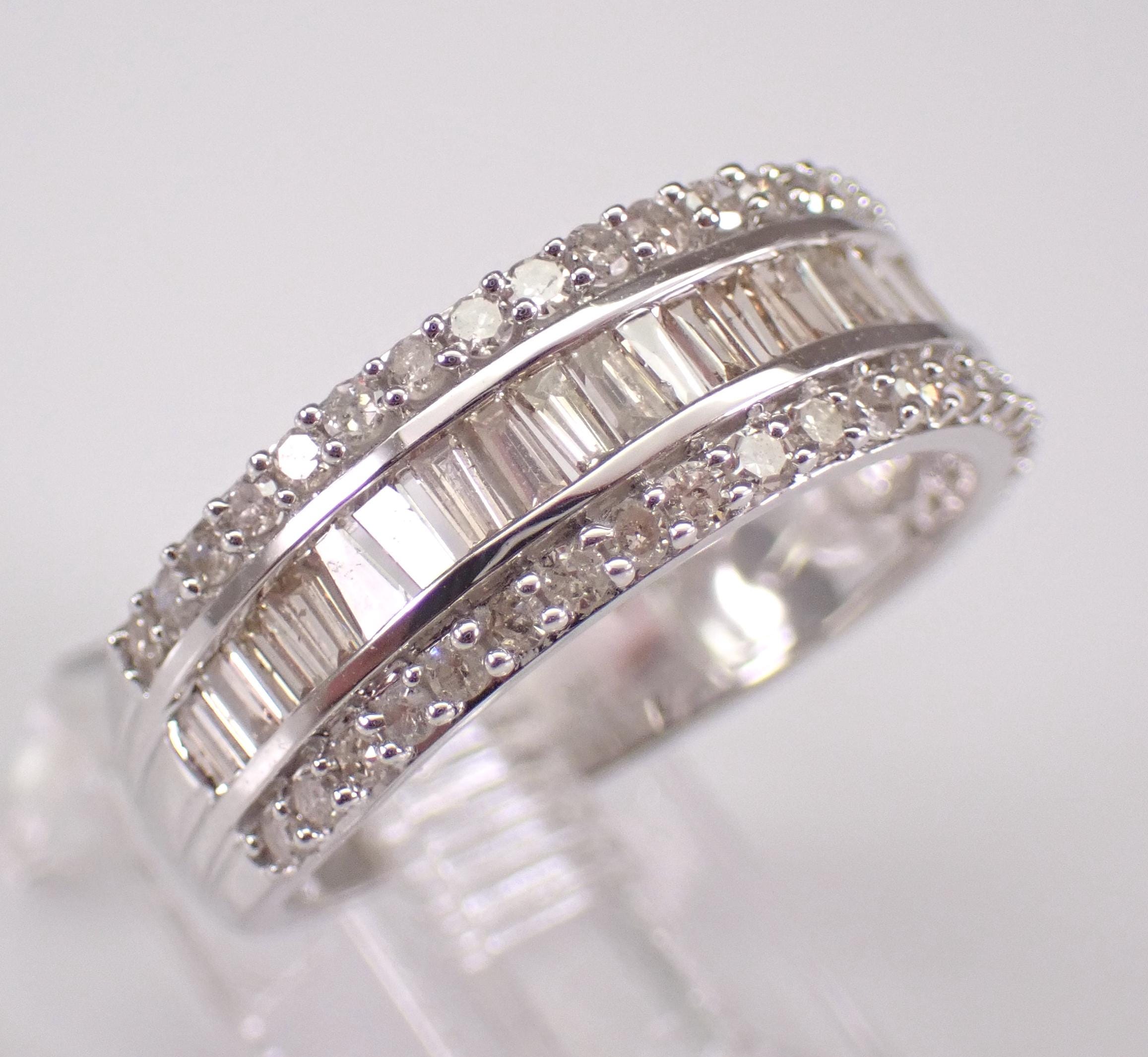 14K White Gold Diamond Wedding Ring Anniversary Band. This ring is set with twenty-five natural Baguette Diamonds and forty-four Round Brilliant Diamonds. These diamonds are J color, I1 clarity and weigh a total of 1.25 carats. This ring is 14K White Gold, weighs 3.9 grams, measures 7 mm in width and is a finger size 7, can be resized free of charge (please inquire about sizing with the finger size you need). This ring will be accompanied by an appraisal written by a GIA Certified Diamond Grader with the retail replacement value of $2,395.00. I will ship this ring promptly in a beautiful gift box.