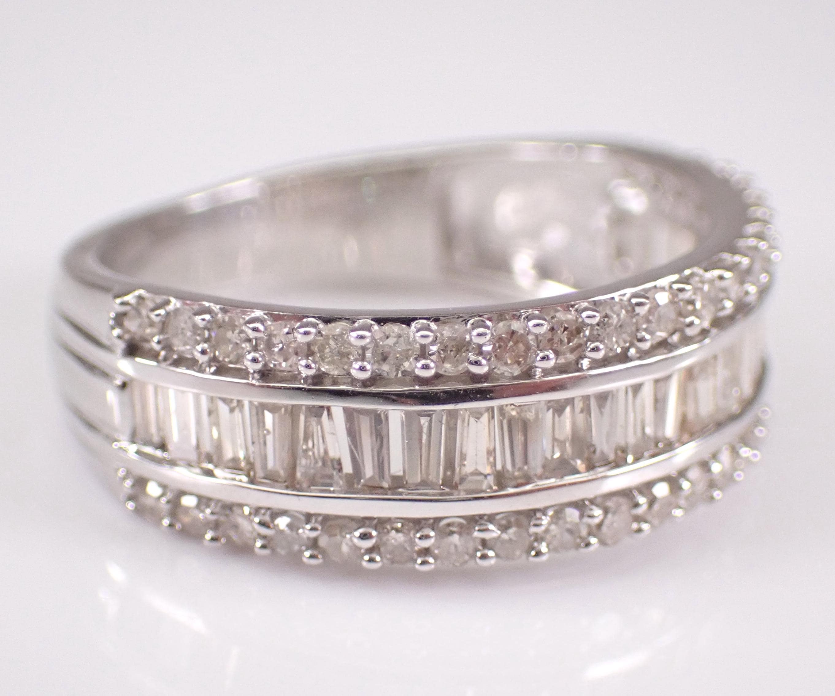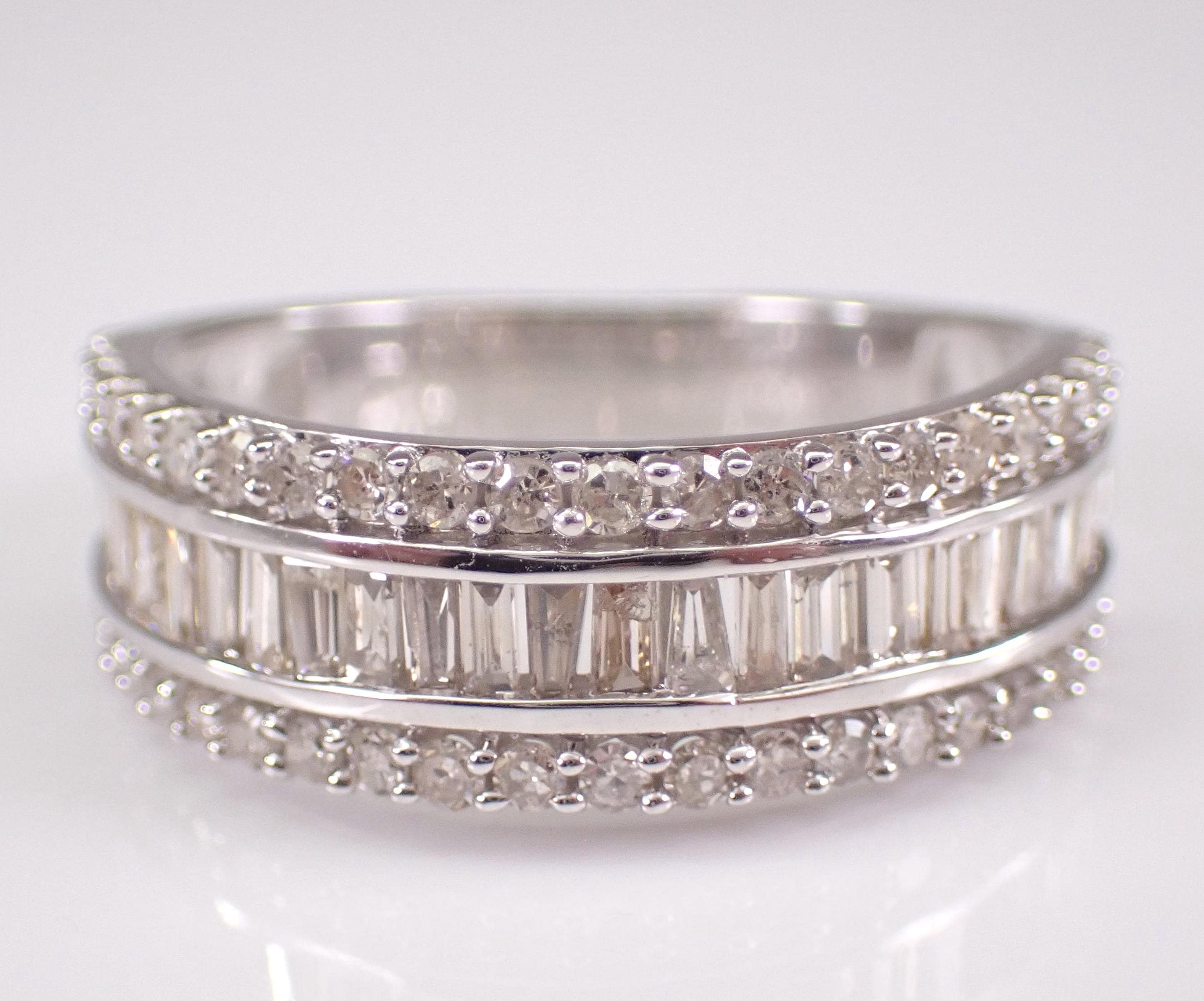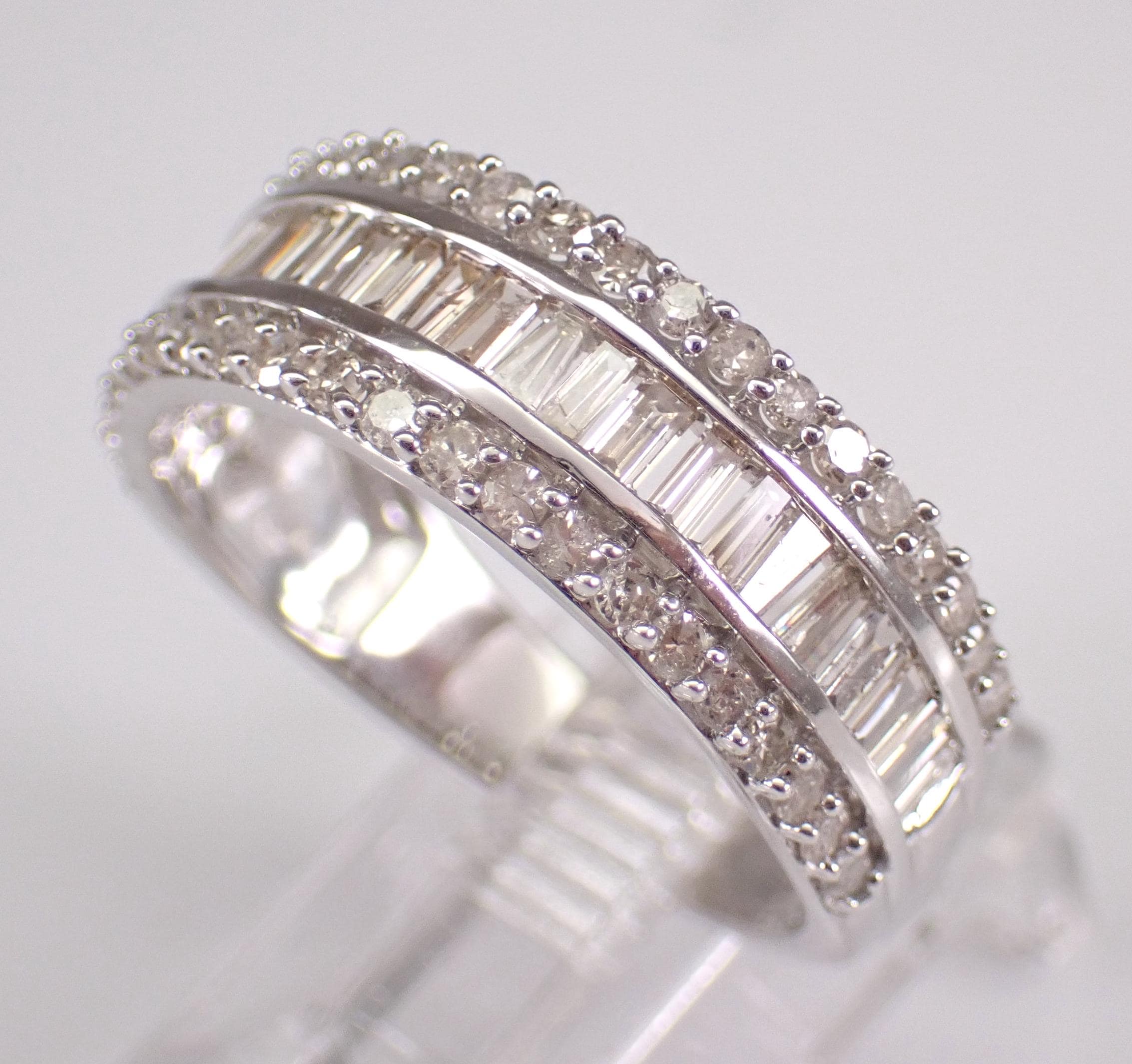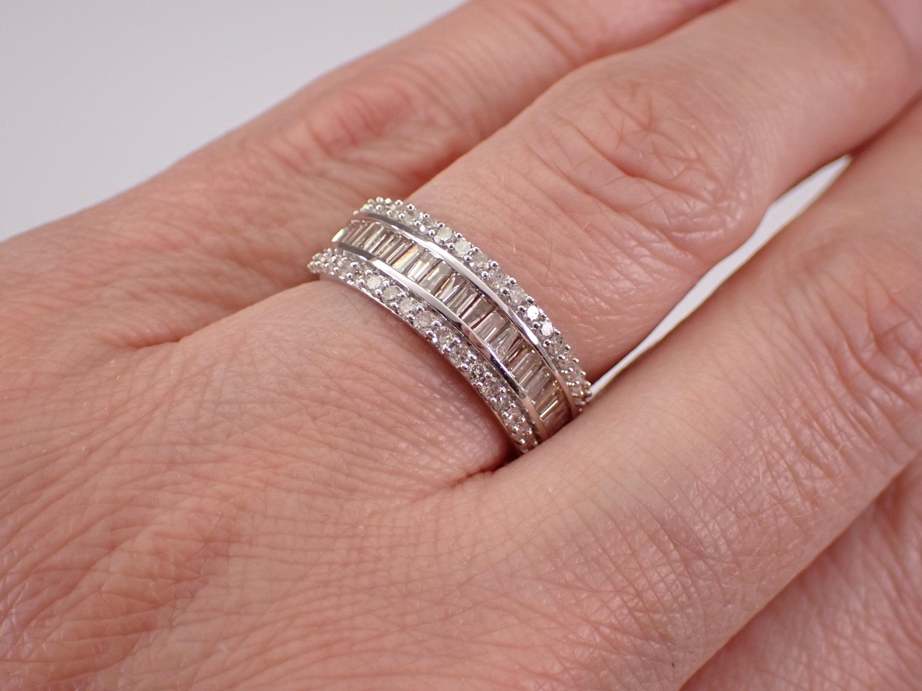 14K White Gold Diamond Wedding Ring Anniversary Band. This ring is set with twenty-five natural Baguette Diamonds and forty-four Round Brilliant Diamonds. These diamonds are J color, I1 clarity and weigh a total of 1.25 carats. This ring is 14K White Gold, weighs 3.9 grams, measures 7 mm in width and is a finger size 7, can be resized free of charge (please inquire about sizing with the finger size you need). This ring will be accompanied by an appraisal written by a GIA Certified Diamond Grader with the retail replacement value of $2,395.00. I will ship this ring promptly in a beautiful gift box.