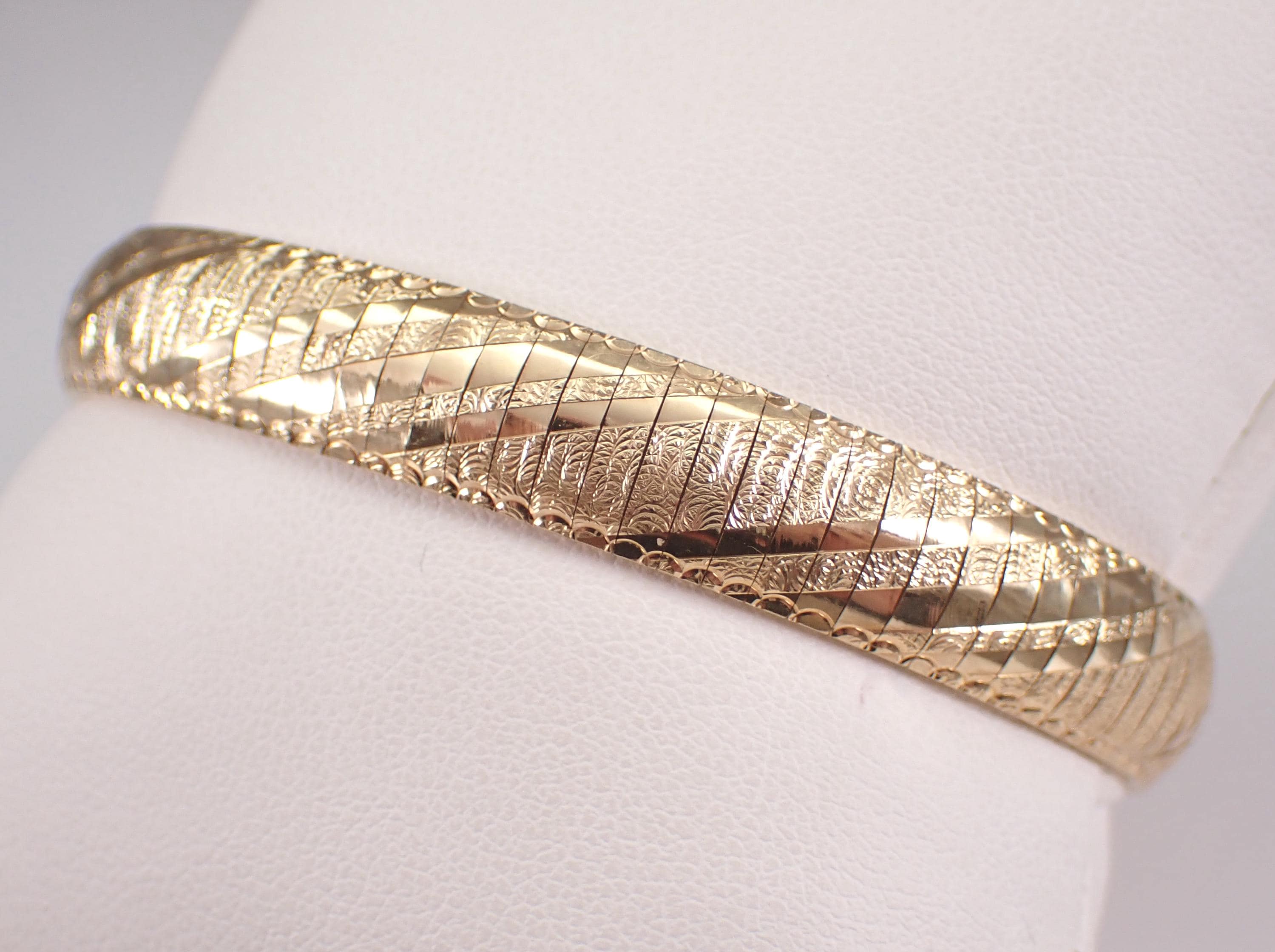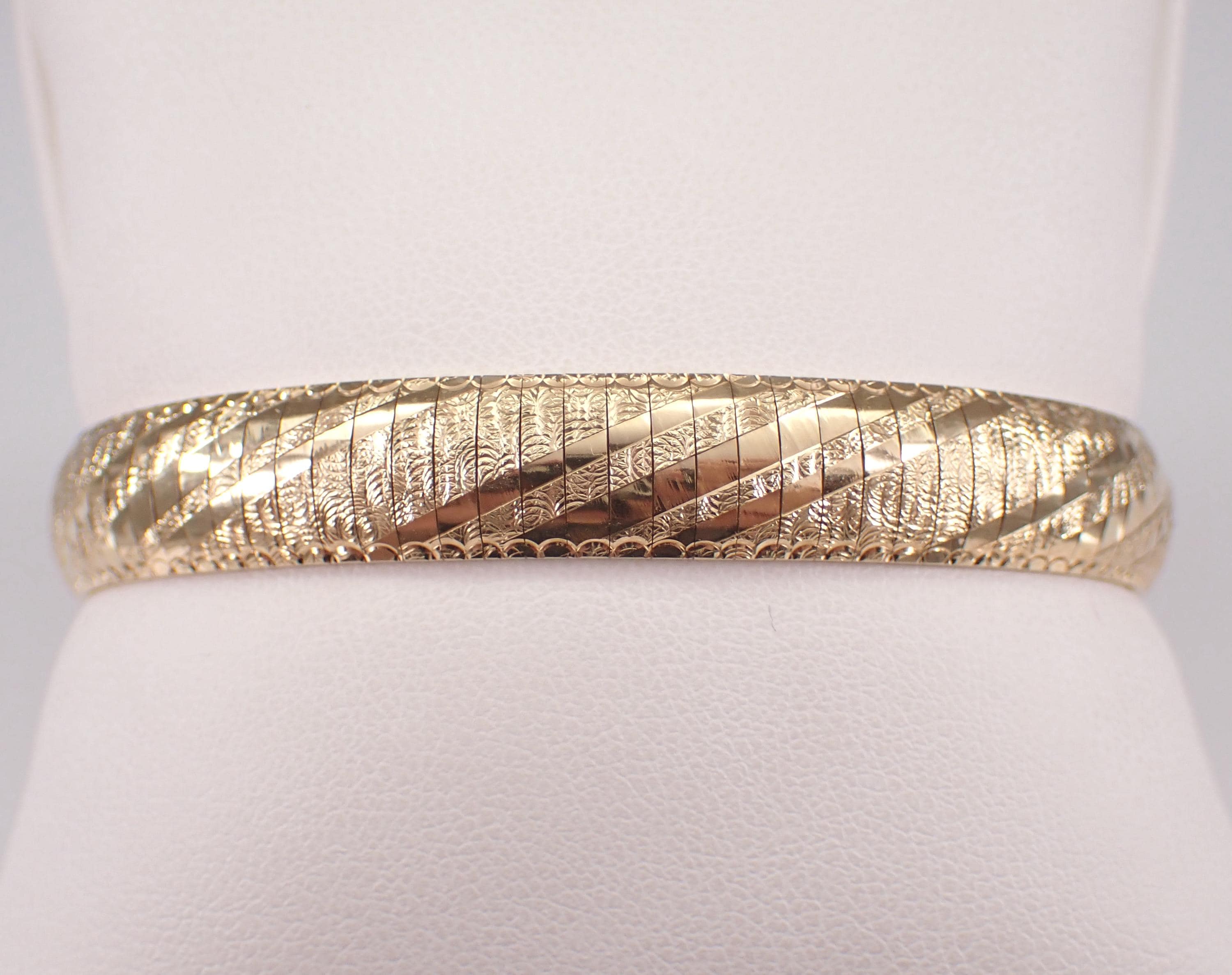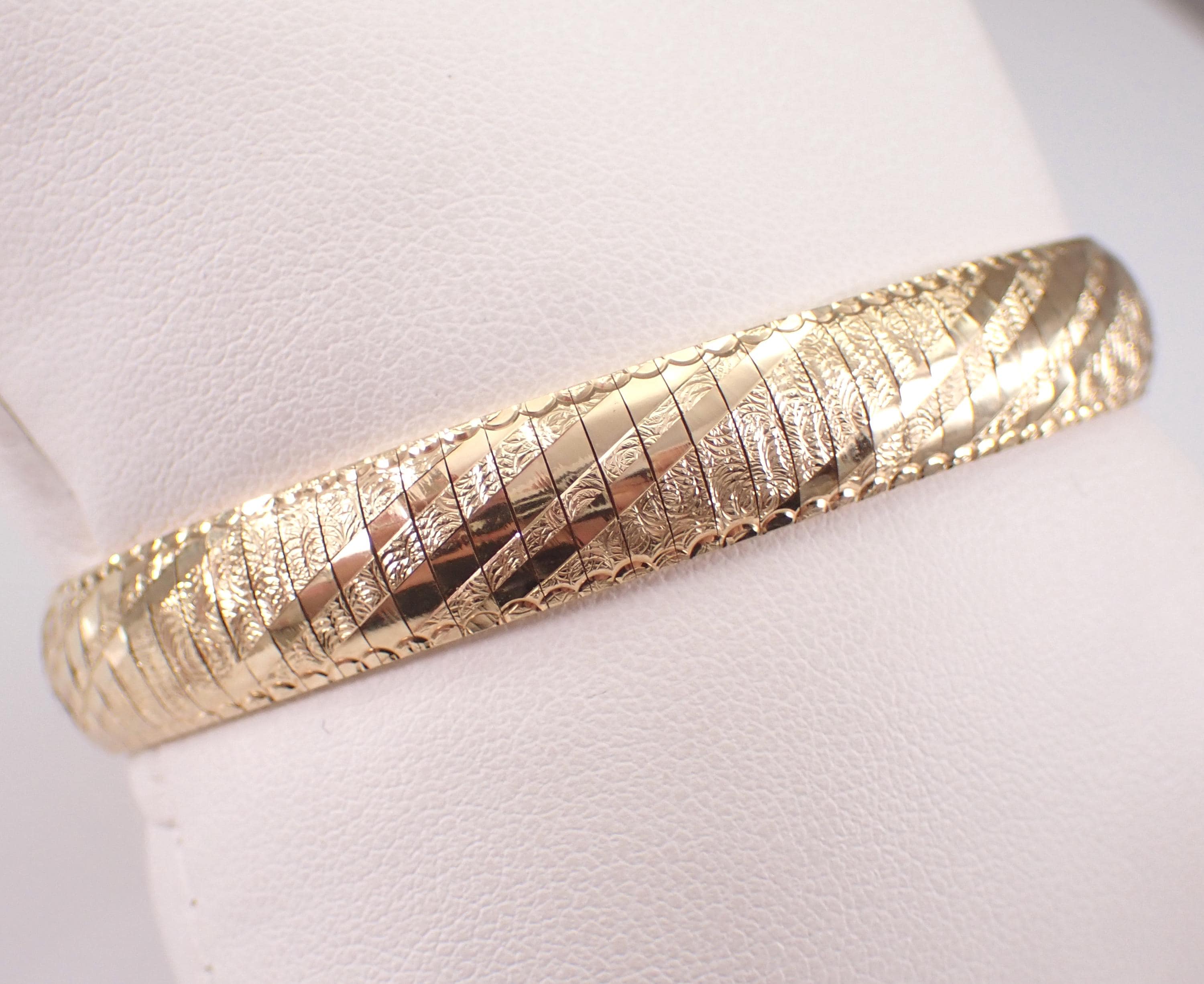 Vintage Estate 14K Yellow Gold Flexible Bangle Bracelet. This bracelet weighs 15.5 grams, measures 9 mm in width and fits a lady's wrist (measures 7" in length). This bracelet will be accompanied by an appraisal for insurance and authentication purposes. I will ship this bracelet promptly in a gift box.