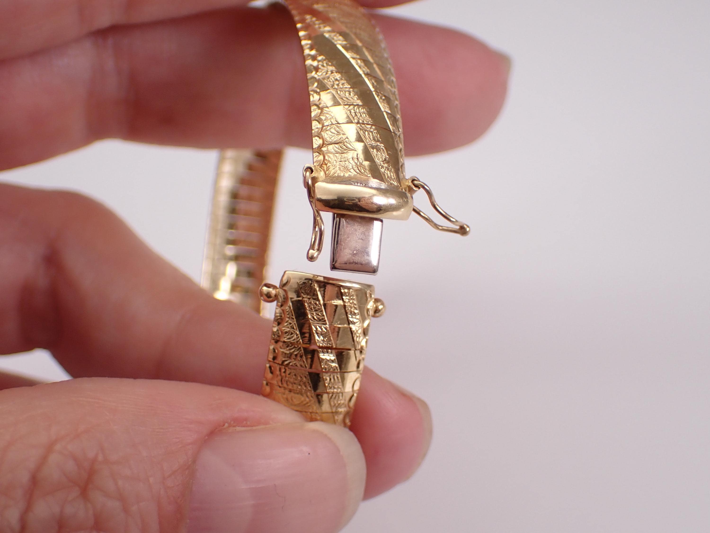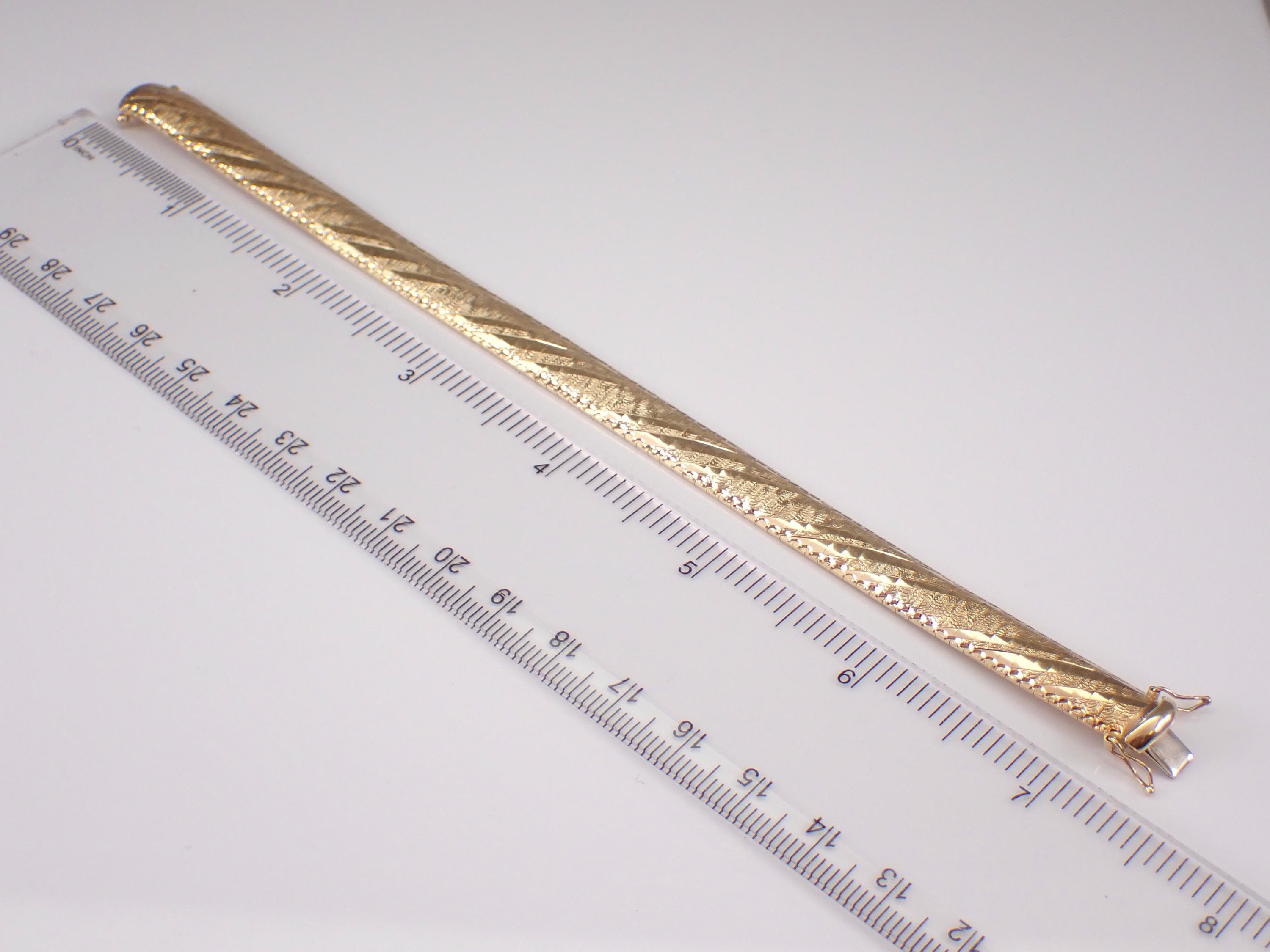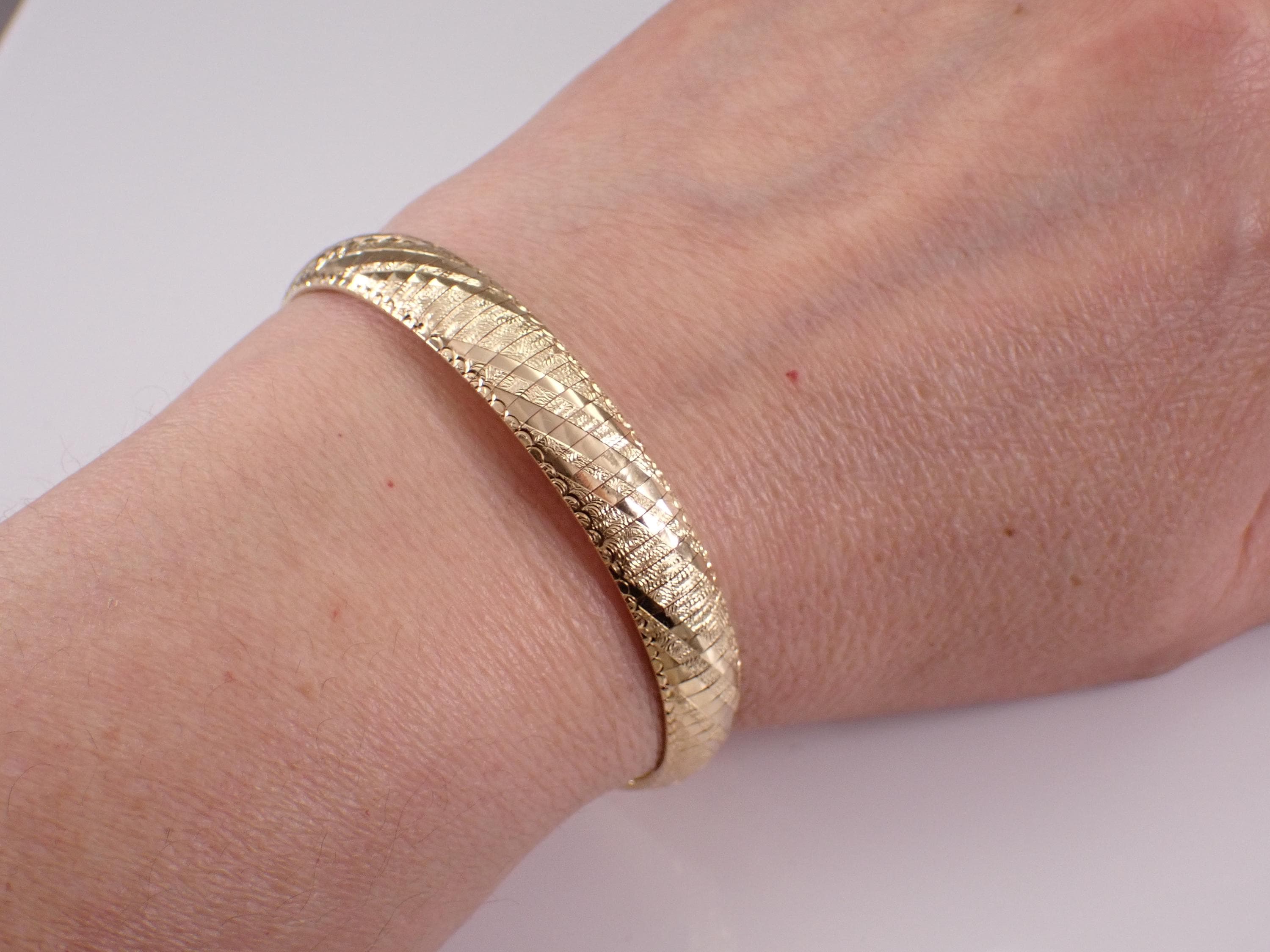 Vintage Estate 14K Yellow Gold Flexible Bangle Bracelet. This bracelet weighs 15.5 grams, measures 9 mm in width and fits a lady's wrist (measures 7" in length). This bracelet will be accompanied by an appraisal for insurance and authentication purposes. I will ship this bracelet promptly in a gift box.