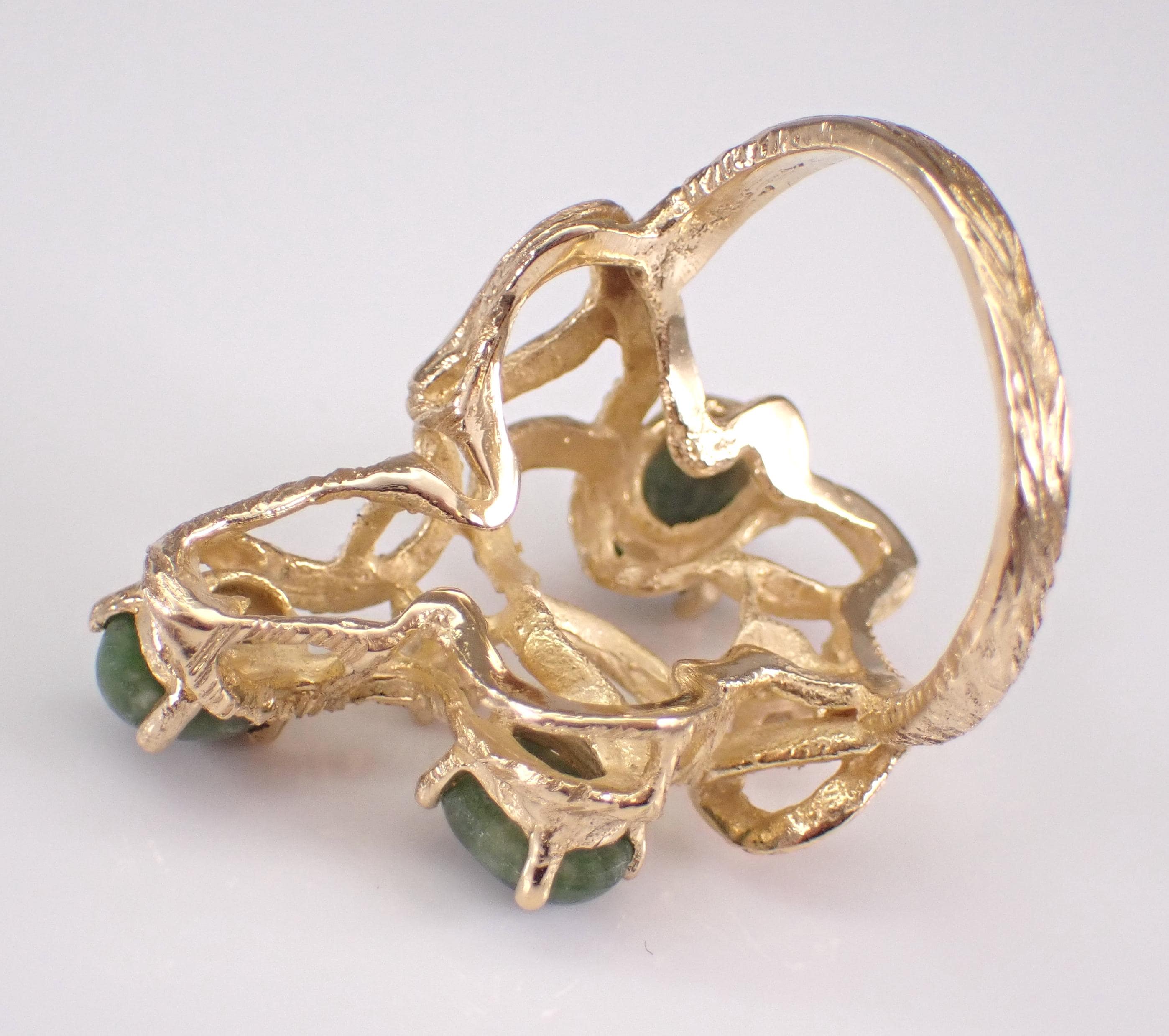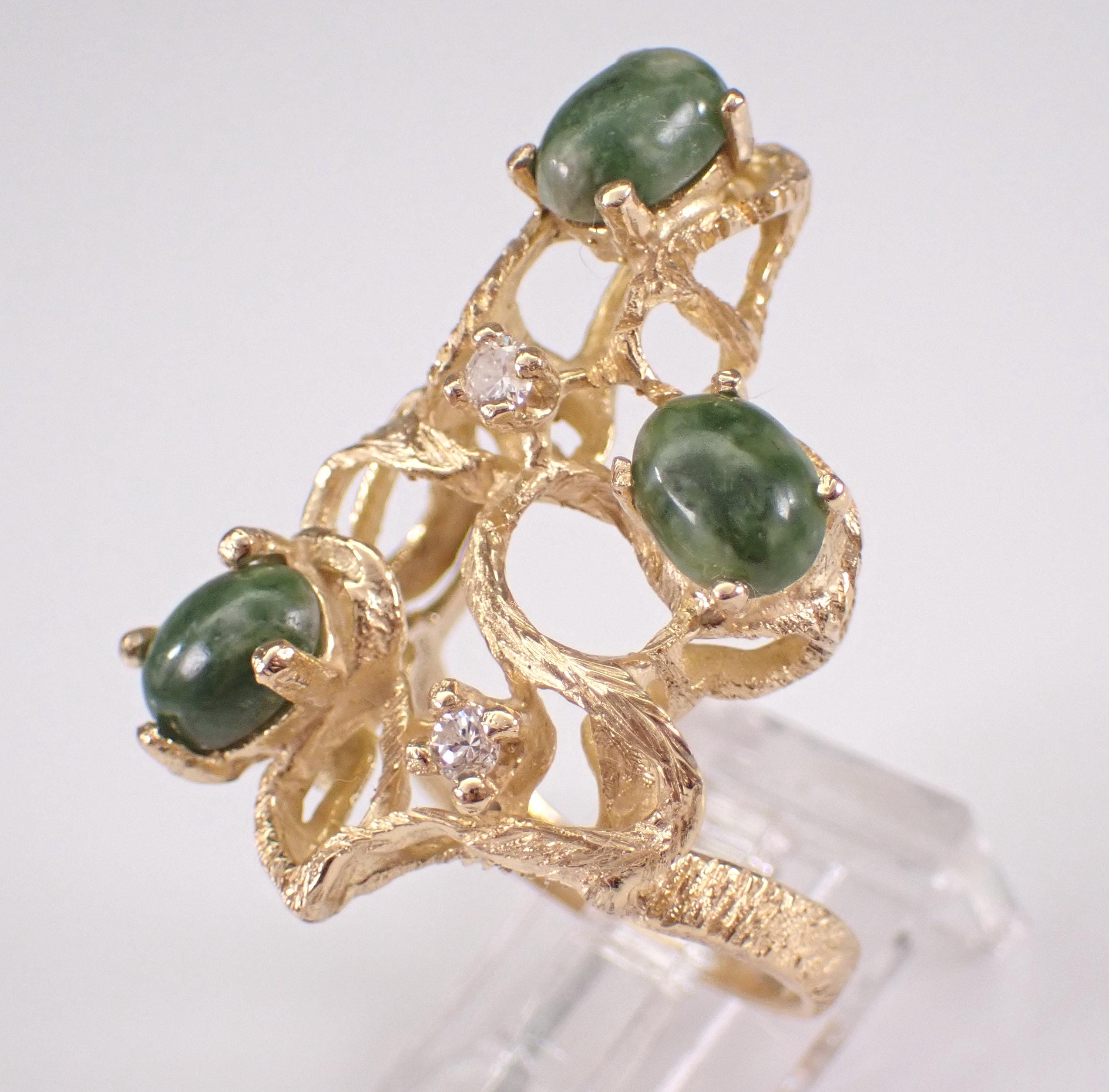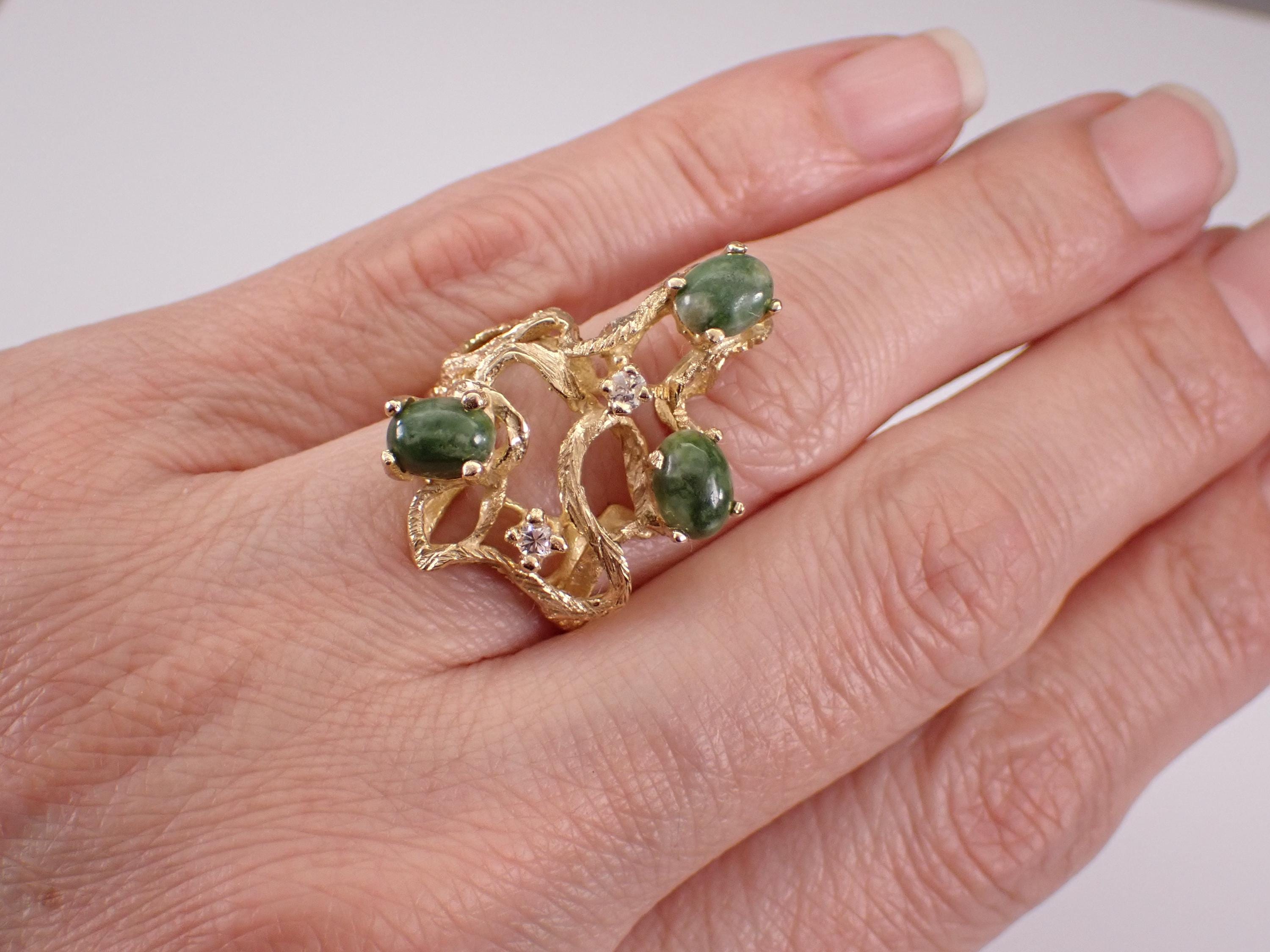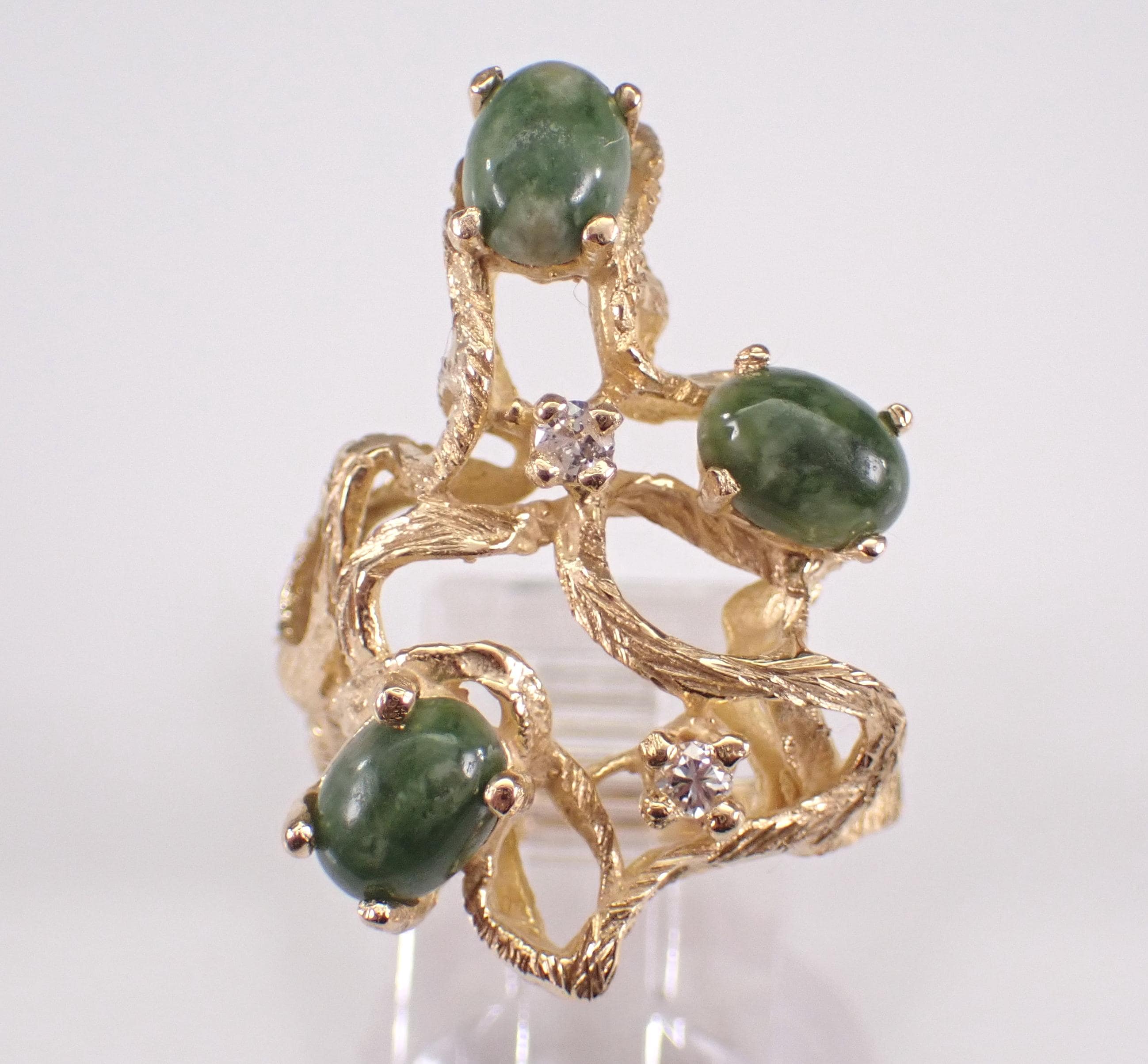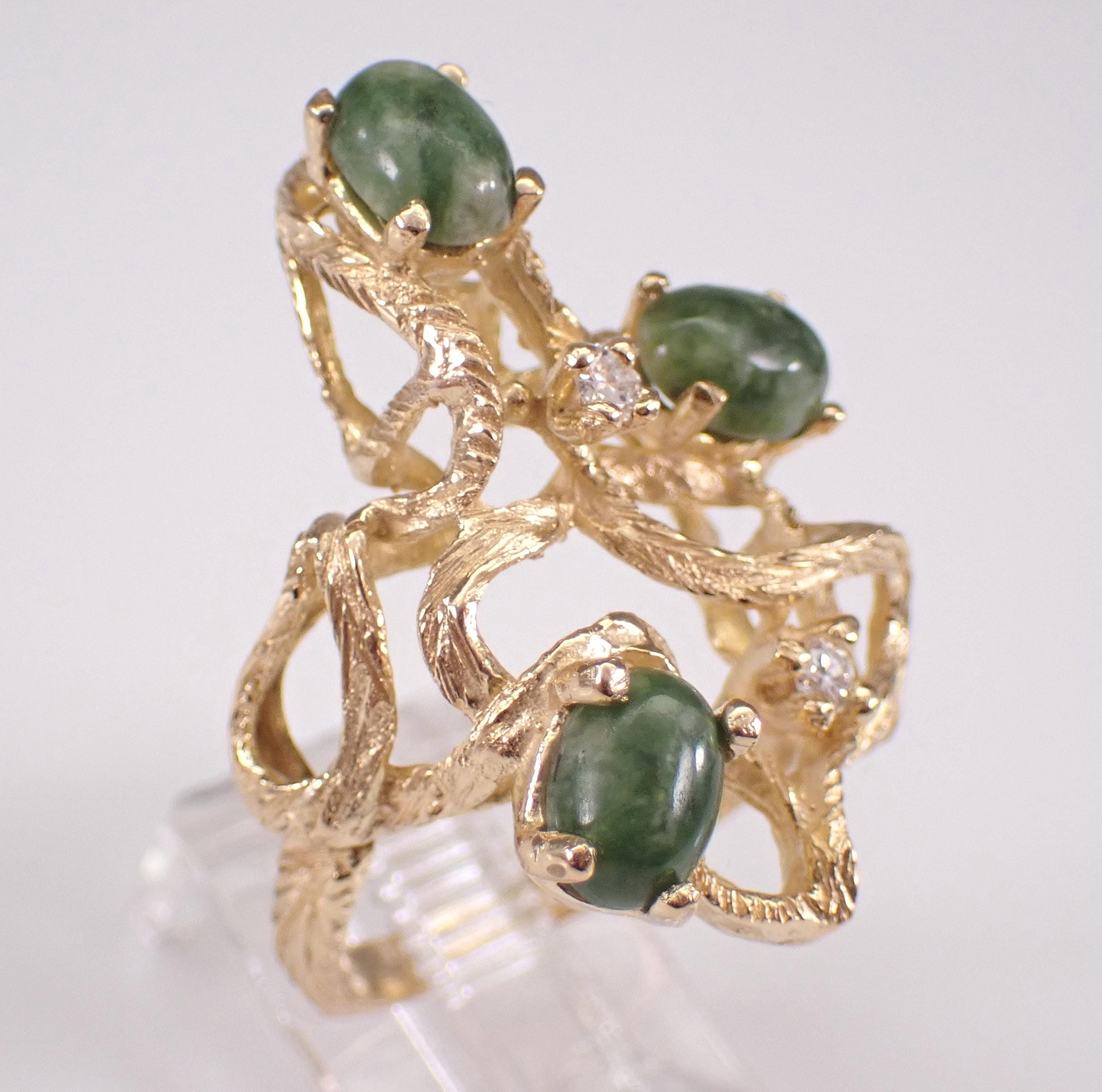 14K Yellow Gold Vintage Diamond and Jade Ring. This ring is set with three Oval Jade and two natural Round Diamonds. The Jade measure 7 X 5 mm each and the diamonds are F color, VS clarity and weigh a total of .10 carat. This ring is 14KT Solid Yellow Gold, weighs 7.6 grams, measures 30 mm along the finger and is a finger size 6 1/2, which can be resized (please inquire about sizing with the finger size you need). This ring will be accompanied by an appraisal for insurance and authentication purposes. I will ship this ring promptly in a beautiful gift box.