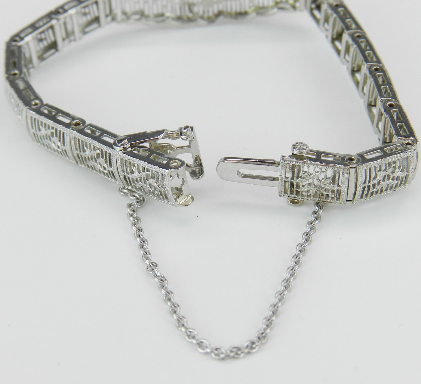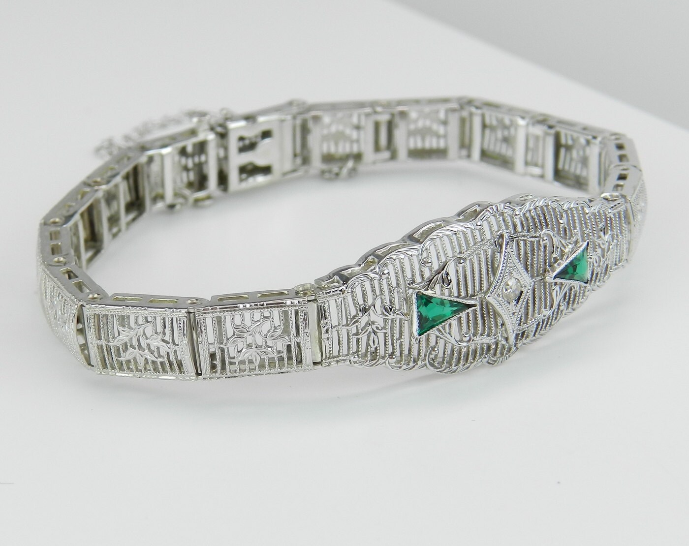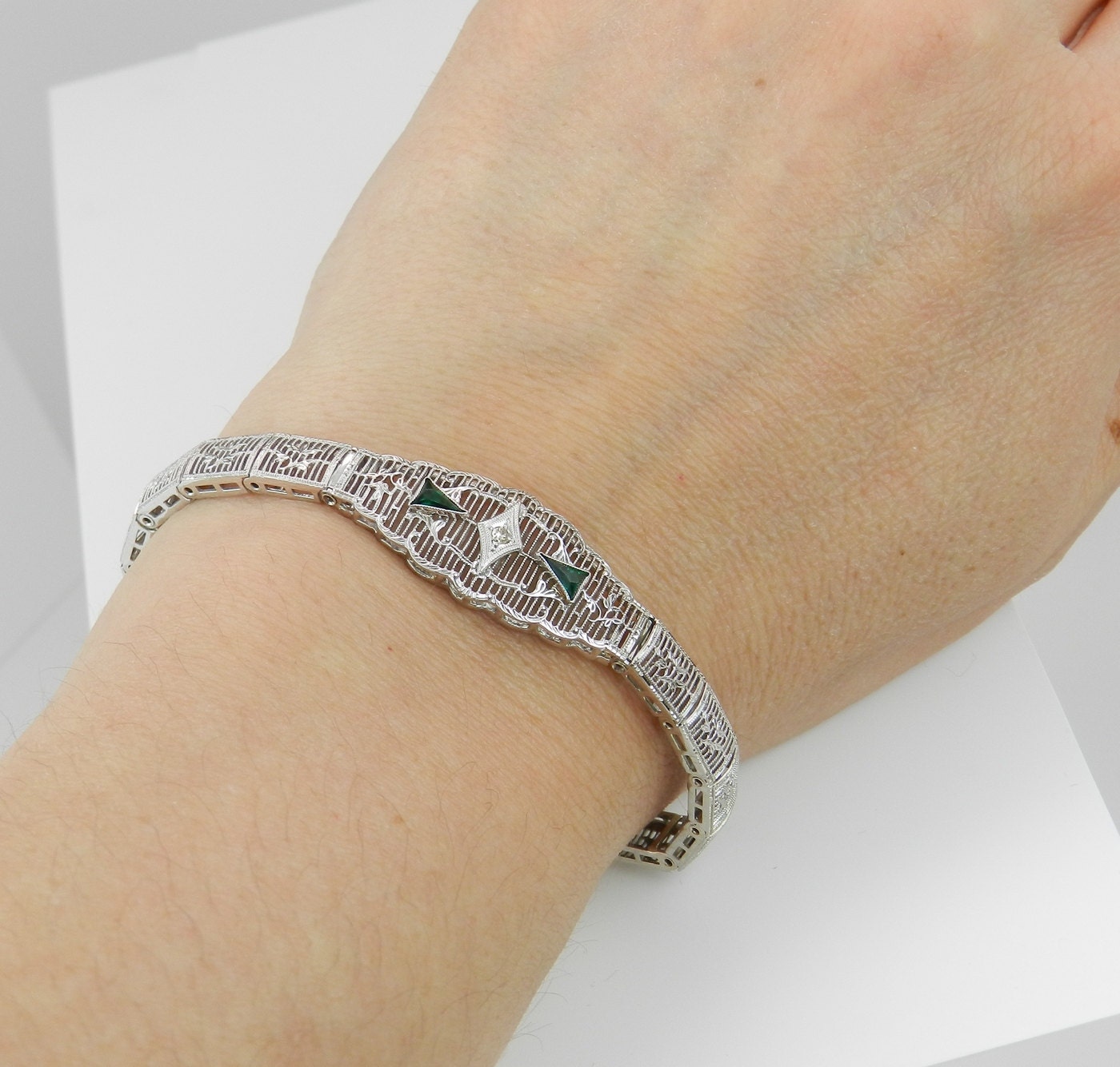 Antique Art Deco 10K White Gold Filigree Diamond and Emerald Bracelet. This bracelet is set with one genuine round diamond and two trillion green emeralds. These Emeralds are a brilliant green color, are NOT Natural, but are original to the bracelet. The diamond in this bracelet is H color, SI clarity and weighs .05 carat. The bracelet is 10 KT White Gold, has a very unique filigree design, weighs 9.1 grams and measures 6 1/4" in length. The centerpiece of the bracelet measures 13 mm in width, the rest of the bracelet measures 6 mm in width. This bracelet dates back to Circa 1920's and will be accompanied by an appraisal by a GIA Certified Diamond Grader with the retail replacement value of $2,295.00. I will ship this bracelet promptly in a gift box.