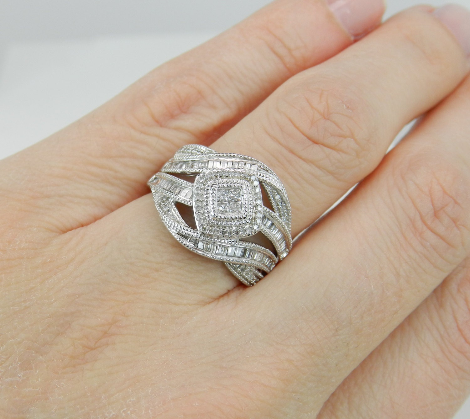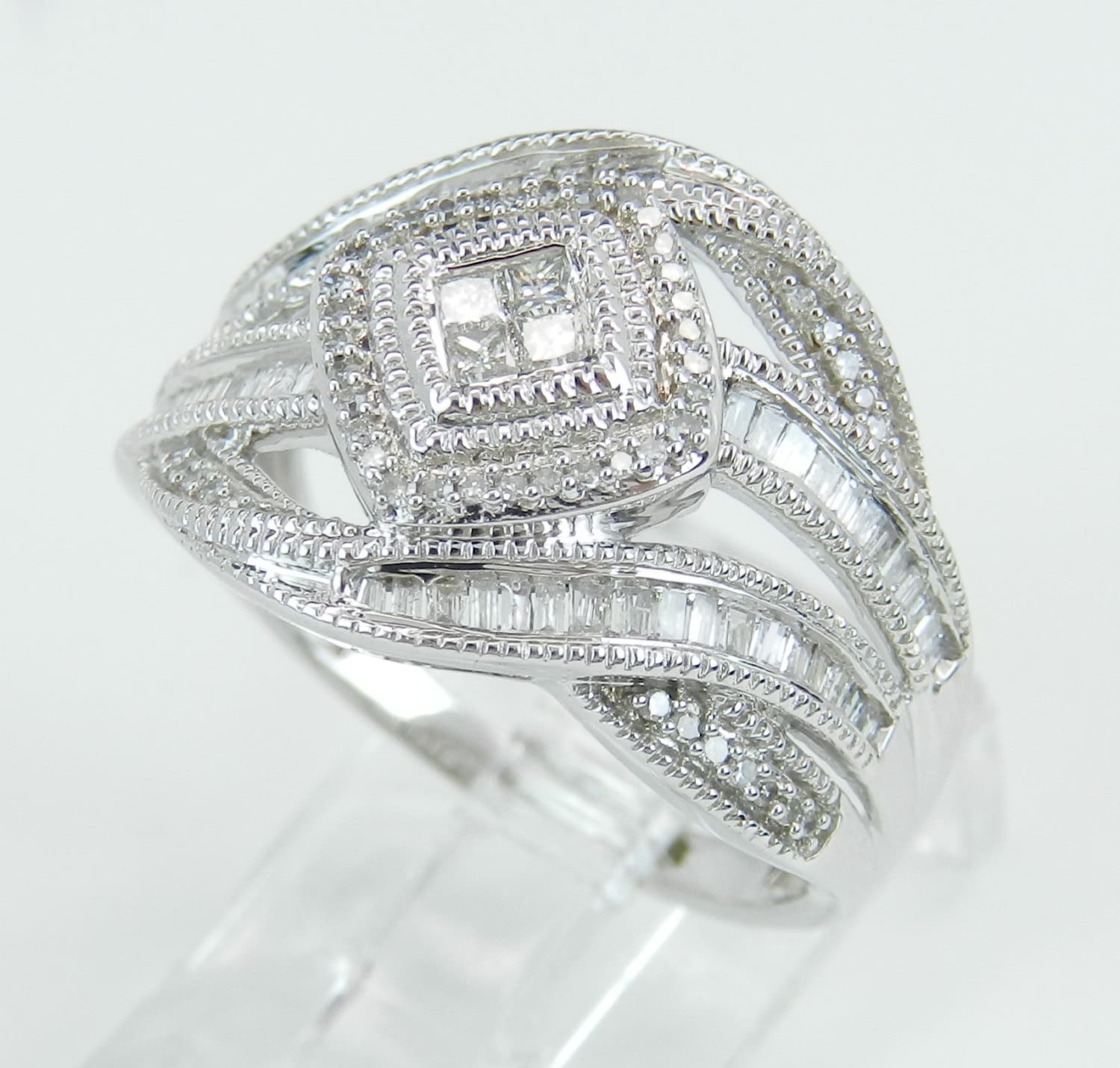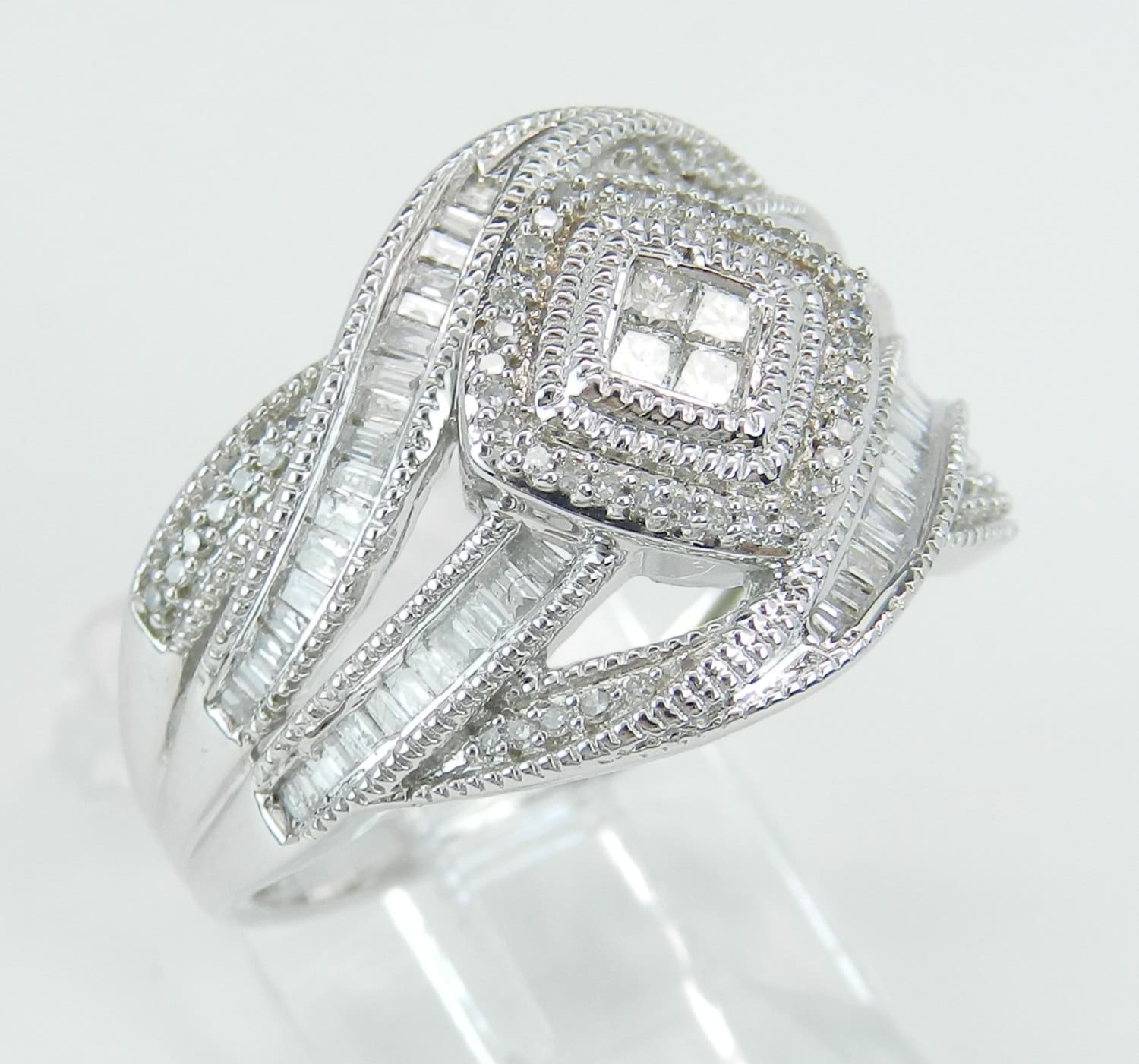 10K White Gold Diamond Cluster Ring Crossover Multi Row Anniversary Band. This ring is set with fifty-six (56) genuine round brilliant diamonds, four Princess Cut Diamonds and fifty-eight (58) baguette diamonds. Theses diamonds are H color, I1 in clarity and weigh a total of .75 carat. This ring is 10KT White Gold, weighs 4.4 grams, measures 14 mm in width and is a finger size 7 1/4, can be slightly resized (please inquire about sizing with the finger size you need). This ring will be accompanied by an appraisal written by a GIA Certified Diamond Grader with the retail replacement value of $1,695.00. I will ship this ring promptly in a beautiful gift box.