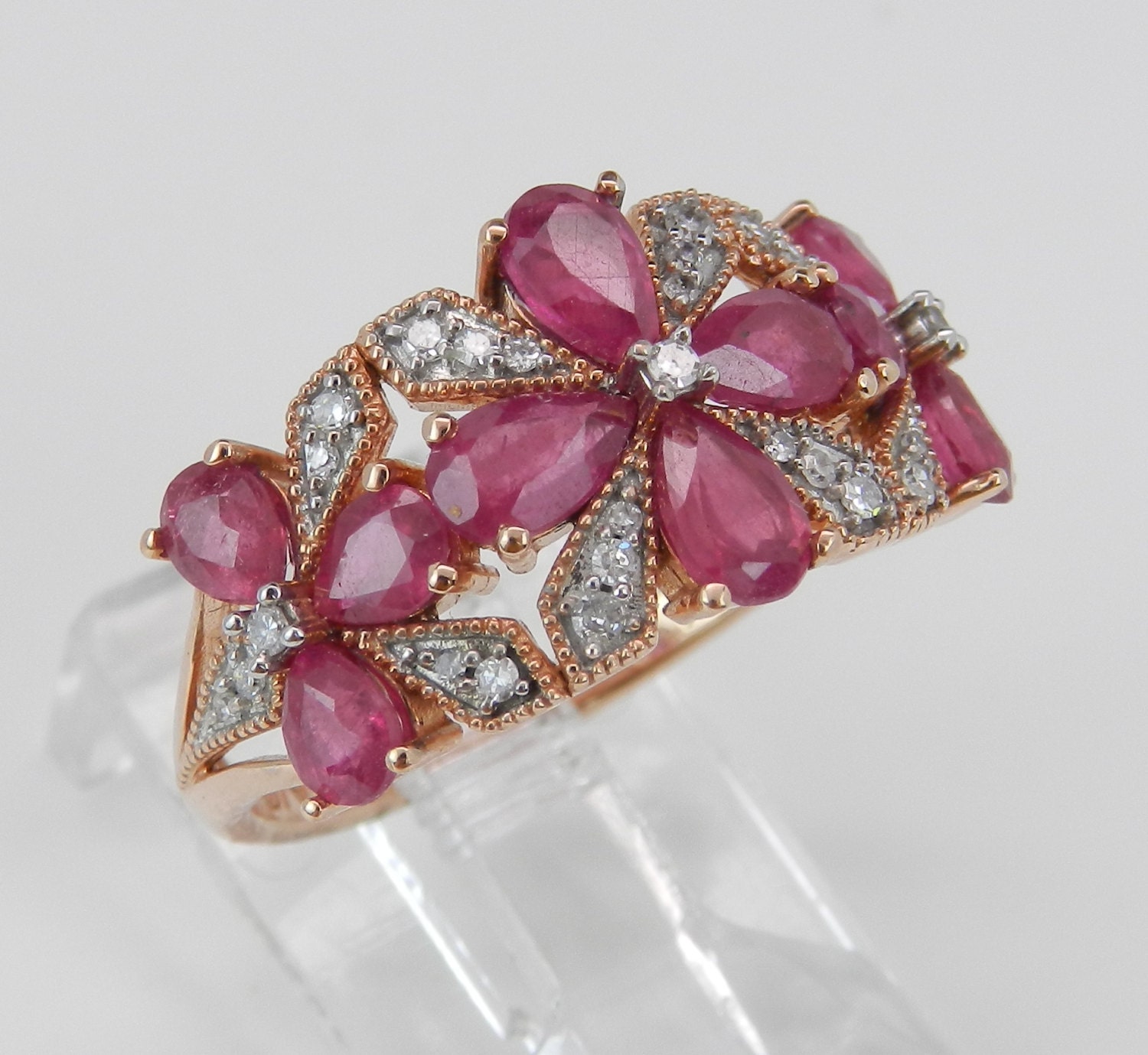 14K Rose Gold Diamond and Ruby Flower Wedding Ring Anniversary Band. This ring is set with twenty-seven natural round diamonds and ten genuine Pear shaped Rubies. These diamonds are H color, SI/I clarity and weigh a total of .25 carat. The Rubies amount to a total weight of 1 1/2 carats. The ring is 14 KT Rose Gold, weighs 3.9 grams, measures 10 mm in width and is a finger size 7, which can be sized (please inquire about sizing with the finger size you need). This ring will be accompanied by an appraisal by a GIA Certified Diamond Grader with the retail replacement value of $1,469.00. I will ship this ring promptly in a gift box.