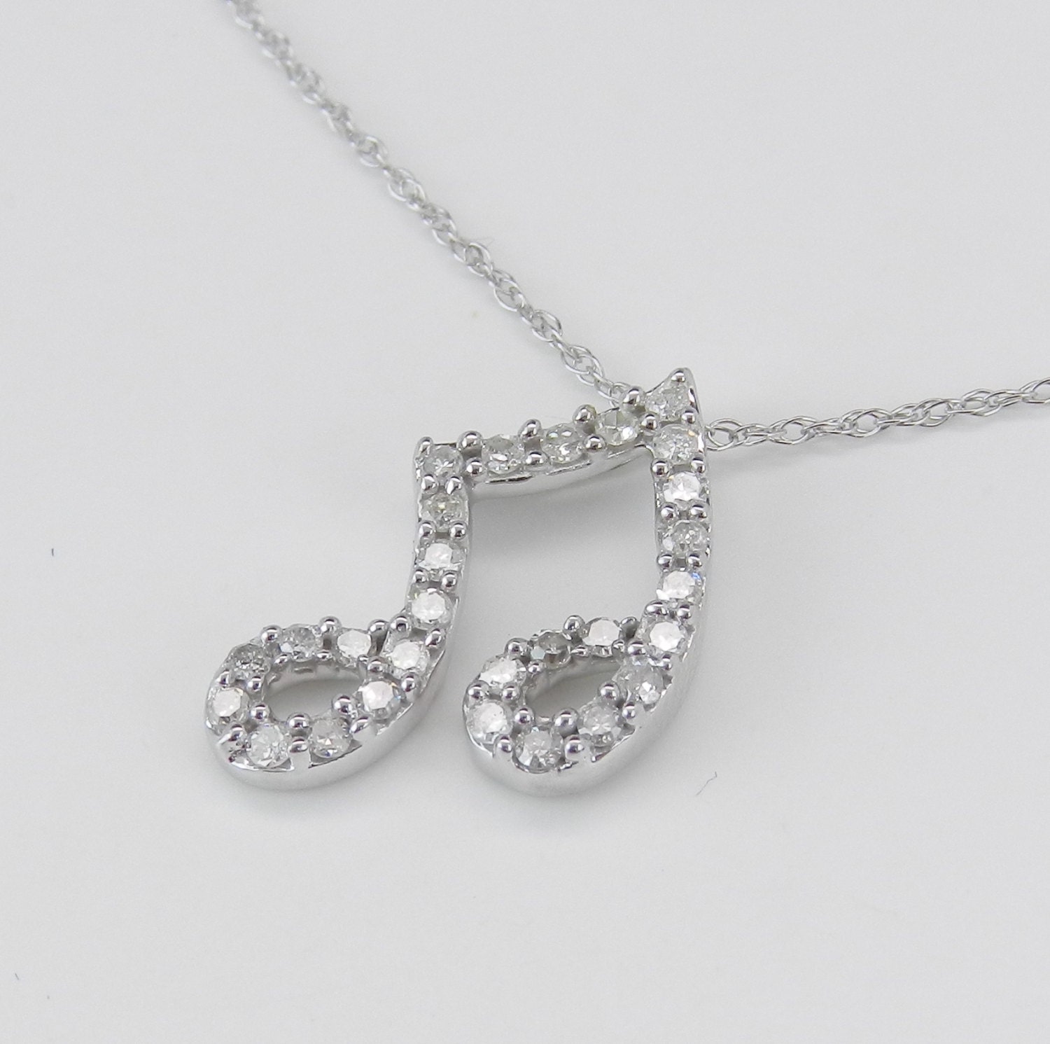 White Gold Round Diamond Music Note Pendant Necklace Chain. This pendant is set with twenty-eight genuine natural round diamonds. These diamonds are H color, I1 clarity and weigh a total of .30 carat. This pendant is 10KT White Gold and comes with an 18" 10KT White Gold chain. Both the pendant and chain weigh a total of 1.4 grams. The charm measures 13 X 12 mm. This necklace will be accompanied by an appraisal written by a GIA Certified Diamond Grader with the retail replacement value of $965.00. I will ship this necklace promptly in a beautiful gift box.