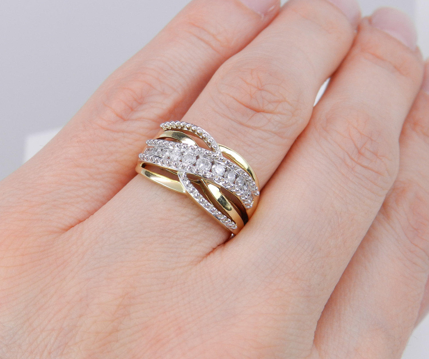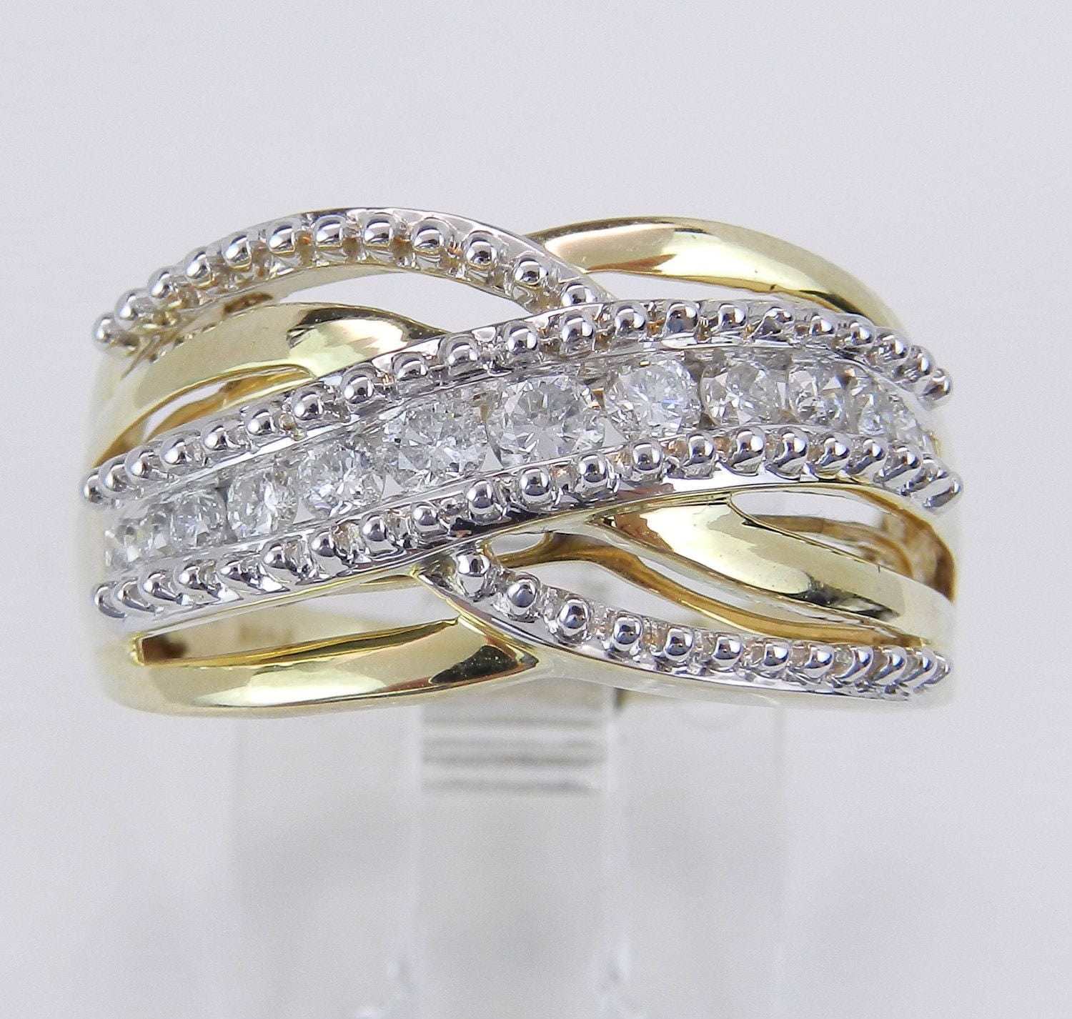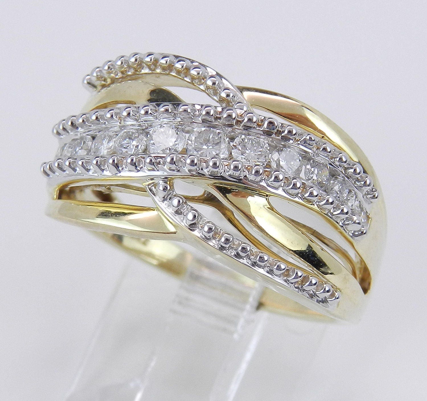 14K Yellow Gold Diamond Crossover Wedding Ring Anniversary Band. This ring is set with thirteen Round Brilliant Diamonds. These diamonds are H color, I1 clarity and weigh a total of 1/2 carat. This ring weighs 3.4 grams and measures 10.5 mm in width and is a finger size 7, which can be resized (please inquire about sizing with the finger size you need). This ring will be accompanied by an appraisal by a GIA Certified Diamond Grader with the retail replacement value of $1,745.00. I will ship this ring promptly in a gift box.