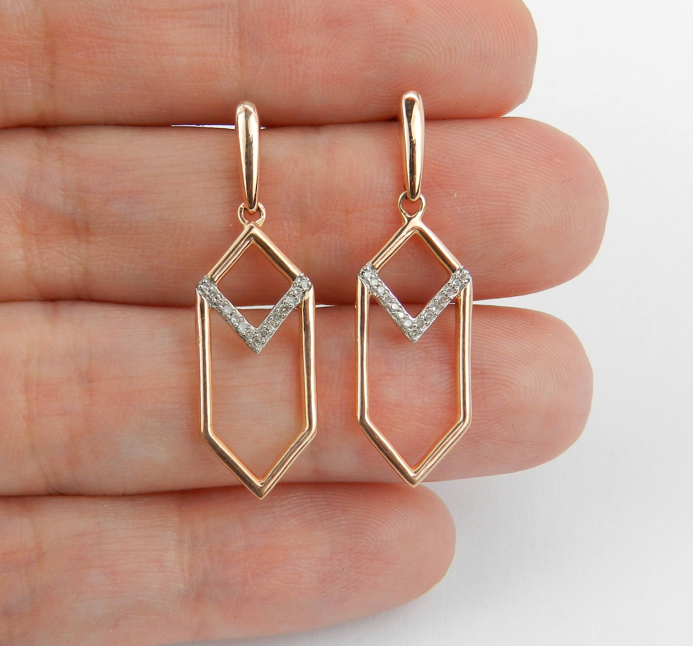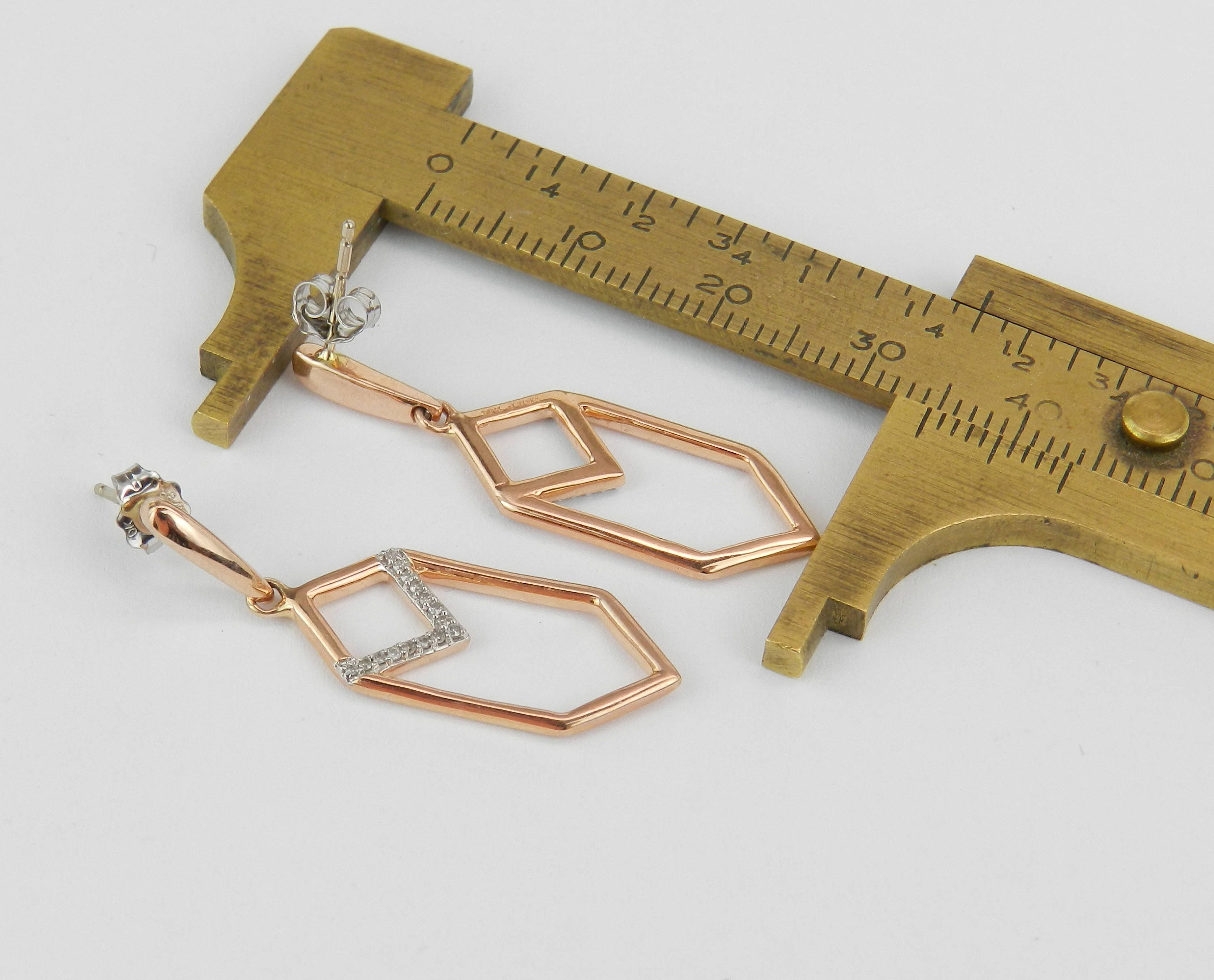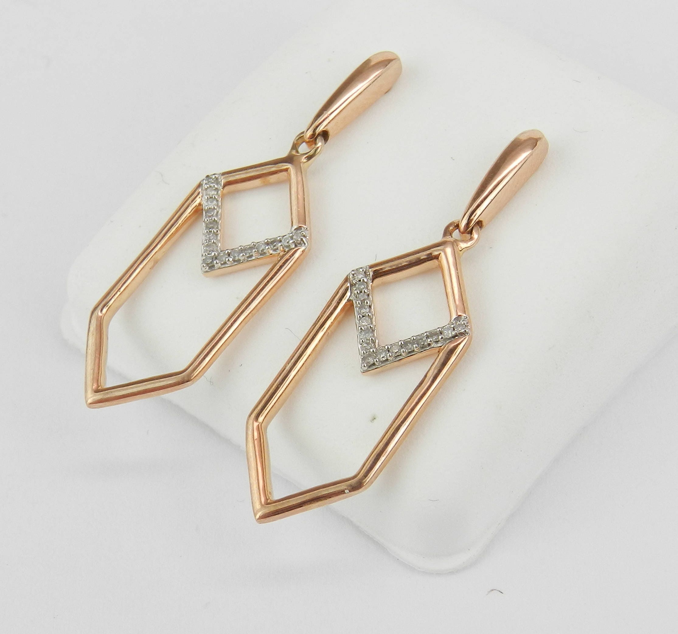 Rose Gold Diamond Dangle Drop Earrings. There are thirty genuine Round Brilliant Diamonds set in these earrings. These diamonds are H color, SI/I clarity and weigh a total of .20 carat. These earrings are 10KT Rose Gold, measure 34 mm in length, 10 mm in width and weigh a total of 3.6 grams. These earrings are for pierced ears and have a friction back posts. These earrings will be accompanied by an appraisal written by a GIA Certified Diamond Grader with the retail replacement value of $1,289.00. I will ship these earrings promptly in a gift box.