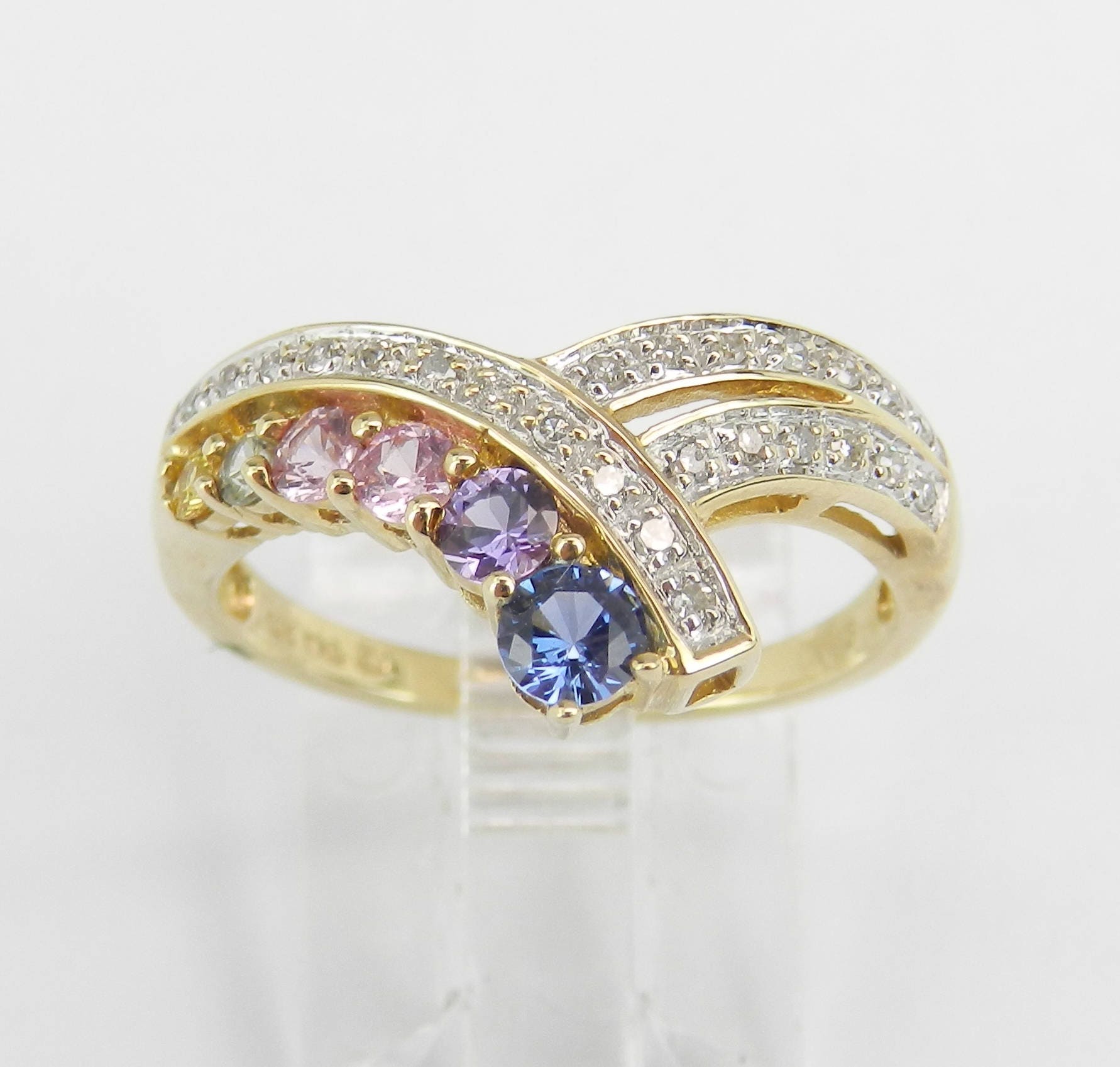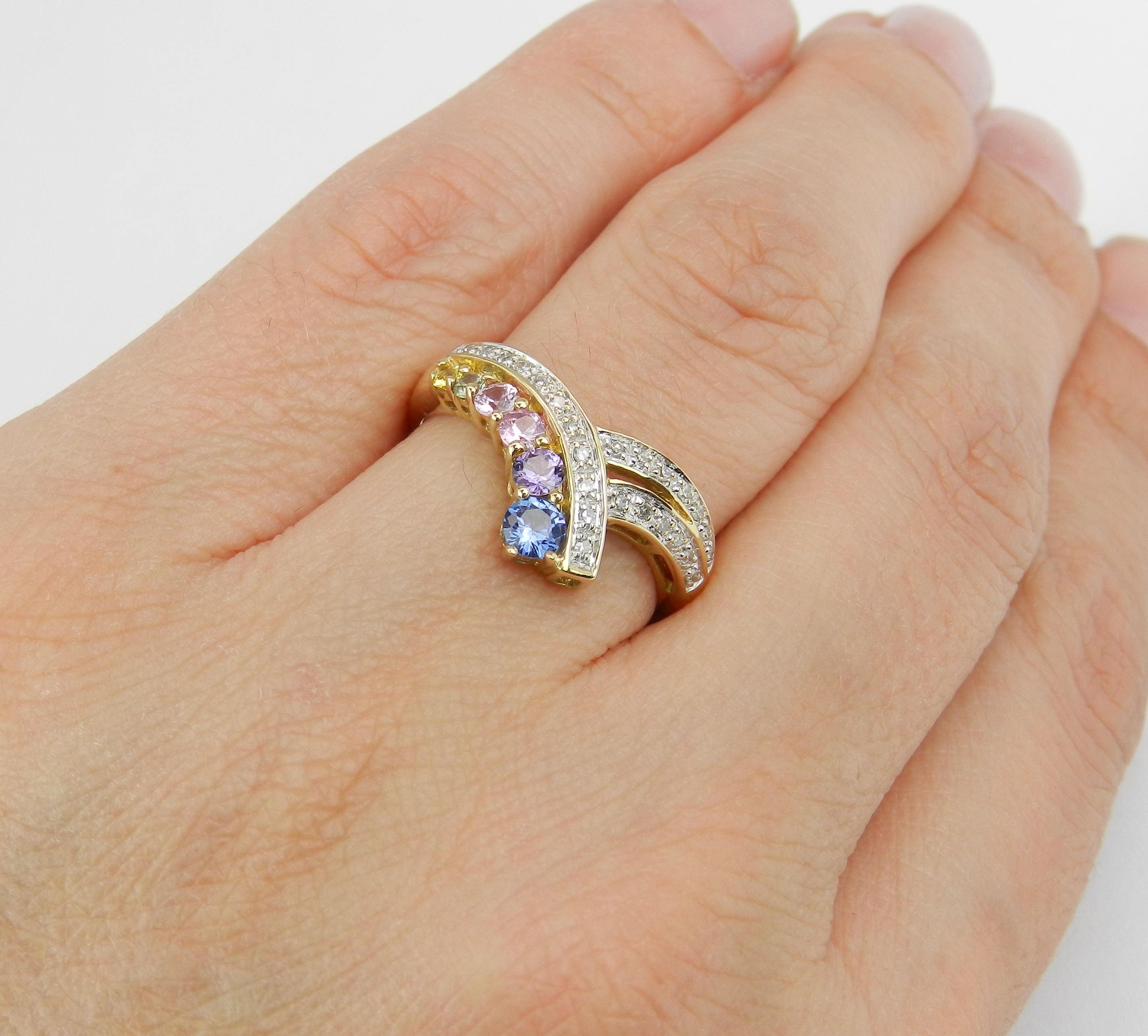 Multi Color Sapphire and Diamond Cocktail Ring Anniversary Band set in Yellow Gold. This ring is set with genuine round Multi Color Sapphires. There are two Pink Sapphires, a Yellow Sapphire, a Green Sapphire, a Blue Sapphire and a Purple Sapphire. All these gemstones are 100% Genuine and amount to a total weight of .75 carats. There are also twenty-four Round Diamonds set in this ring. These Diamonds are H color, SI clarity and weigh a total of .20 carat. This ring is 10KT Yellow Gold, weighs 2.7 grams and is a finger size 7, can be sized (please inquire about sizing with the finger size you need). This ring will be accompanied by an appraisal by a GIA Certified Diamond Grader with the replacement value of $1,459.00. I will ship this ring promptly in a beautiful gift box.
