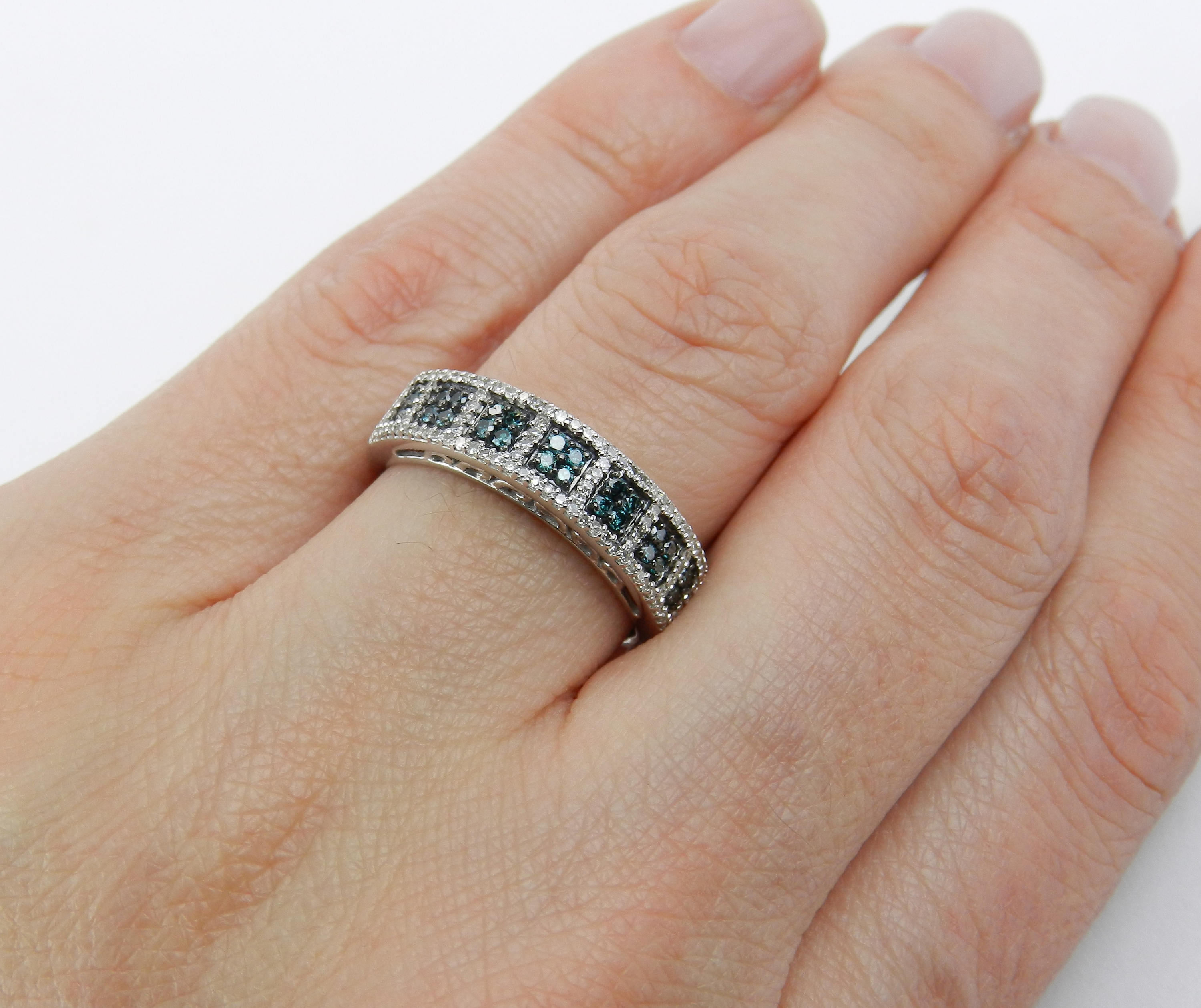 White Gold Fancy Blue and White Diamond Wedding Ring Anniversary Band. This ring is set with ninety-six natural Round Brilliant White Diamonds and twenty-four genuine Round Brilliant Fancy Blue Diamonds. These diamonds are H color (White Diamonds), SI clarity and all the diamond combine to a total weight of 1/2 carat. This ring is 10KT White Gold, weighs 4.0 grams, measures 5.2 mm in width and is a finger size 6 3/4, which can be resized (please inquire about sizing with the finger size that you need). This ring will be accompanied by an appraisal with the retail replacement value of $1,495.00. I will ship this ring promptly in a gift box.