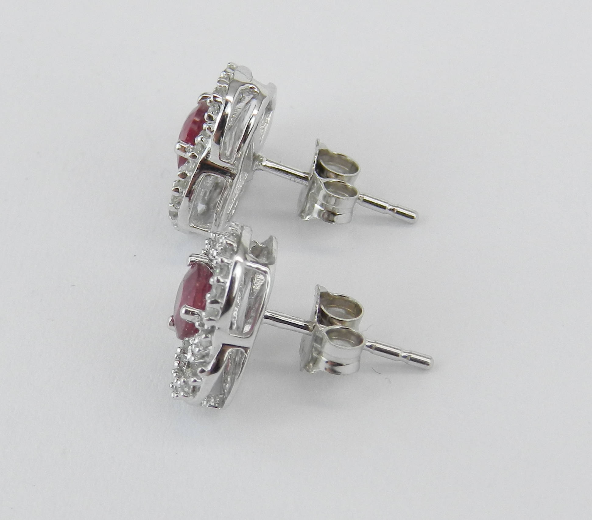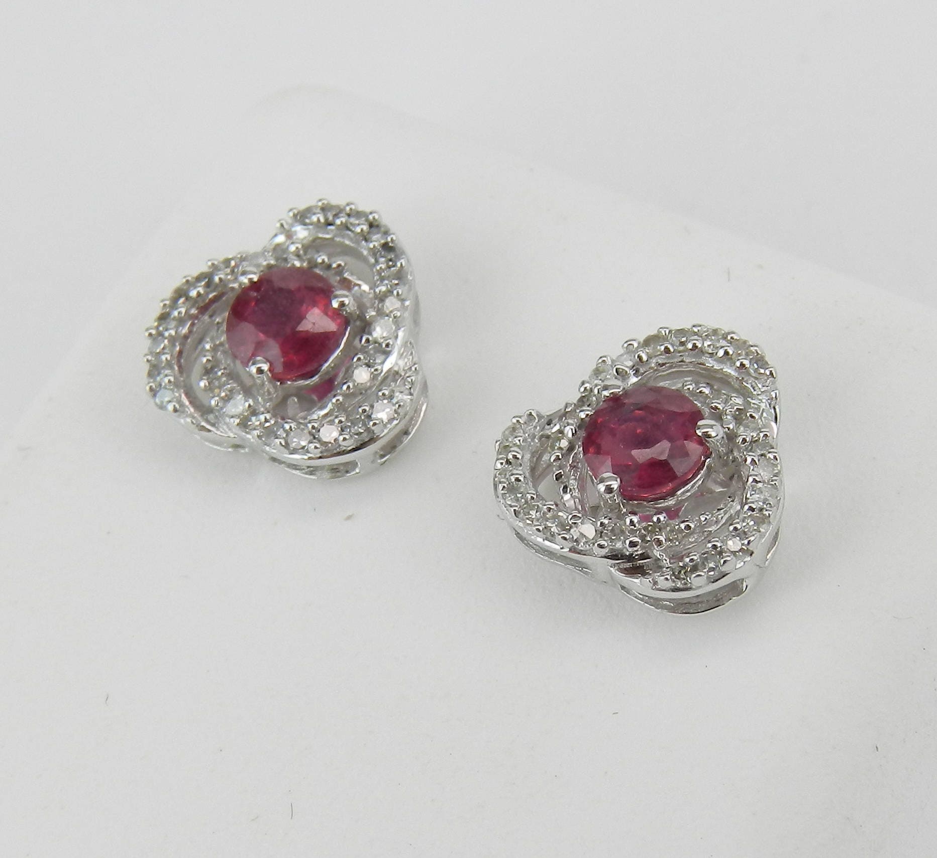 White Gold Diamond and Ruby Stud Earrings. These earrings are set with a genuine Round Ruby in each earring. These Rubies are a medium/dark red color, measure 3.5 mm in diameter each and weigh a total of .45 carats. There are sixty natural Round Diamonds set in these earrings. These Diamonds are H color, SI1 clarity and amount to a total weight of .25 carat. These earrings weigh 2.0 grams and measure 9.5 mm in diameter each. These earrings are for pierced ears and the earrings have friction post backs. These earrings will be accompanied by an appraisal written by a GIA Certified Diamond Grader with the retail replacement value of $1,095.00. I will ship these earrings promptly in a gift box.