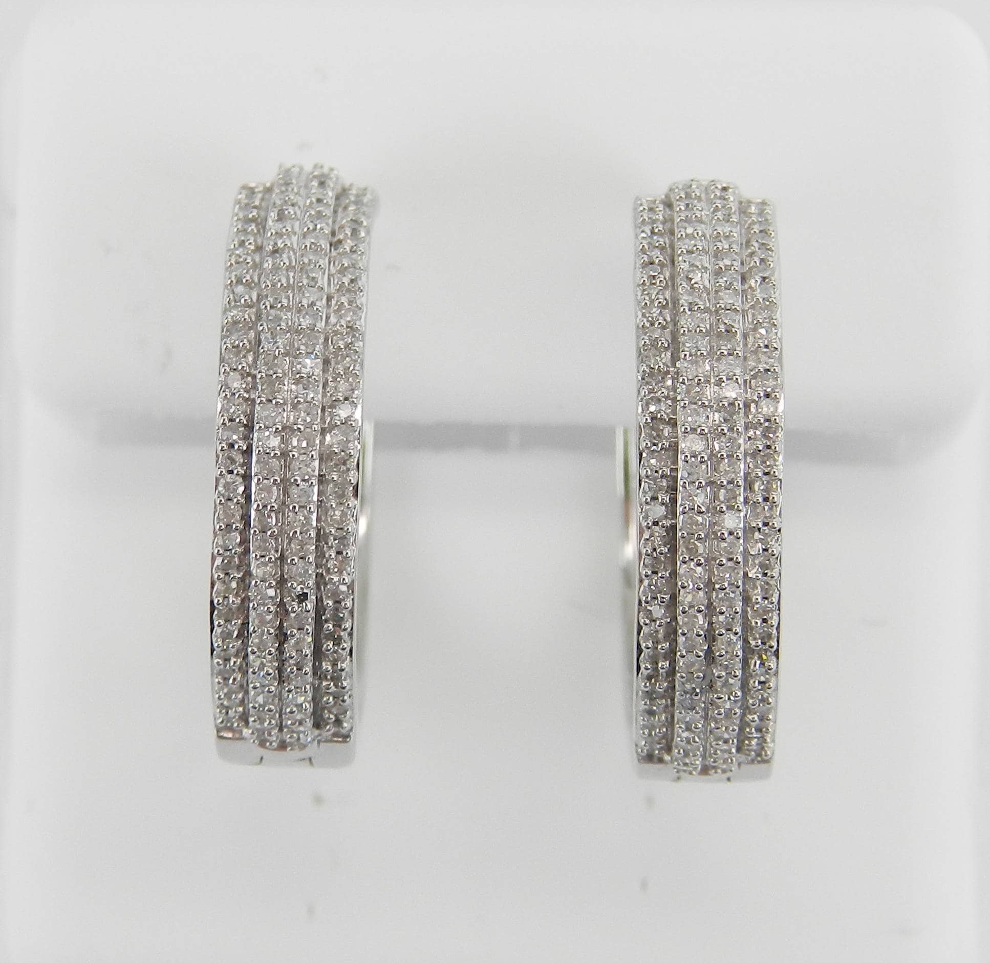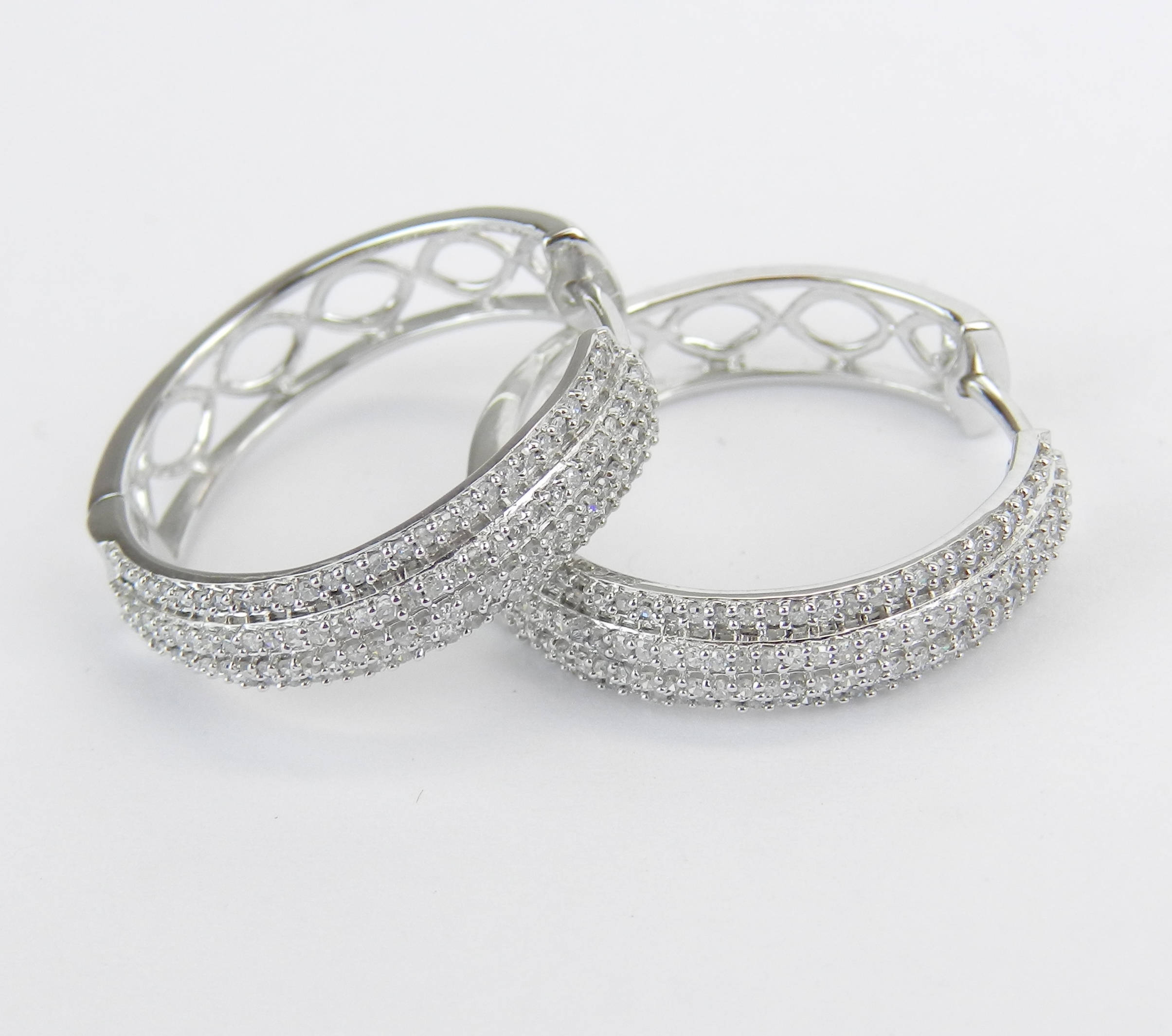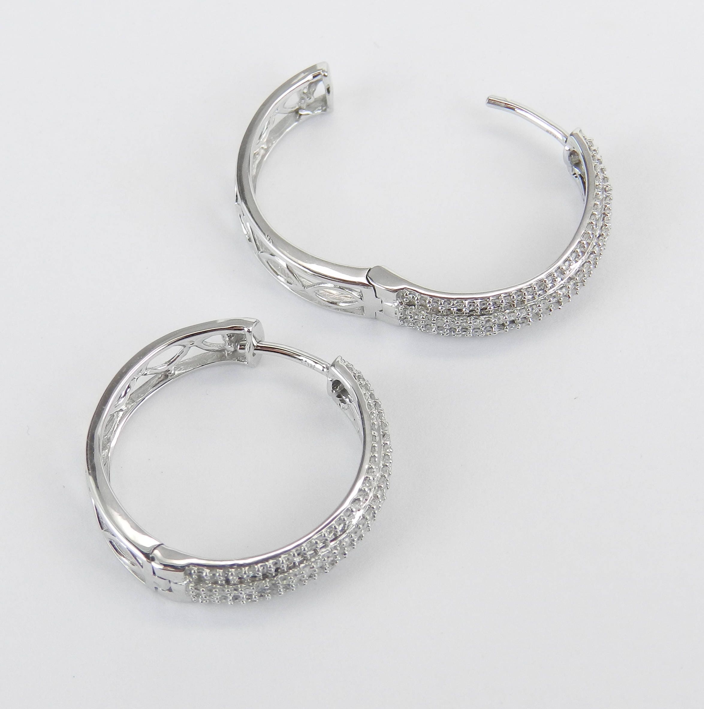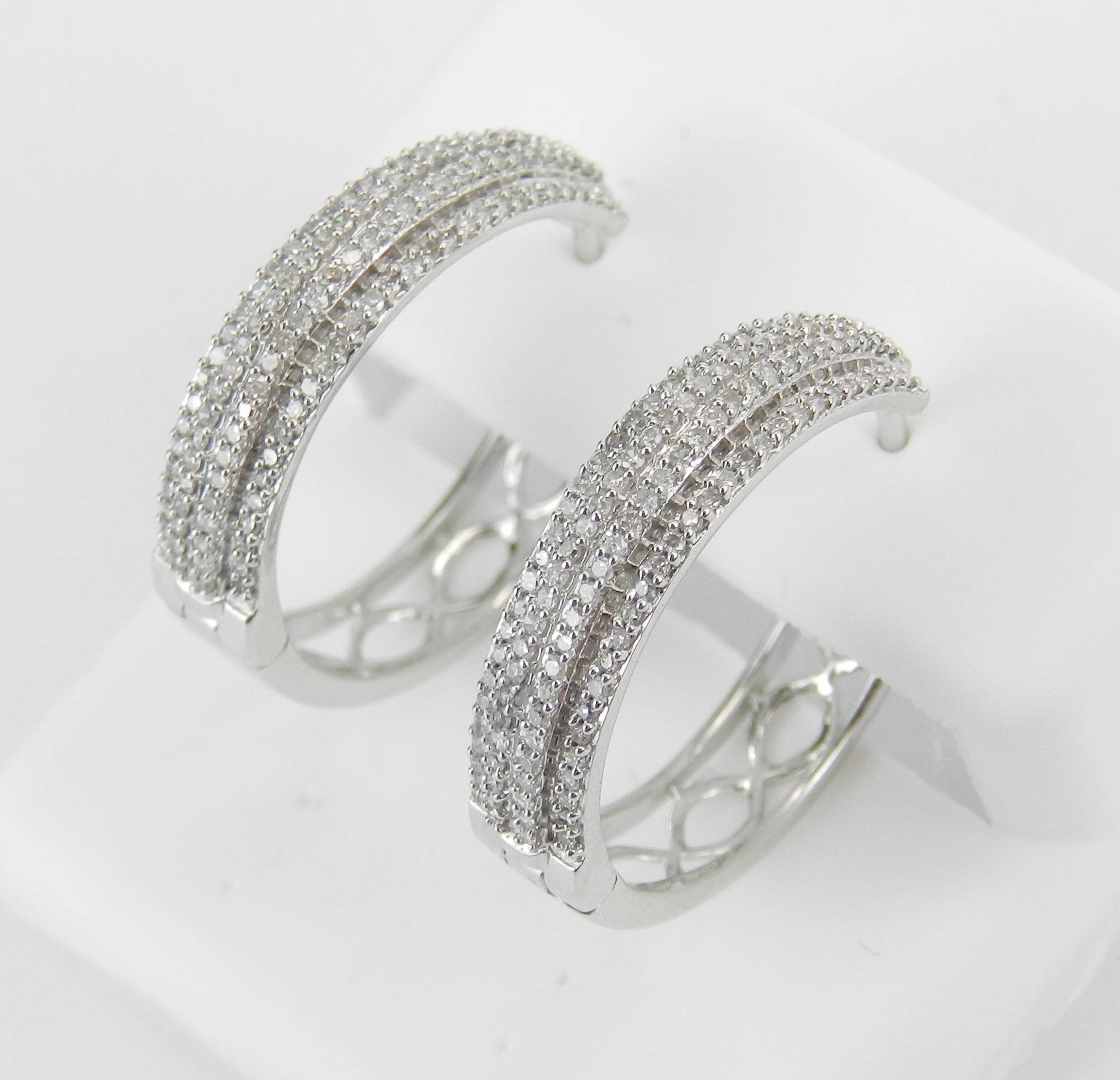 White Gold Diamond Hoop Earrings. These earrings are set with one hundred and eighteen (118) genuine Round Diamonds. These diamonds are H color, SI/I1 clarity and weigh a total of .70 carat. These earrings are 10K White Gold and weigh a total of 4.2 grams. These earrings are for pierced ears and measure 21 mm in diameter and 5 mm in width. These earrings will be accompanied by an appraisal written by a GIA Certified Diamond Grader with the retail replacement value of $1,675.00. I will ship these earrings promptly in a gift box.