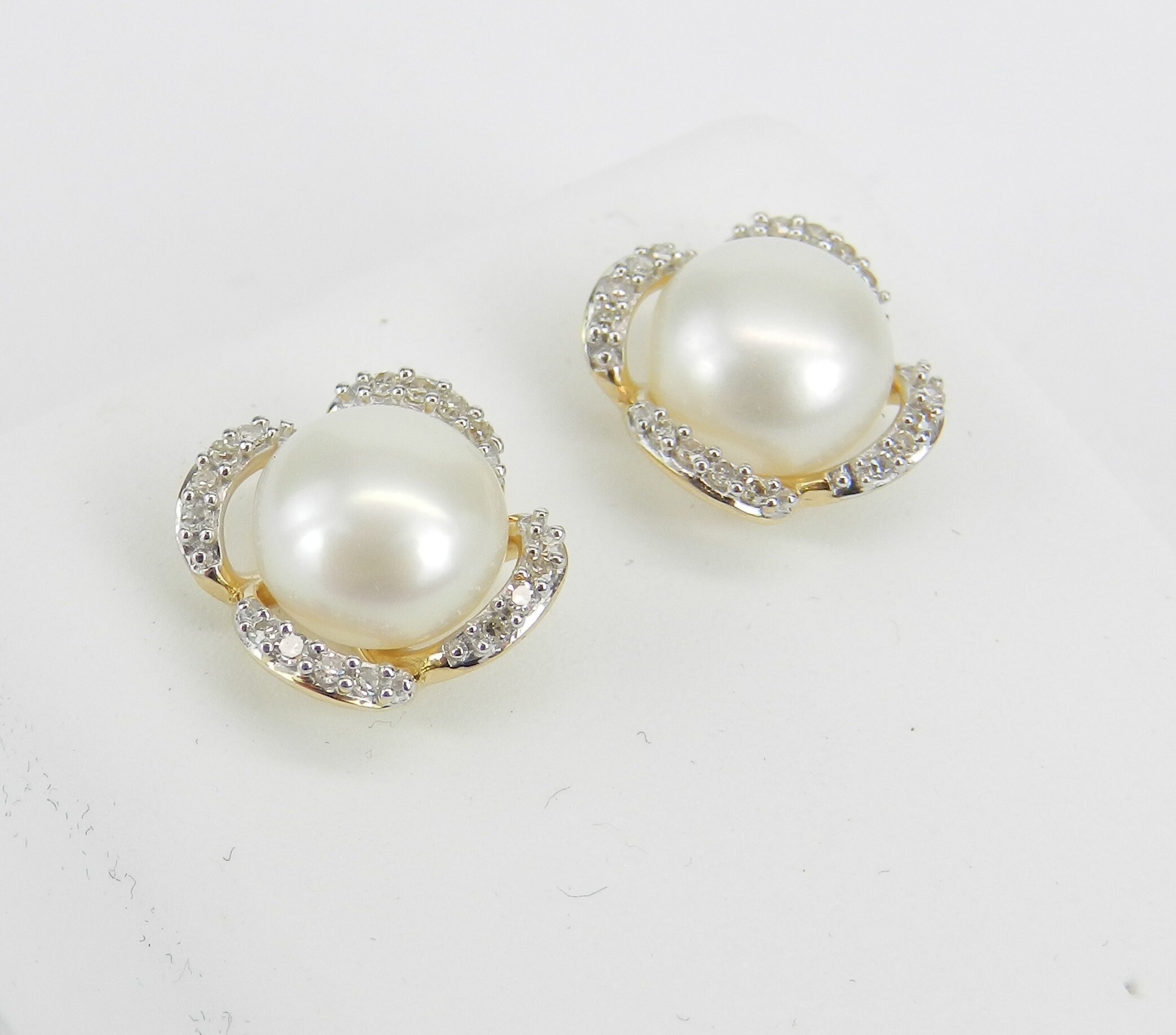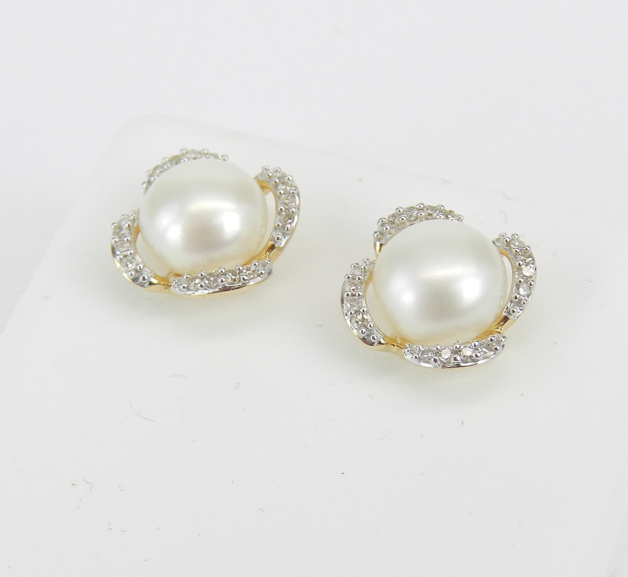 14K Yellow Gold Pearl and Diamond Stud Earrings. These earrings are set with two White Pearls and thirty-two genuine Round Diamonds. These Pearls measure 7 mm in diameter each. The Diamonds in these earrings are H color, SI clarity and weigh a total of .10 carat. These earrings are 10KT Yellow Gold and weigh a total of 2.0 grams. These earrings are for pierced ears, measure 10 mm in diameter and the earrings have friction post backings. These earrings will be accompanied by an appraisal written by a GIA Certified Diamond Grader with the retail replacement value of $1,249.00. I will ship these earrings promptly in a gift box.