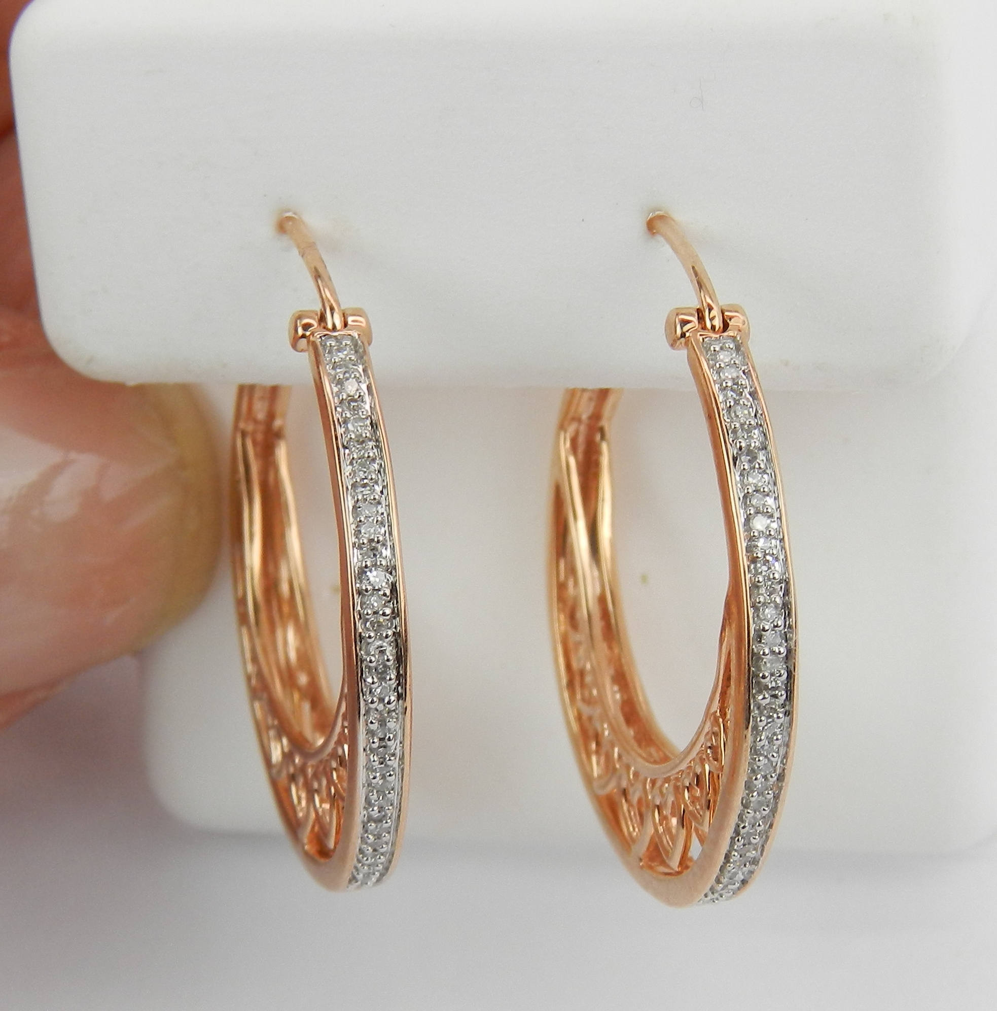 Rose Gold Diamond Hoop Earrings. These earrings are set with sixty-four genuine Round Diamonds. These diamonds are G color, SI clarity and weigh a total of .25 carat. These earrings are 10K Rose Gold and weigh a total of 4.4 grams. These earrings are for pierced ears and measure 23 mm in diameter (1") and 2 mm in width. These earrings will be accompanied by an appraisal written by a GIA Certified Diamond Grader with the retail replacement value of $1,435.00. I will ship these earrings promptly in a gift box.
