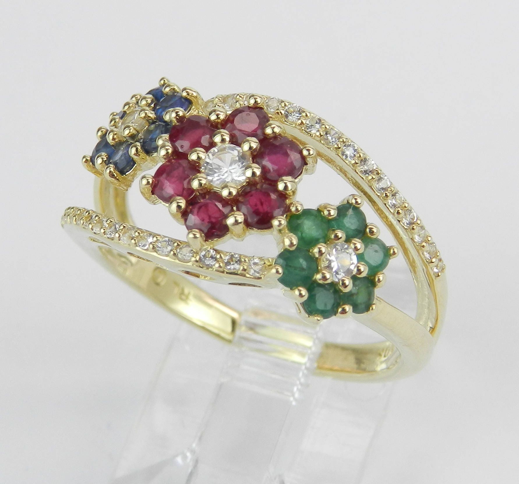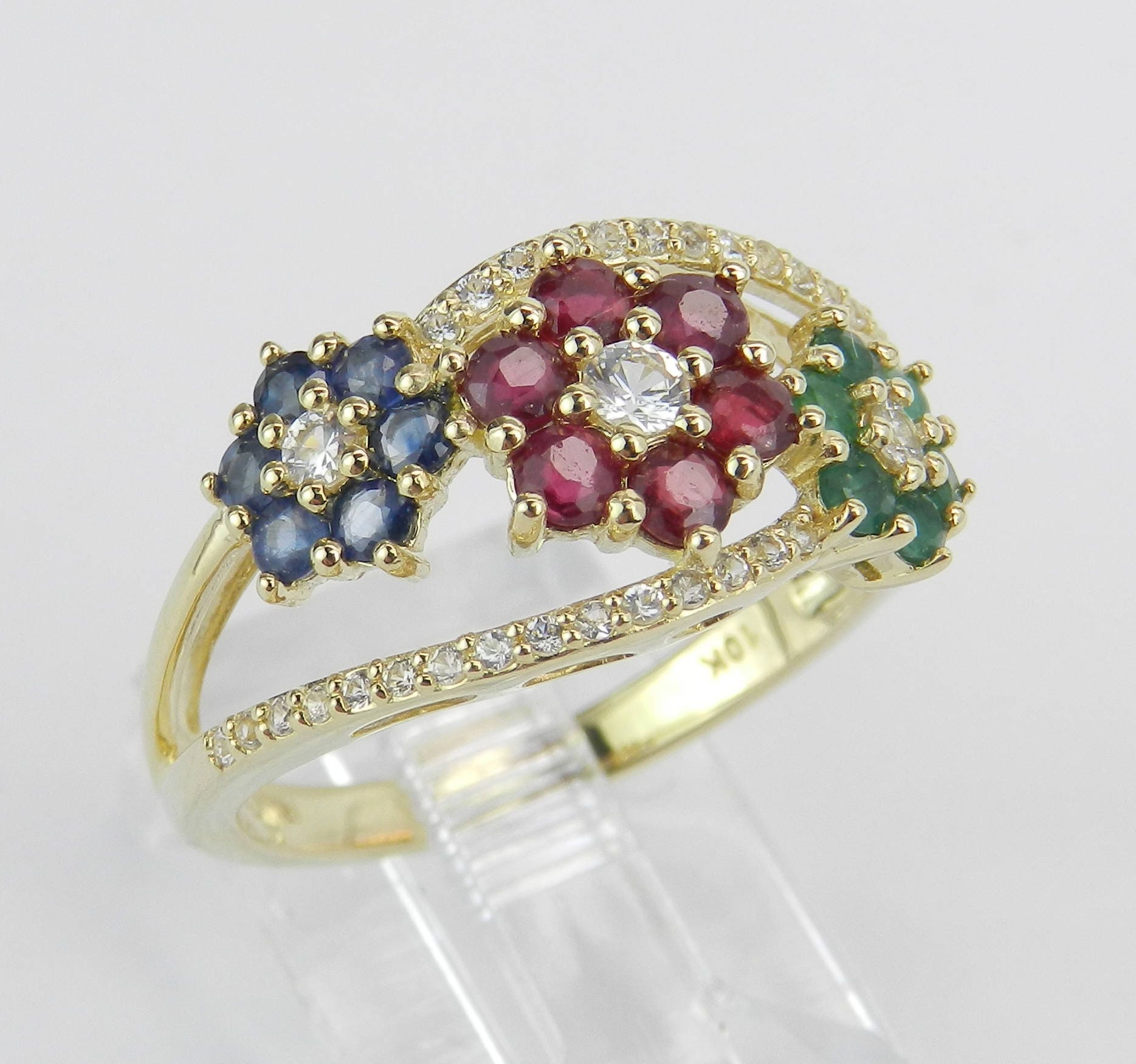 Yellow Gold Sapphire, Ruby and Emerald Flower Cluster Ring Band. These gorgeous ring is set with six Round Emeralds, six Round Rubies, six Round Blue Sapphires and thirty-three Round White Sapphires. All these gemstones amount to a total weight of 1.12 carats. This rings is 10KT Yellow Gold, weighs 3.2 grams, measures 10 mm in width and is a finger size 7, can be resized (please inquire about sizing with the finger size you need). This ring will be accompanied by an appraisal by a GIA Certified Diamond Grader with the retail replacement value of $1,485.00. I will ship this ring promptly in a gift box.