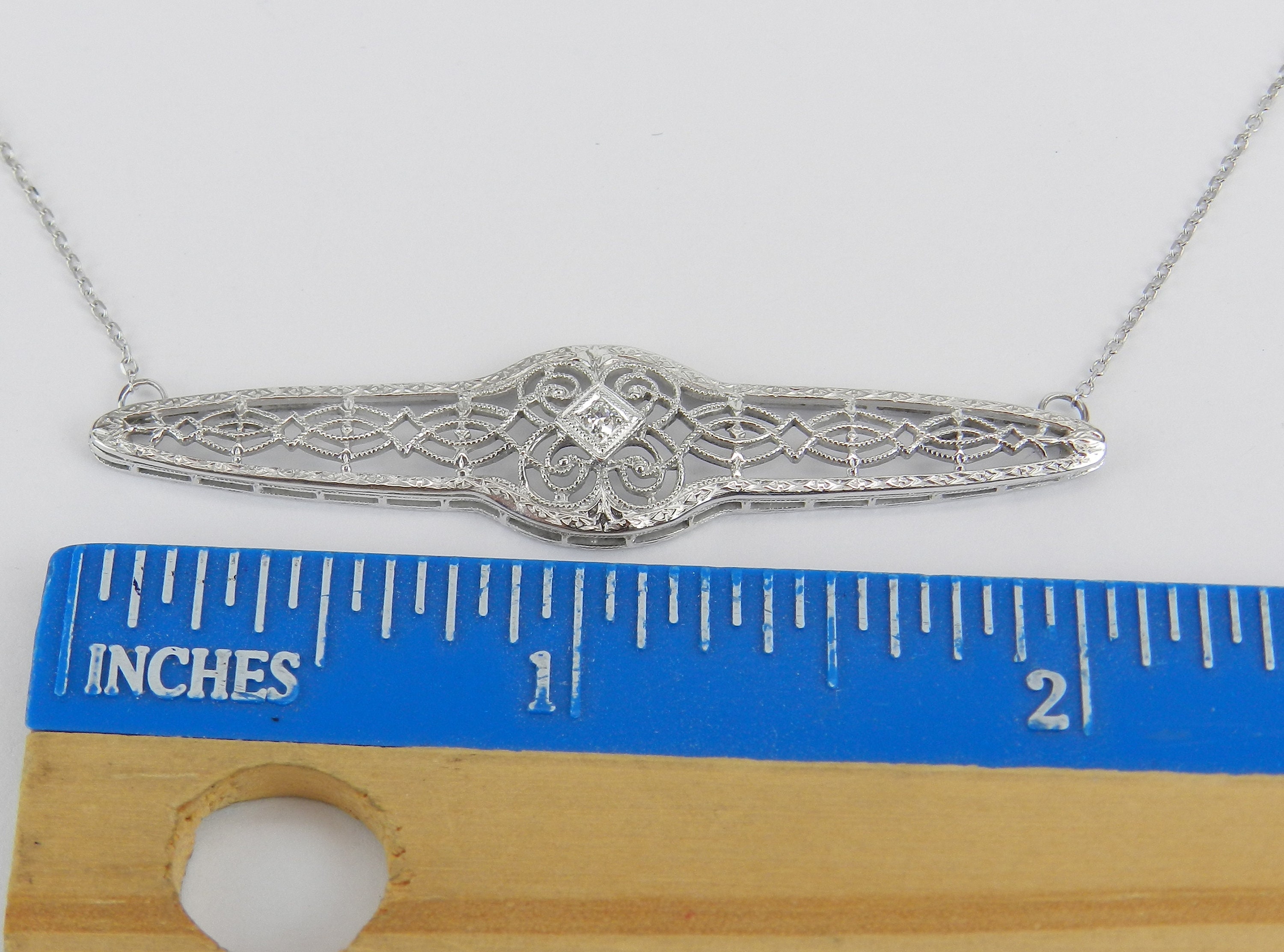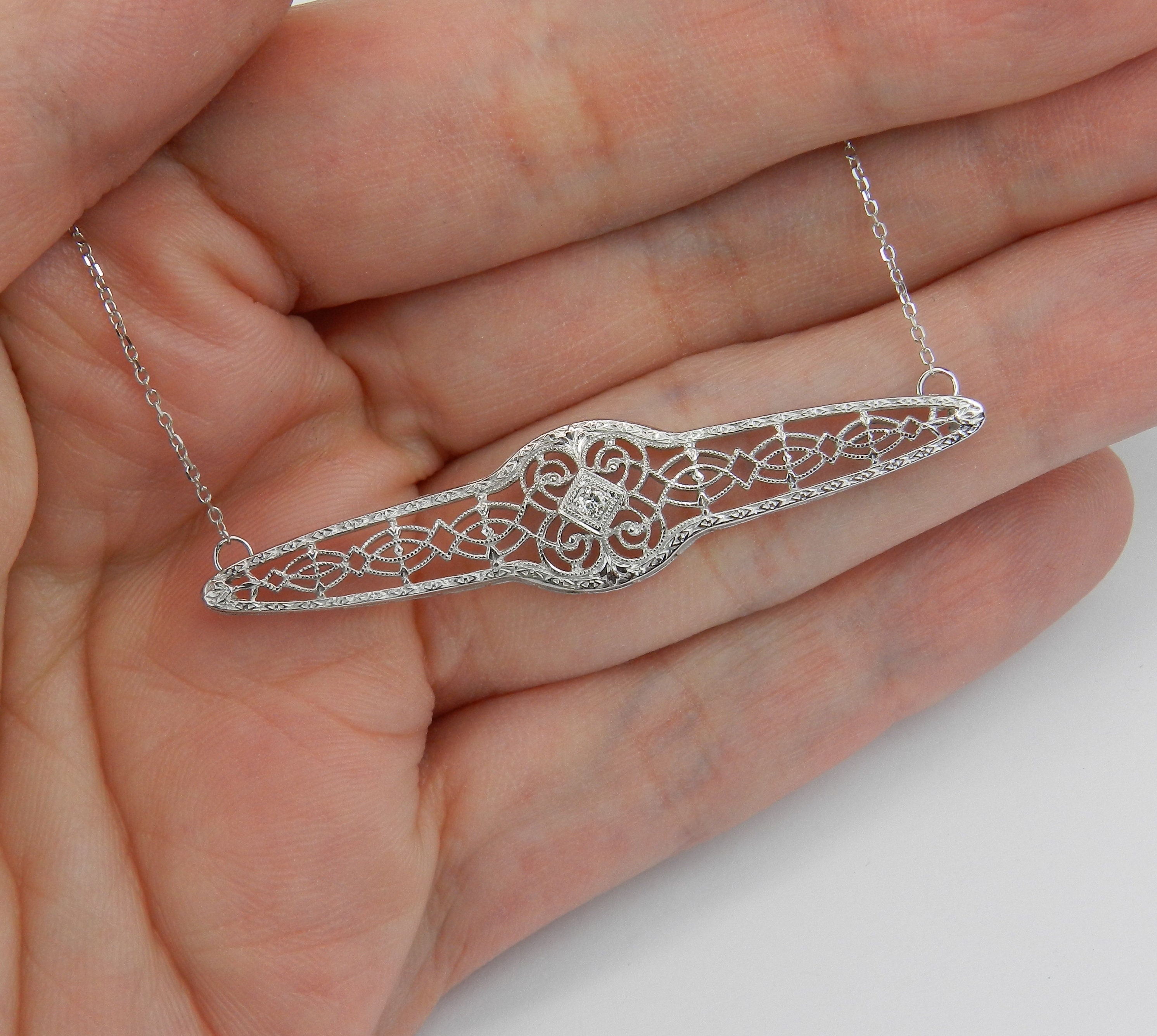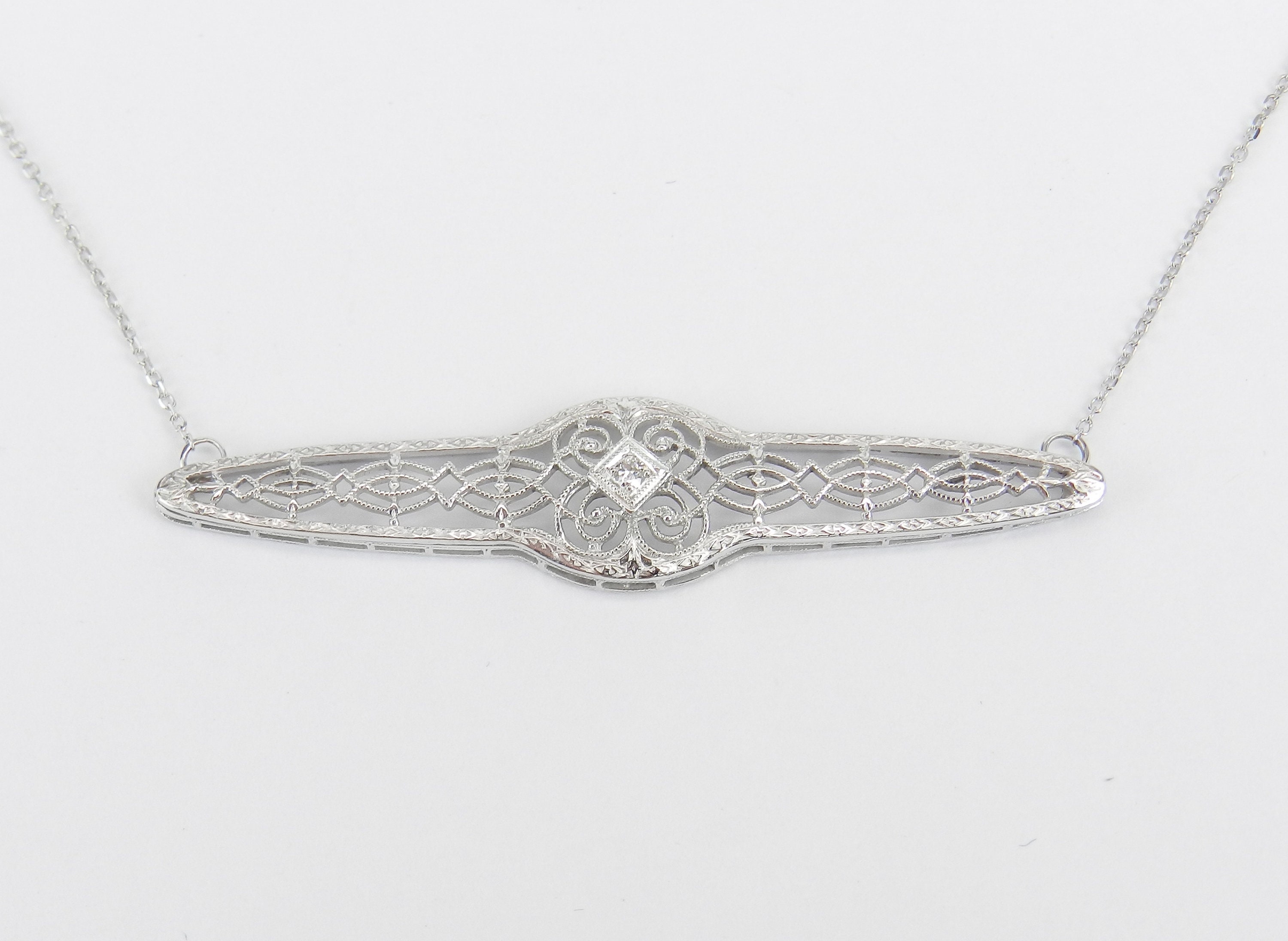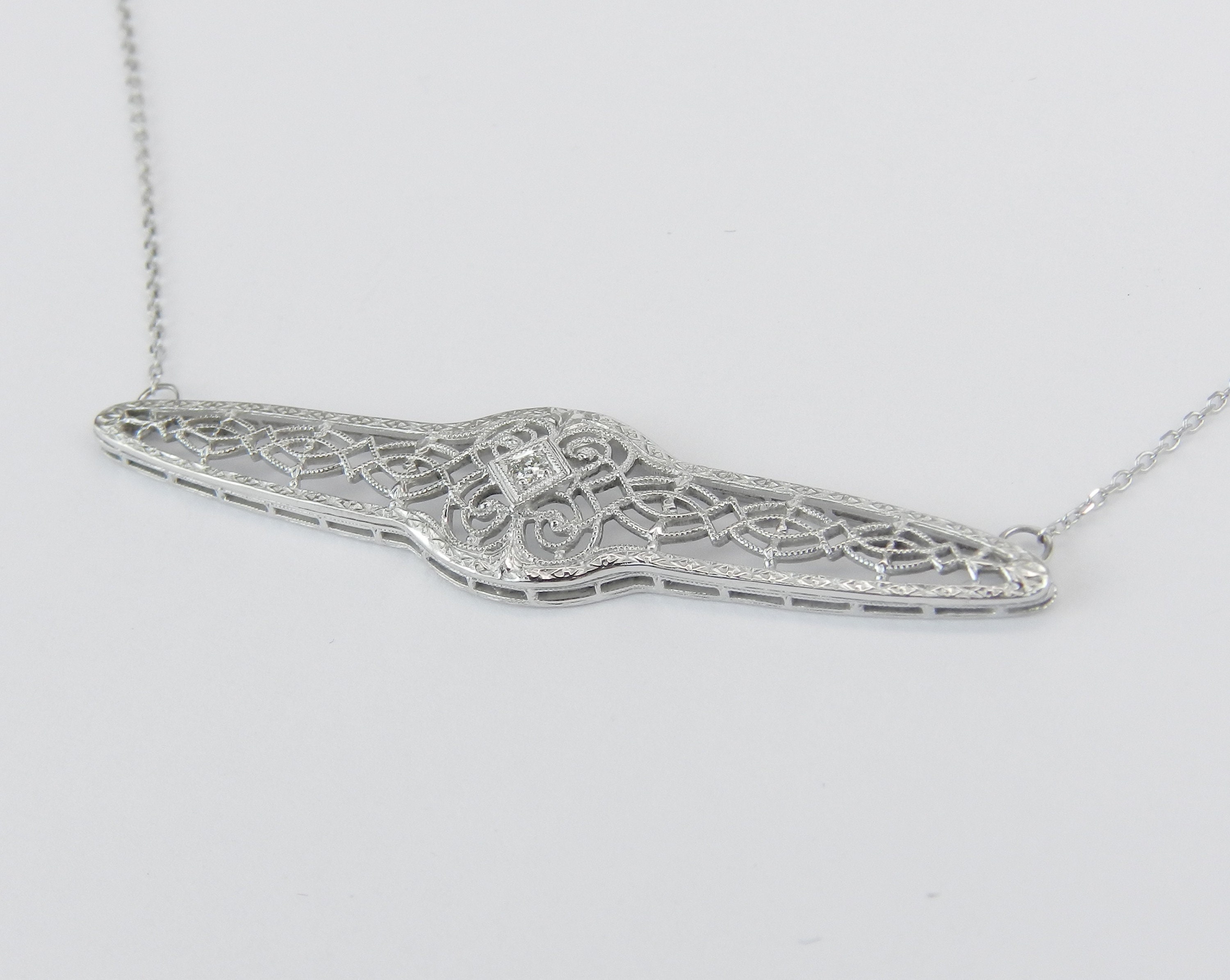 14K White Gold Antique Art Deco Diamond Filigree Pendant Bar Necklace. This piece has a unique filigree design and is set with one natural Round Diamond. This diamond is H color, SI clarity and weighs .02 carat. This pendant was a brooch and was made into a necklace. It is attached to a 14K White Gold chain and measures 20" in length. This necklace weighs 3.7 grams and the centerpiece measures 53 mm across (2 1/8"). This necklace will also be accompanied by an appraisal by a GIA Certified Diamond Grader with the replacement value of $1,395.00. I will ship this piece promptly in a beautiful gift box.
