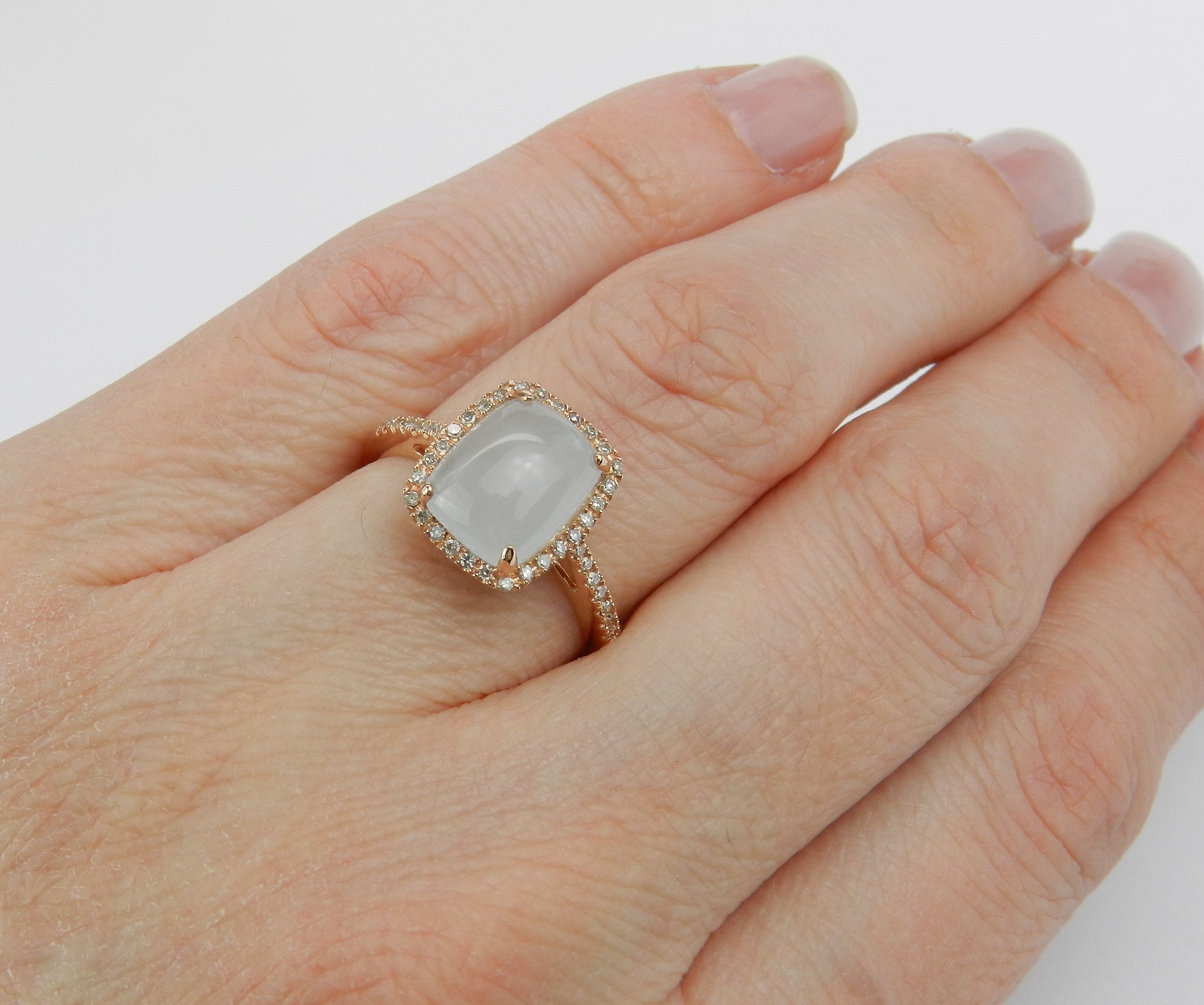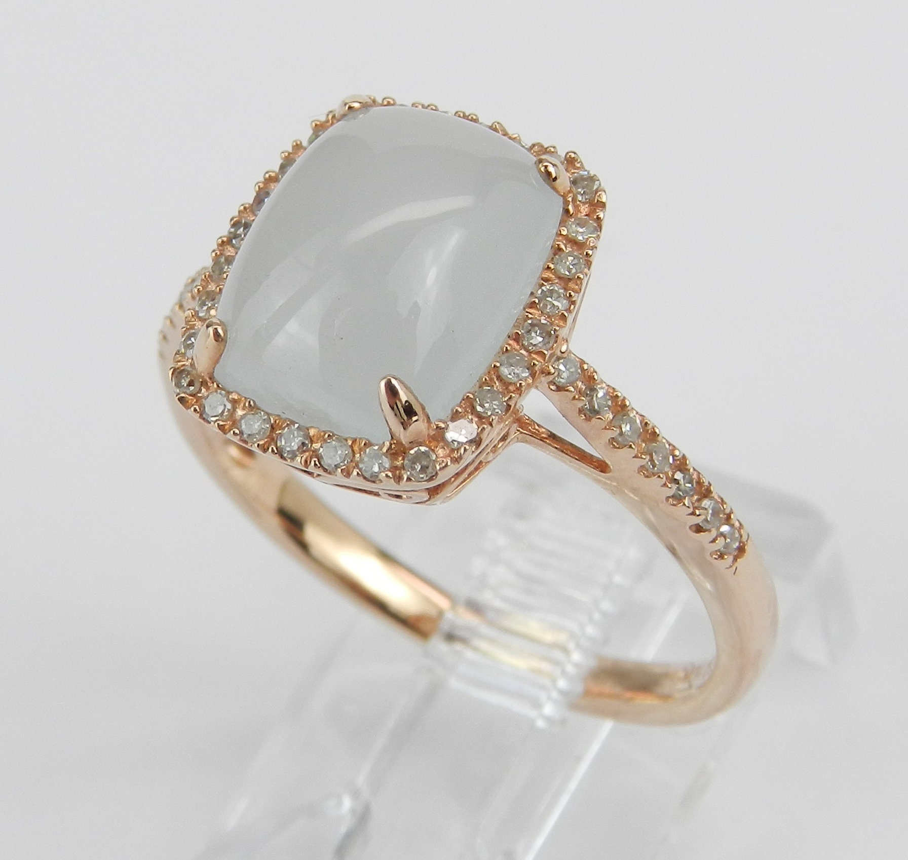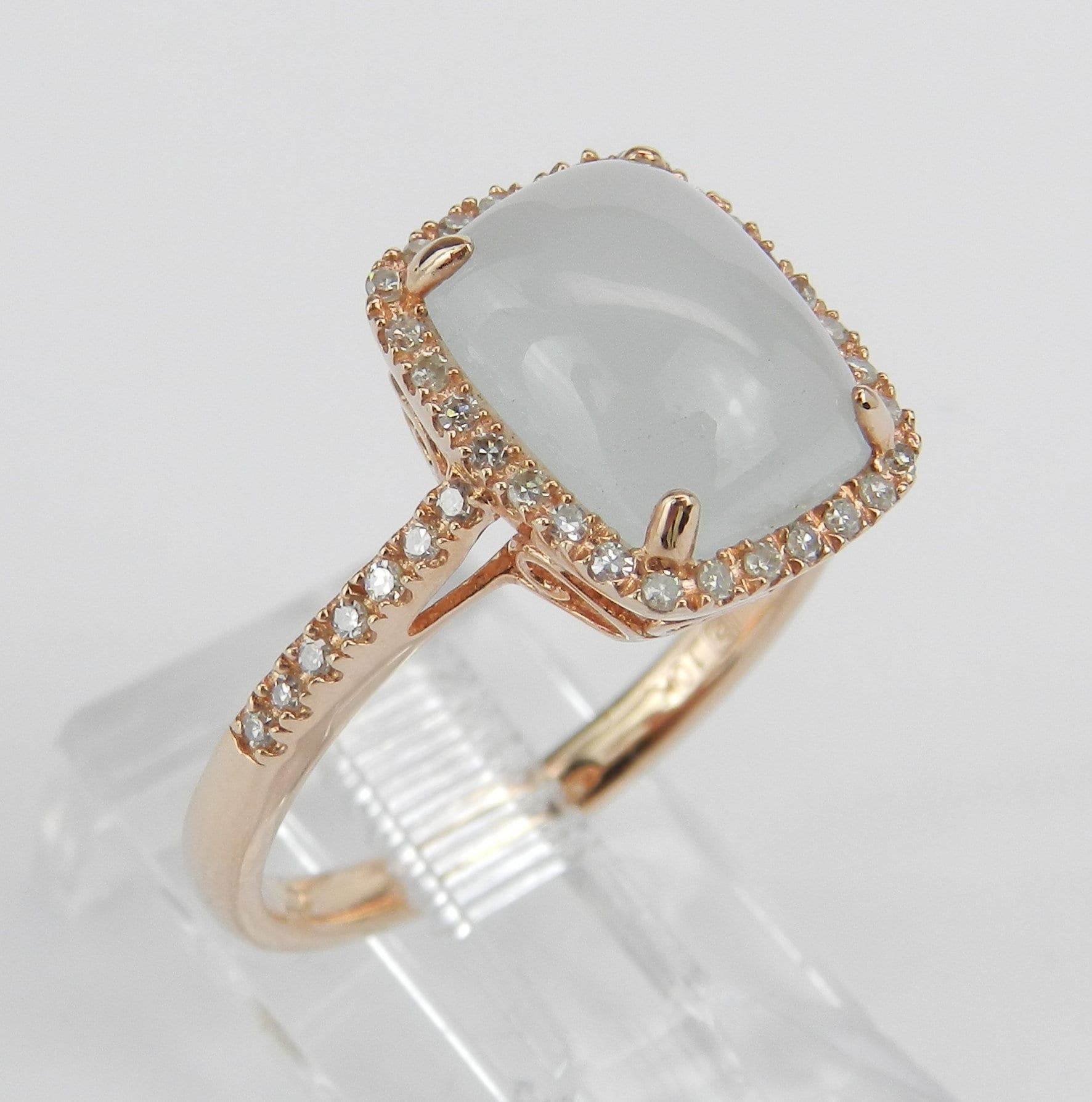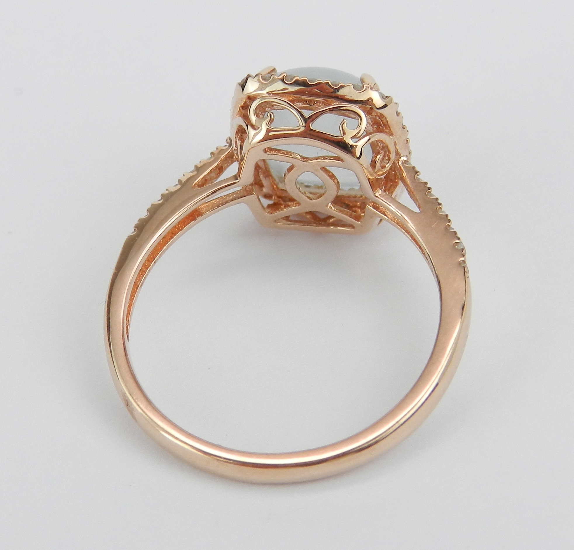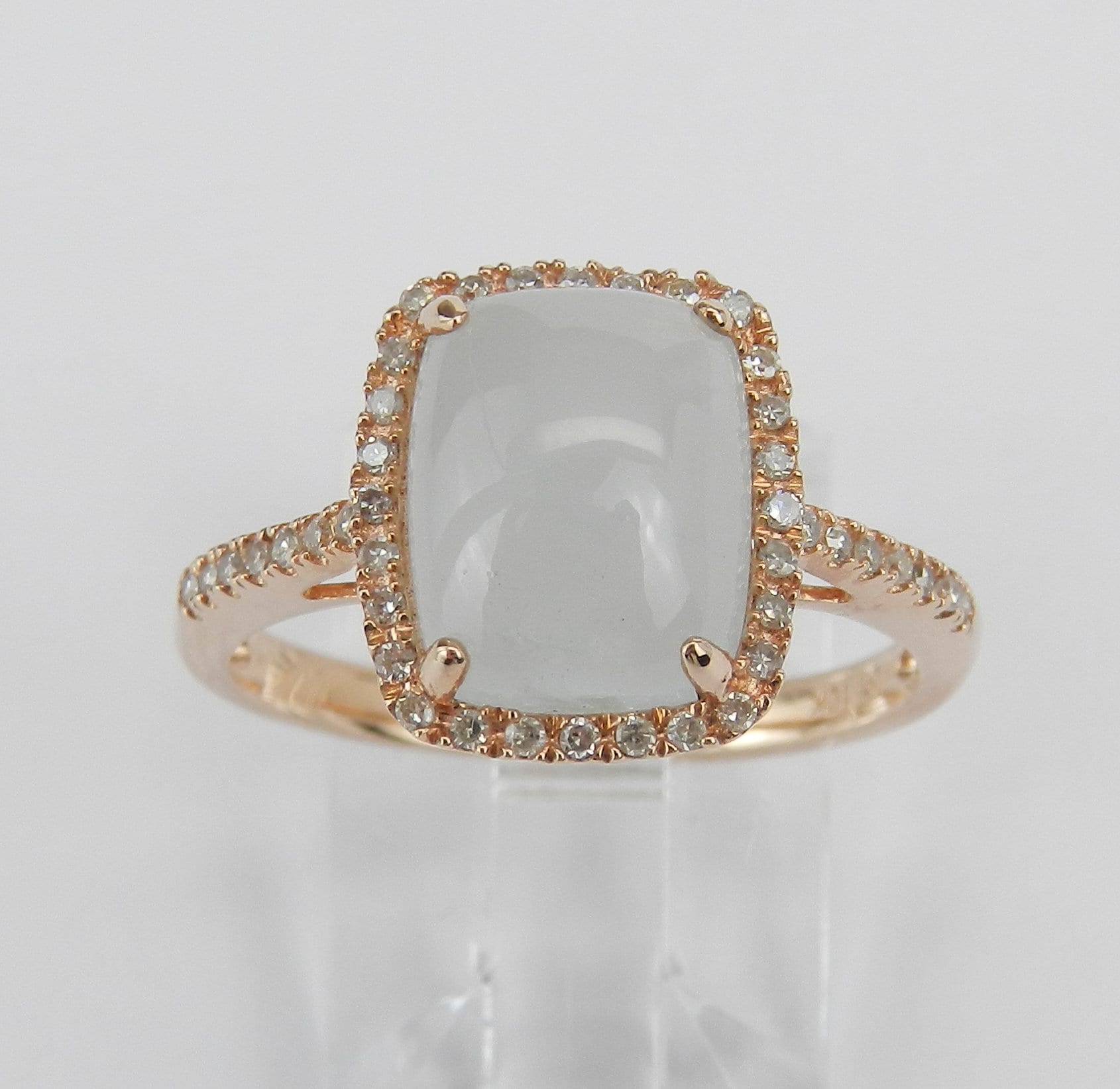 Rose Gold Diamond and Rectangular Cushion Cut Aquamarine Halo Engagement Ring. This ring is set with one genuine Rectangular Cushion Cut Cabochon Aquamarine in the center and forty-two natural Round diamonds. These diamonds are H color, SI clarity and weigh a total of 1/4 carat. The aquamarine is a unique milky aqua color, shows up almost a grayish blue, measures 10 X 8 mm and weighs 2 1/2 carats. This ring is 10 KT Rose Gold, weighs 2.9 grams and is a finger size 7 1/4, which is resizable (please inquire about sizing with the finger size you need). The ring will be accompanied by an appraisal by a GIA Certified Diamond Grader with the retail replacement value of $1,459.00. I will ship this ring promptly in a gift box.