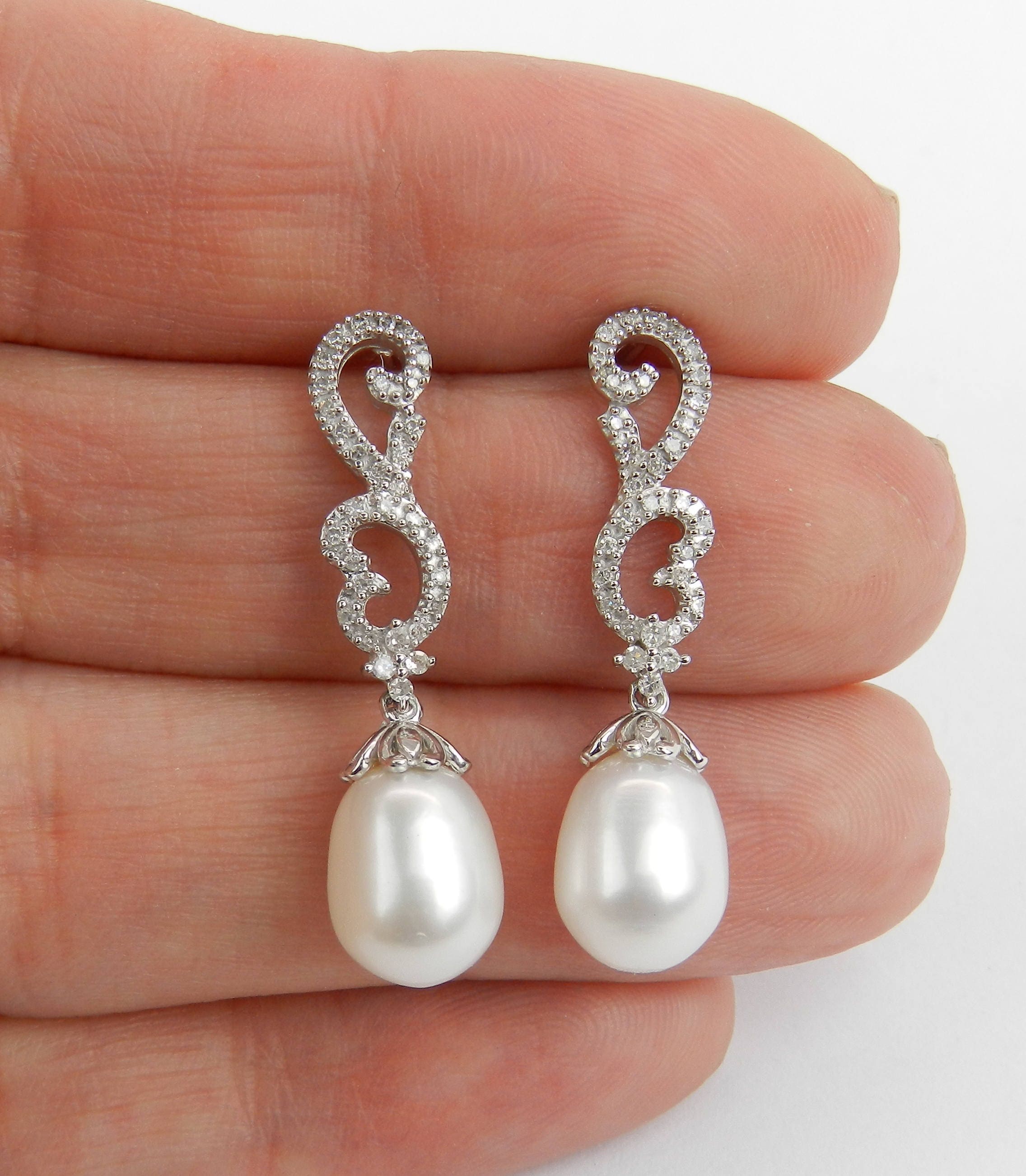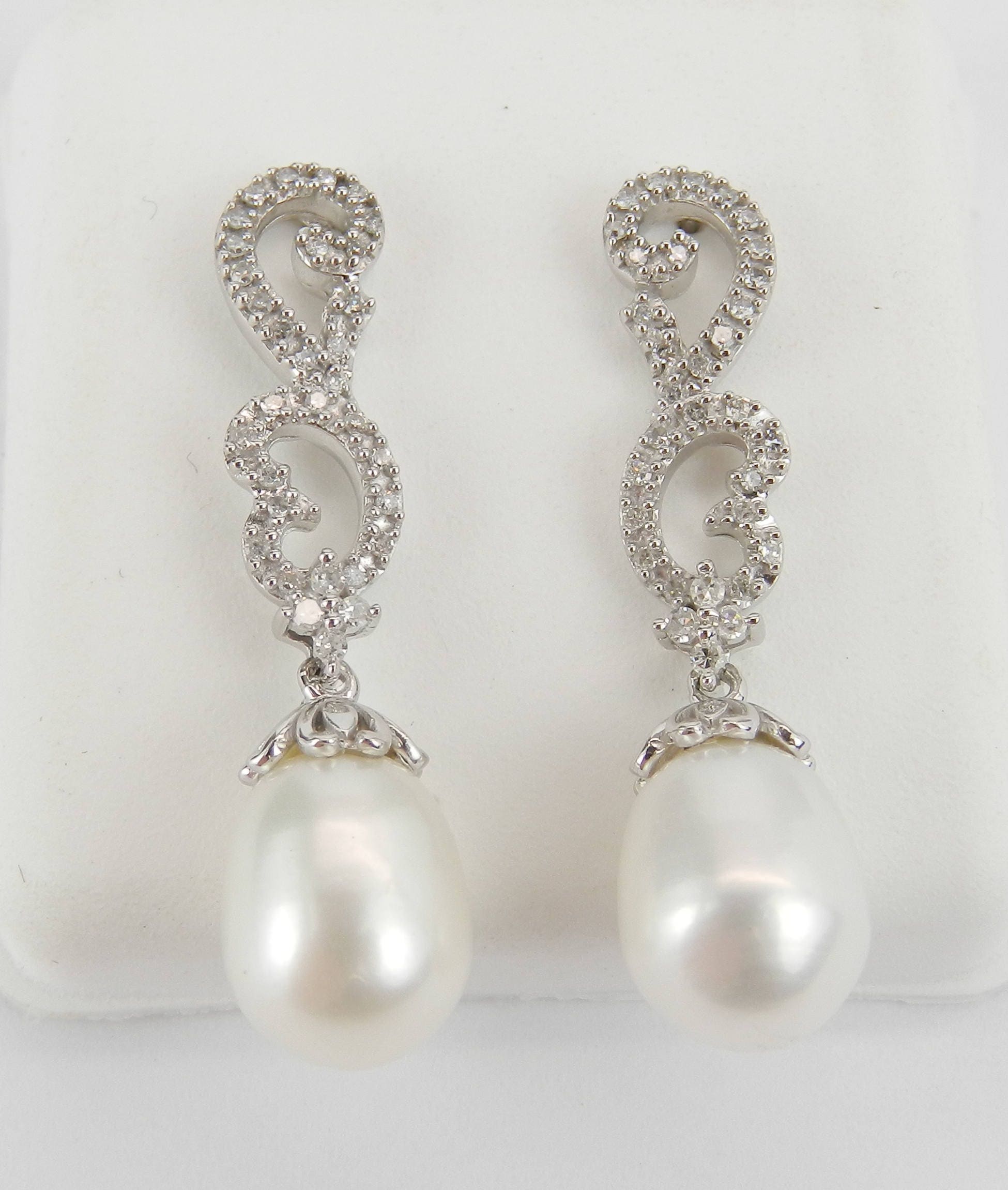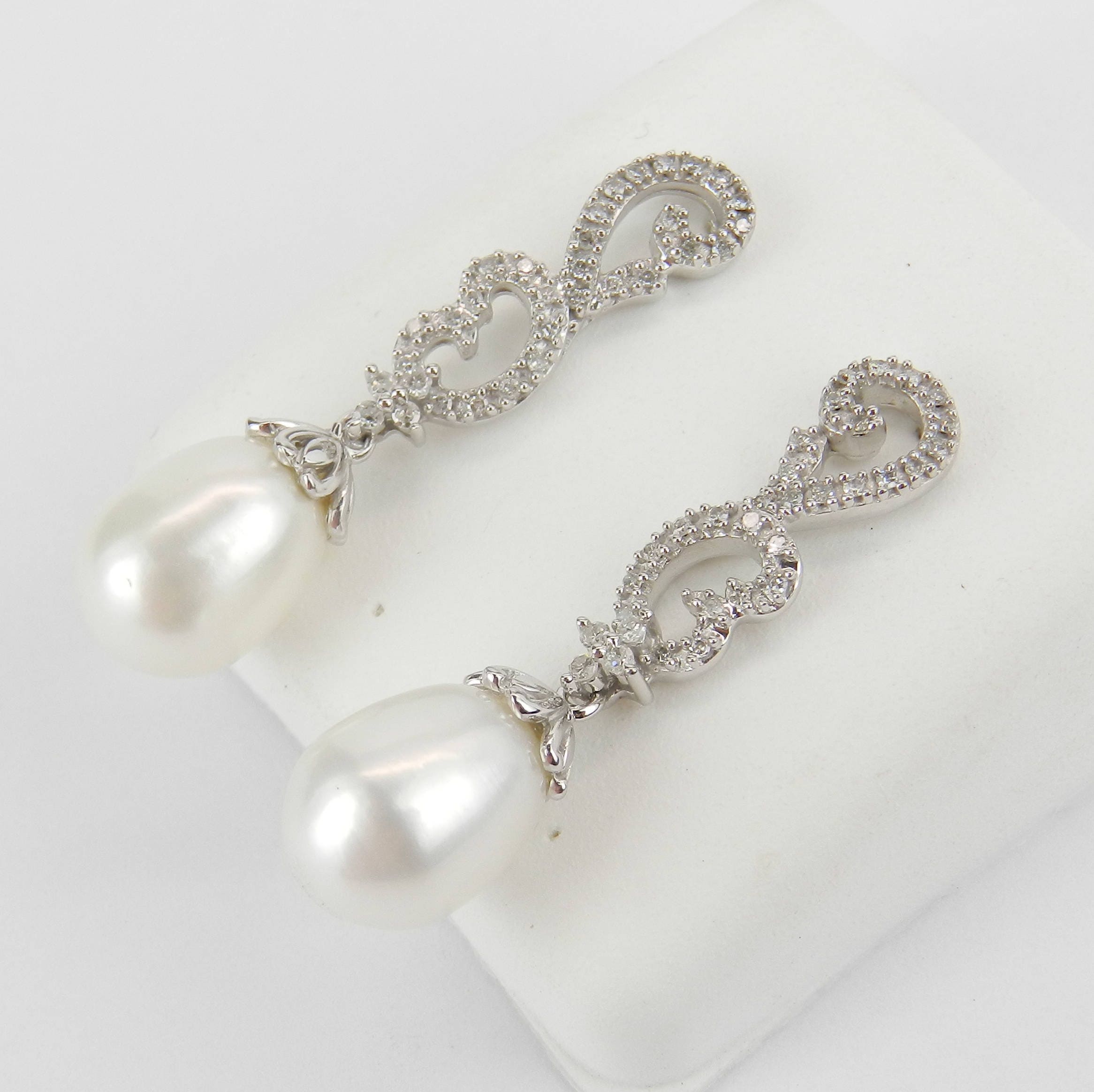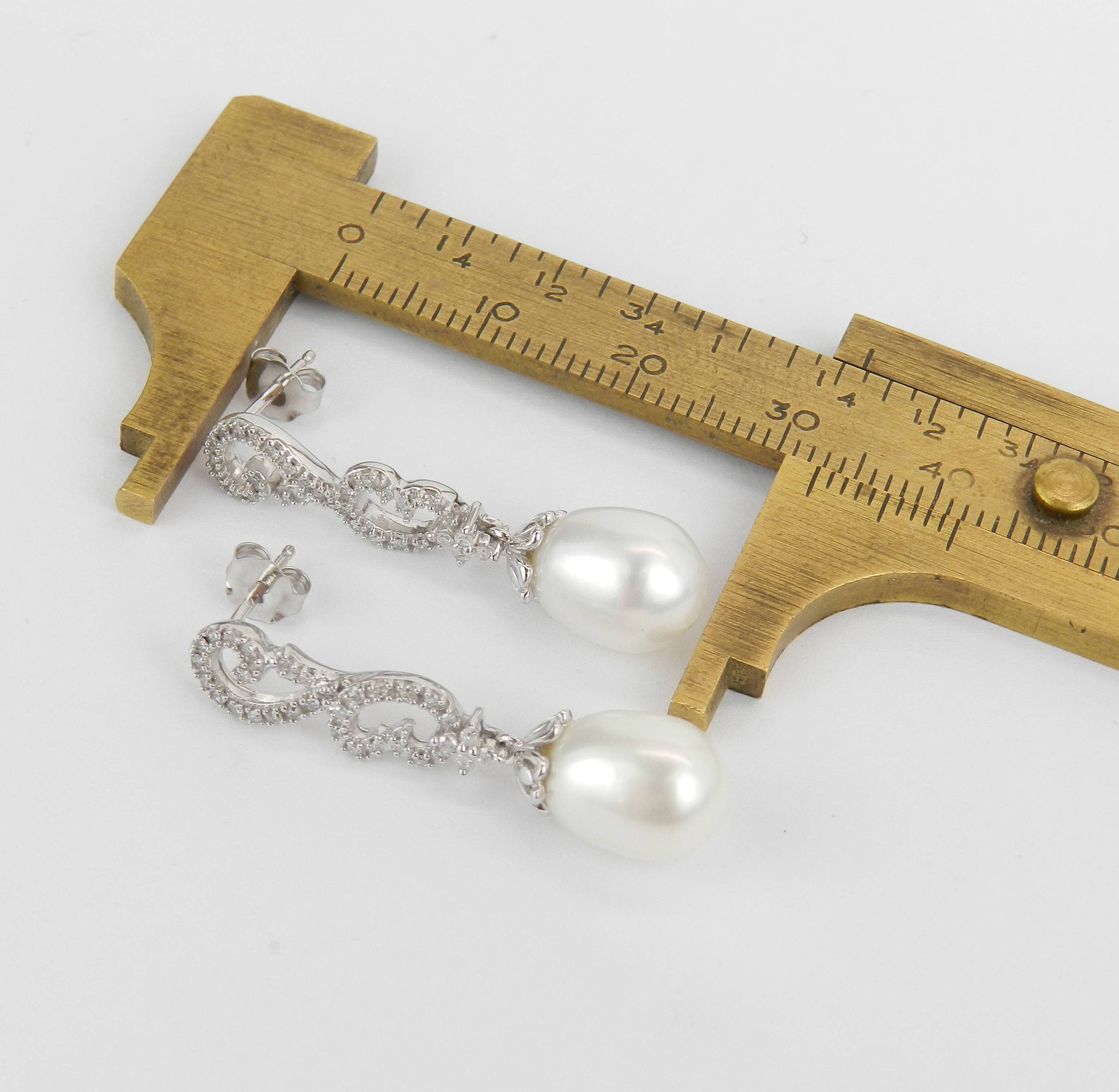 14K White Gold Pearl and Diamond Dangle Drop Earrings. There is one Pearl set to dangle off each earring. These Pearls measure 11 X 8 mm each. There are twenty-eight genuine natural Round Diamonds set in EACH earring. These diamonds are H color, SI clarity and weigh a total of .30 carat. These earrings are 14KT White Gold and weigh a total of 4.6 grams. These earrings are for pierced ears, measure 32 mm in length (1 1/4") and the earrings have friction post backings. These earrings will be accompanied by an appraisal written by a GIA Certified Diamond Grader with the retail replacement value of $1,465.00. I will ship these earrings promptly in a gift box.
