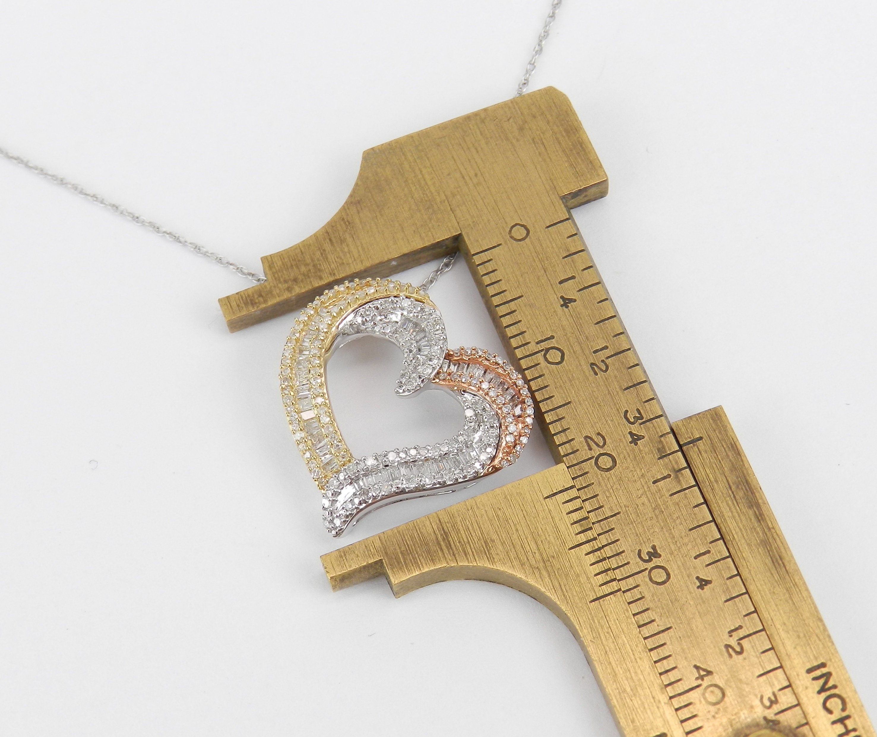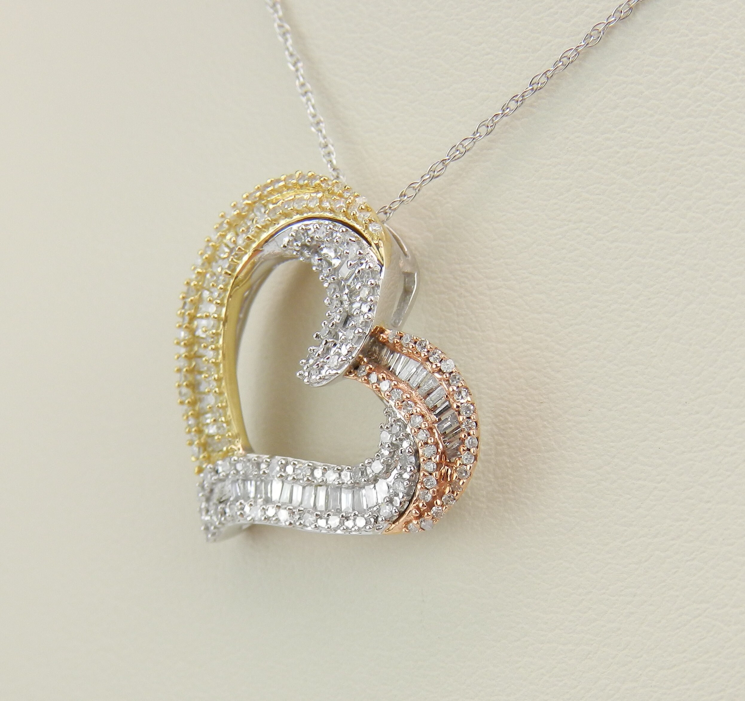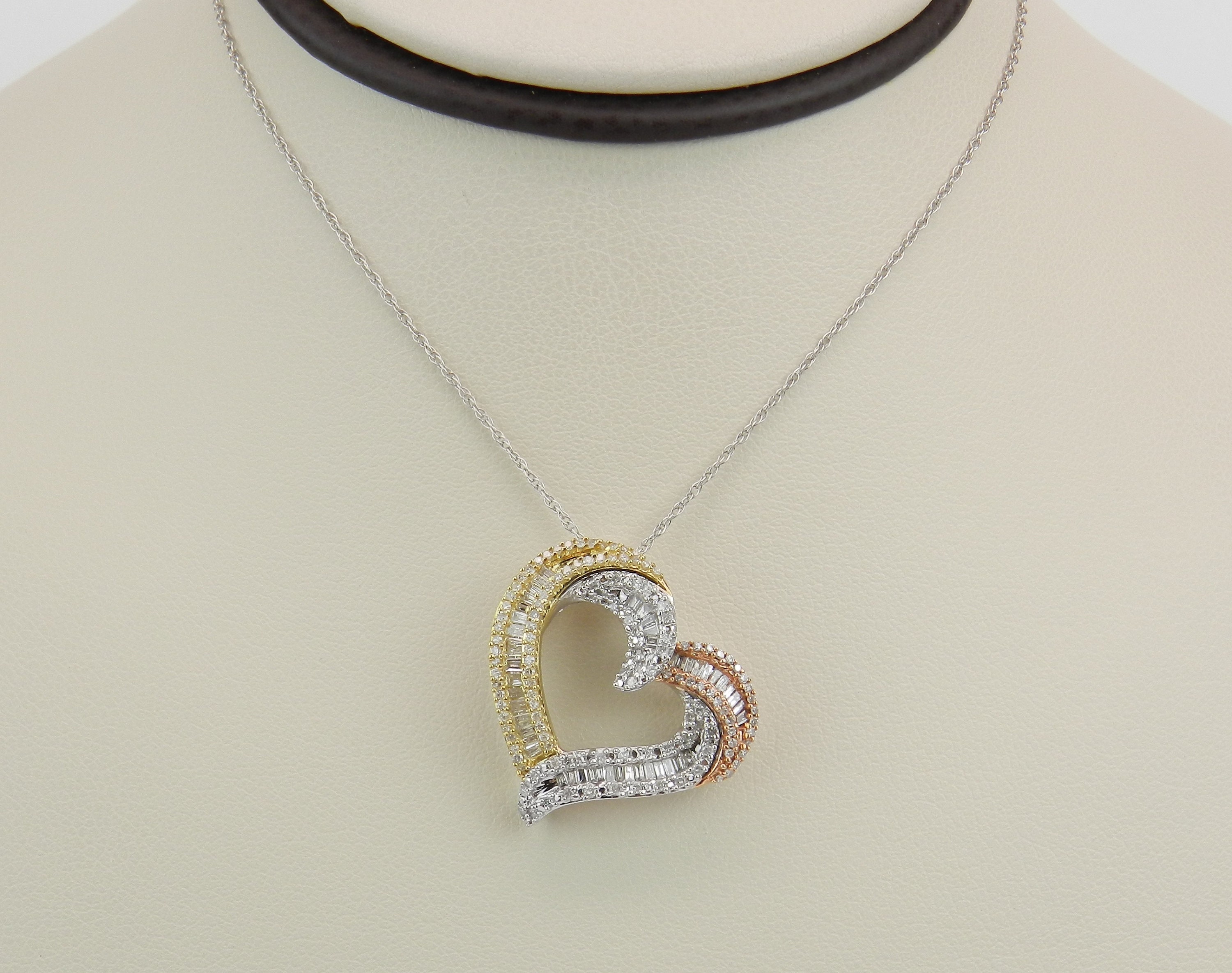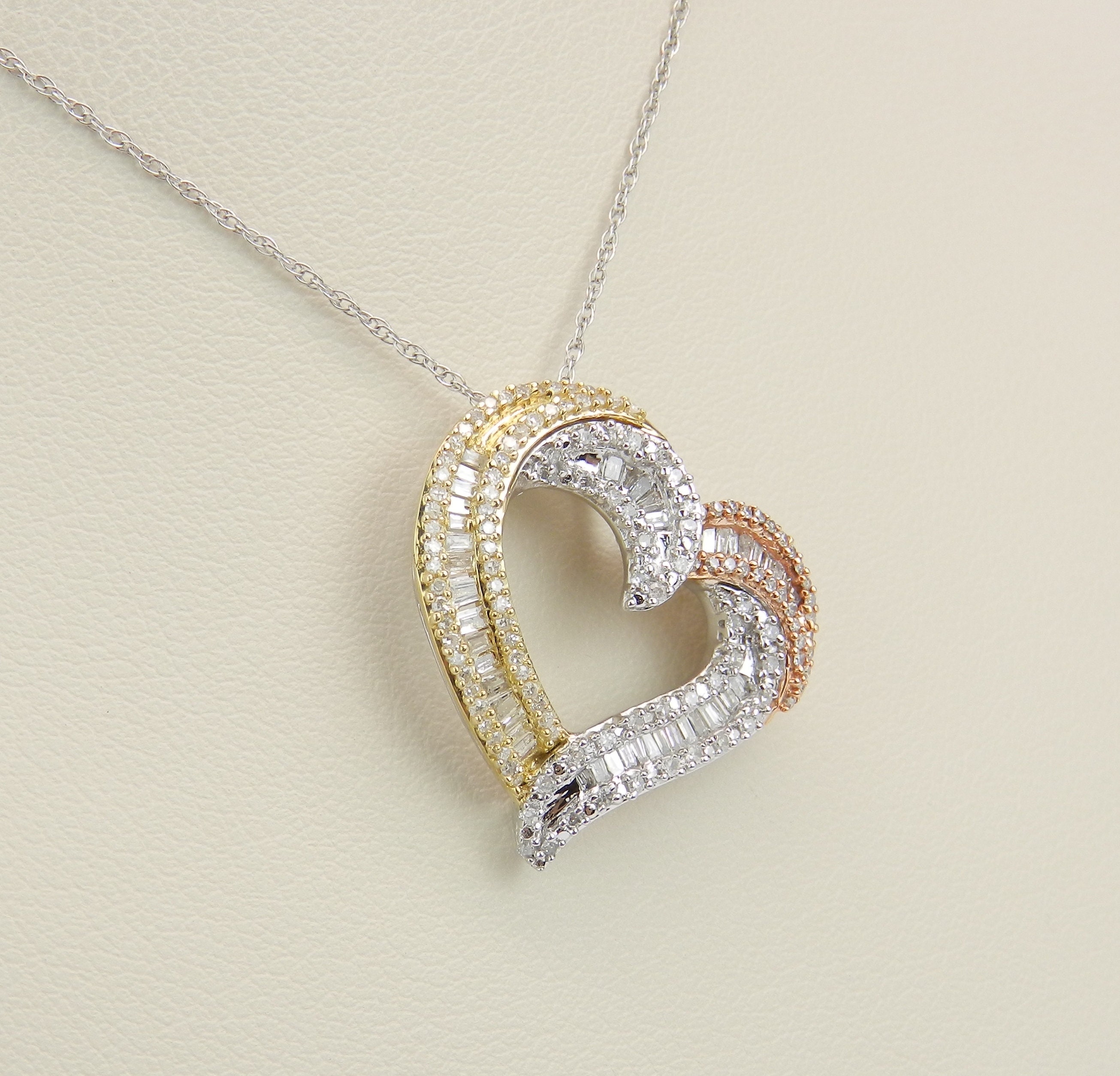 Tri Color Gold Diamond Heart Pendant Necklace Chain. This heart is set with one hundred and fifteen genuine round brilliant diamonds and forty-eight natural baguette diamonds. These diamonds are H color, I1 clarity and weigh a total of .70 carat. This pendant is 10KT White, Yellow and Rose Gold and comes with an 18" 10KT White Gold chain. Both the pendant and chain weigh a total of 4.2 grams and the heart measures 21 X 19 mm. This necklace will be accompanied by an appraisal written by a GIA Certified Diamond Grader with the retail replacement value of $1,495.00. I will ship this necklace promptly in a beautiful gift box.