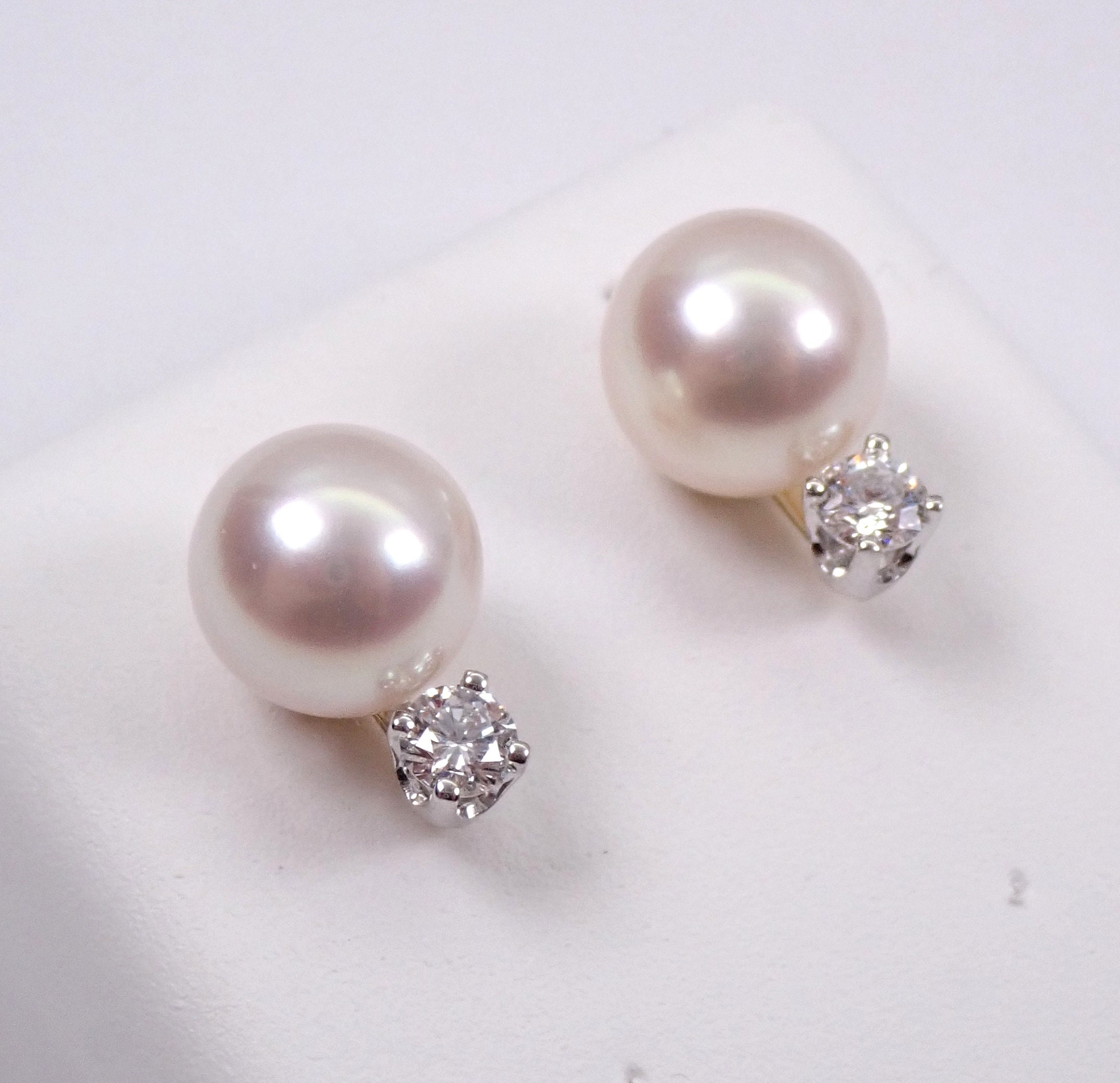 14K Yellow Gold Pearl and Diamond Stud Earrings. These earrings are set with two Round White Pearls and two genuine Round Brilliant Diamonds. These Pearls measure 8 mm in diameter each. The Diamonds in these earrings are G color, SI1 clarity and weigh a total of .25 carat. These earrings are 14KT Yellow Gold and weigh a total of 2.2 grams. These earrings are for pierced ears and have friction post backings. These earrings will be accompanied by an appraisal written by a GIA Certified Diamond Grader with the retail replacement value of $1,289.00. I will ship these earrings promptly in a gift box.